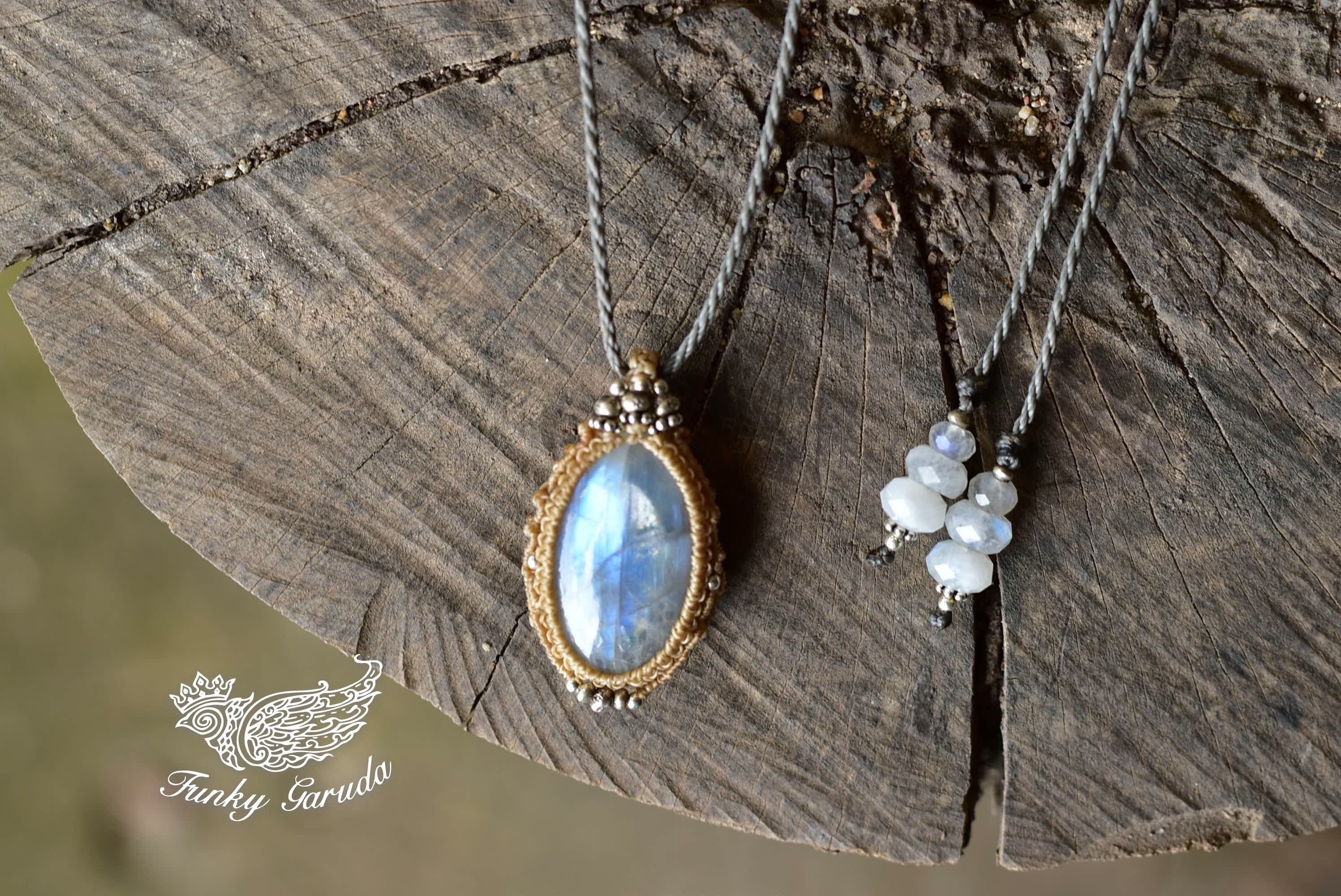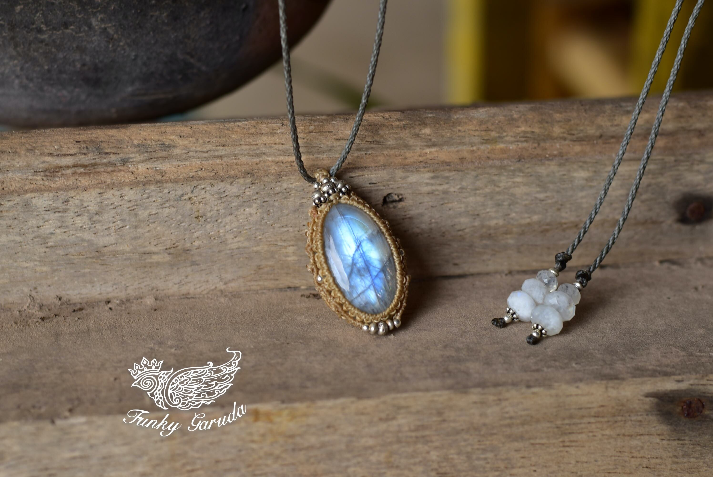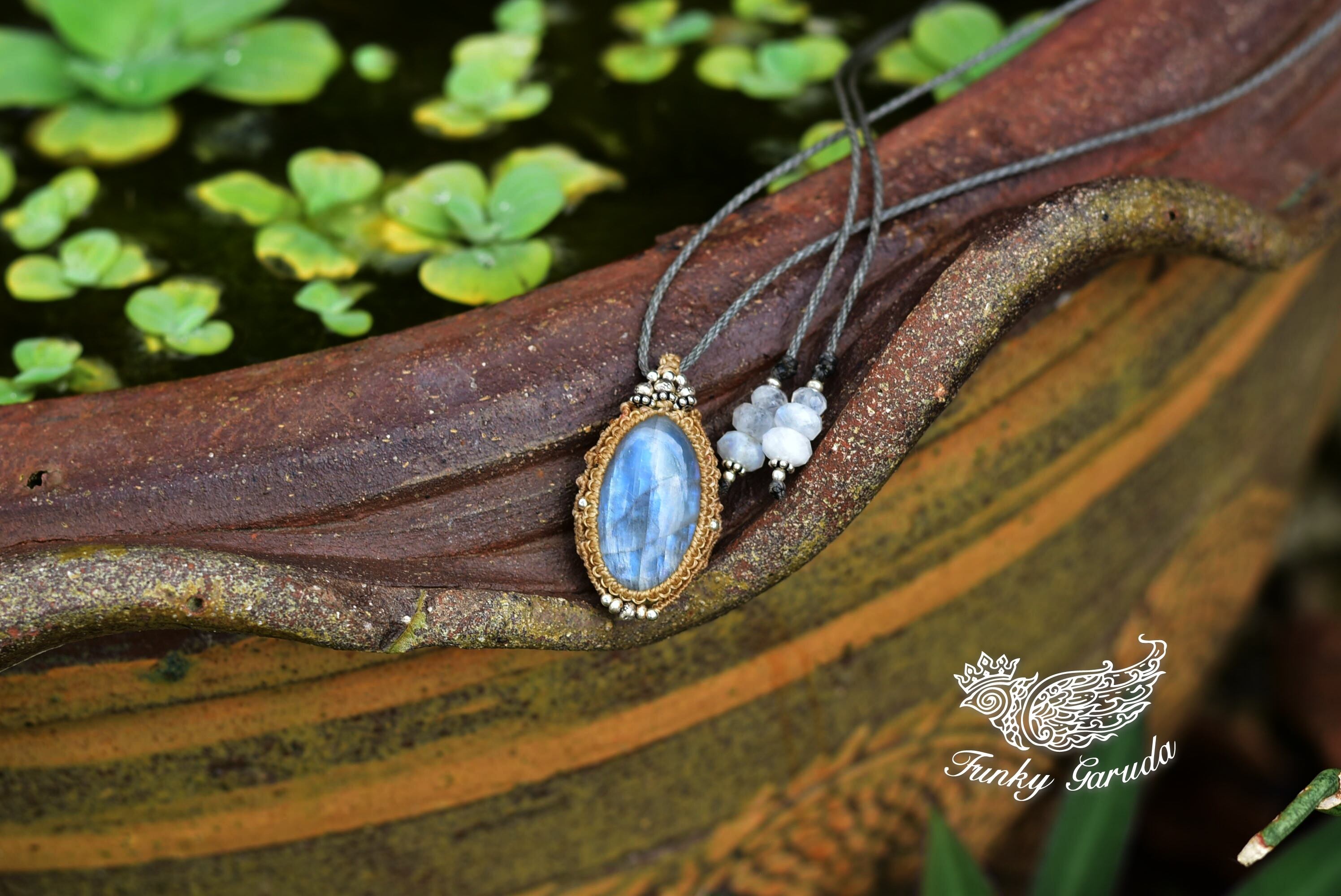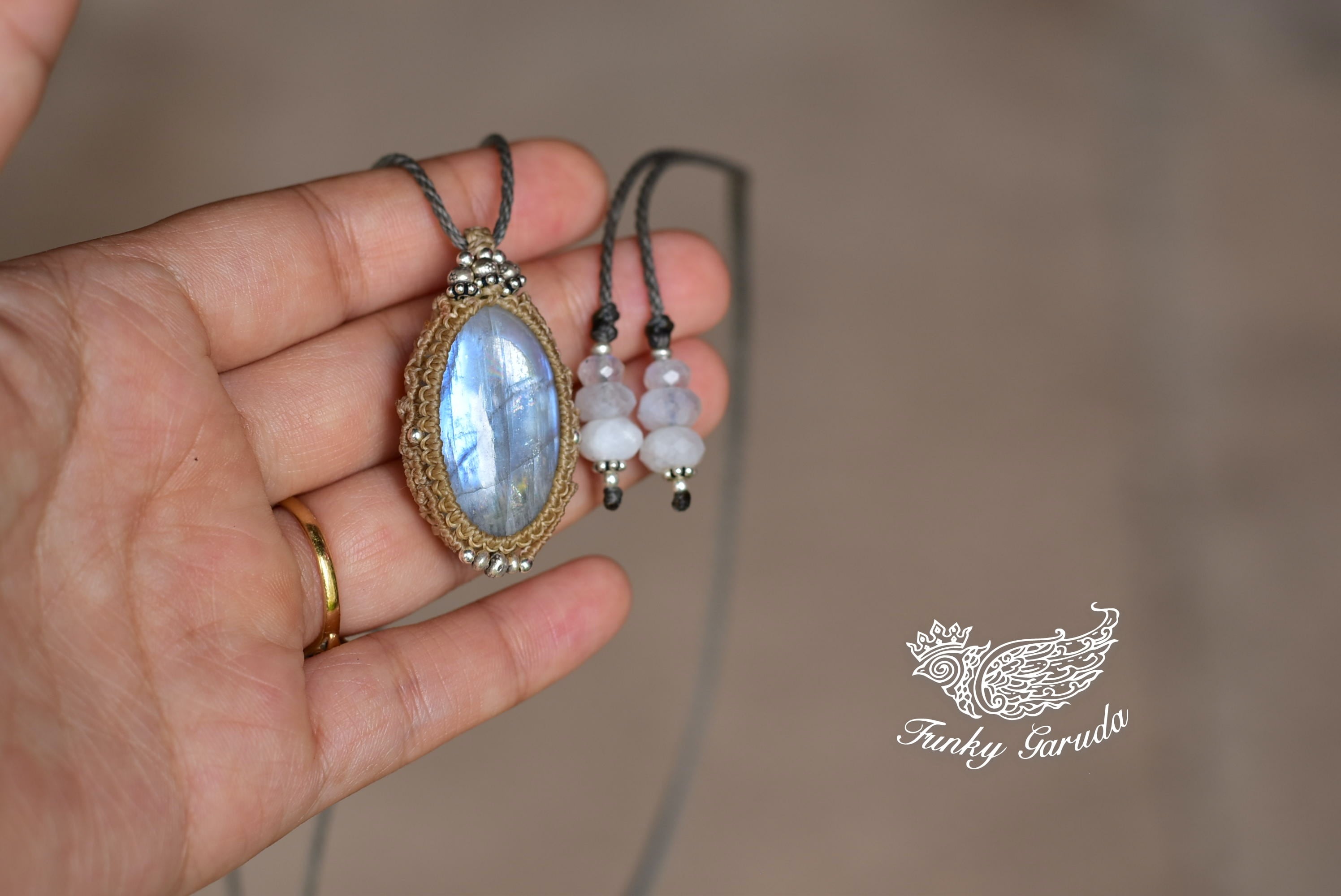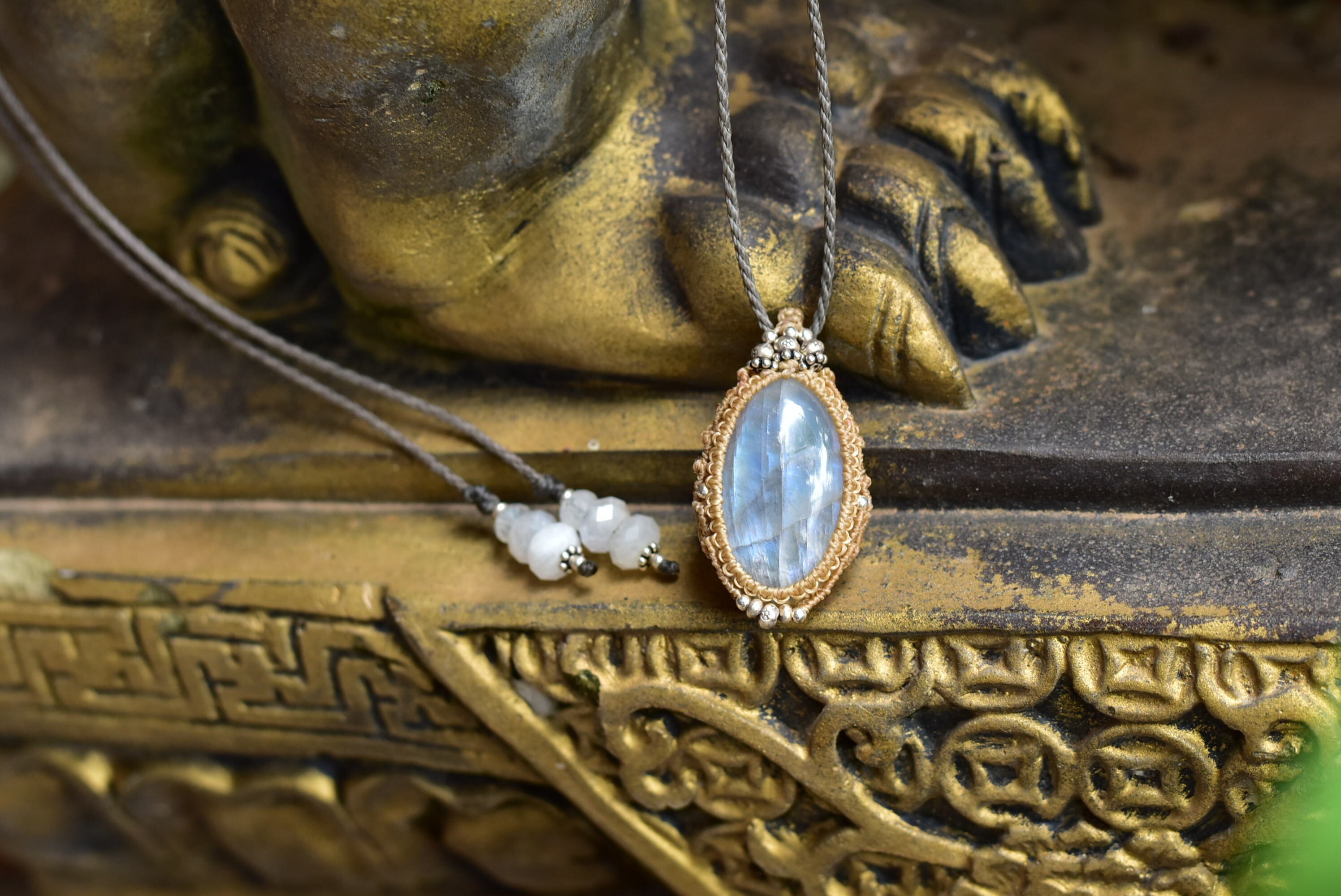 プラチナブルーのシラーがしっかりと見てとることのできる高品質なムーンストーンを細めの糸でしっかりと巻き、マクラメ編み装飾を施しました。