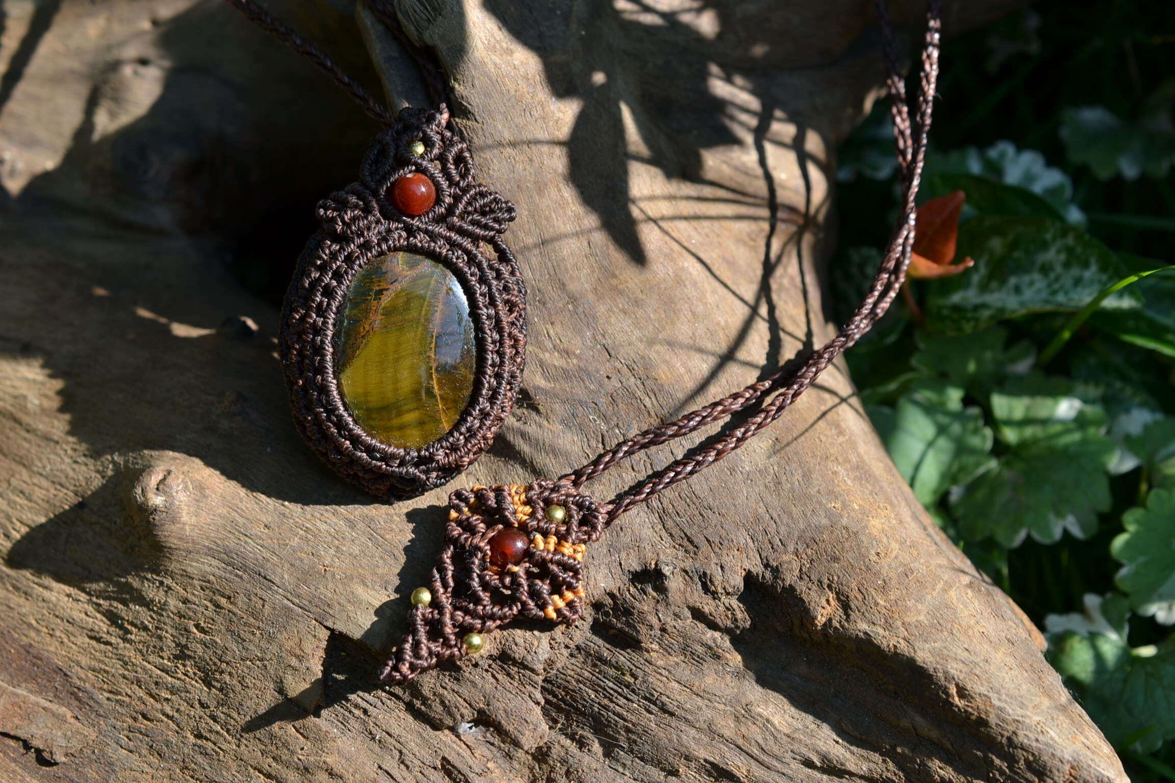 このたびはギラギラと力強く跳ね返りの輝きを魅せてくれるタイガーアイを使用し、トップの部分を木の葉モチーフにマクラメ編み装飾を施しました。コンパクトなイメージでかつ、石を尊重できるように真心を込めて編み上げました。