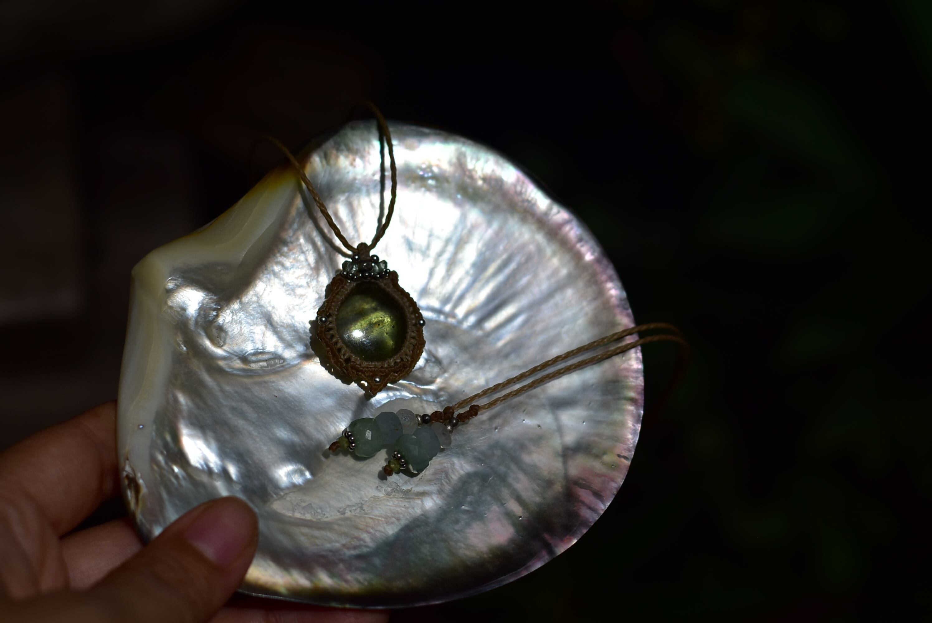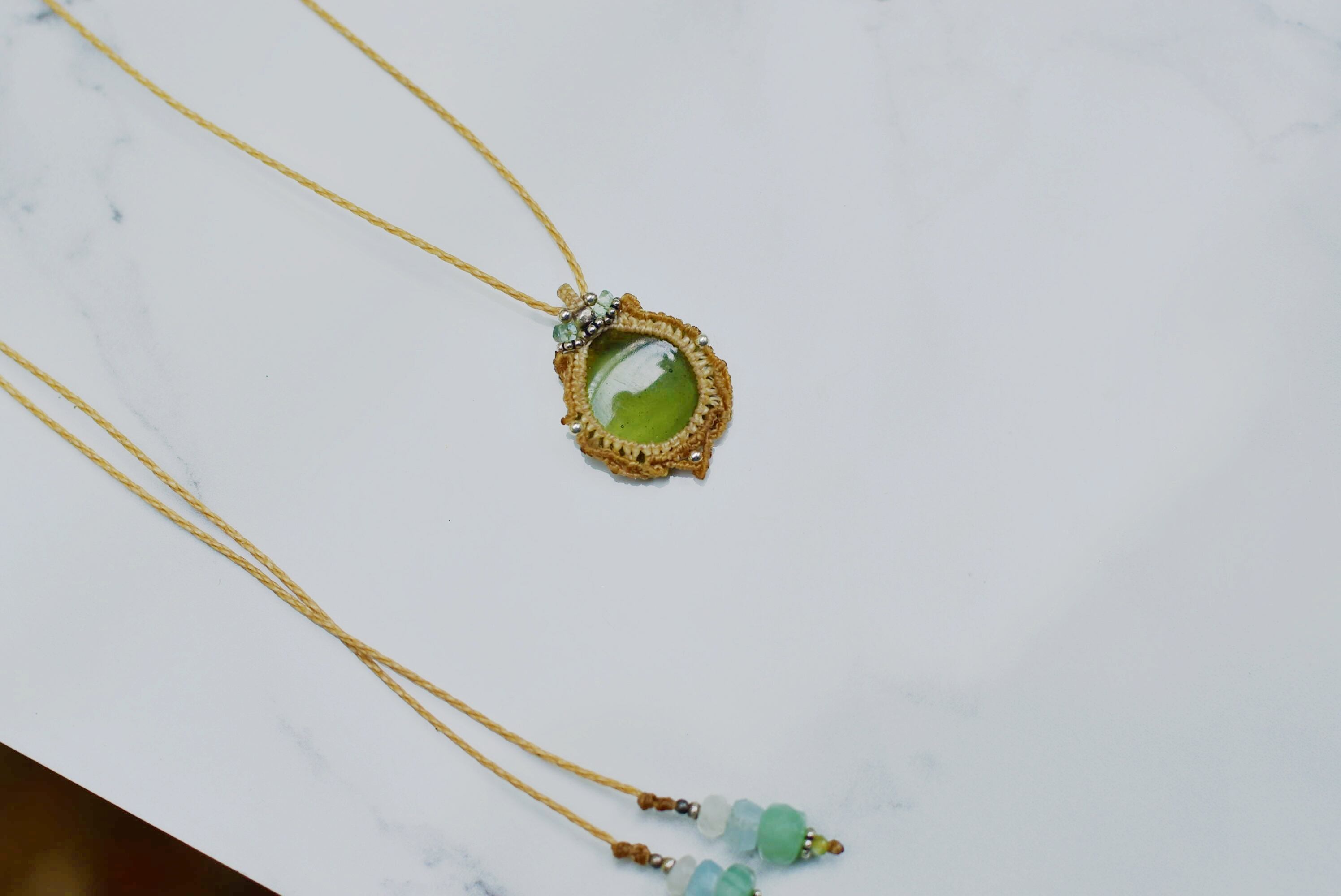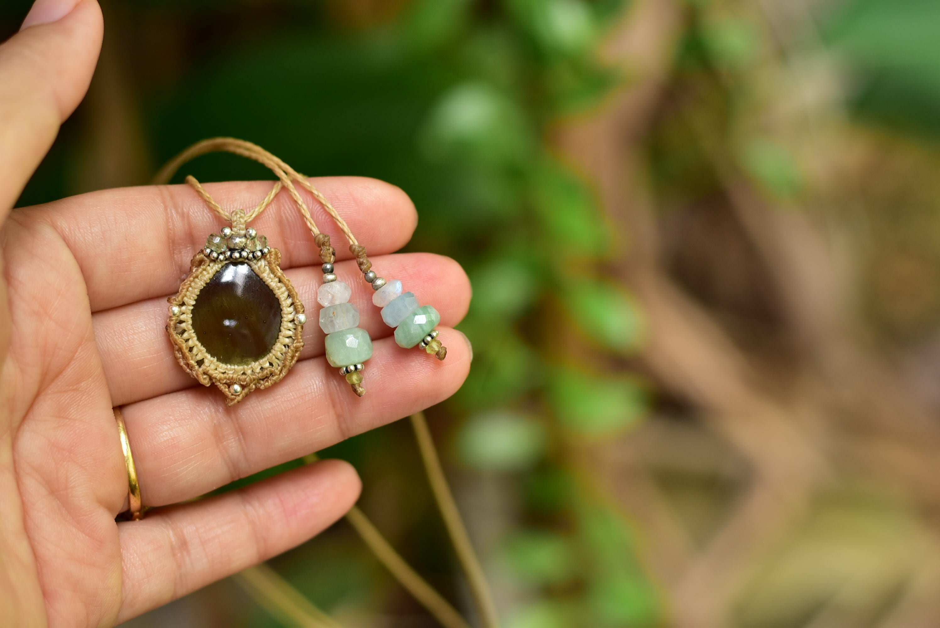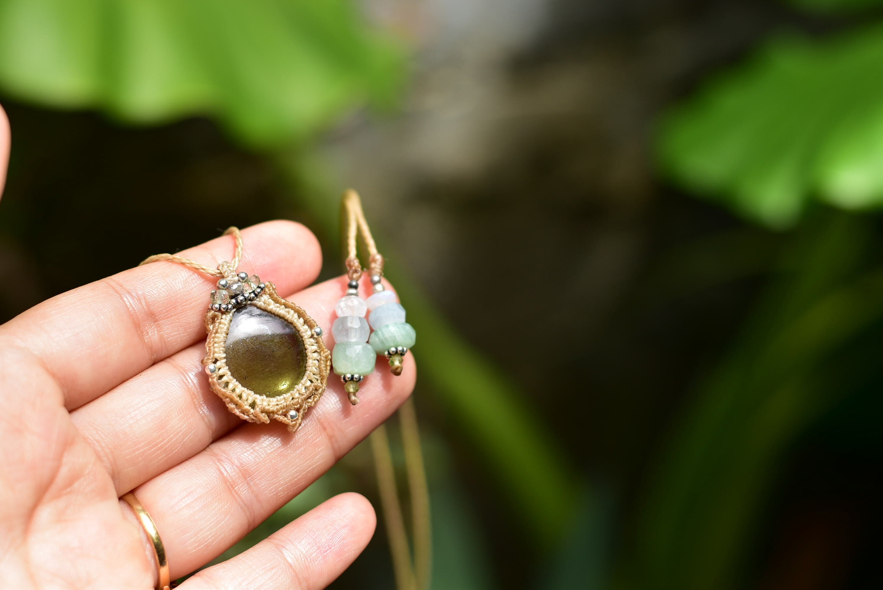 このたびはそんな希少なルースを大切にマクラメ編み装飾を施して仕上げました。
