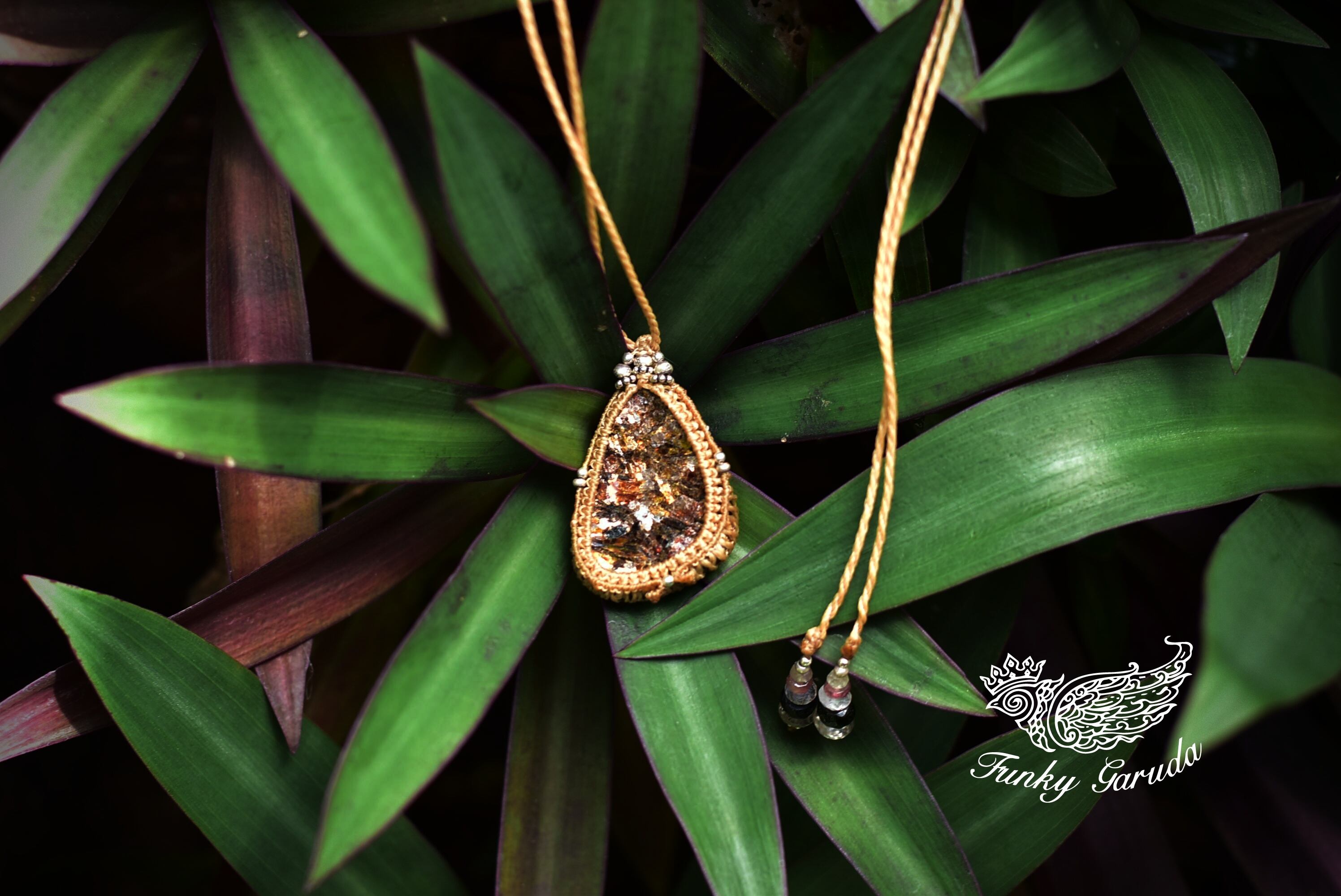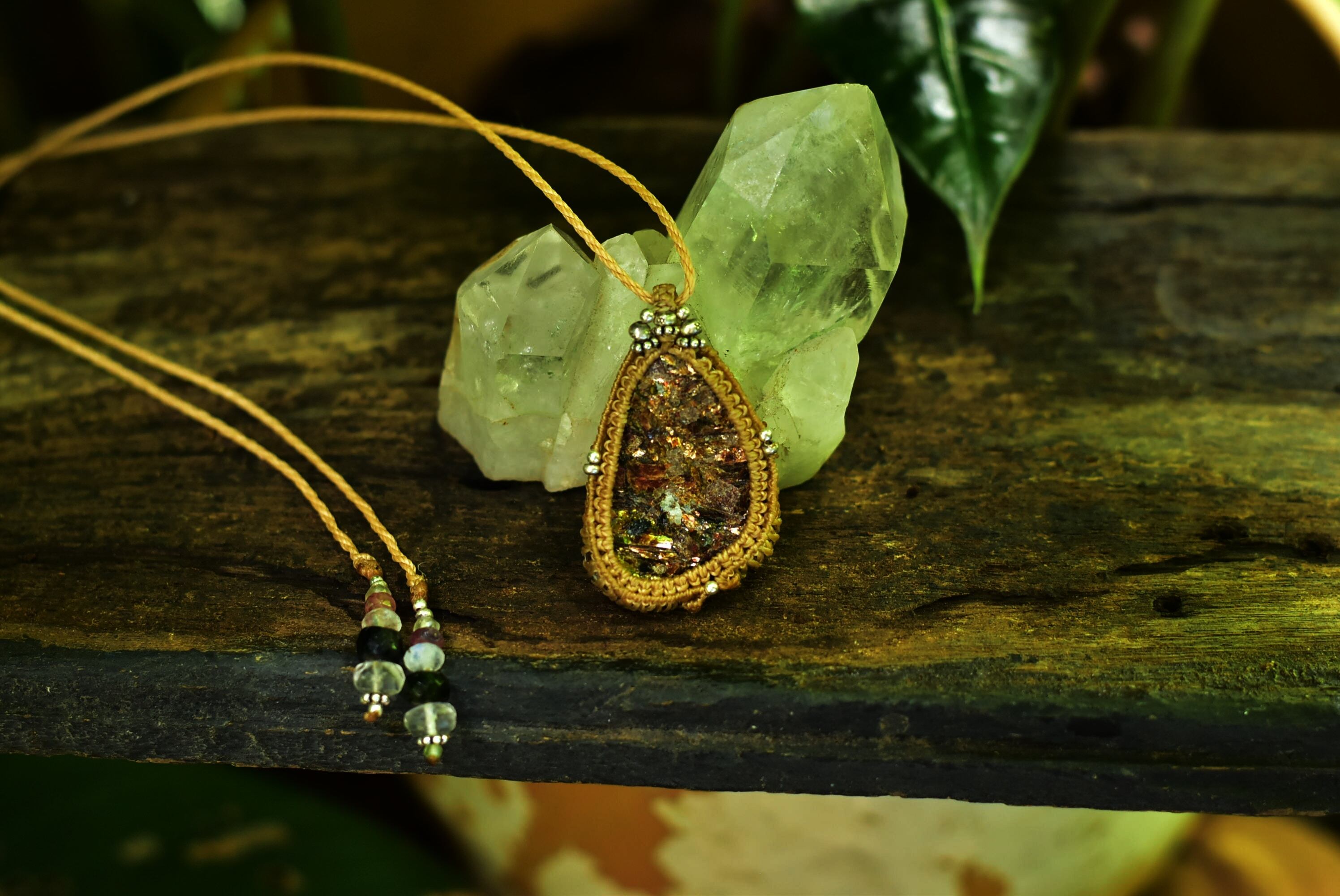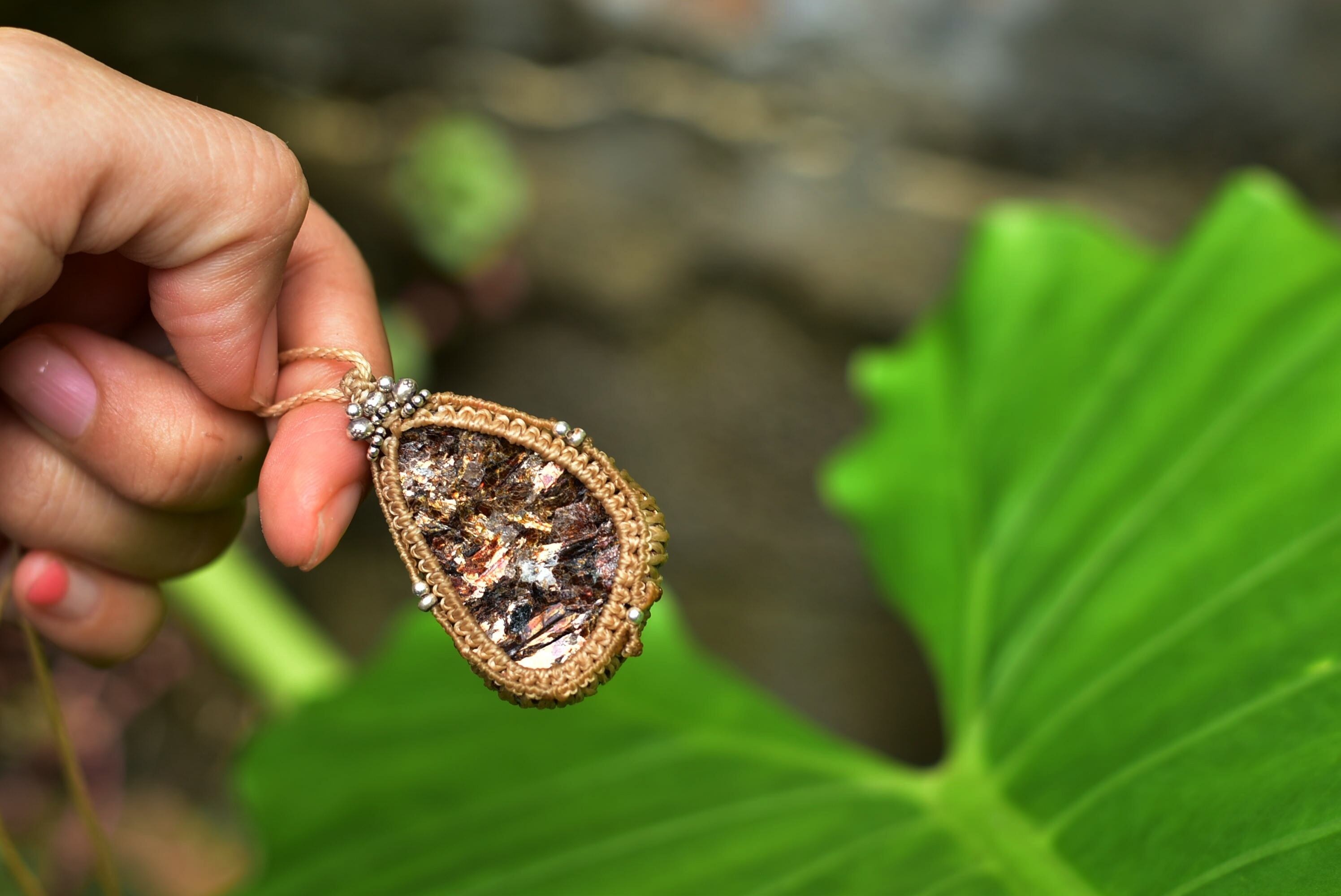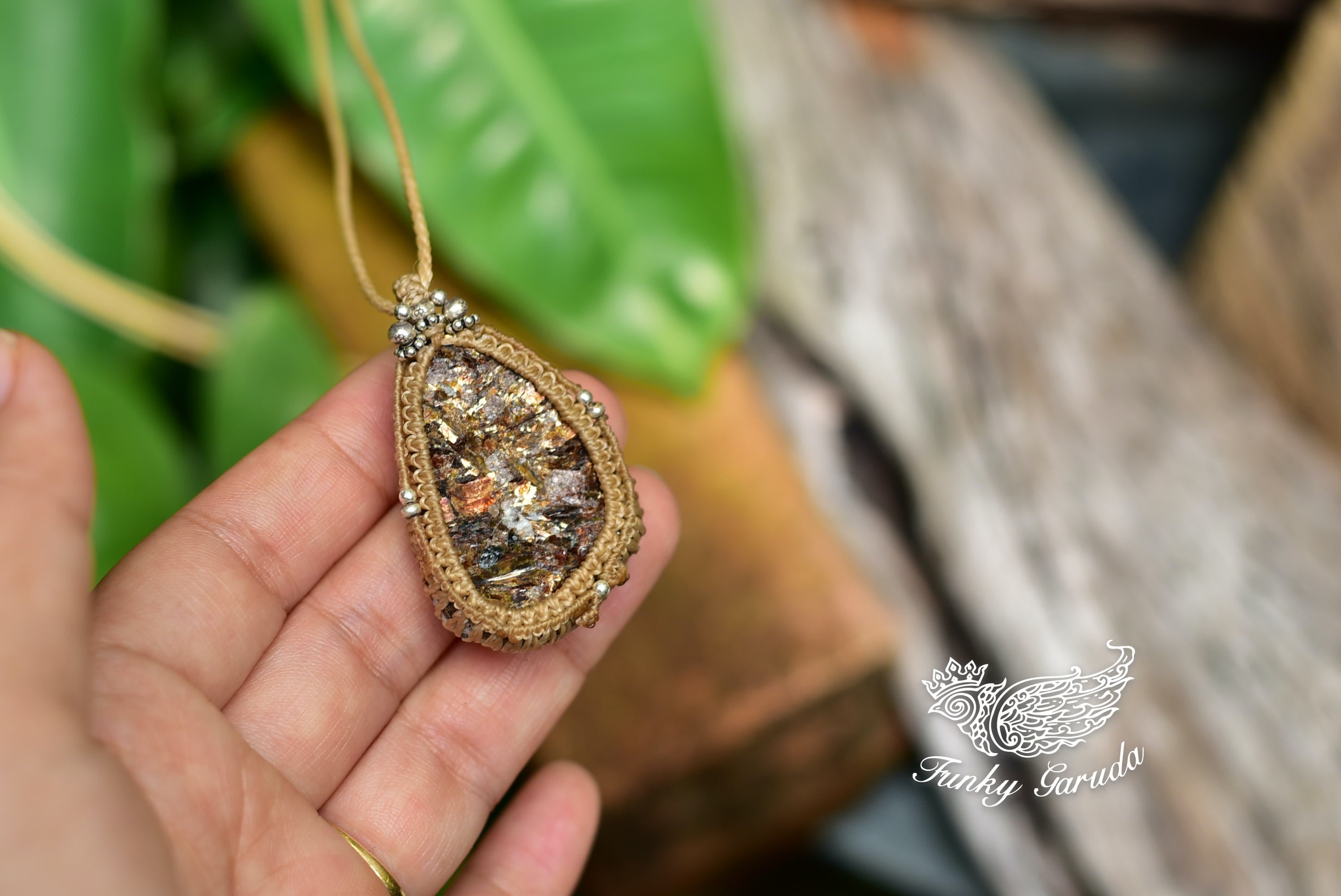 アストロフィライトの原石部分のみを発掘したものをそのままマクラメペンダントに仕上げました。炎にも見える美しい原石部分。炎の赤金色の塊は角度を変えて覗き込んでみますと美しく輝きます。