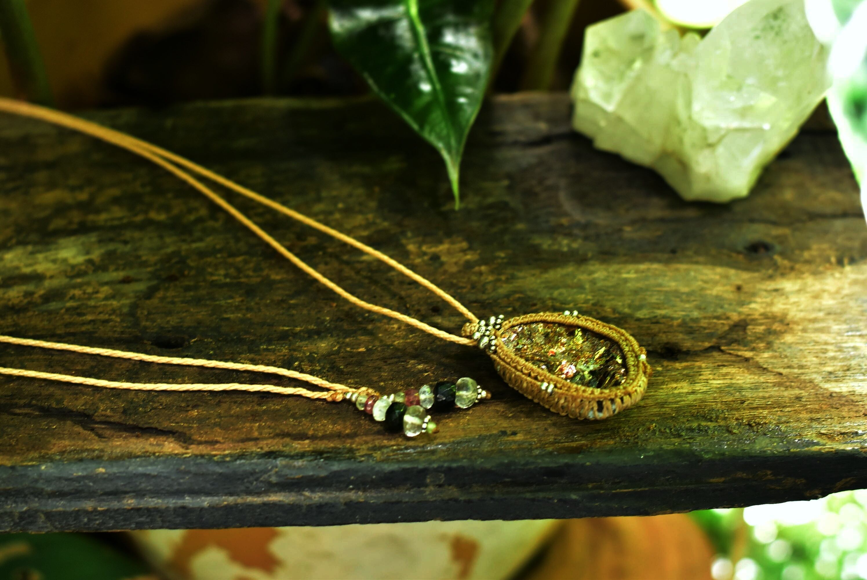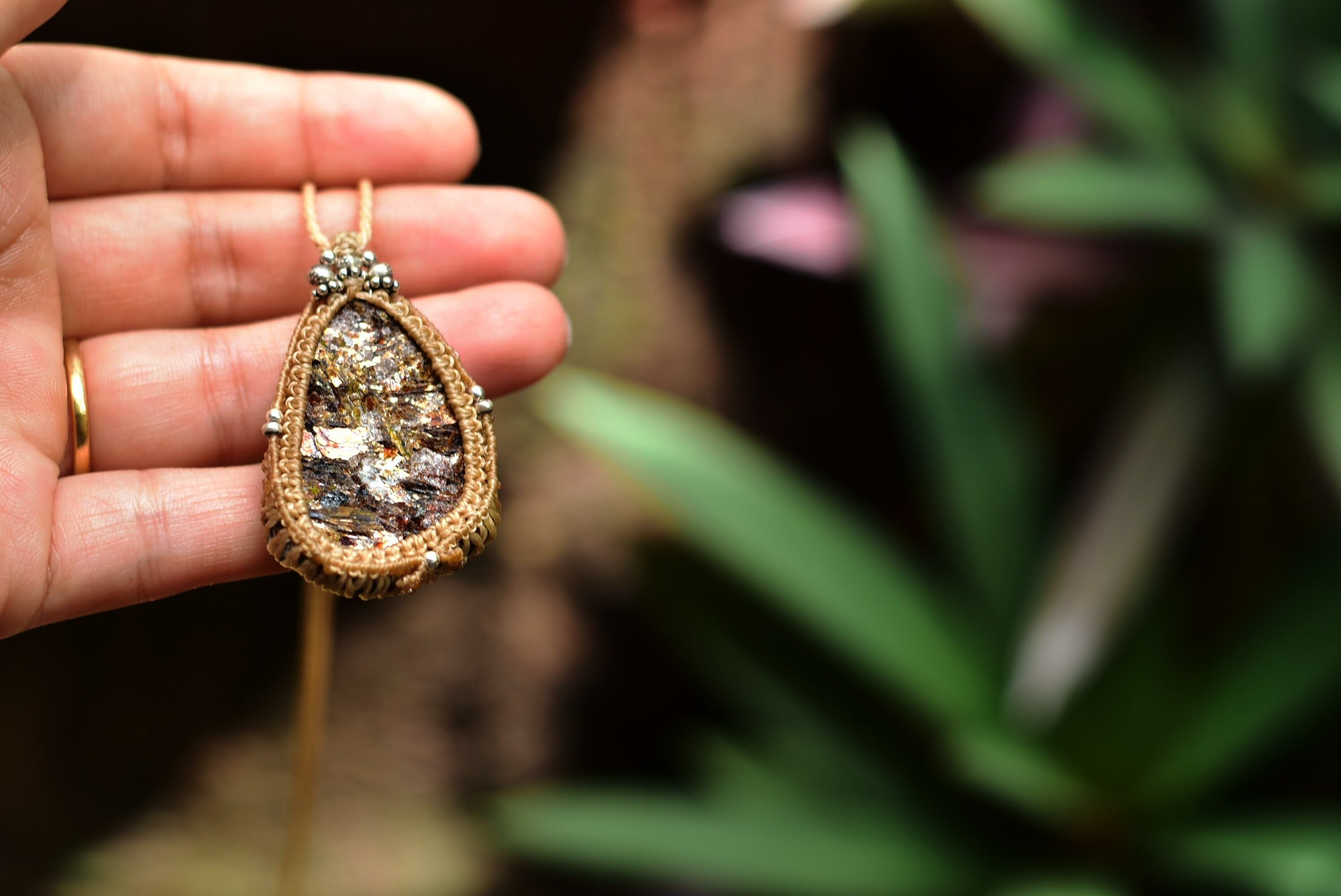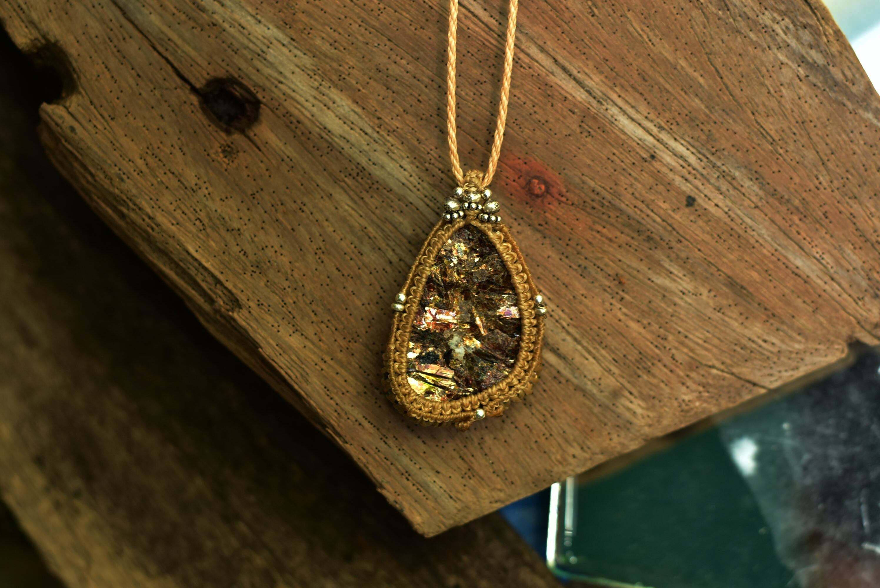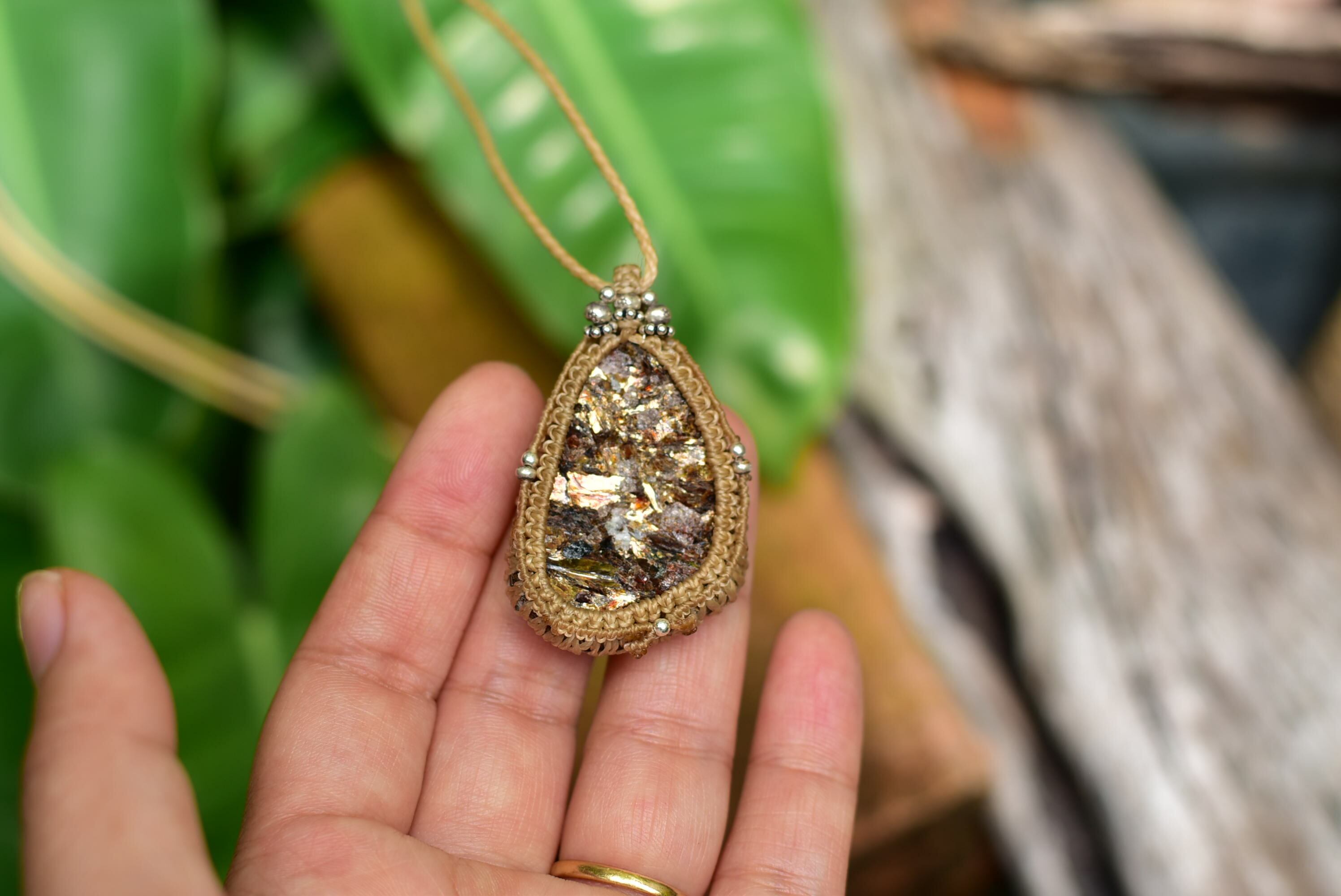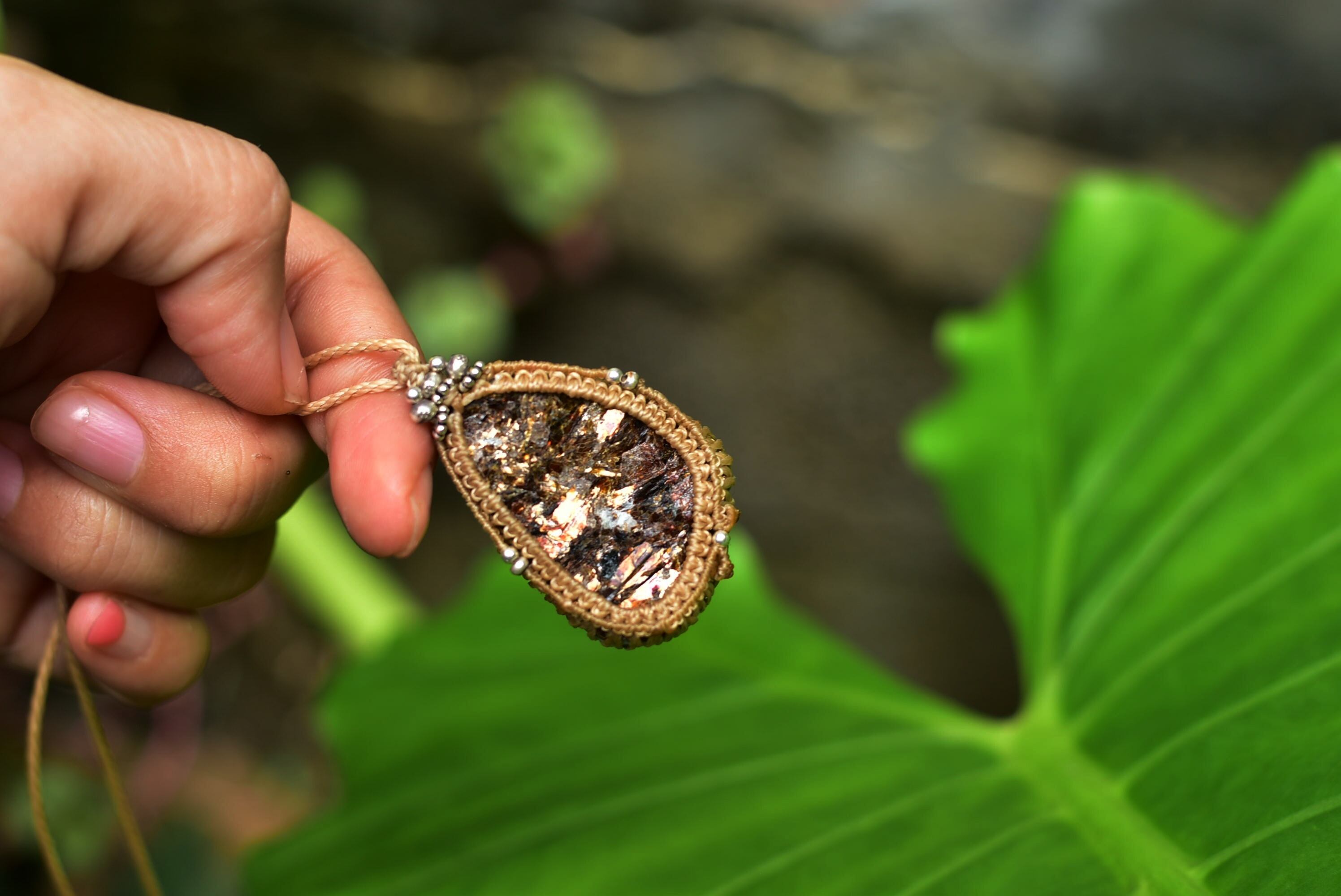 アストロフィライトの原石部分のみを発掘したものをそのままマクラメペンダントに仕上げました。炎にも見える美しい原石部分。炎の赤金色の塊は角度を変えて覗き込んでみますと美しく輝きます。