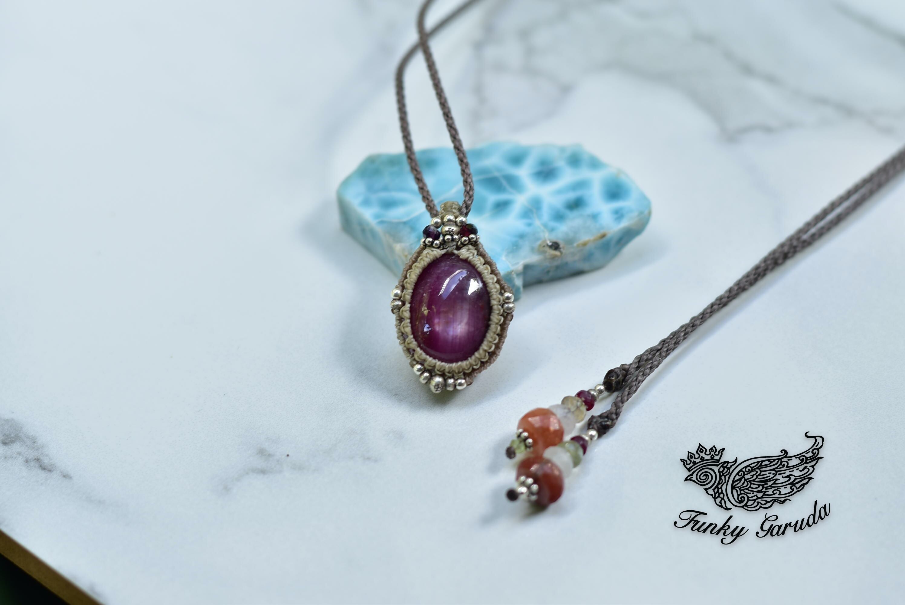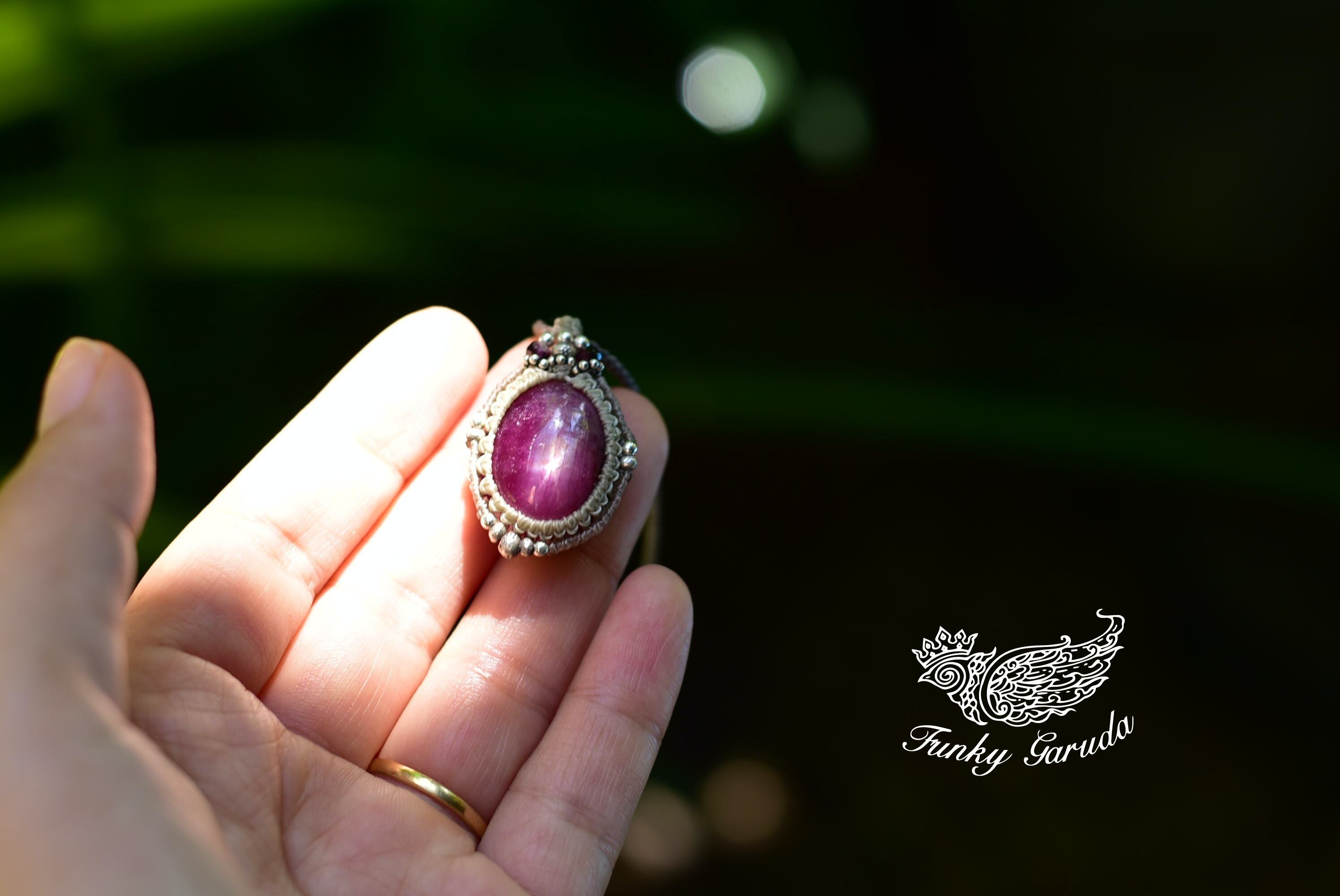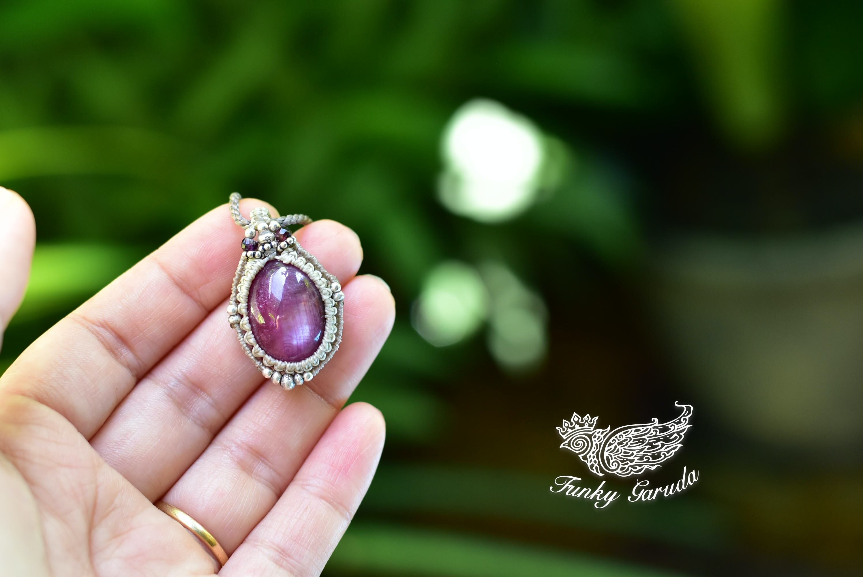 ピンクパープルのルースの中にしっかりと美しいスターを見ることができる比較的大きなサイズのスタールビーをマクラメペンダントに仕上げました。