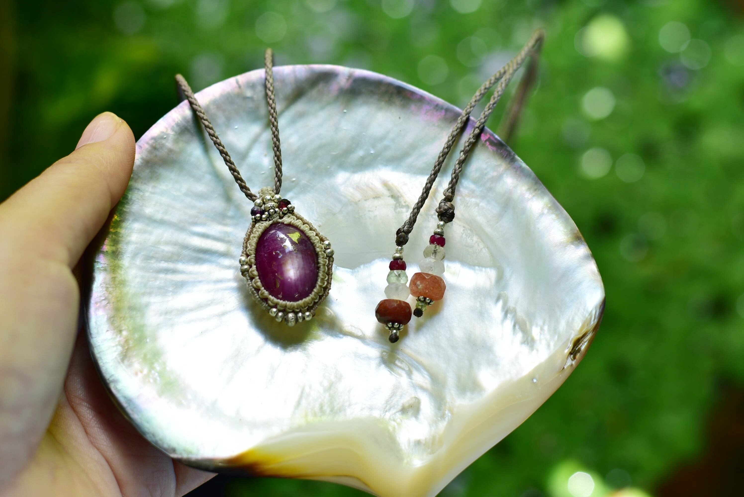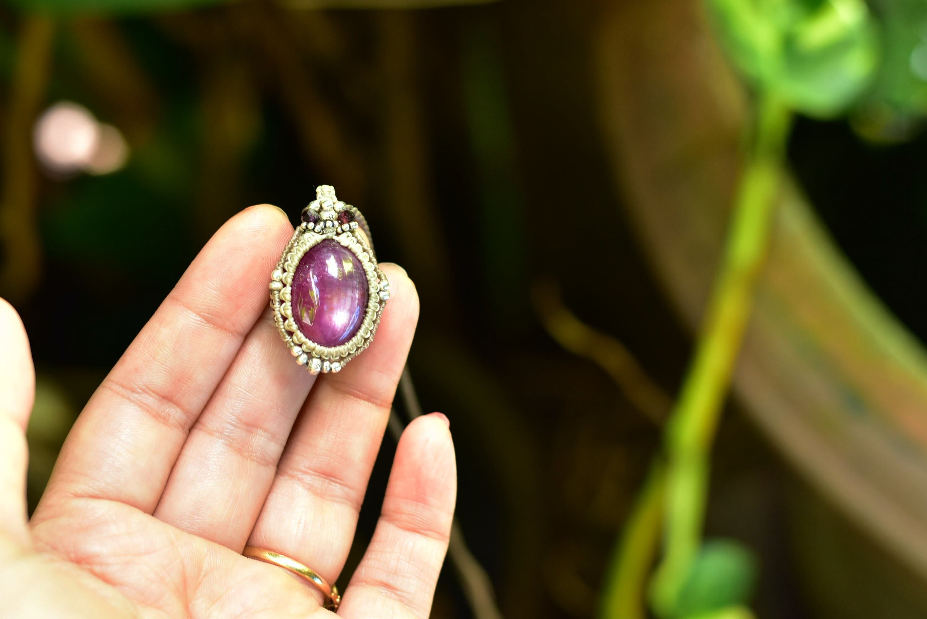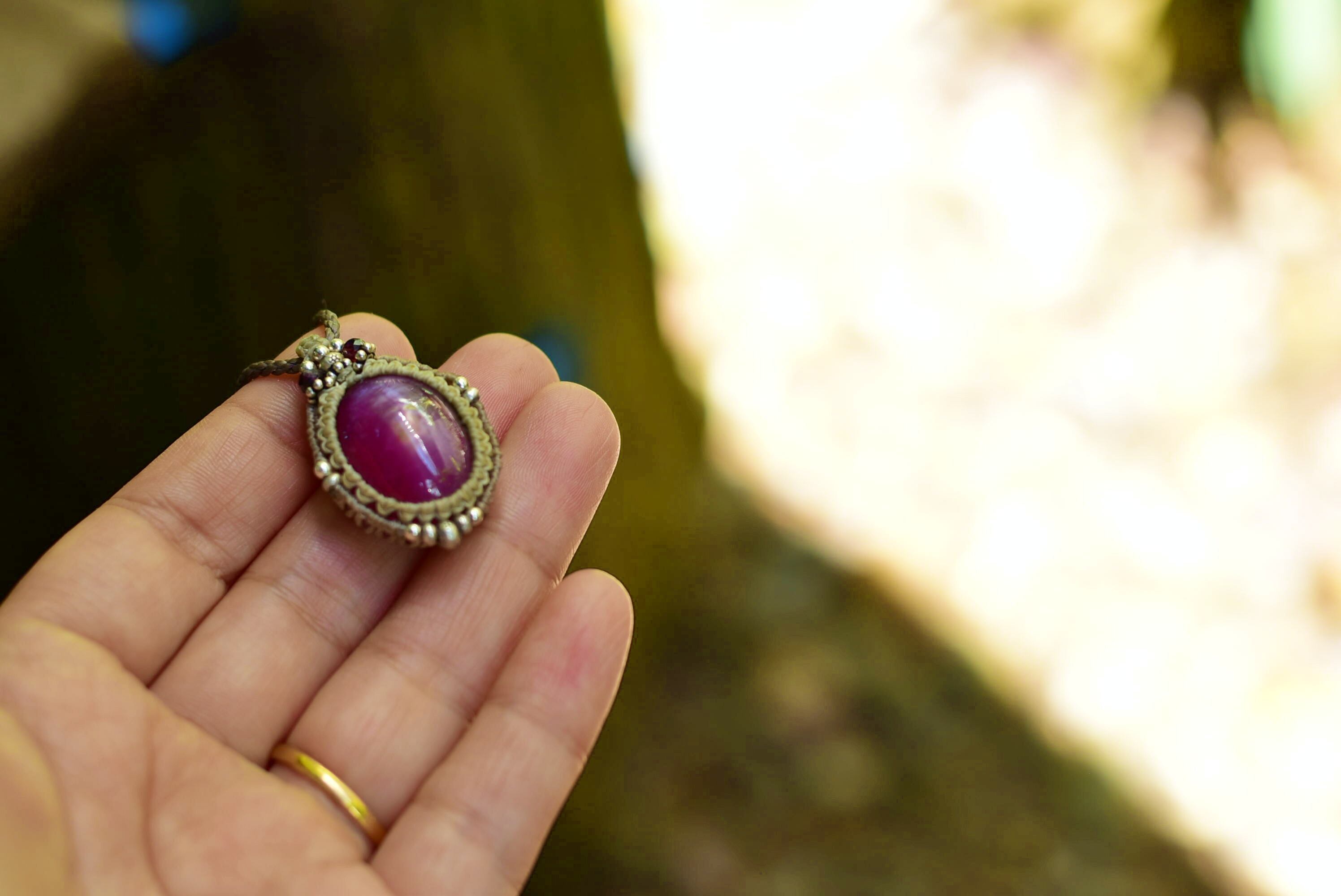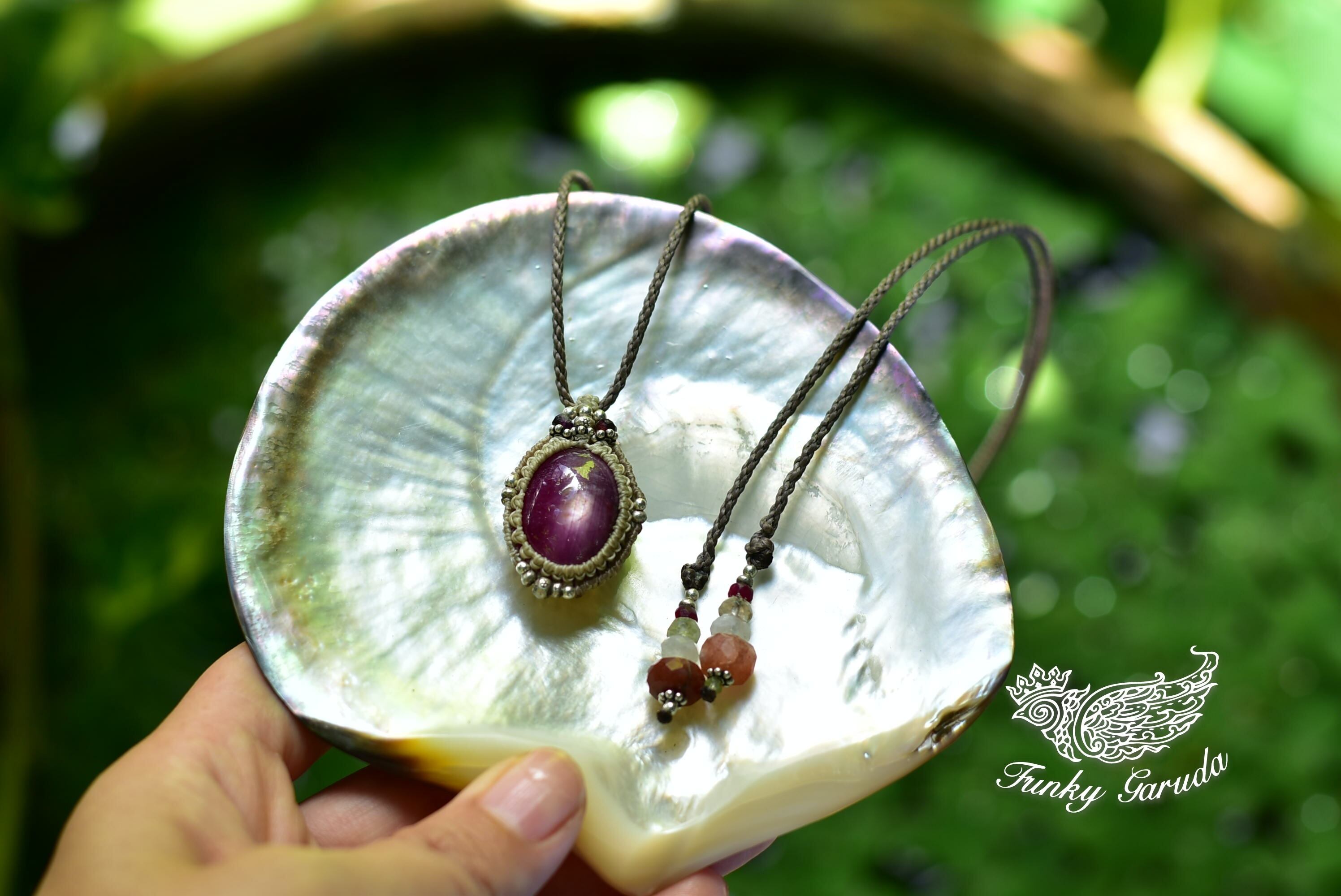 ピンクパープルのルースの中にしっかりと美しいスターを見ることができる比較的大きなサイズのスタールビーをマクラメペンダントに仕上げました。