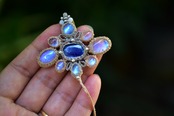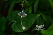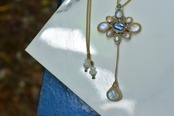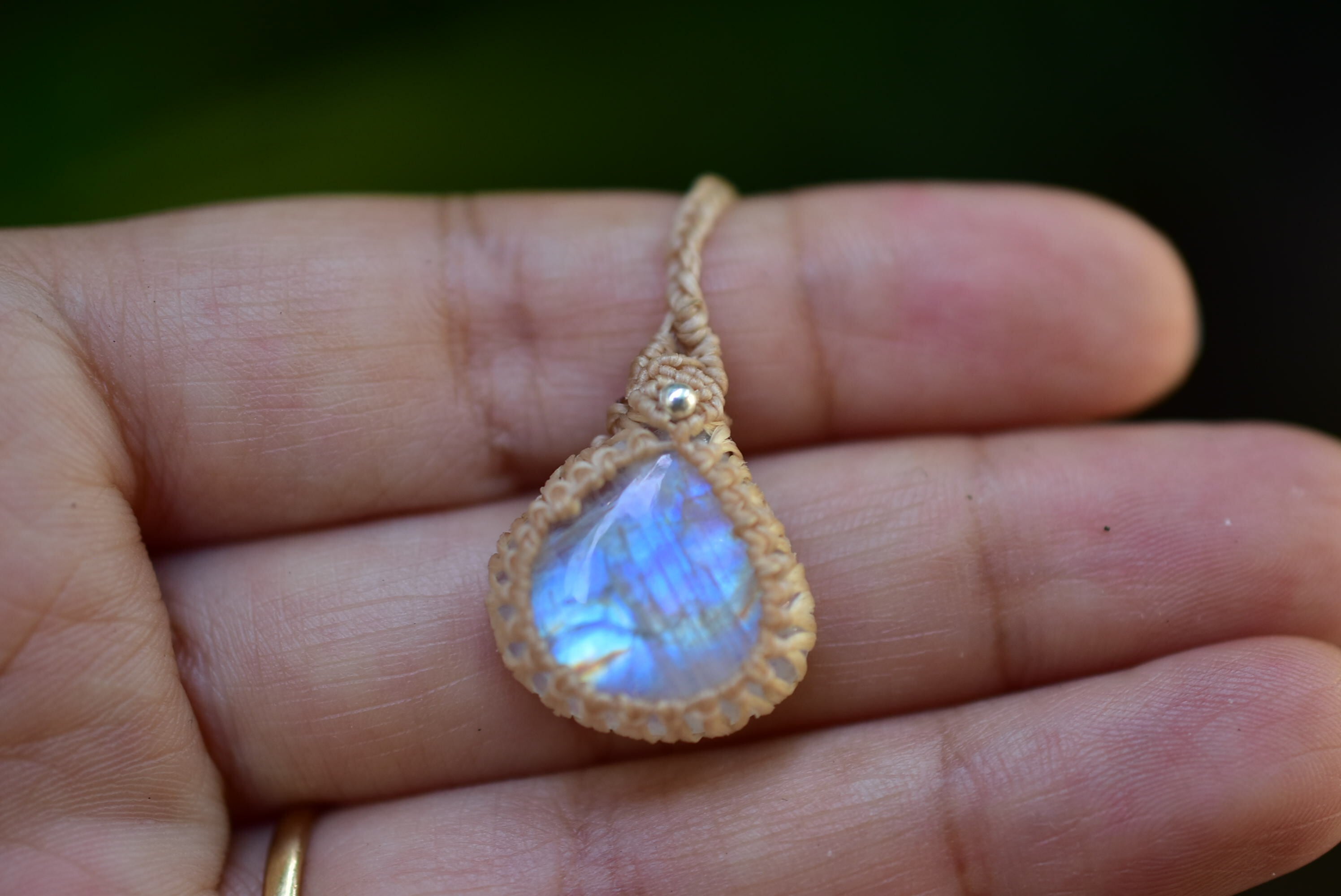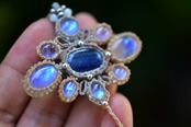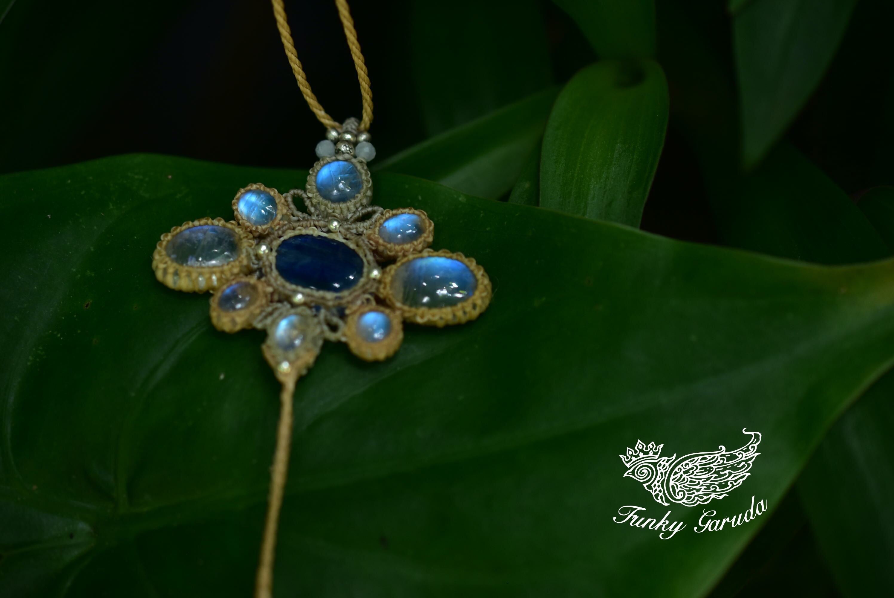 透明に透けるカイヤナイトを中心にブルーにシラーが輝く、こちらも透明感のあるムーンストーン。小さいですがひとつひとつを結んでお花の形に仕上げたあと、ゆらゆら揺れるレインボームーンストーンを結びました。 身につけた時の動きをイメージして、長さの調節は可能ですが、胸元にゆらゆらと揺れ動くムーンストーンに仕上げました。