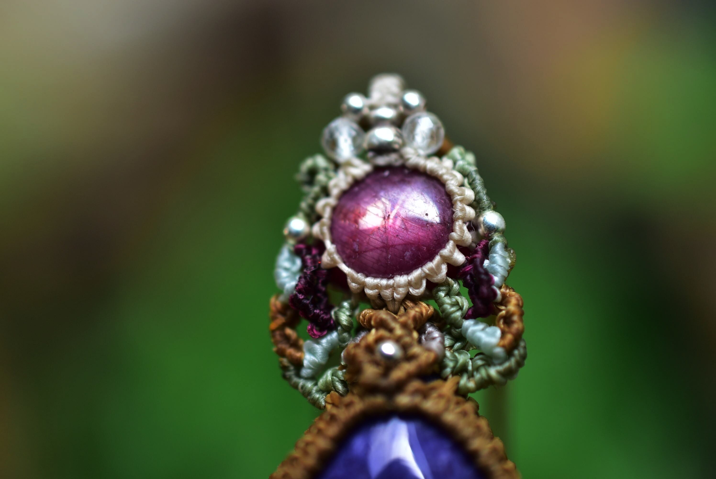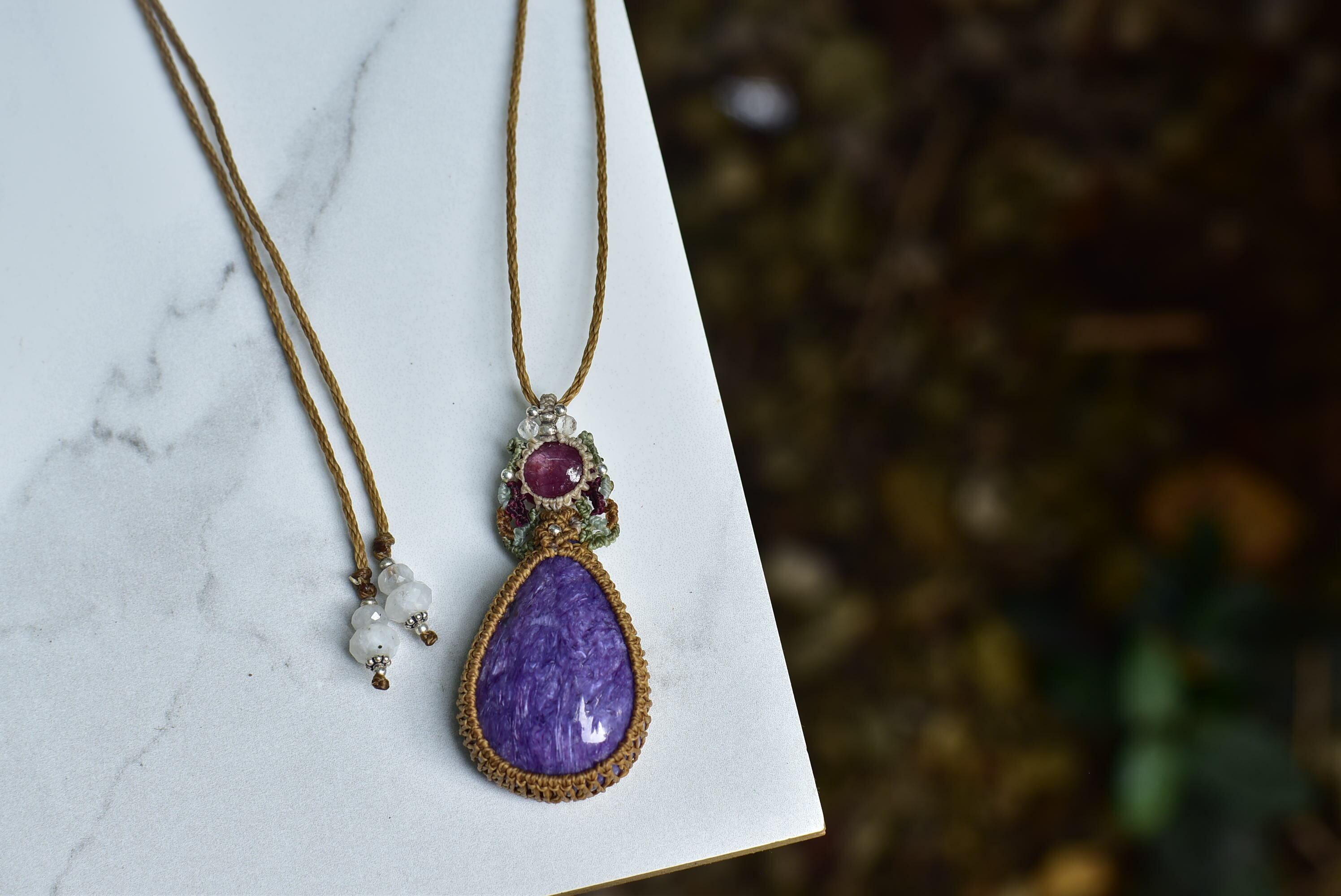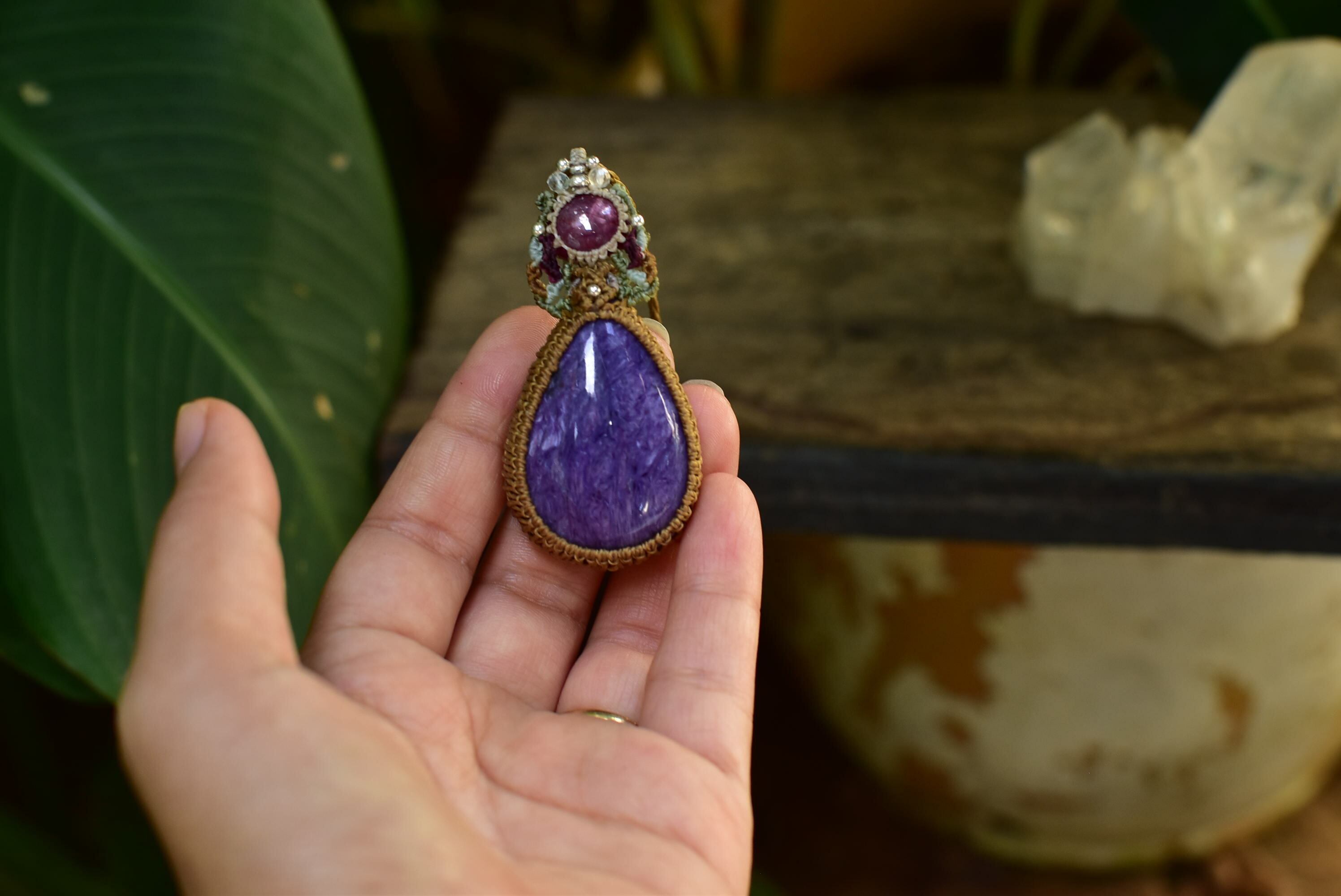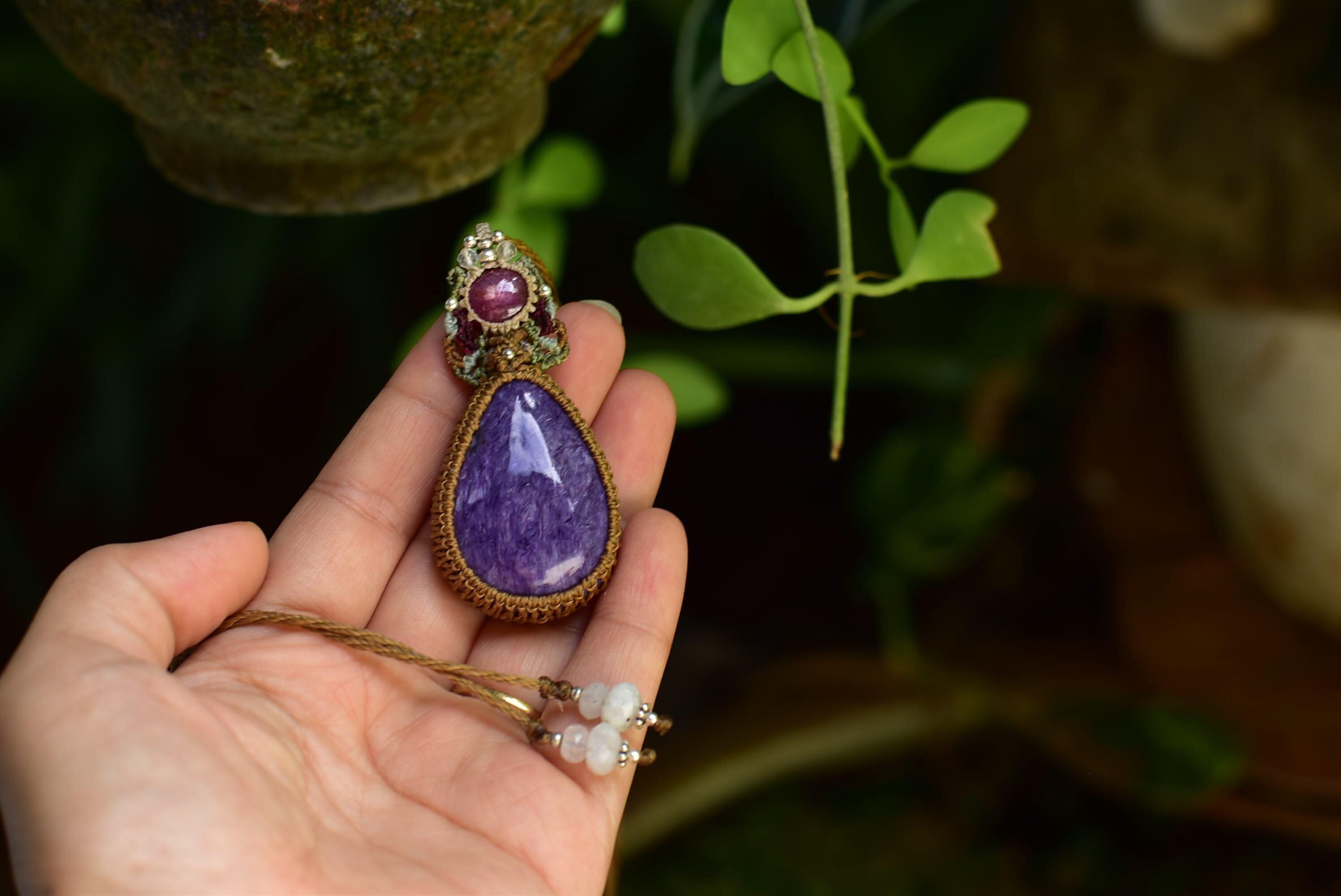 十字スターの輝くルビーをトップに色とりどりのロウビキ糸を組み合わせて渋い色合いのペンダントトップに仕上げました。このスタールビーをどのように編み込んでいくかを考える時にます、気になったのが大きなチャロアイト 。小さな羽根のようなチャロアイト 特有の世界観とスタールビーの高貴な輝きがよく似合うと感じました。
