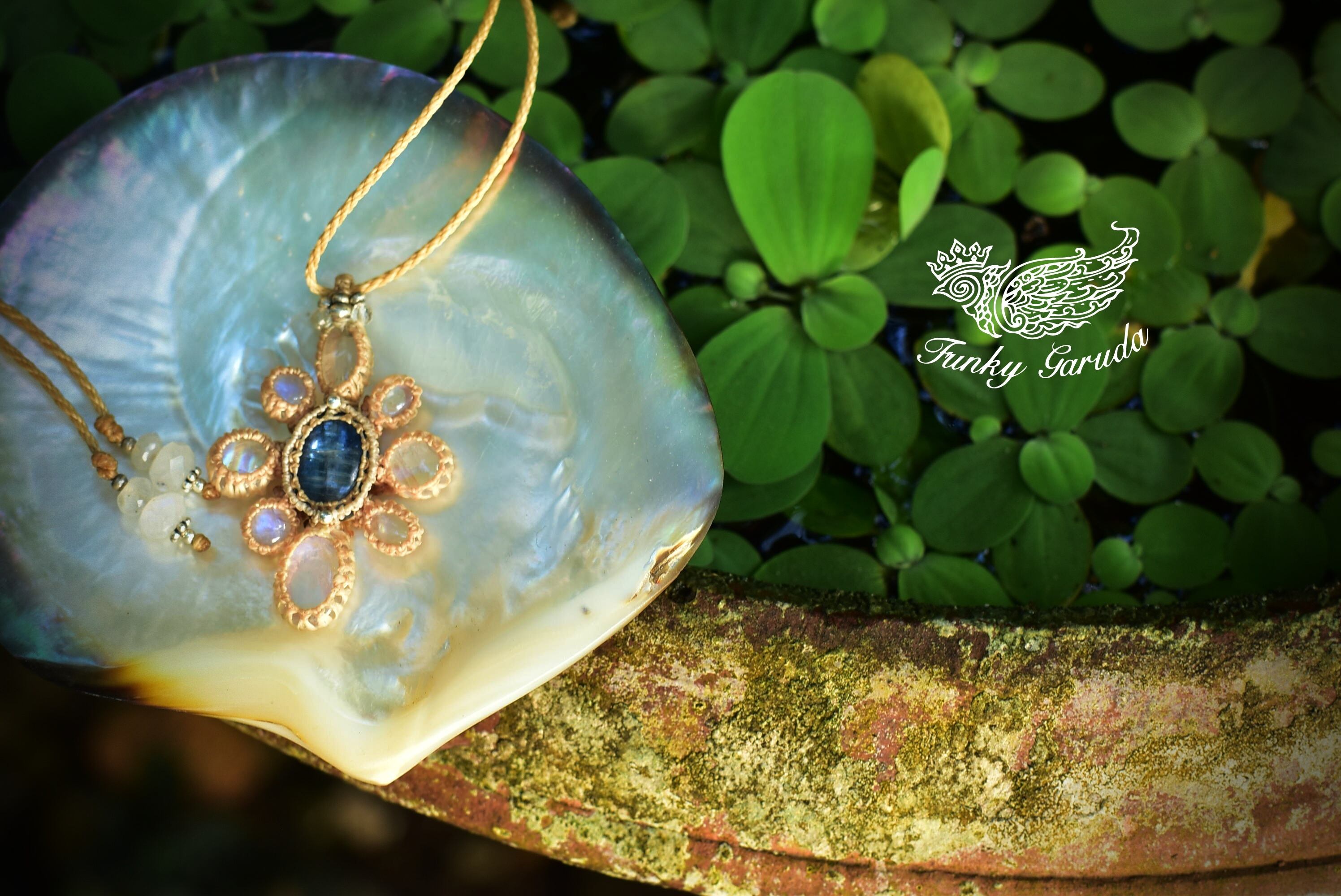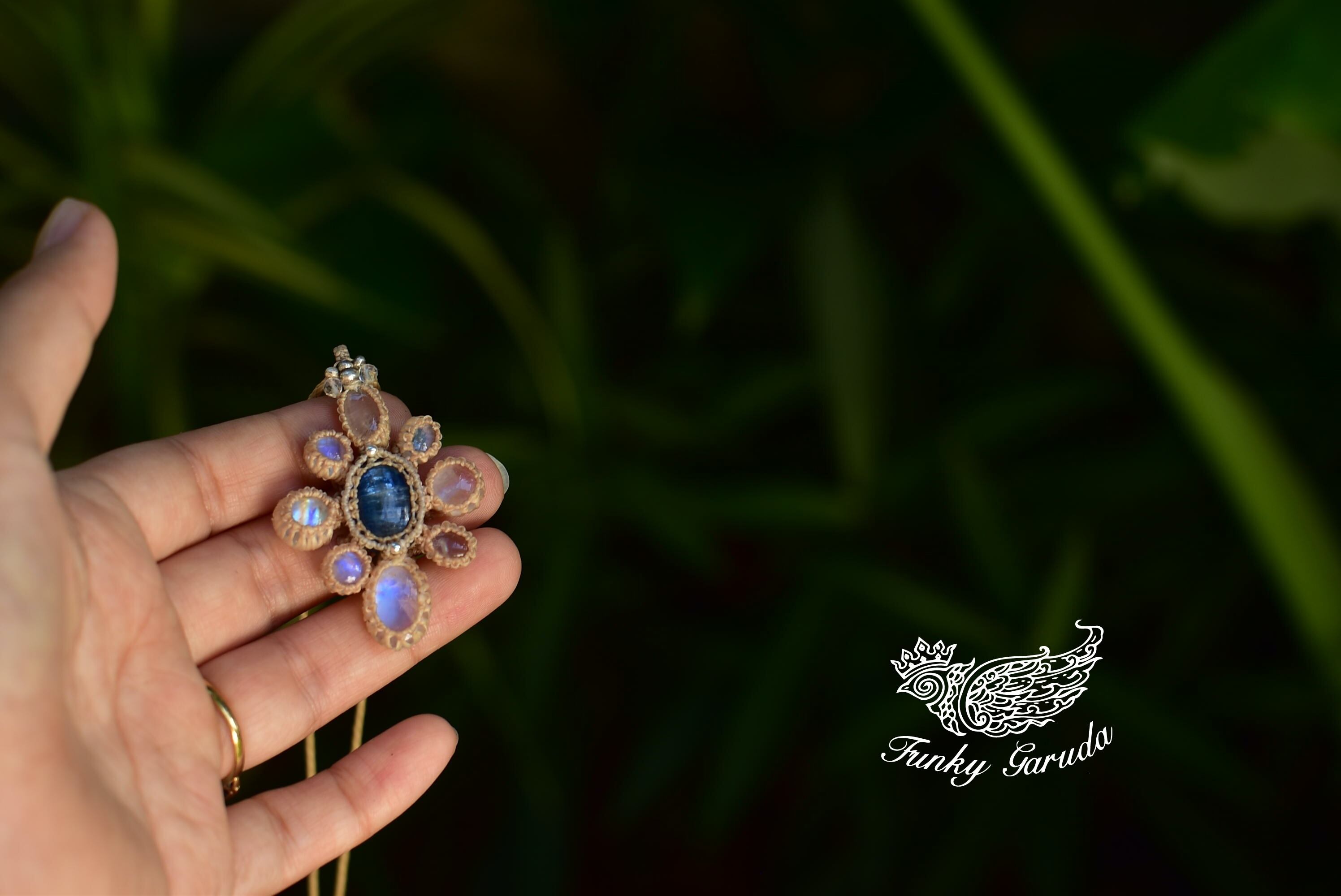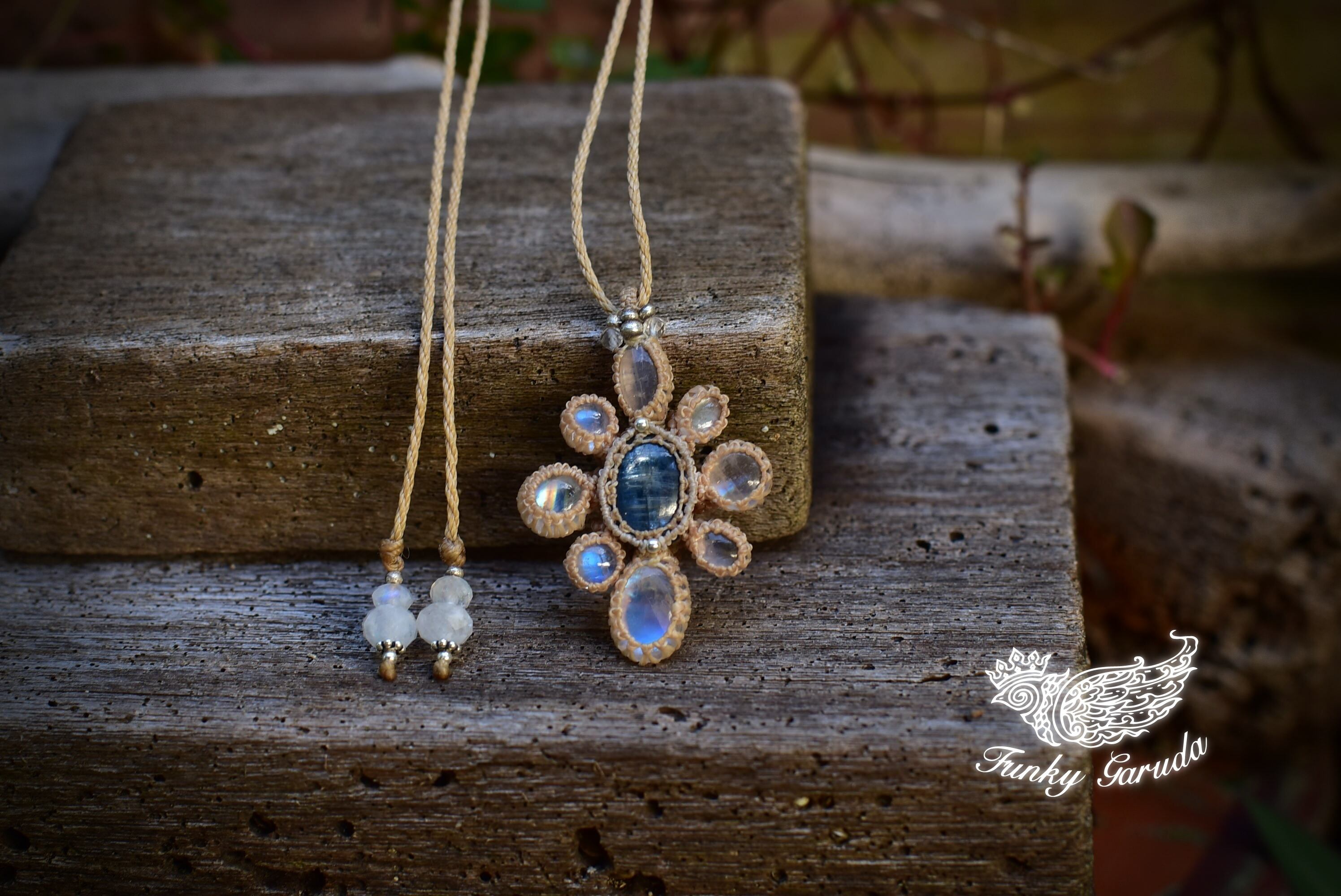 蒼く小さな花息吹★ムーンストーンとカイヤナイト マクラメペンダント kya006
