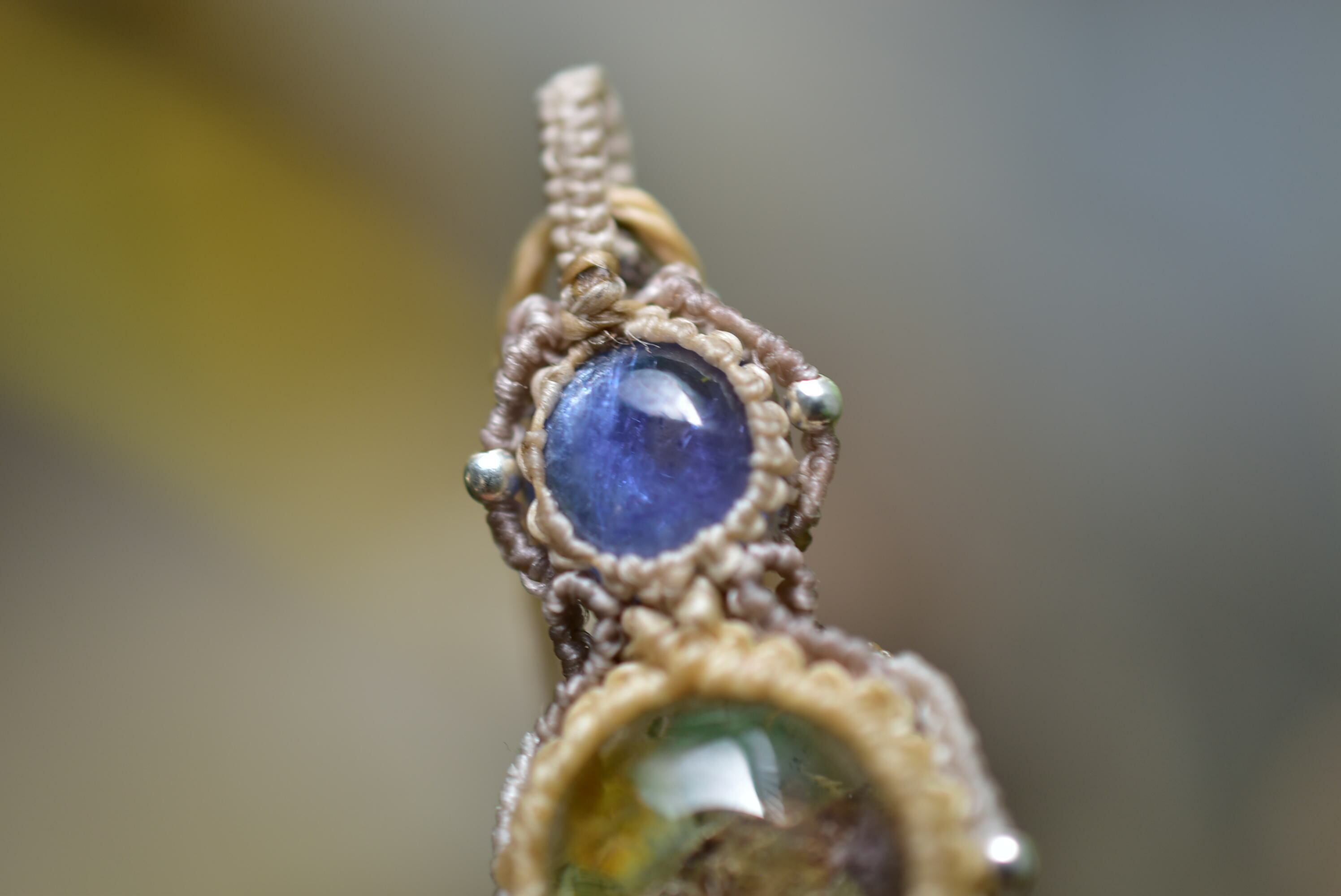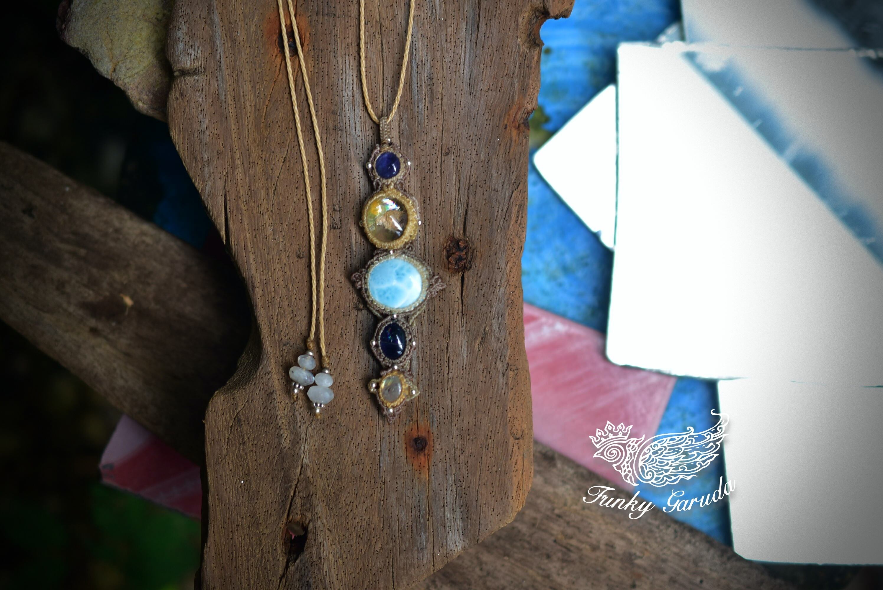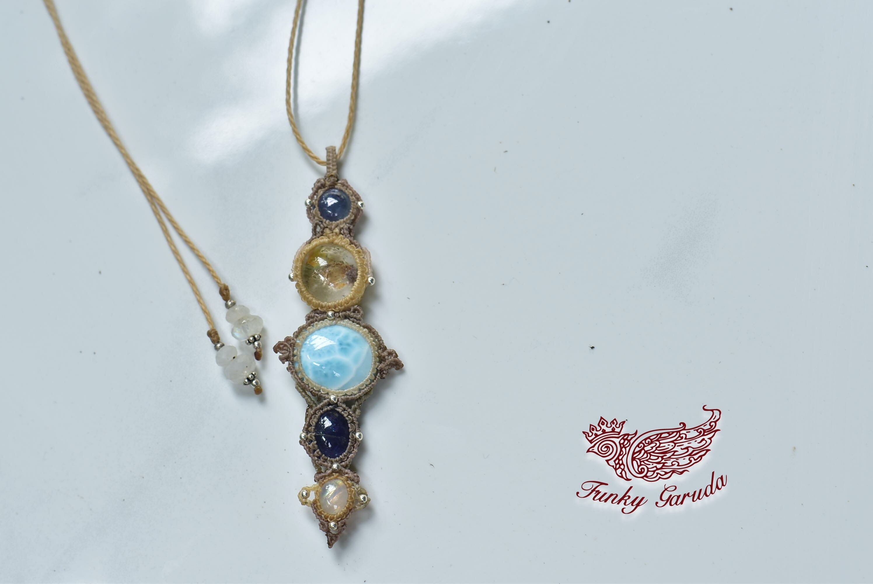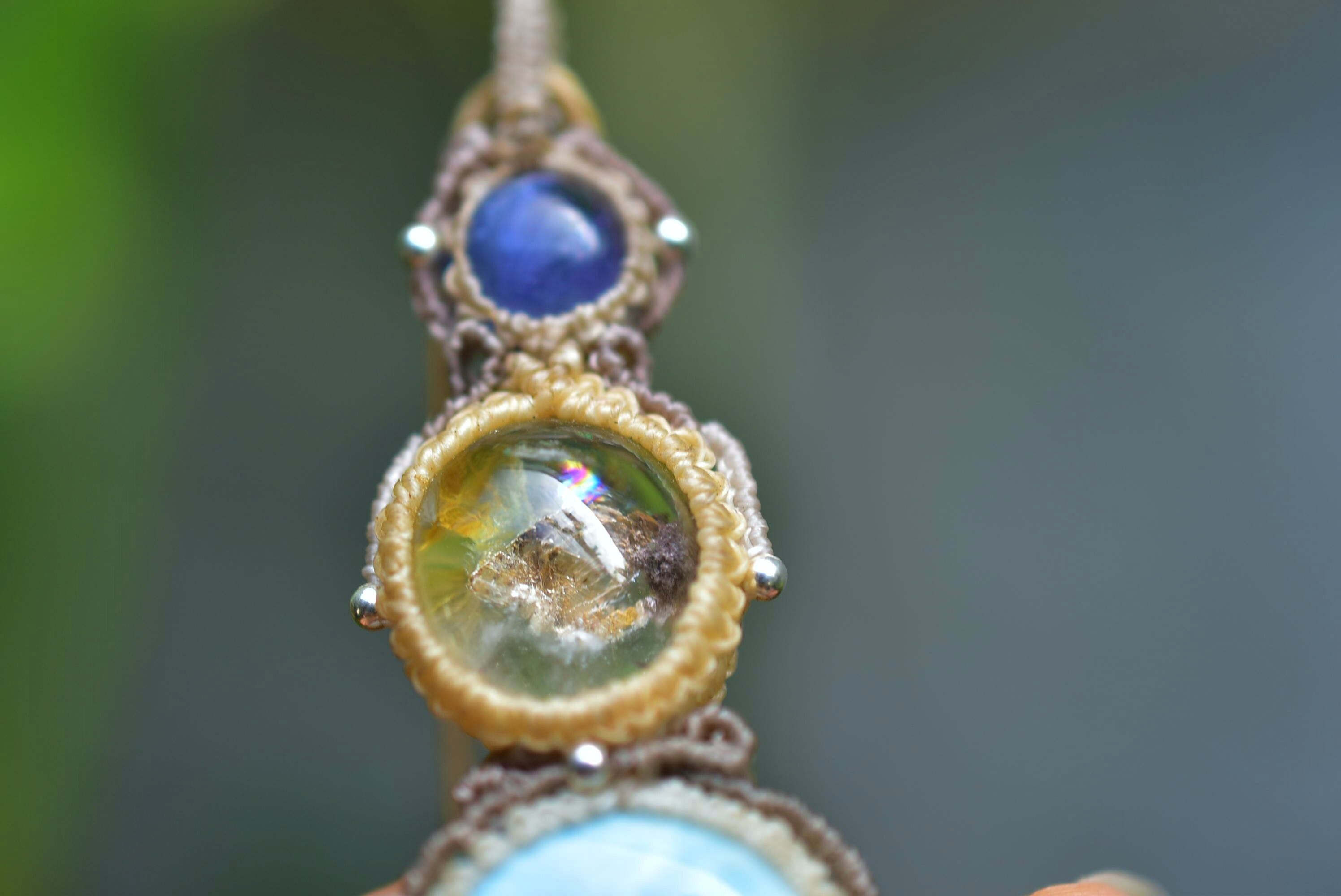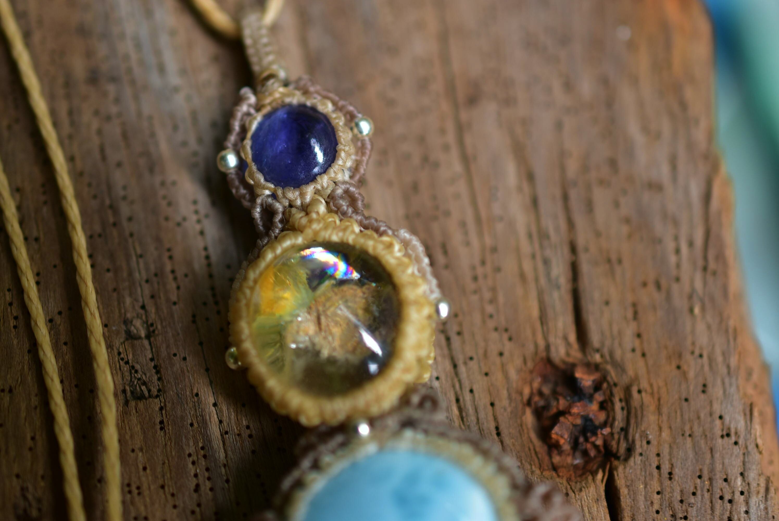 虹の見える石たちを順番に結びひとつにしたペンダントを仕上げました。