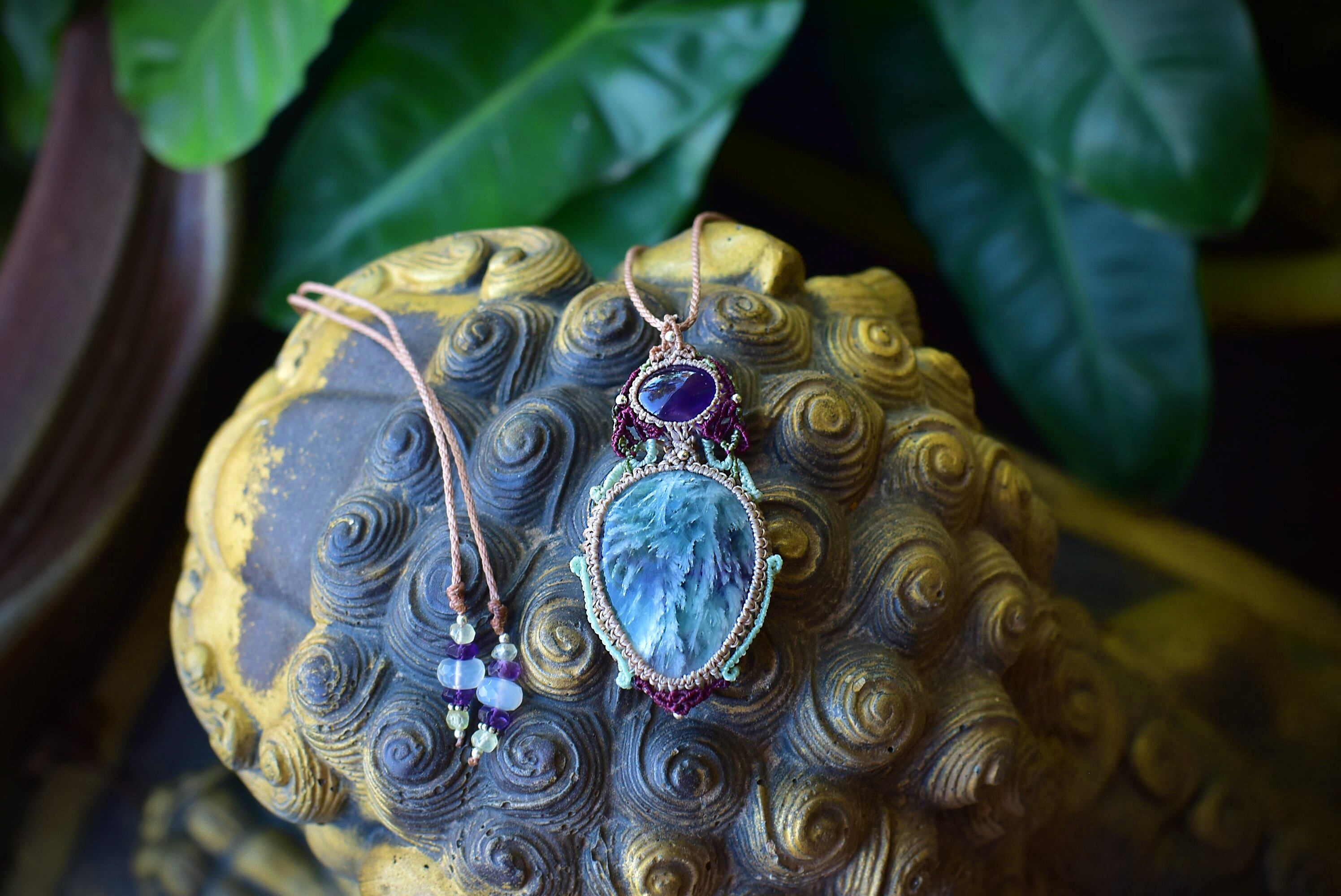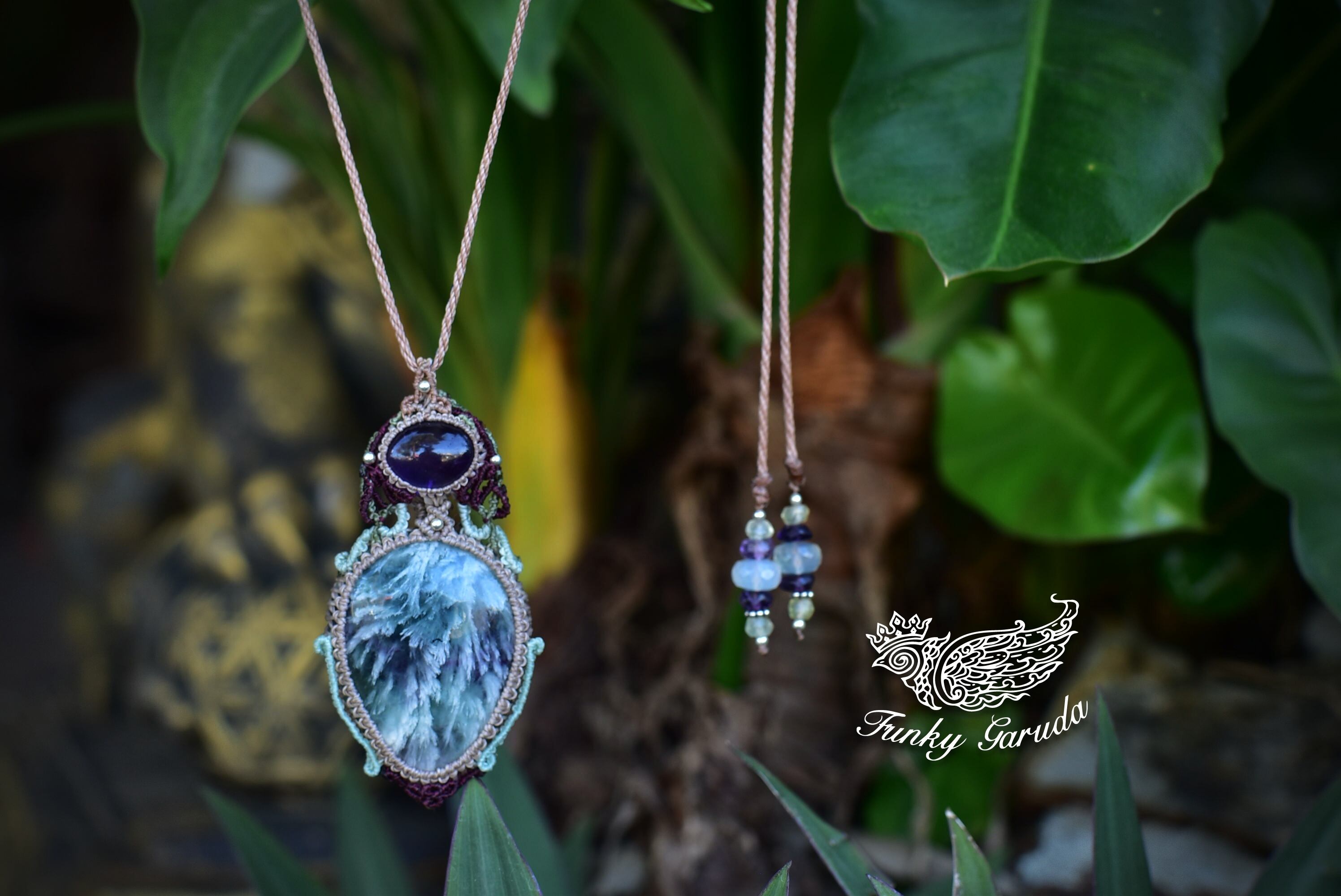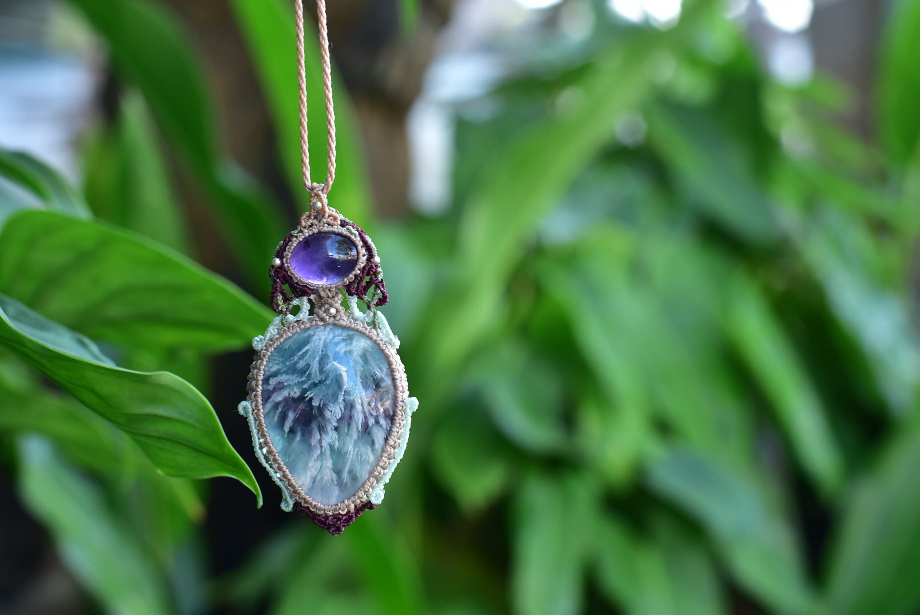 ブルーパープルカラーのボディに白い粉雪と天使の羽根が生えたような個性的な天然石であるエンジェルフェザーフローライト。トップにはブラジル産妖光な紫色が美しいアメジストを使用し、羽根と自然を一体にしたイメージでゆるやかにマクラメ編みを施しました。