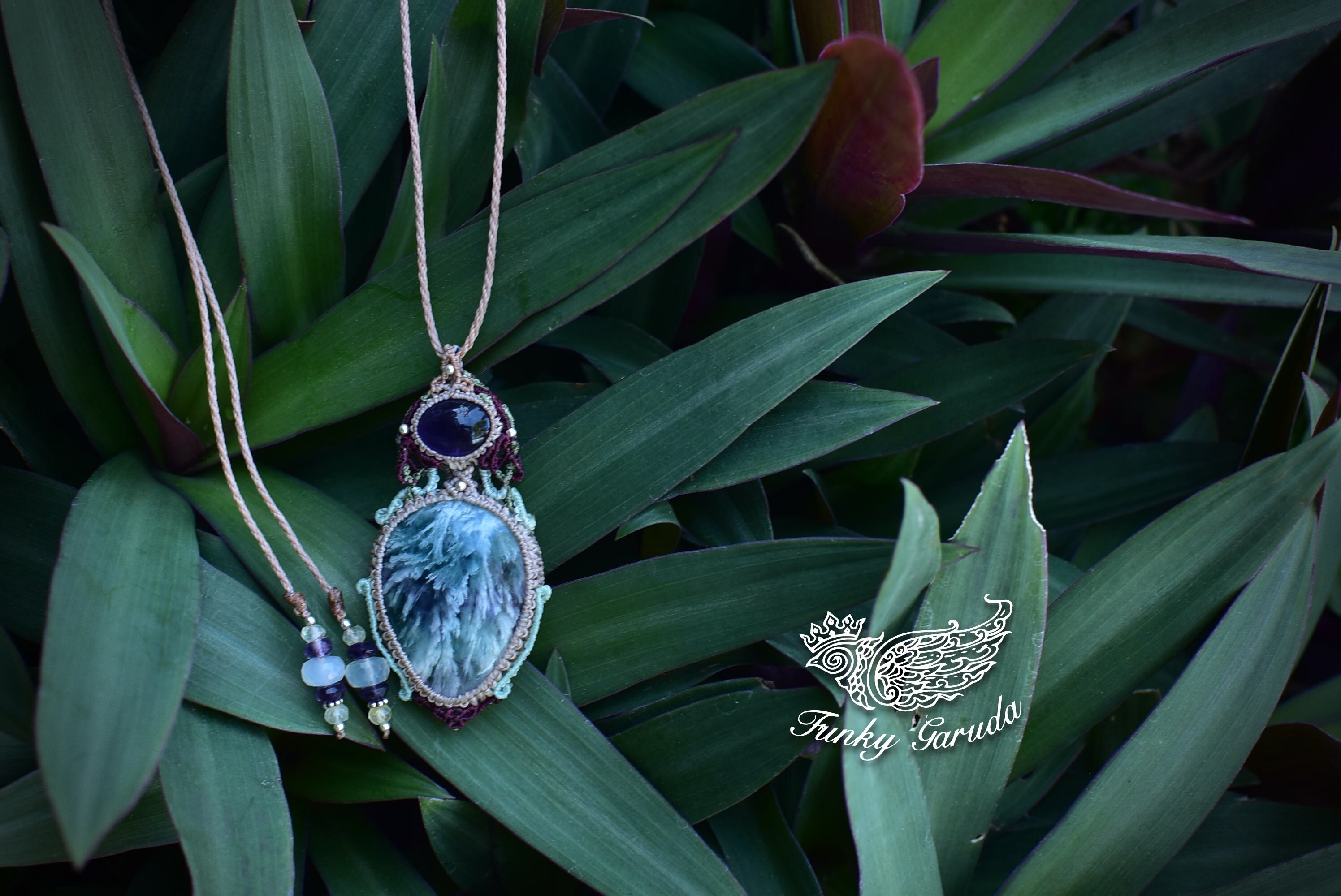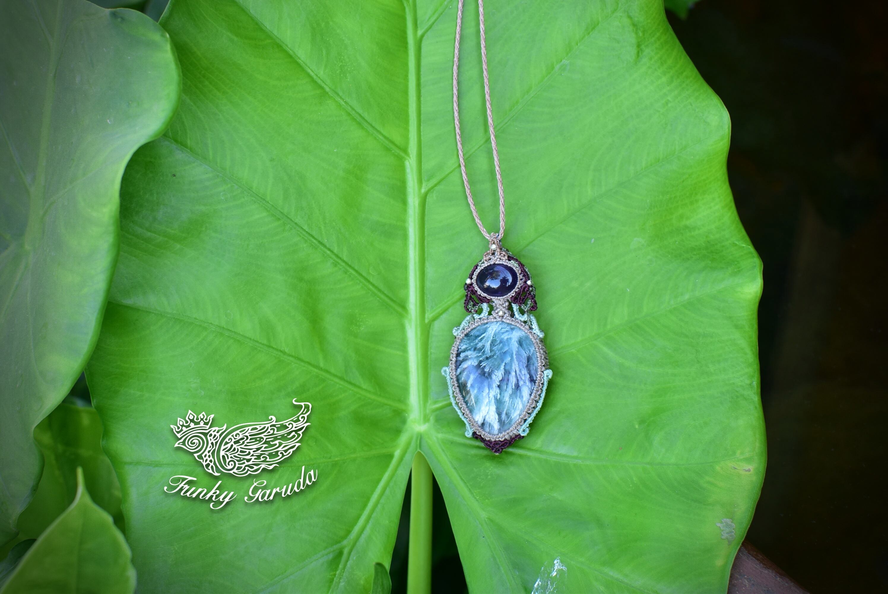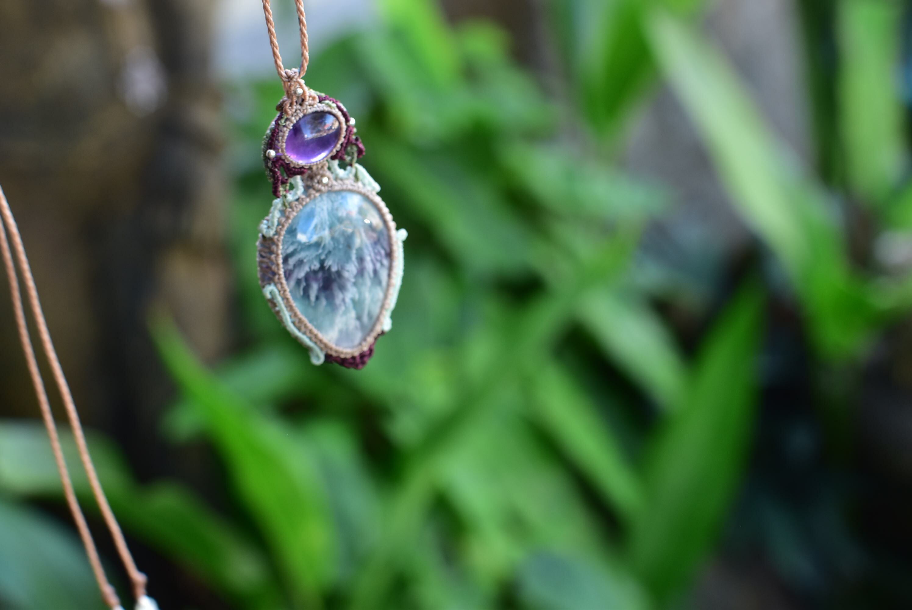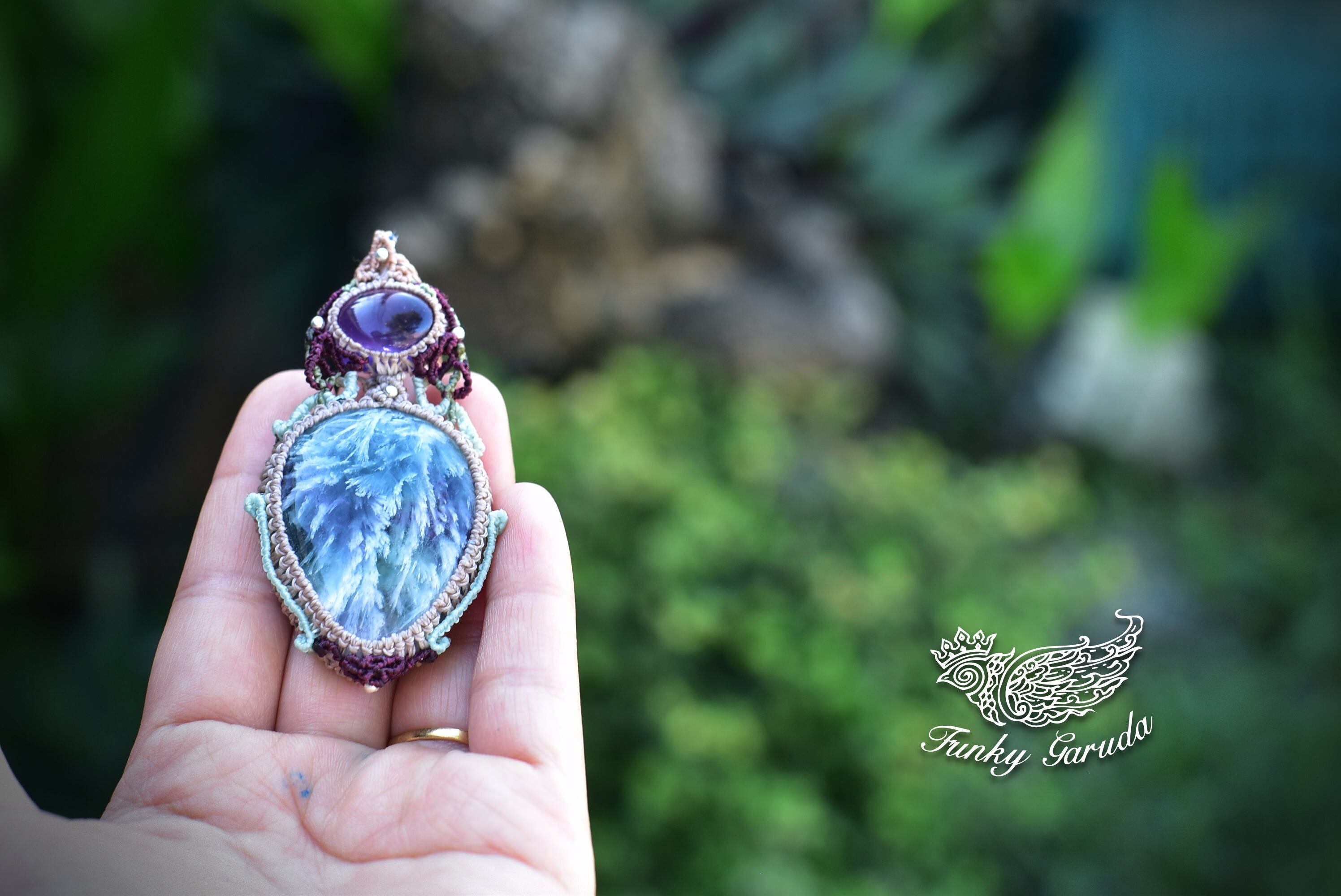 ブルーパープルカラーのボディに白い粉雪と天使の羽根が生えたような個性的な天然石であるエンジェルフェザーフローライト。トップにはブラジル産妖光な紫色が美しいアメジストを使用し、羽根と自然を一体にしたイメージでゆるやかにマクラメ編みを施しました。
