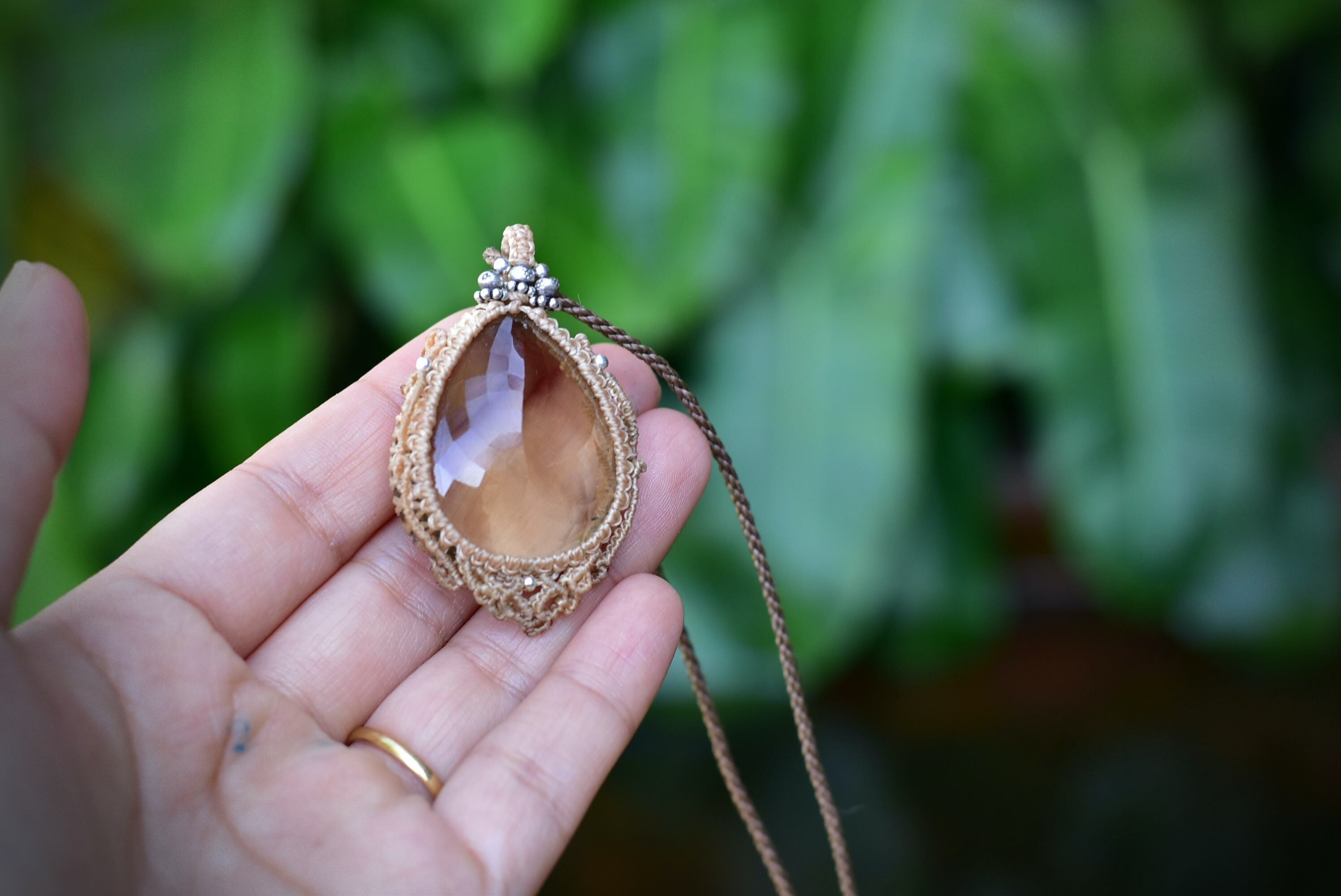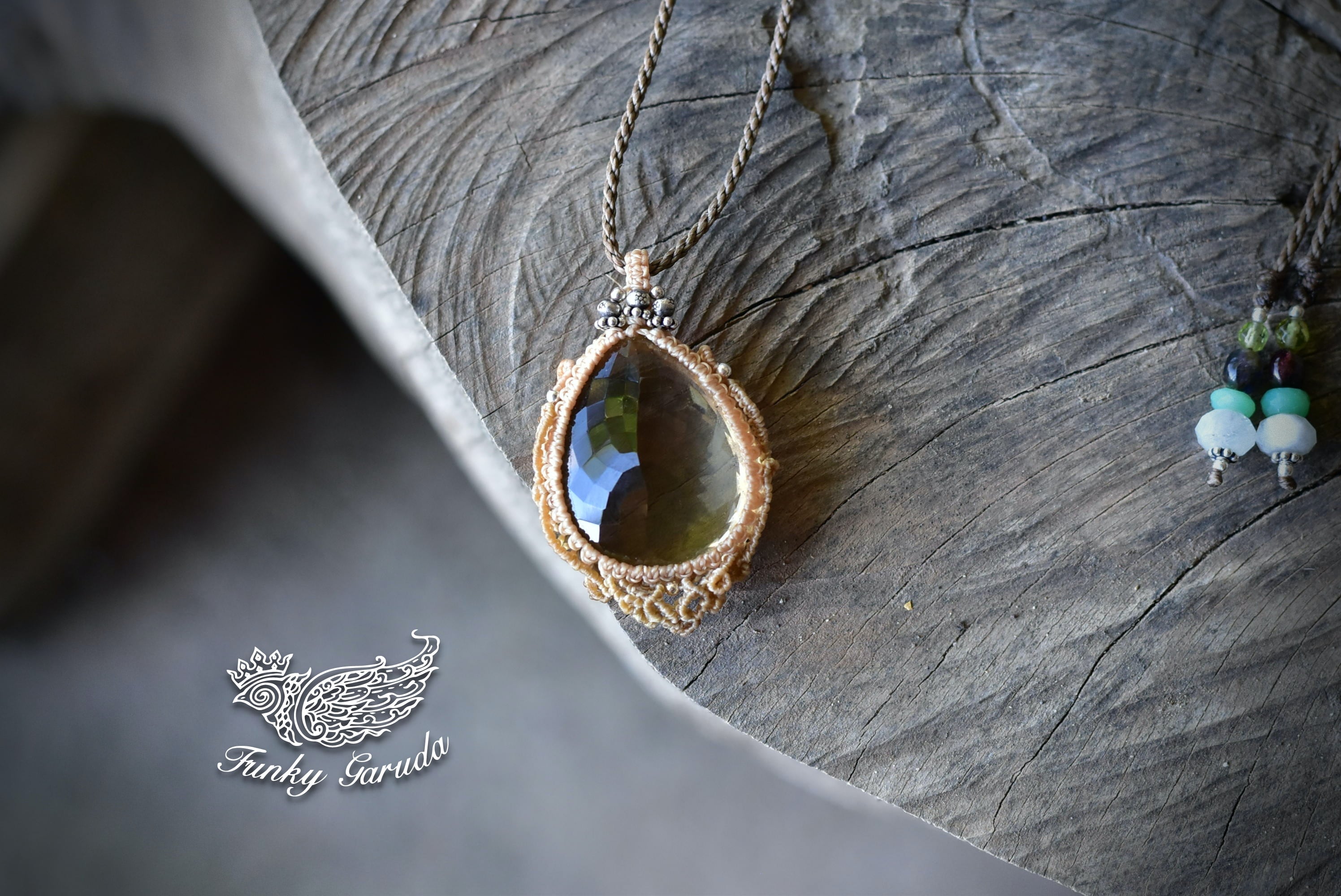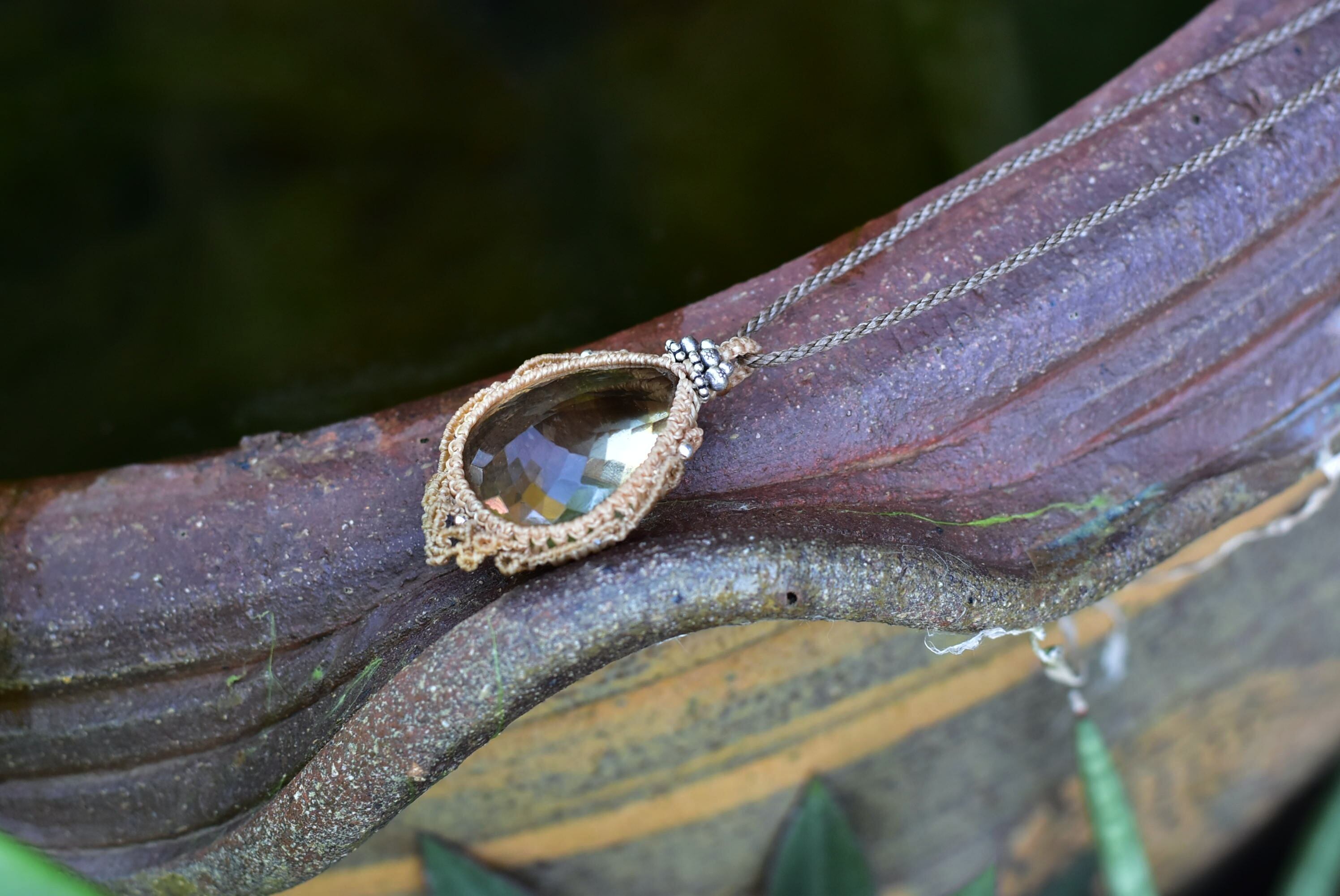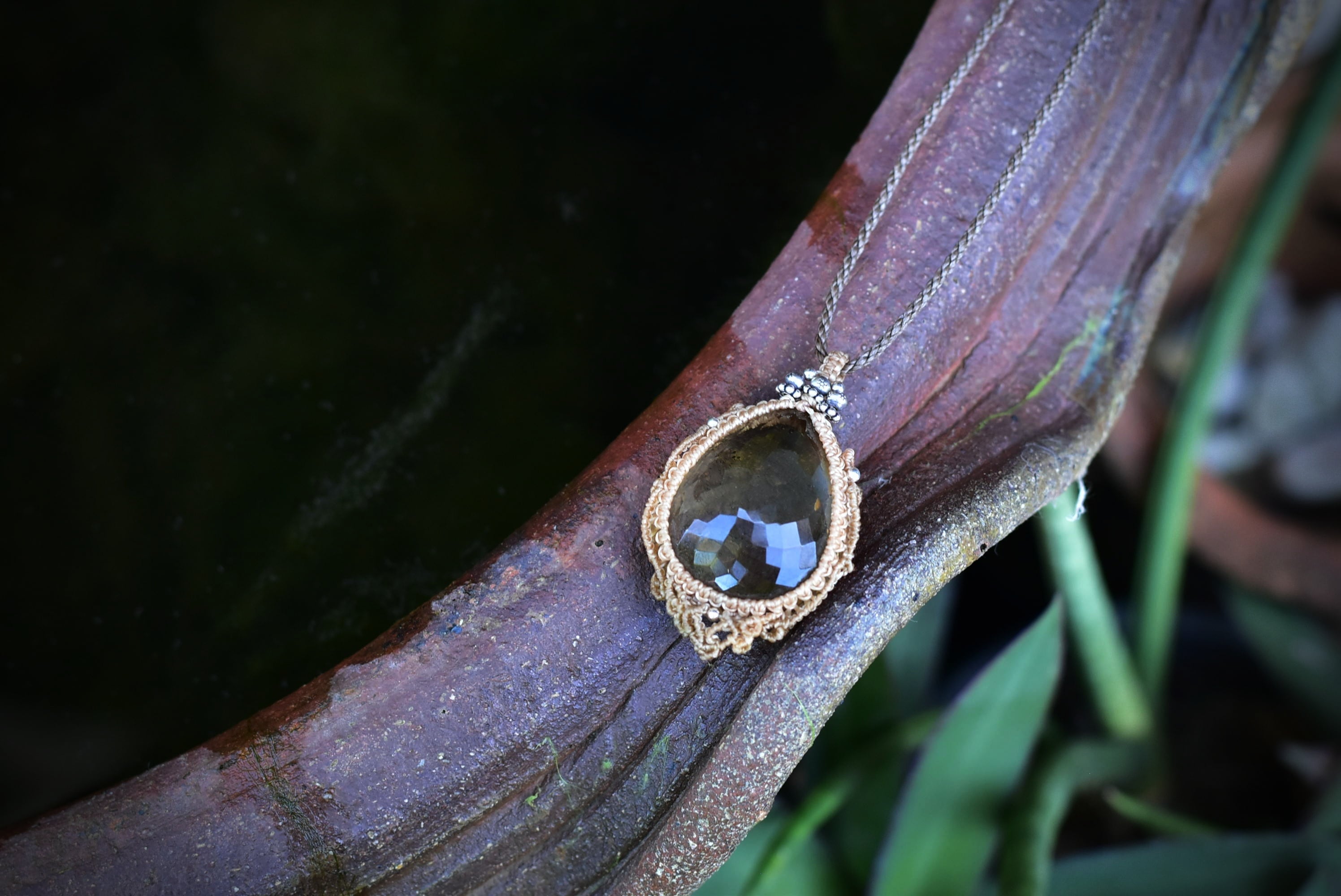 美しきディテールのファセットカットが施されたレモンクォーツ。透明感も高く、美しいピースをエレガントなイメージでマクラメ編み装飾を施して仕上げました。