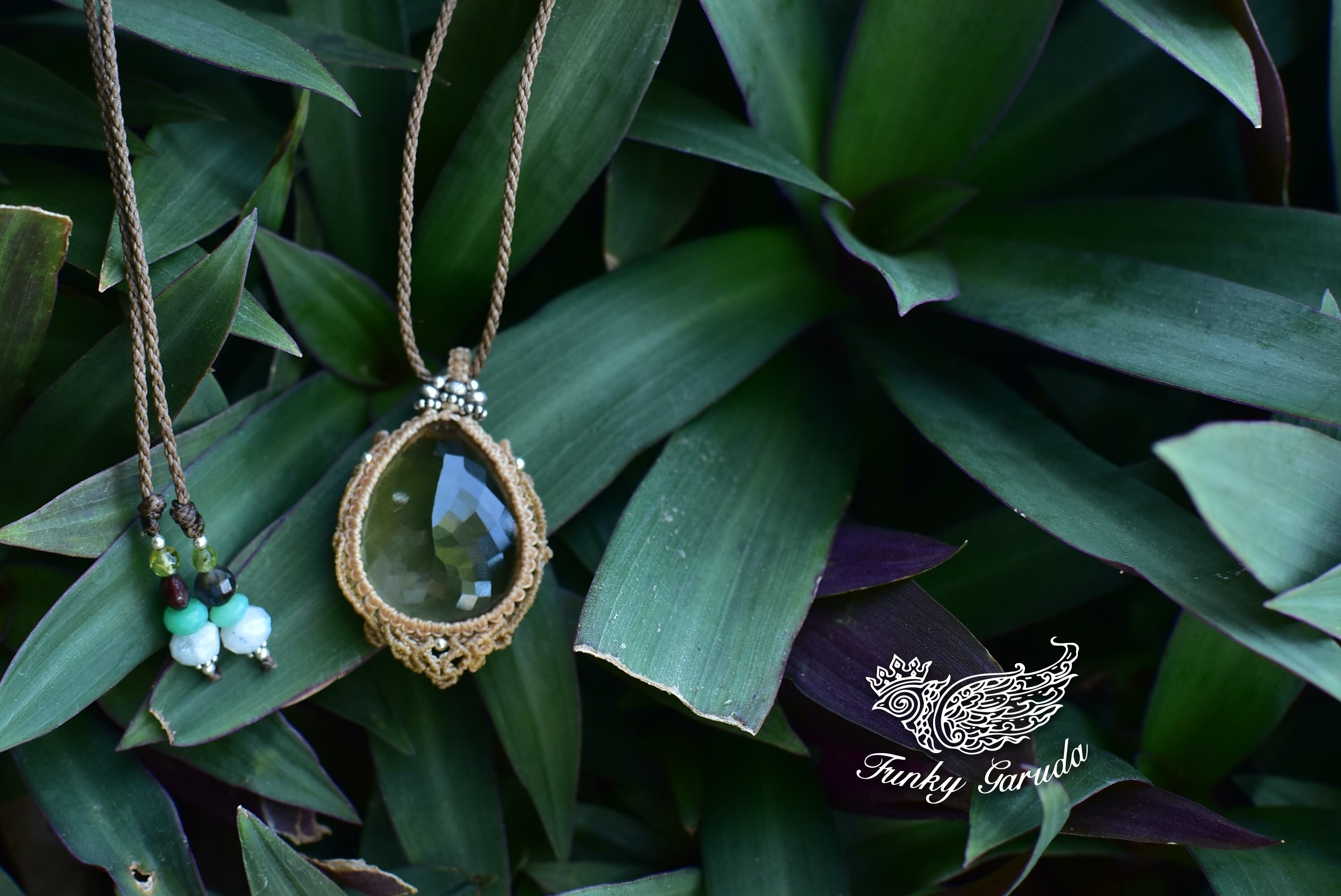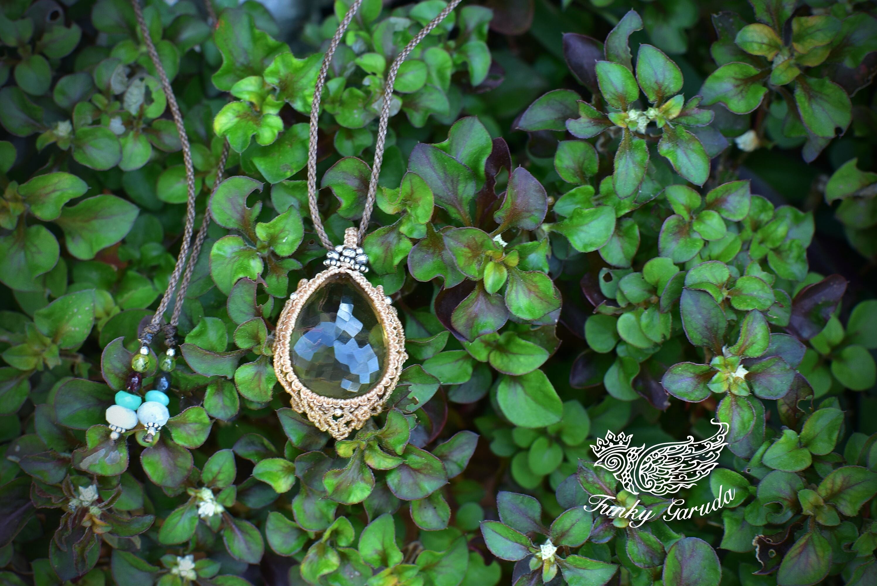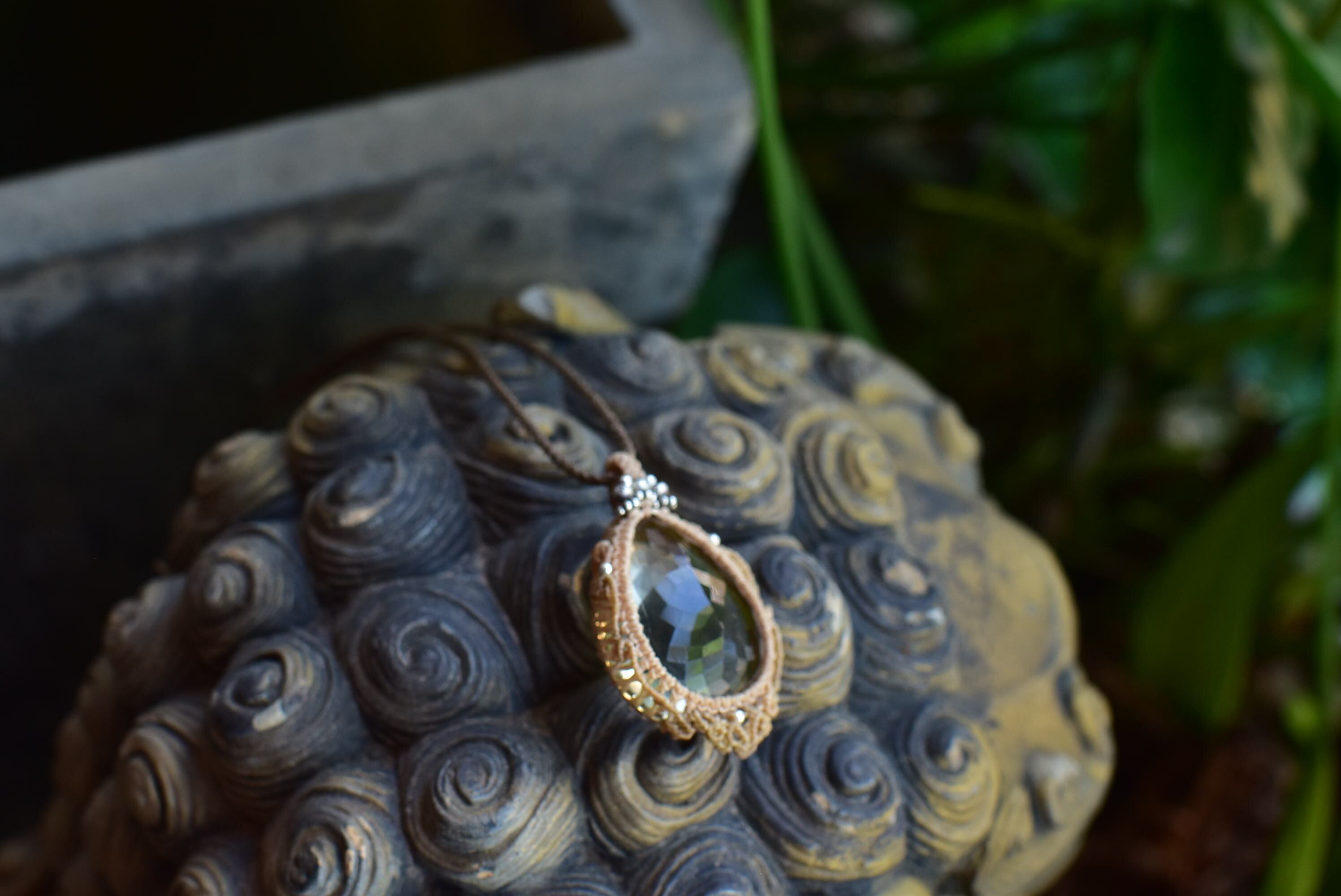 美しきディテールのファセットカットが施されたレモンクォーツ。透明感も高く、美しいピースをエレガントなイメージでマクラメ編み装飾を施して仕上げました。