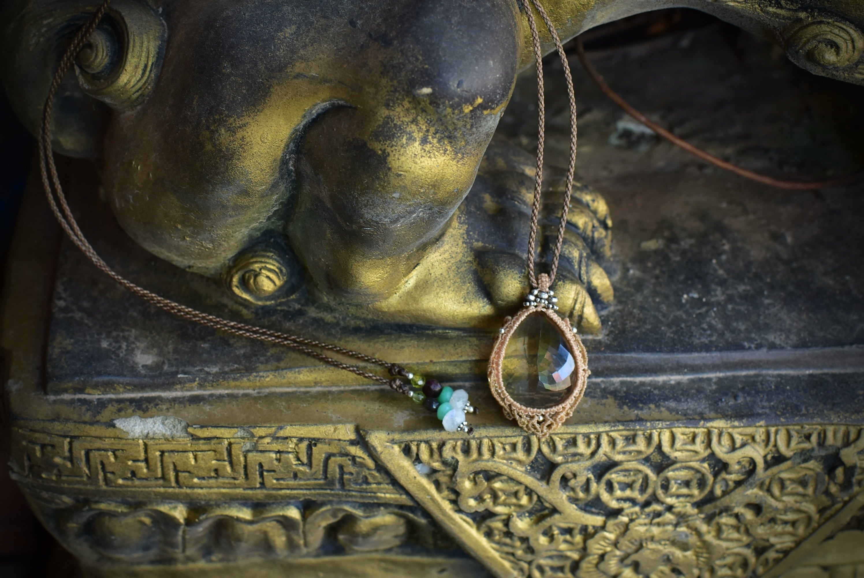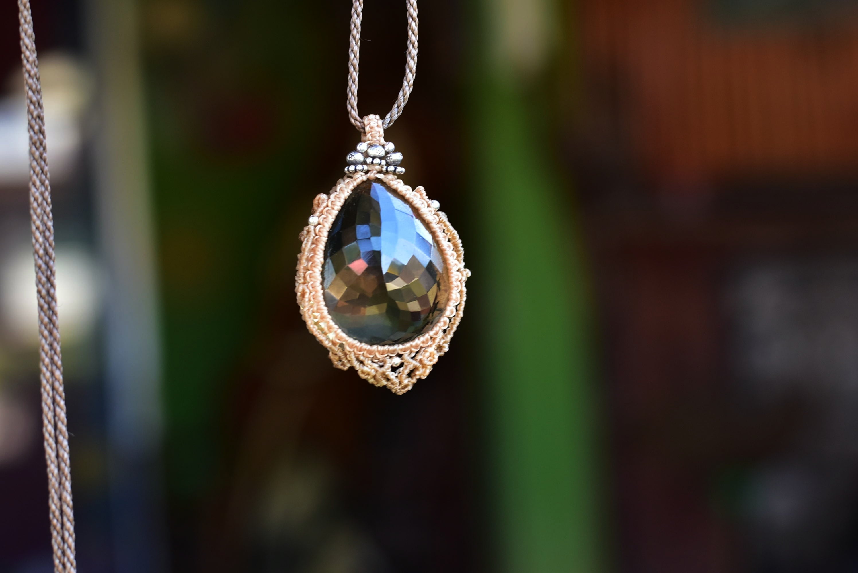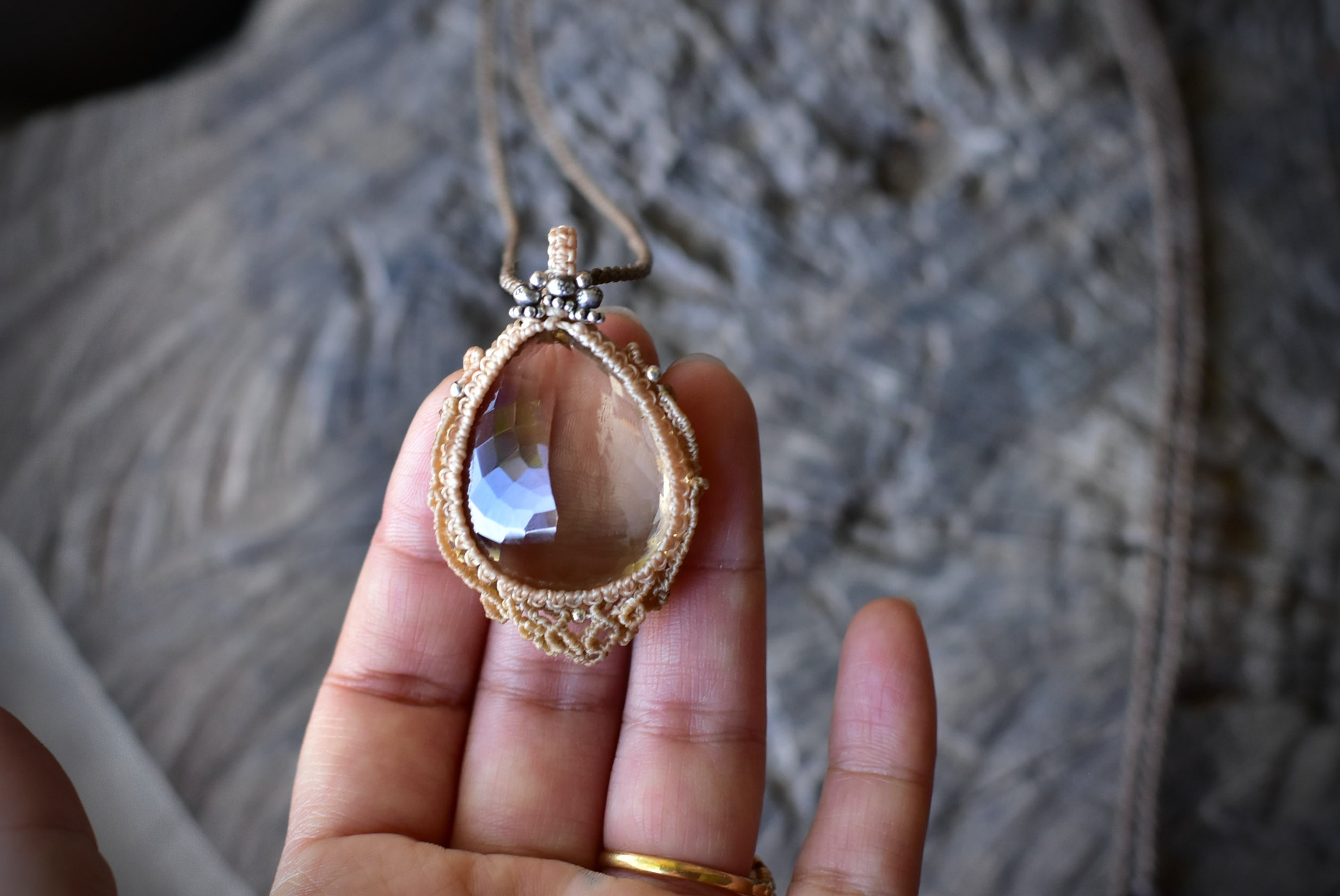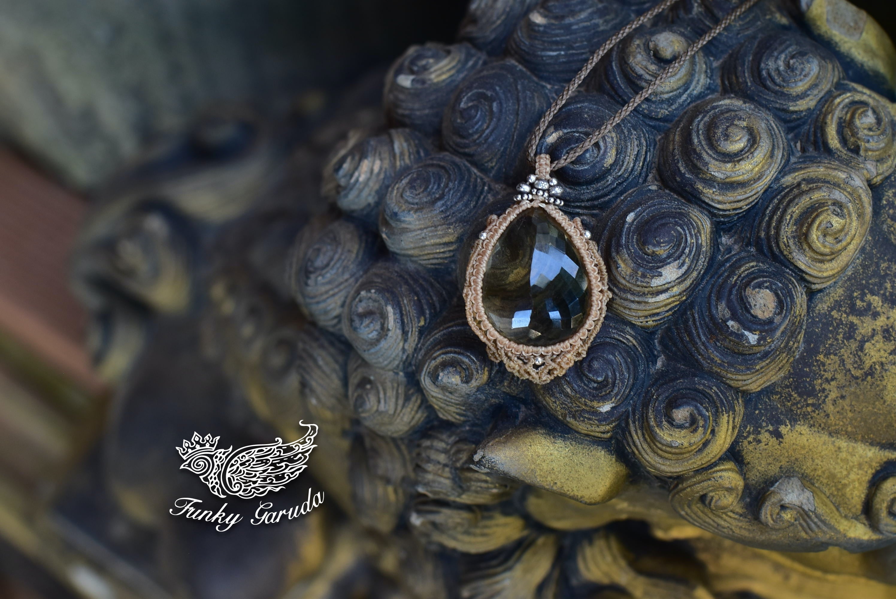 美しきディテールのファセットカットが施されたレモンクォーツ。透明感も高く、美しいピースをエレガントなイメージでマクラメ編み装飾を施して仕上げました。