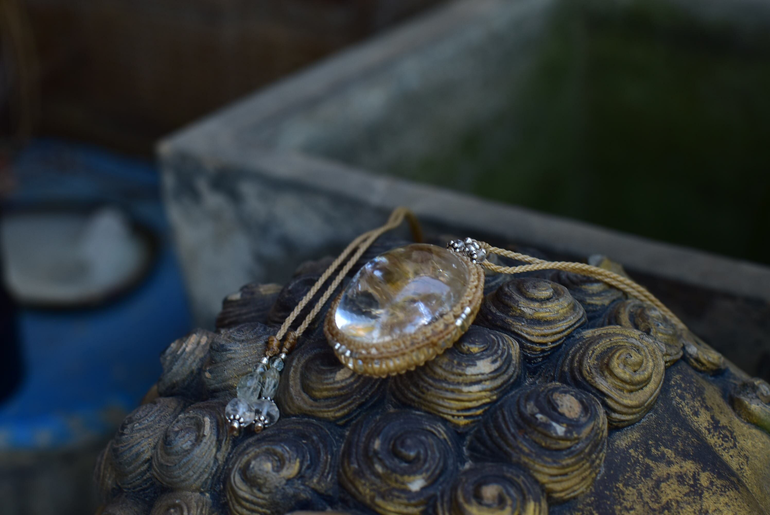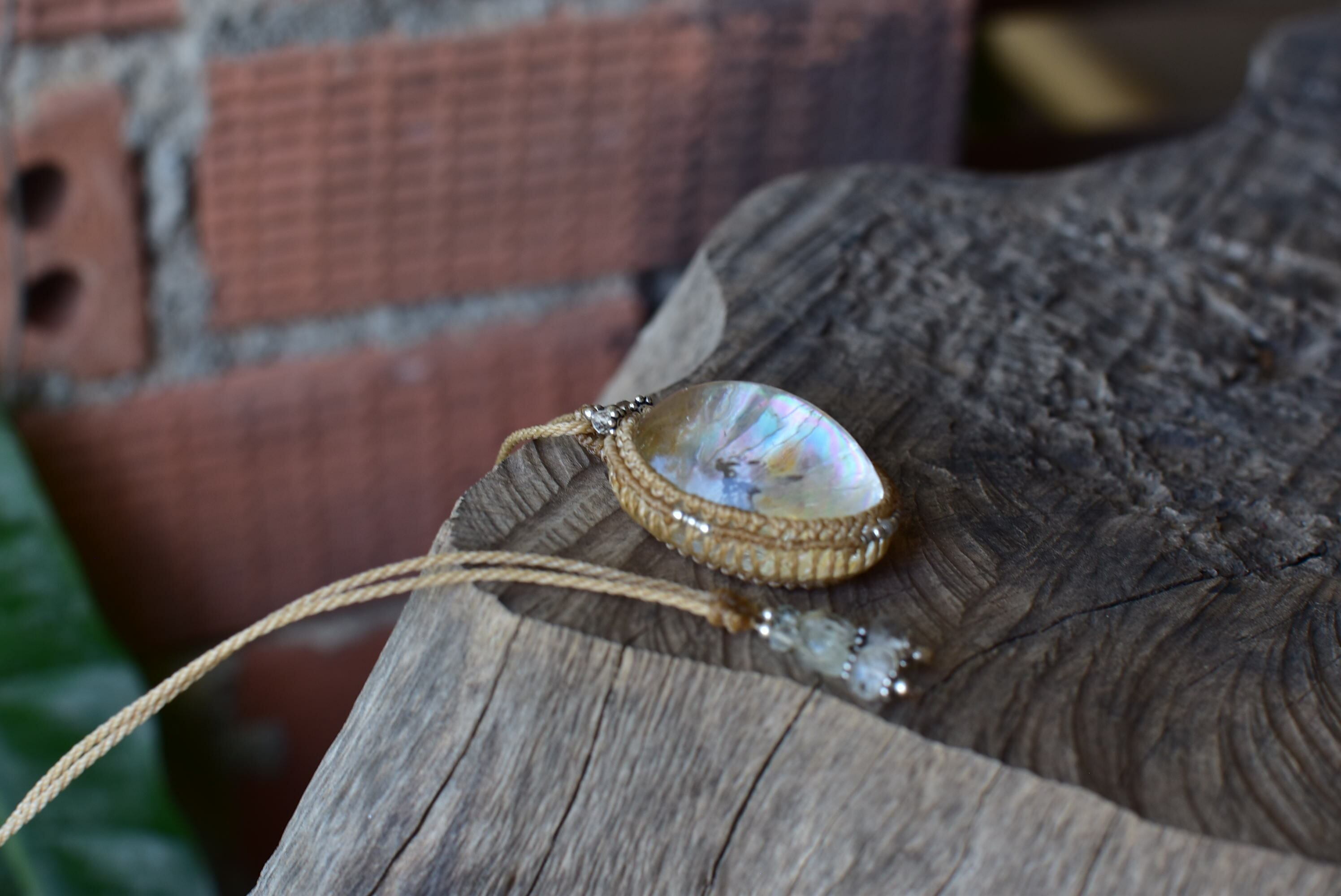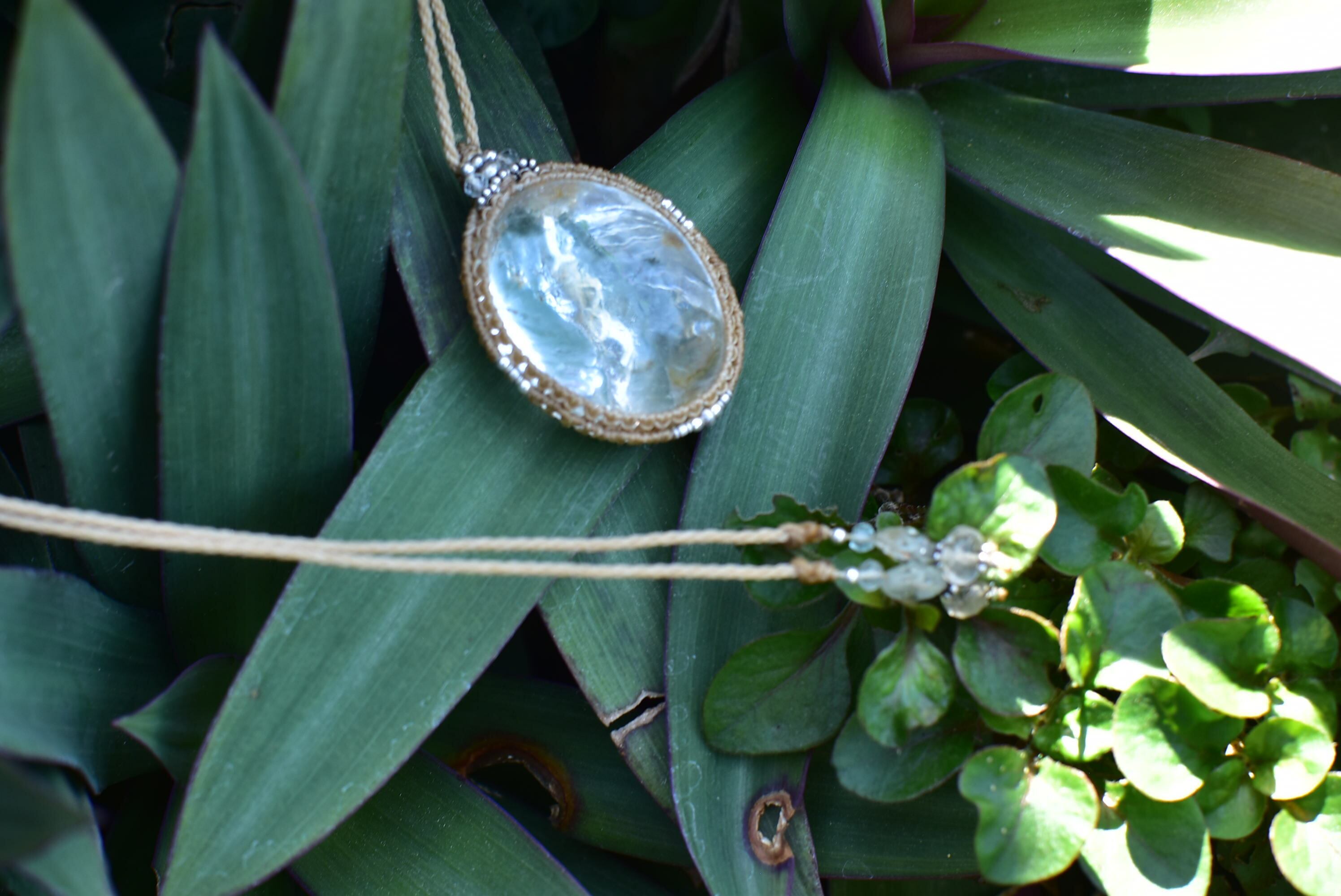 ◆このたびはキャラメル色の蝋引き糸を使用しマクラメ編み装飾を施しました。