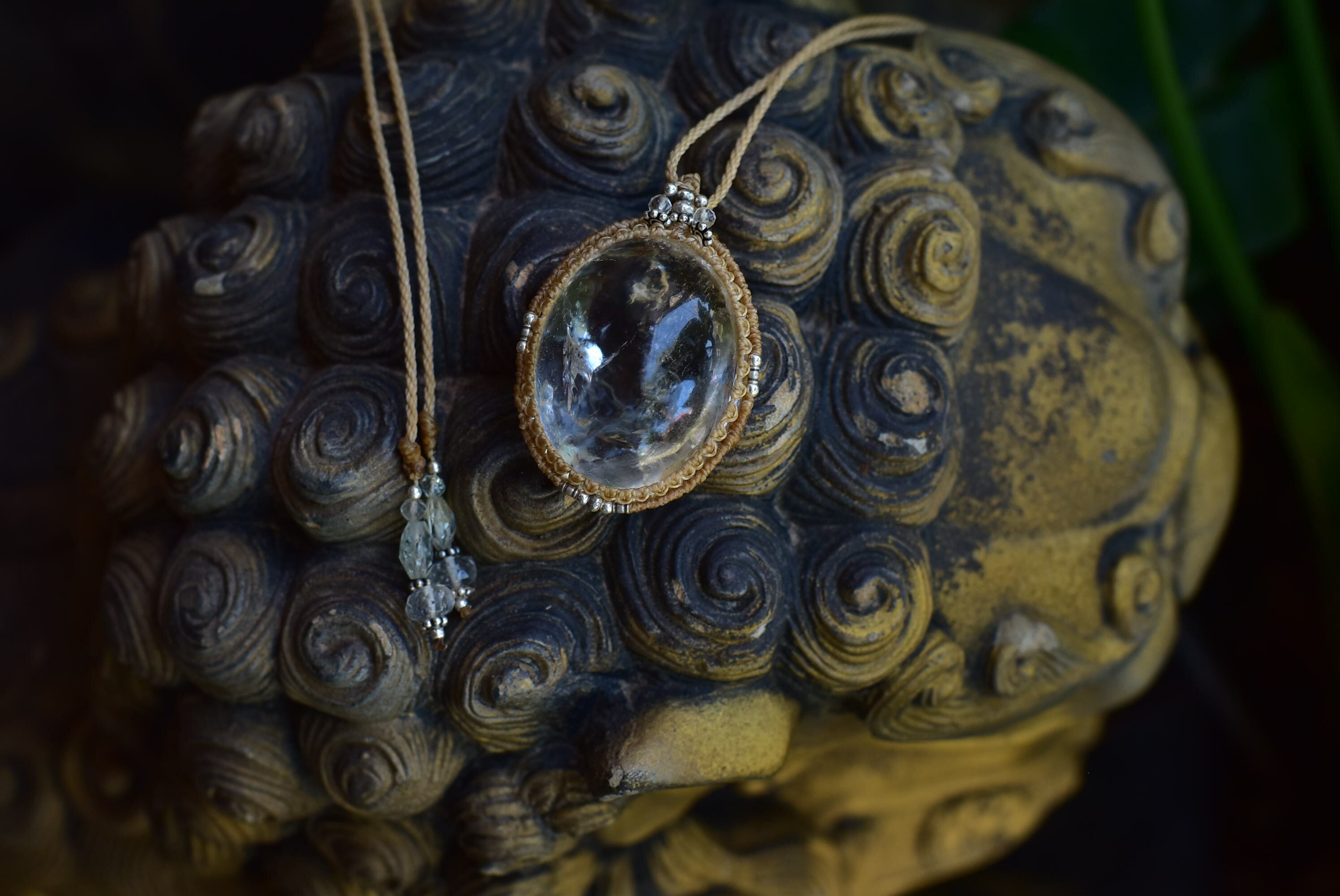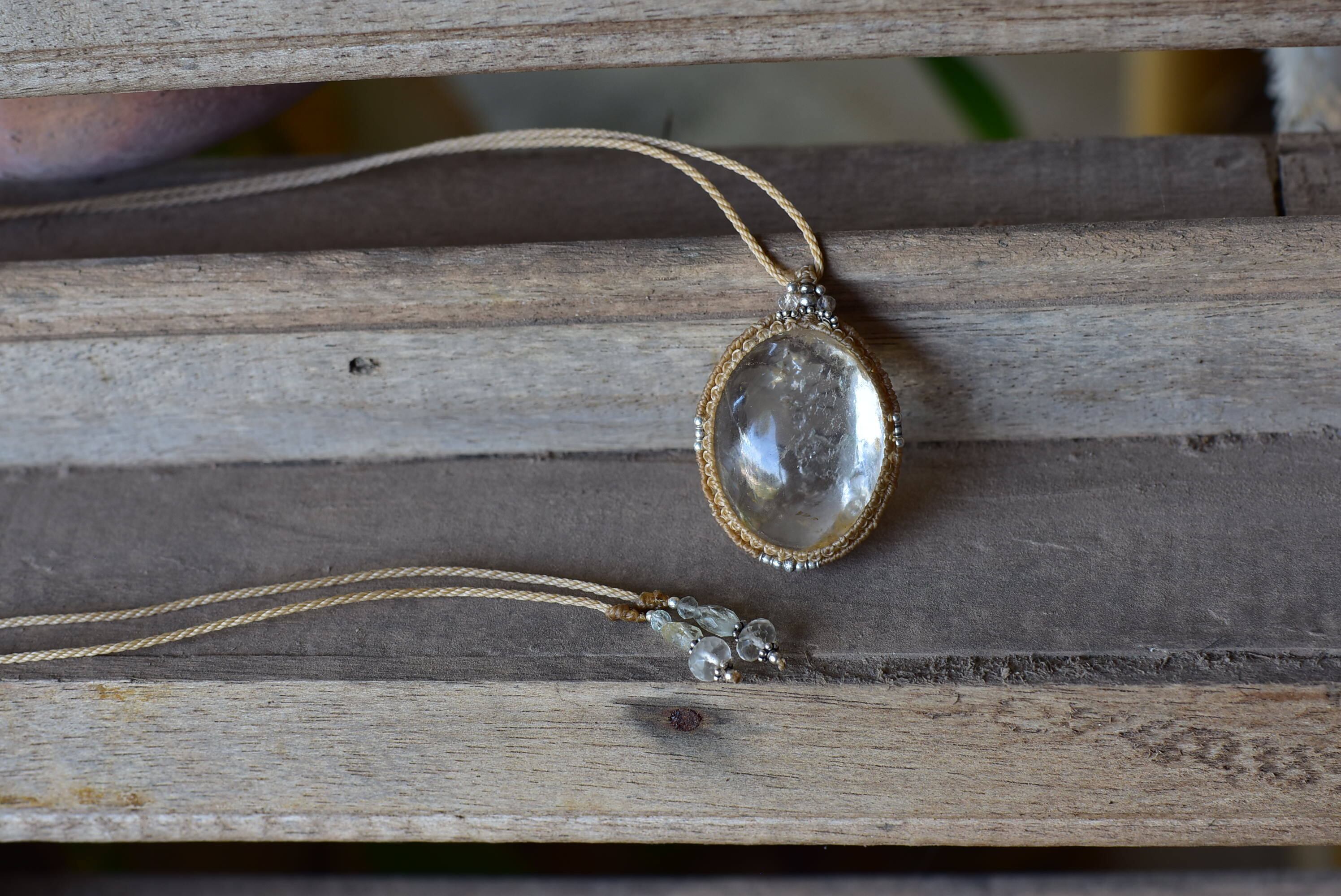 大粒な透明感ある水晶の中に潜んでいる虹インクルージョンが美しい大きな水晶をシンプルにマクラメペンダントに仕上げました。
