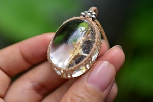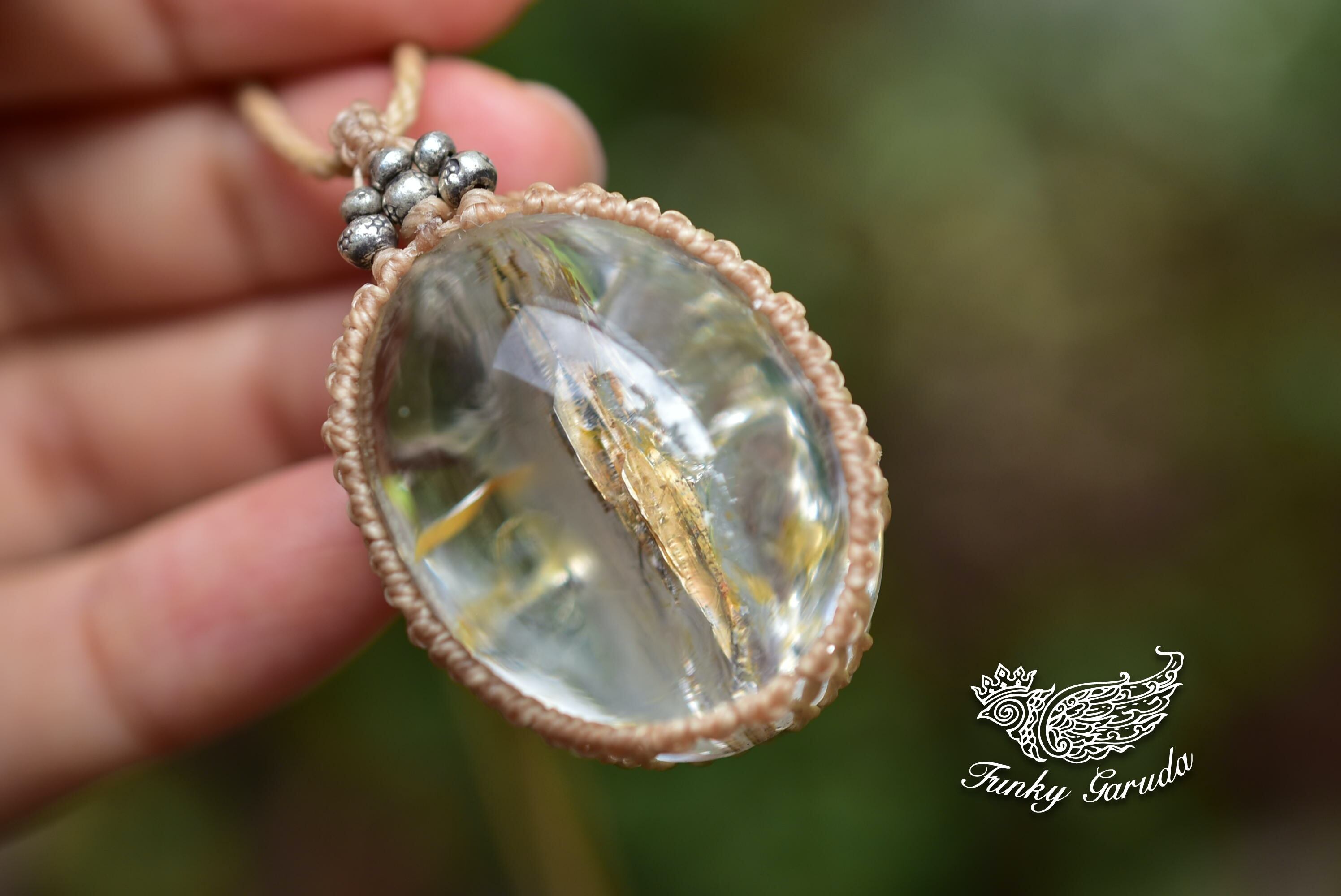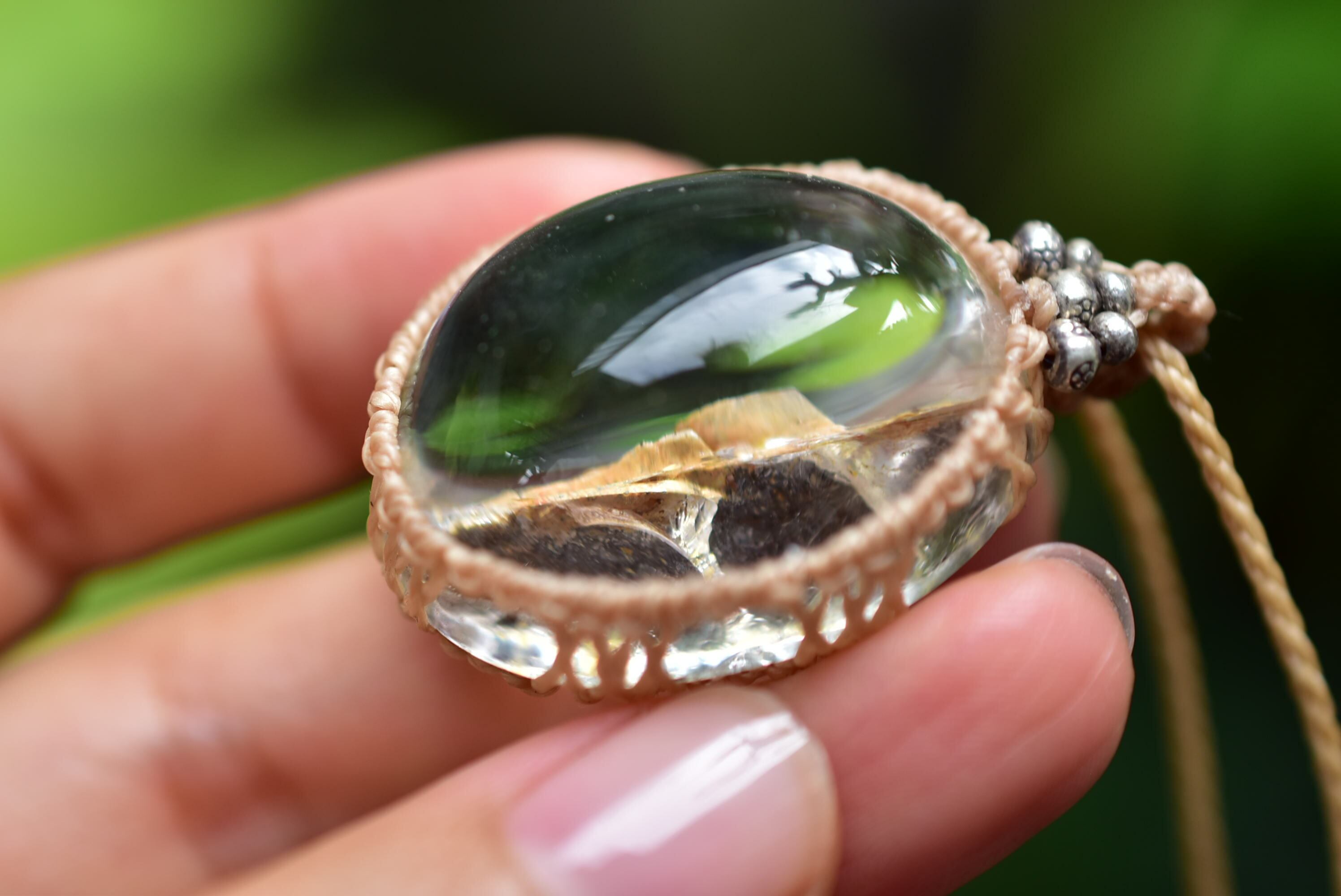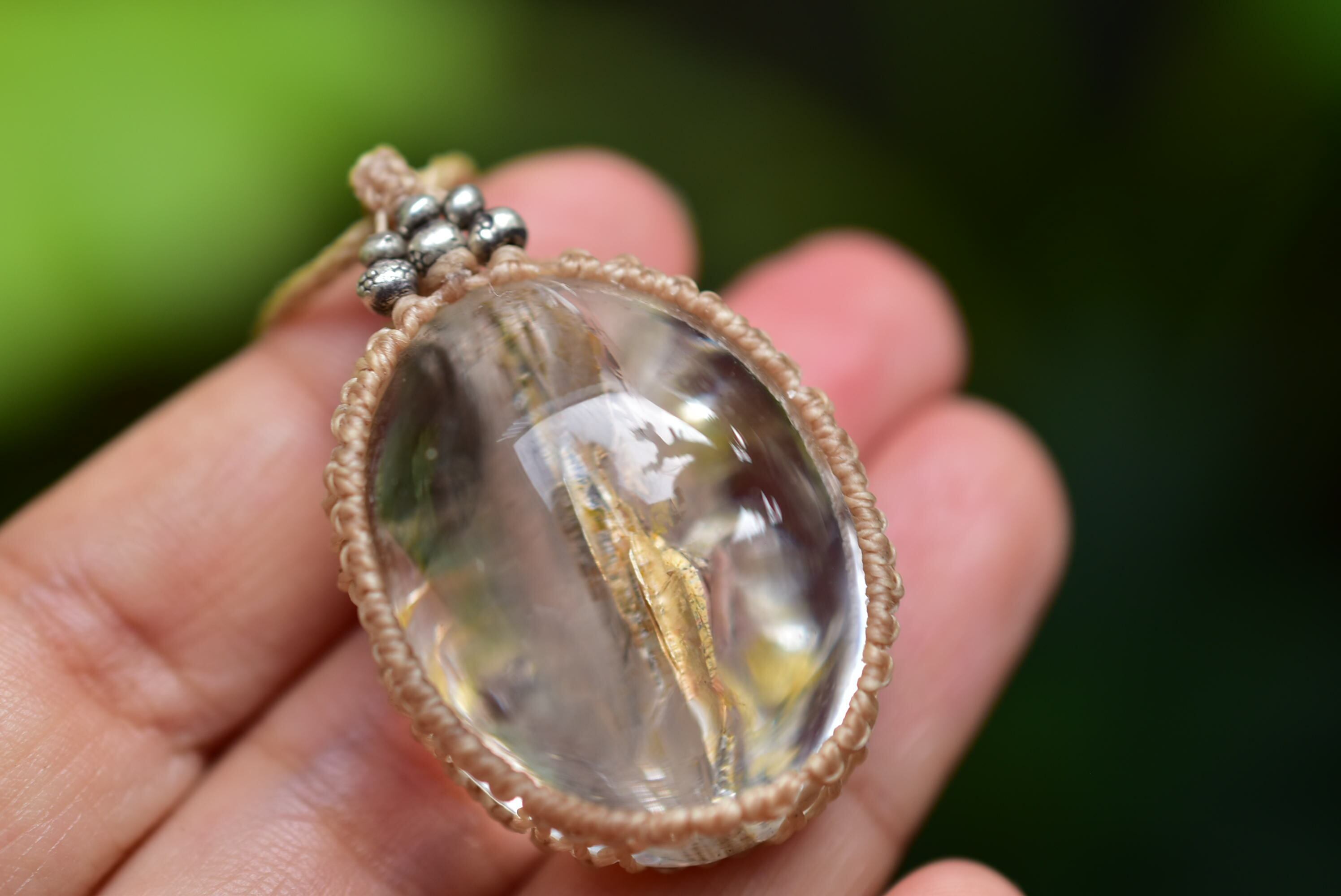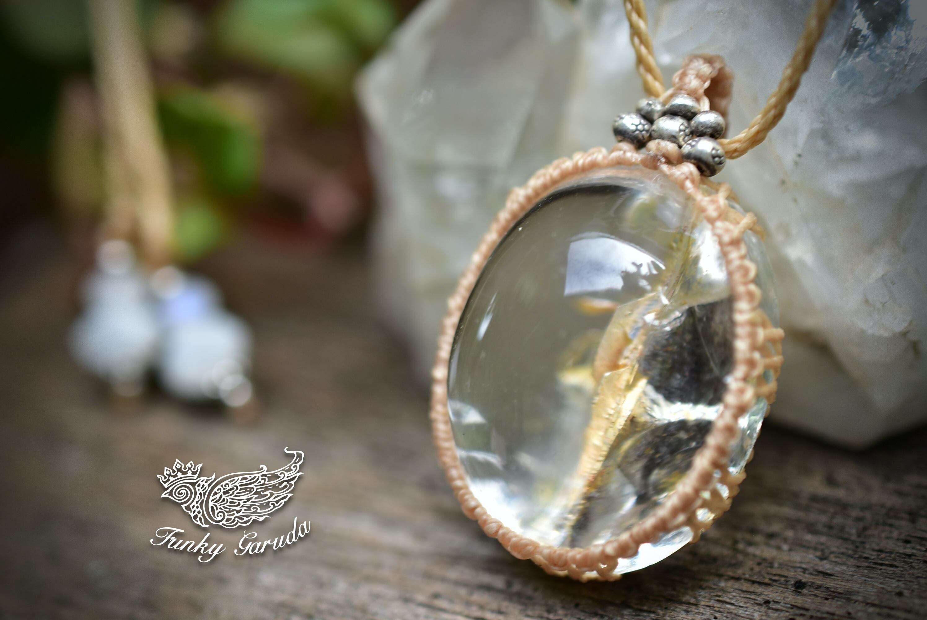透明感もよく、ぷっくりとしたルースを水晶の中が見えるようにマクラメ編み装飾を施してペンダントに仕上げました。