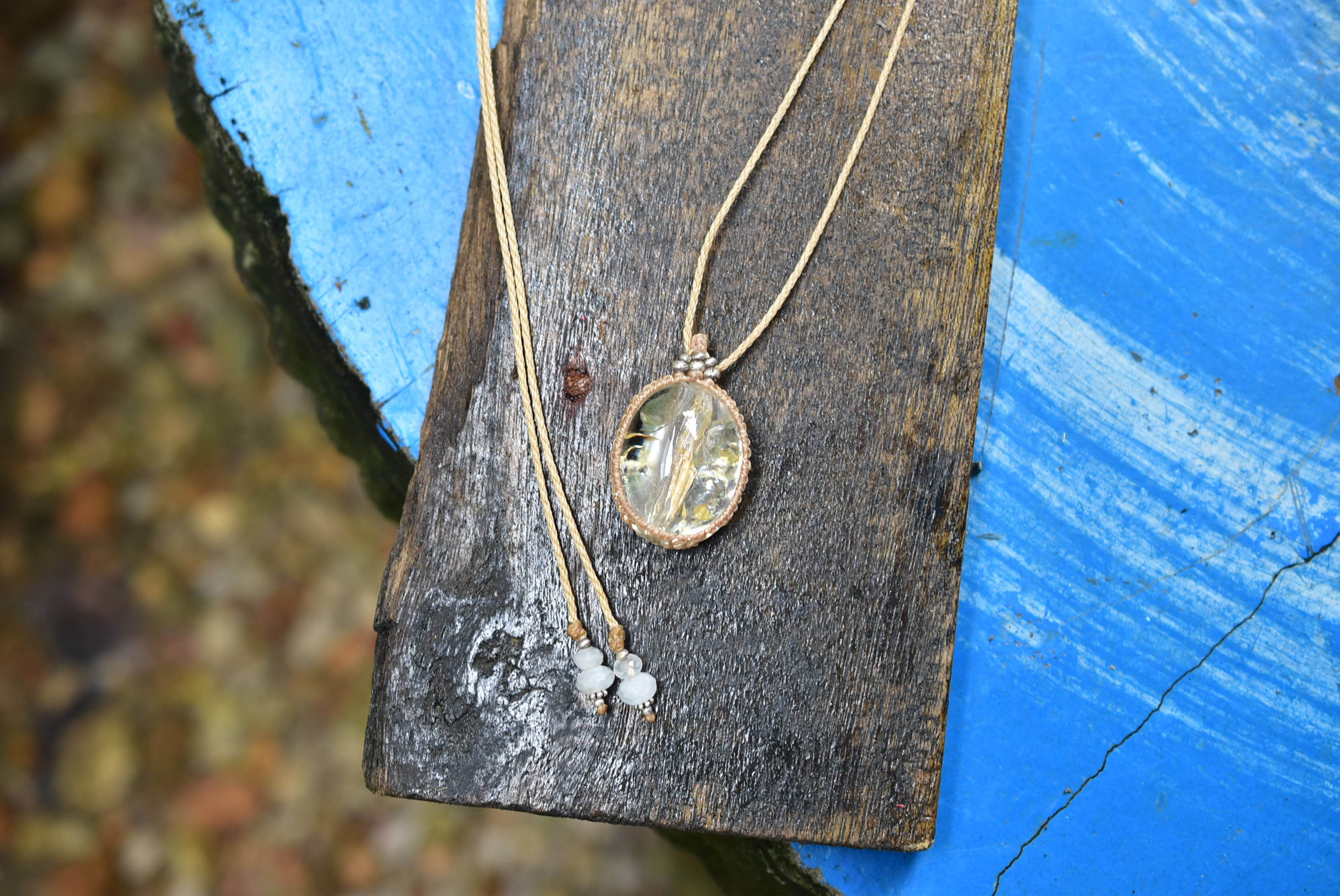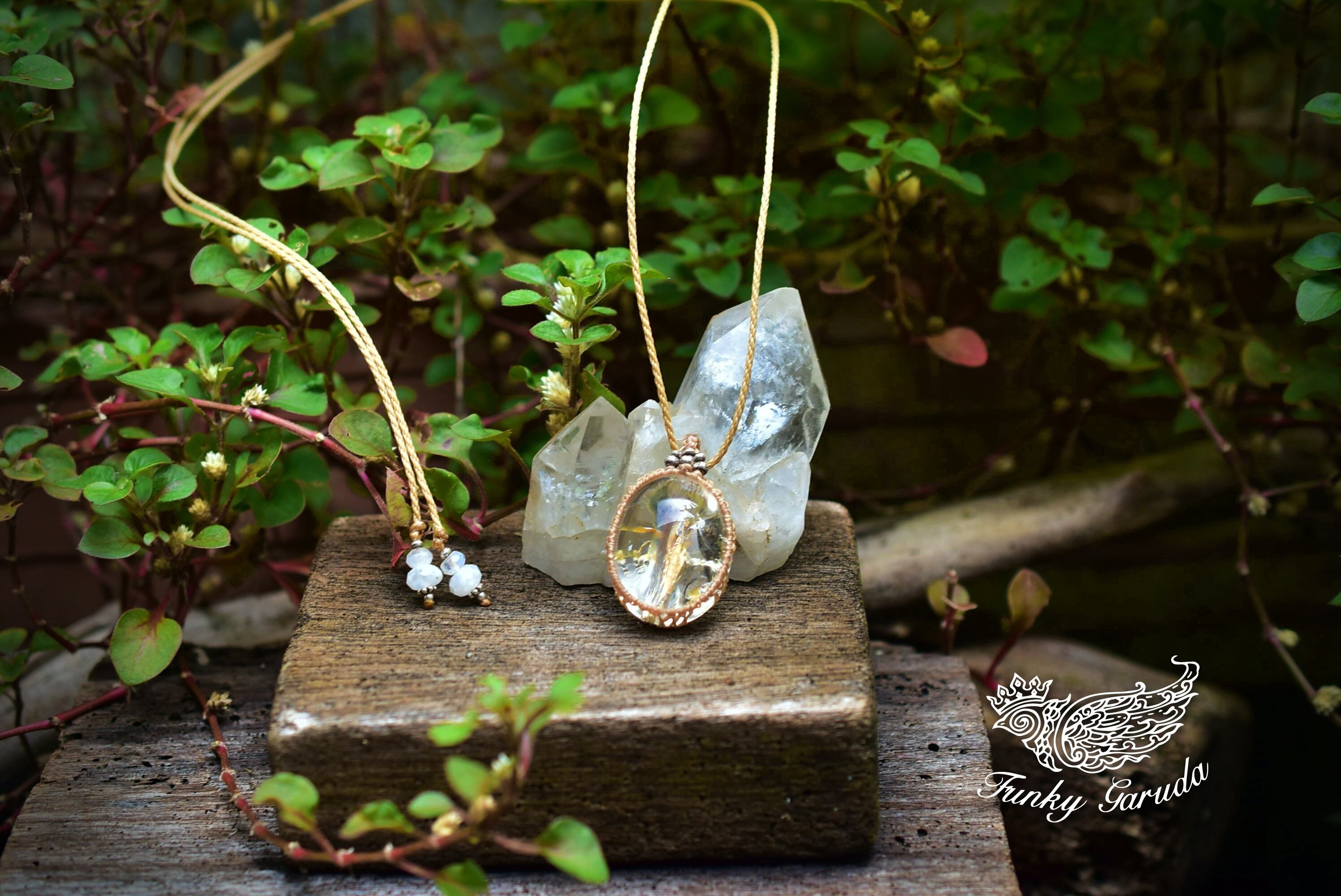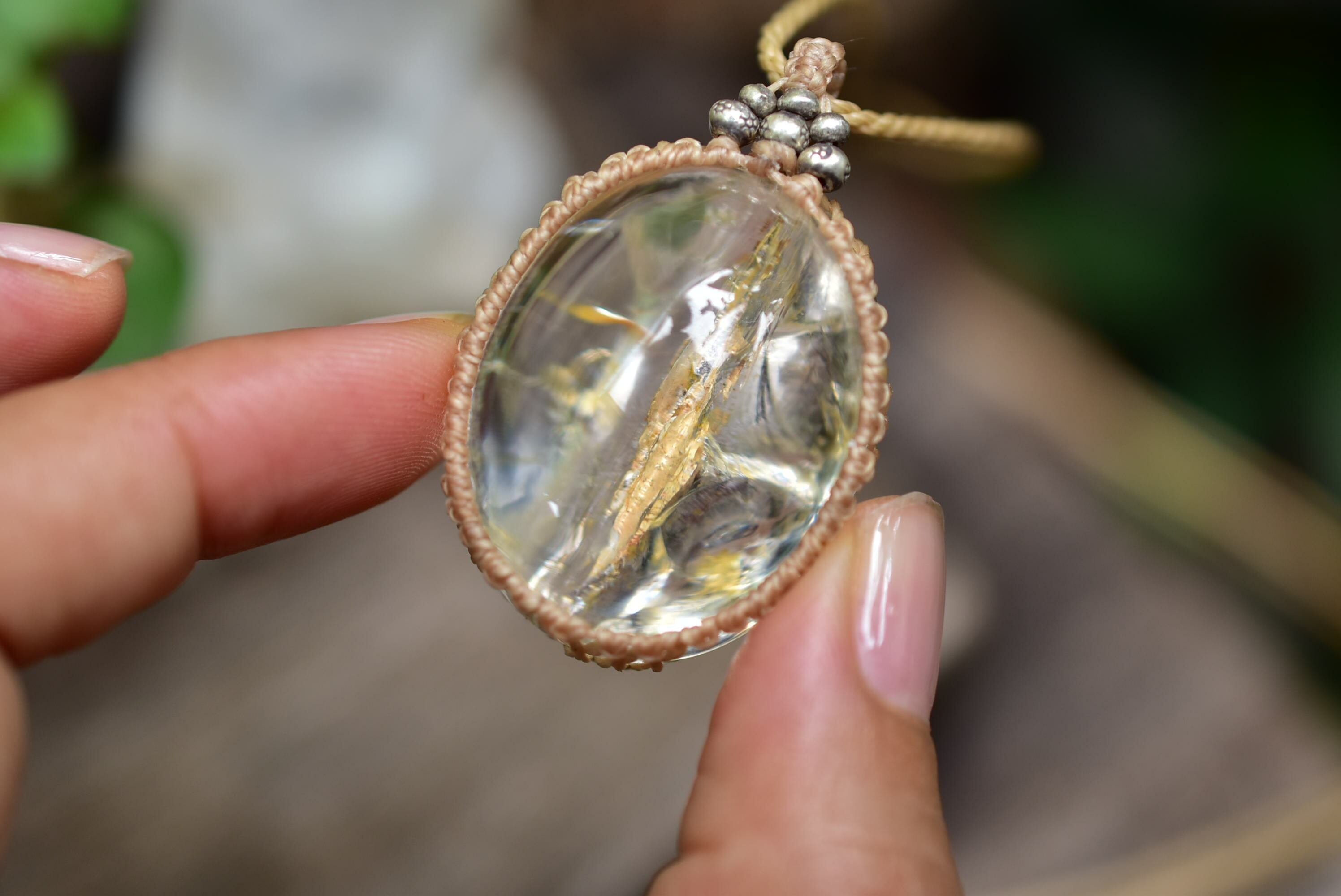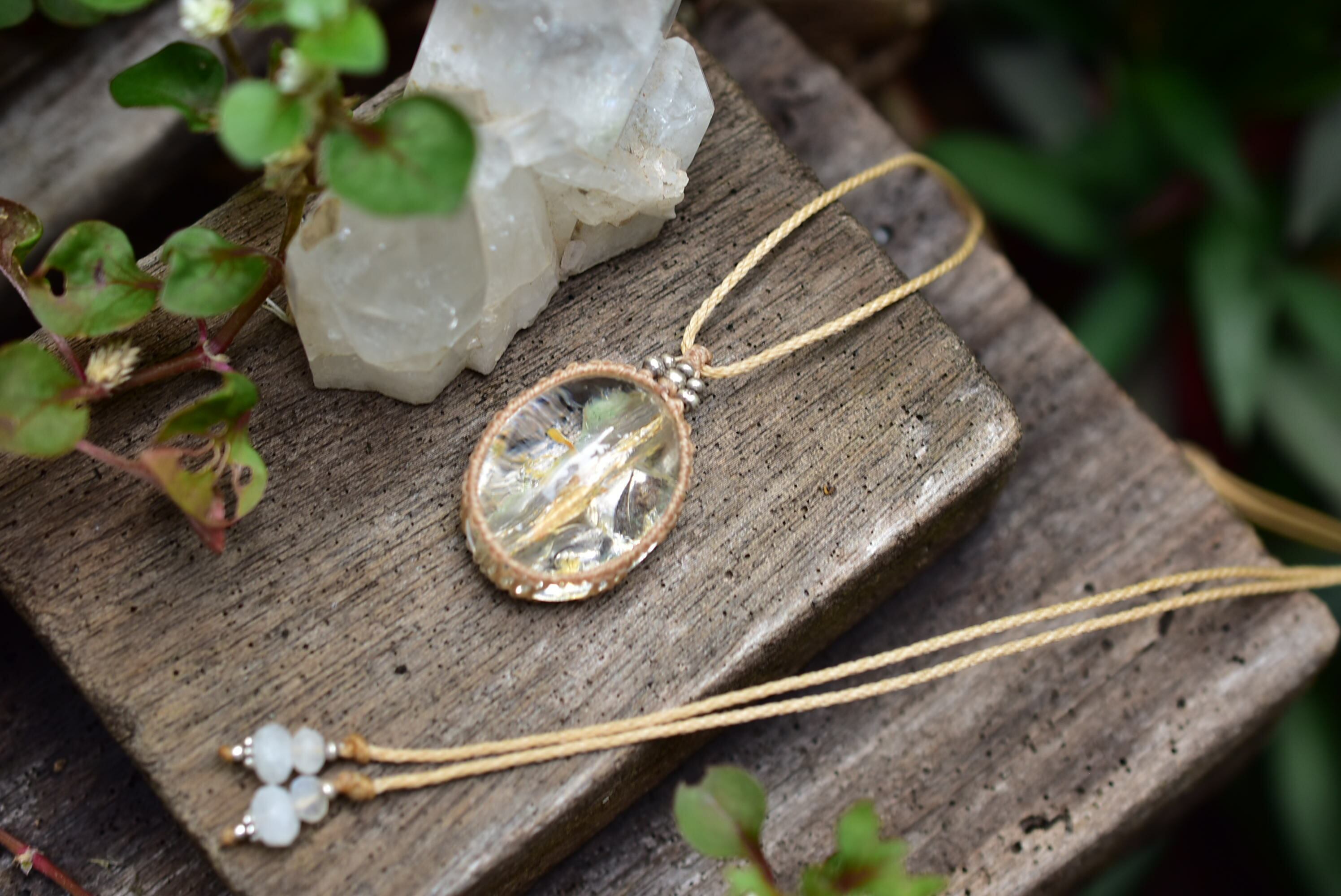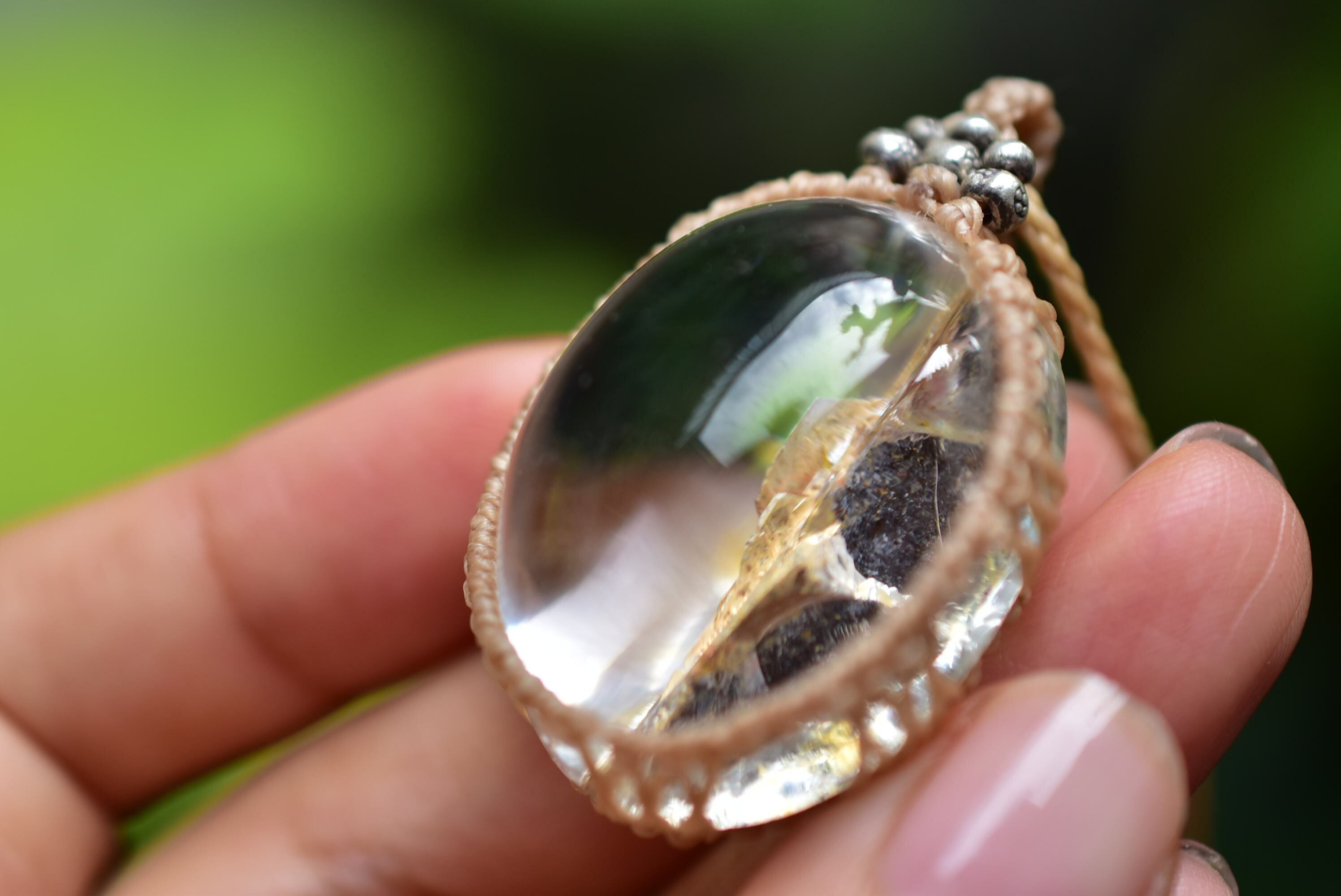 透明感もよく、ぷっくりとしたルースを水晶の中が見えるようにマクラメ編み装飾を施してペンダントに仕上げました。