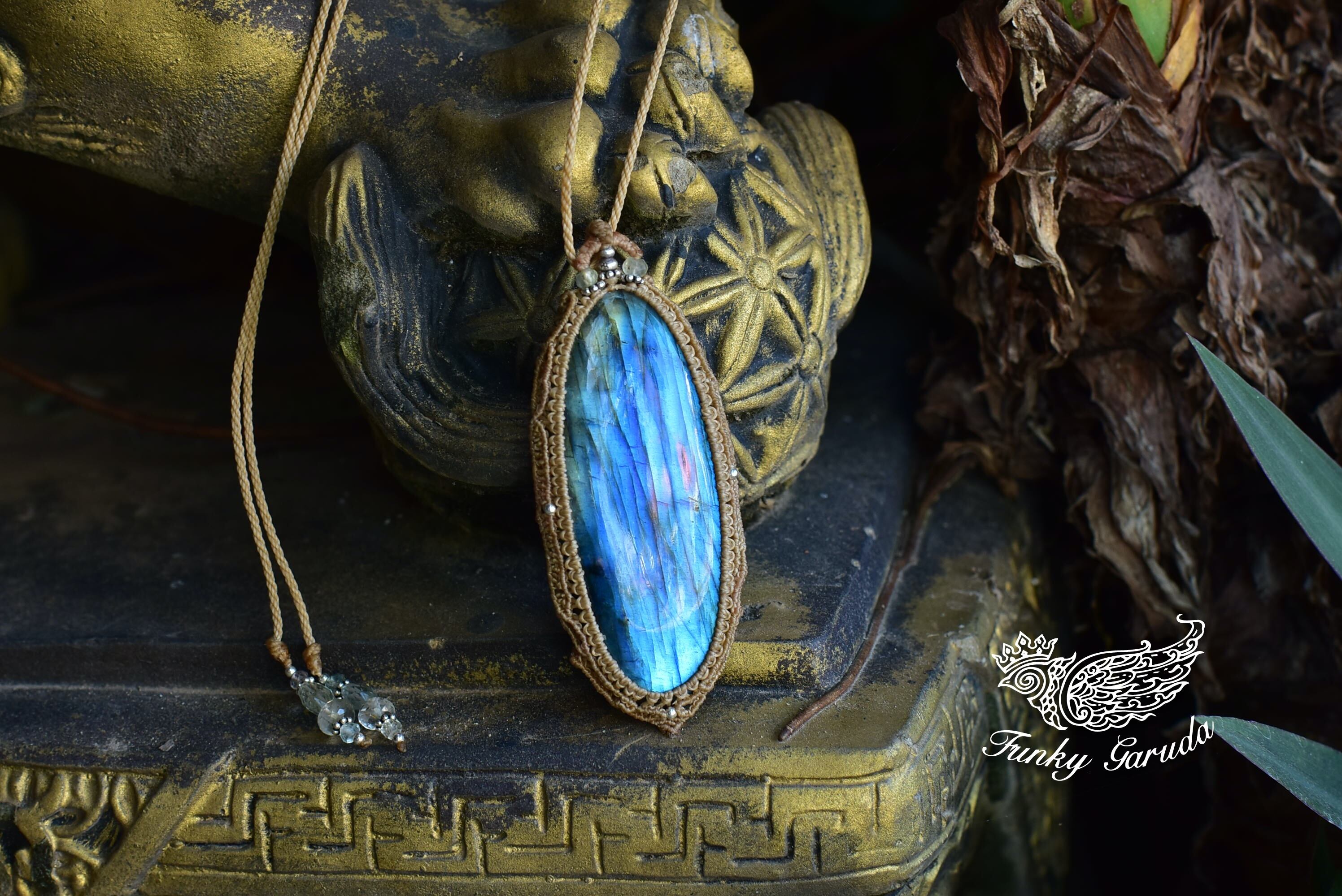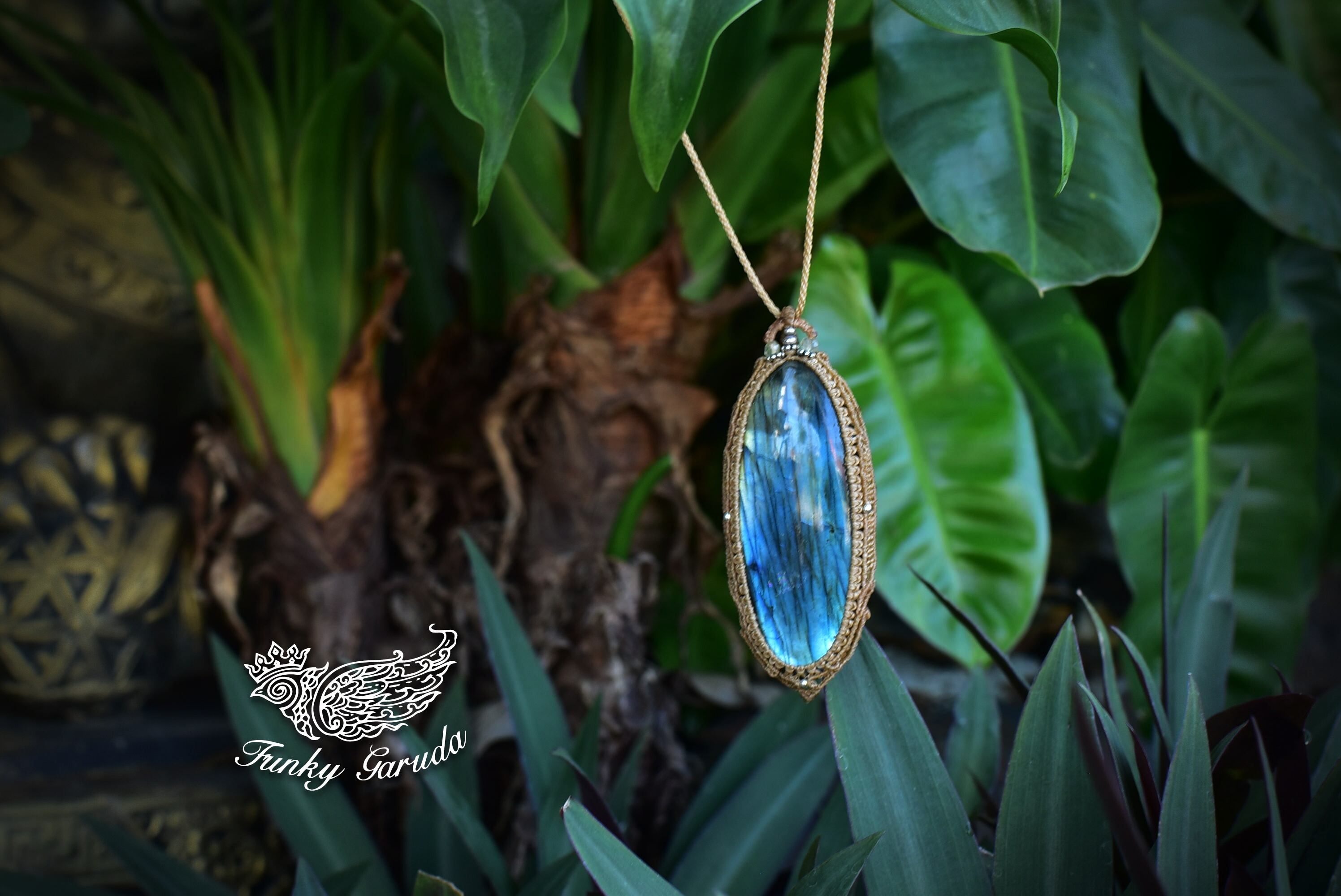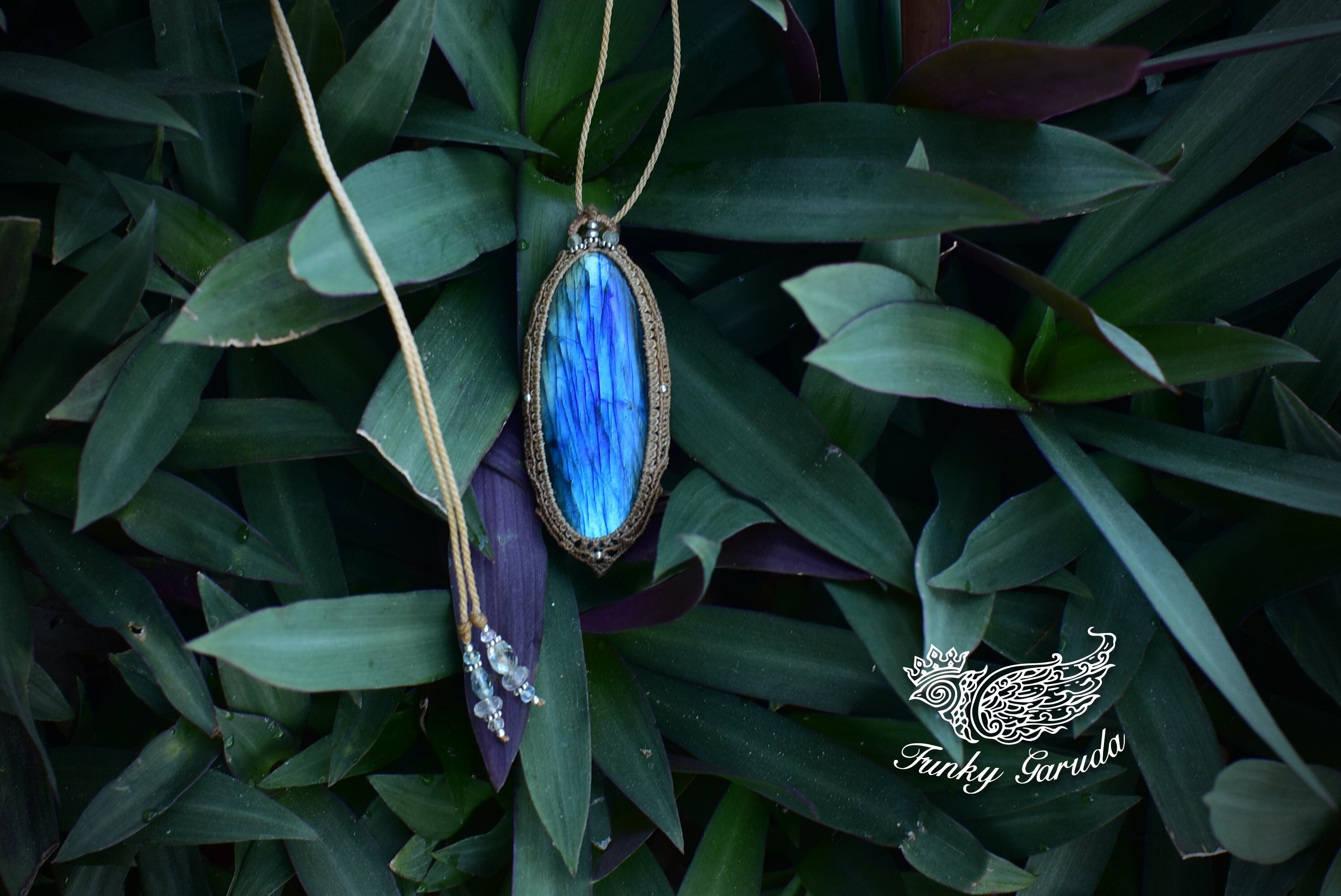 どこをとってもパーフェクトなシラーを魅せてくれる大きなサイズの高品質ラブラドライトを市場にて発見。早速マクラメ編みペンダントに仕上げました。