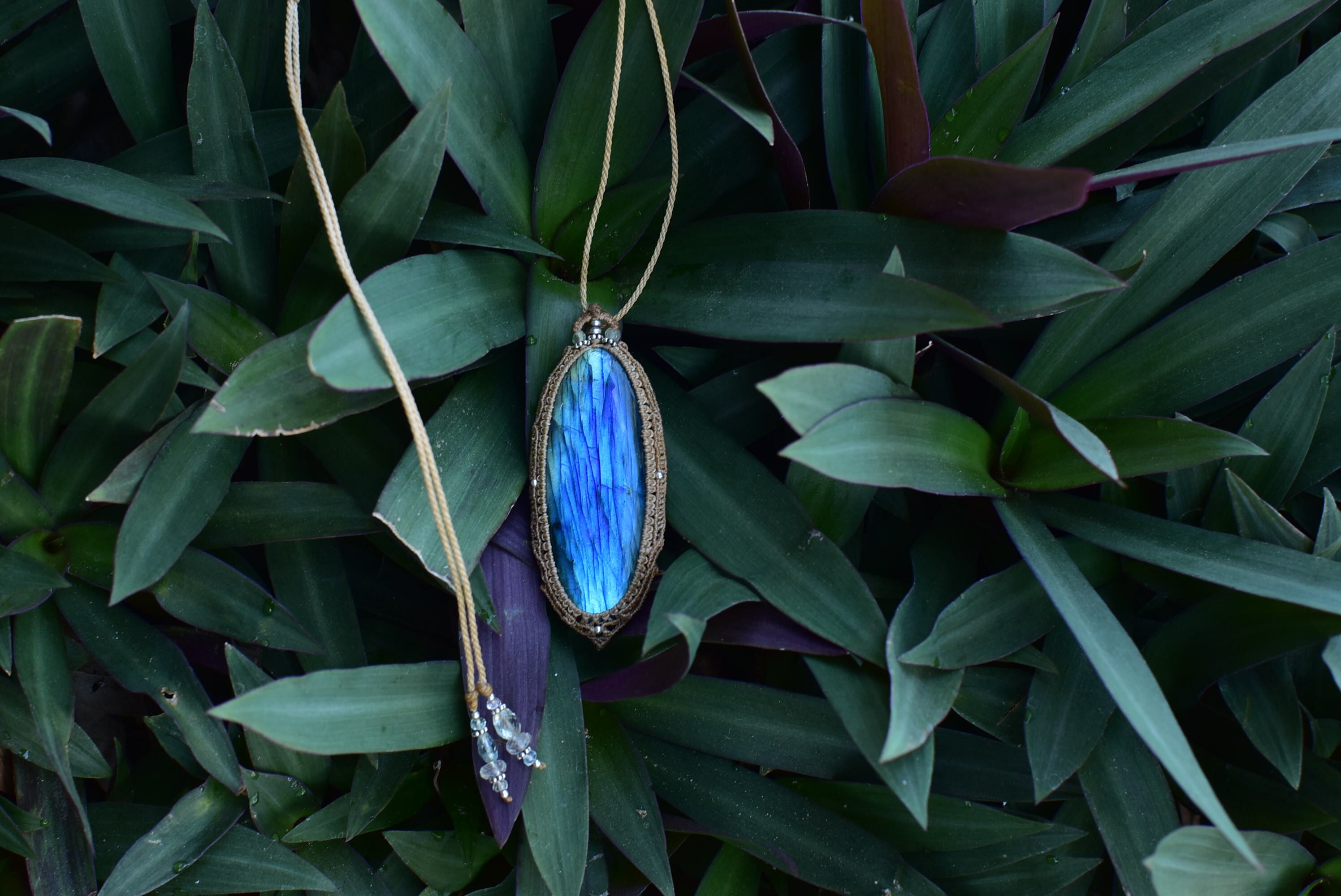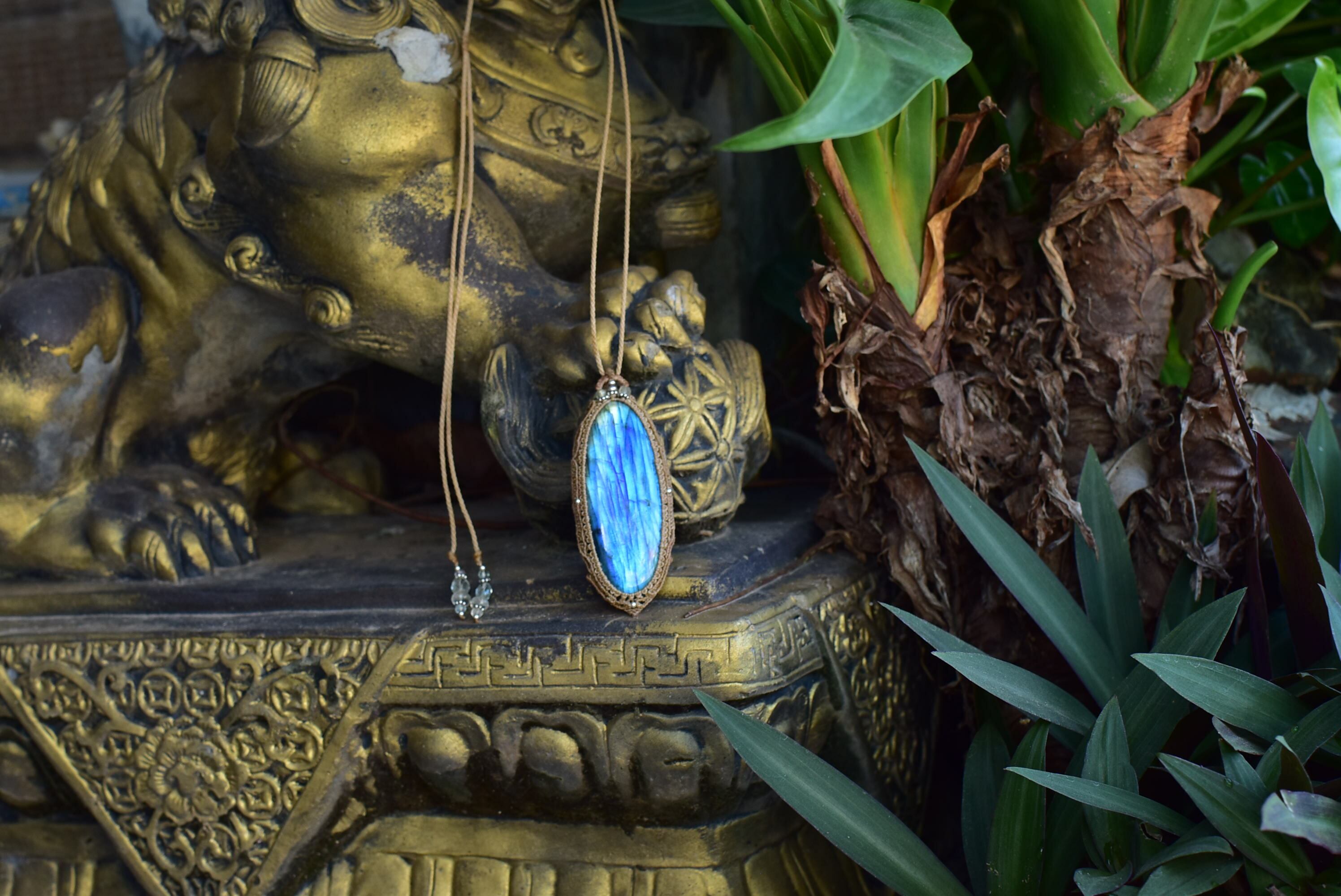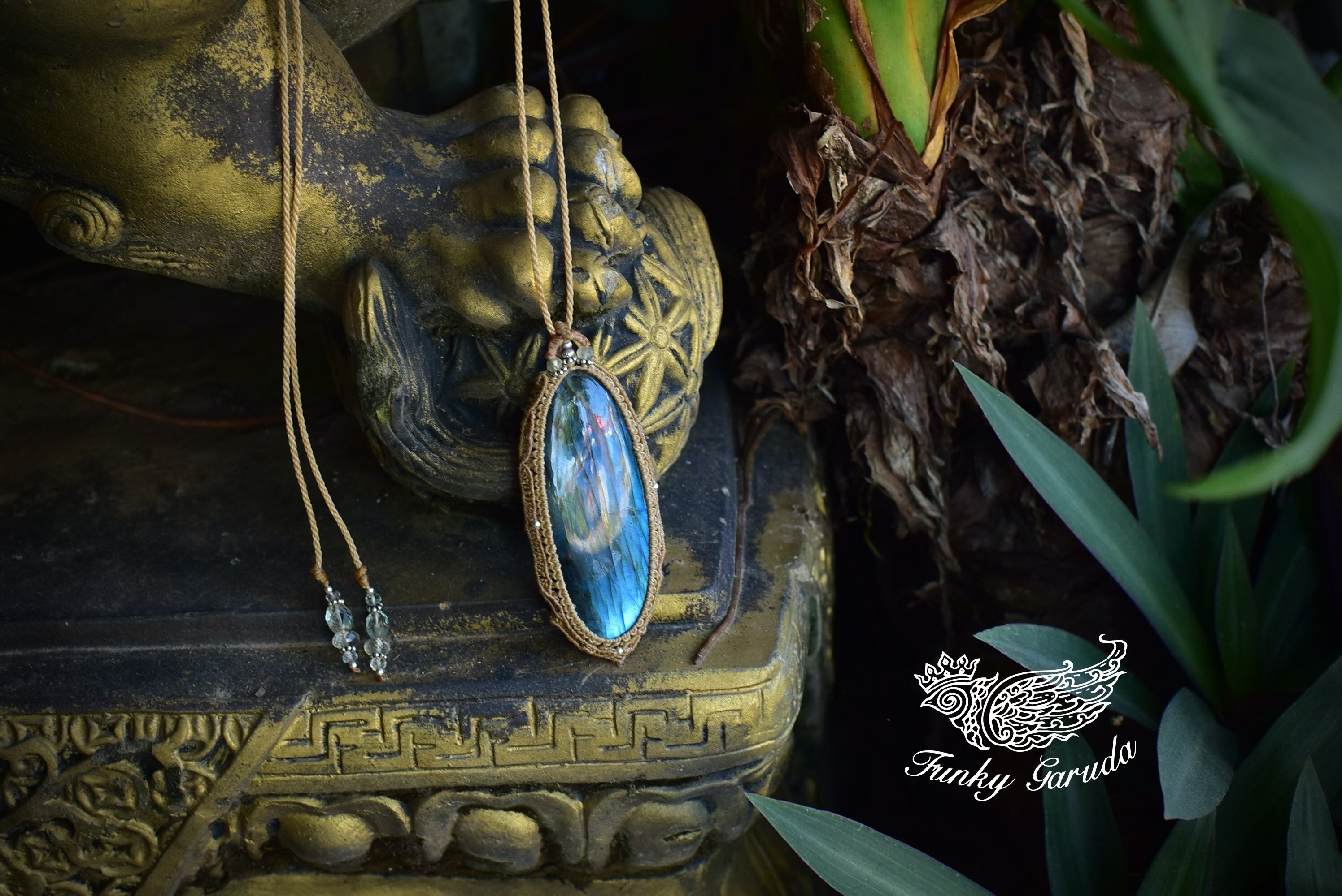 どこをとってもパーフェクトなシラーを魅せてくれる大きなサイズの高品質ラブラドライトを市場にて発見。早速マクラメ編みペンダントに仕上げました。