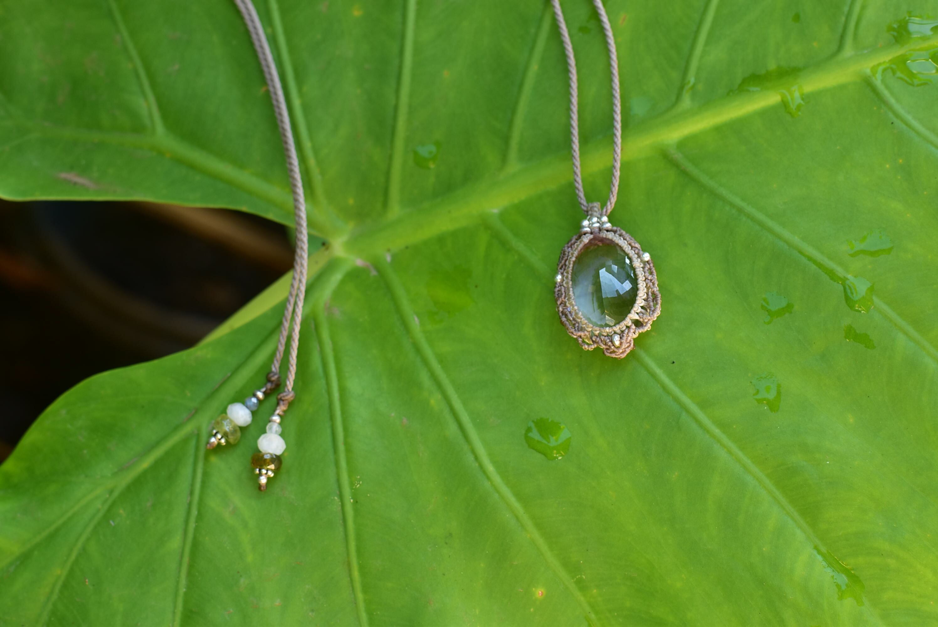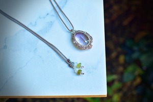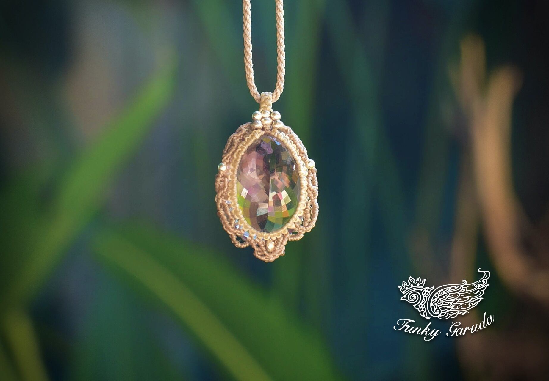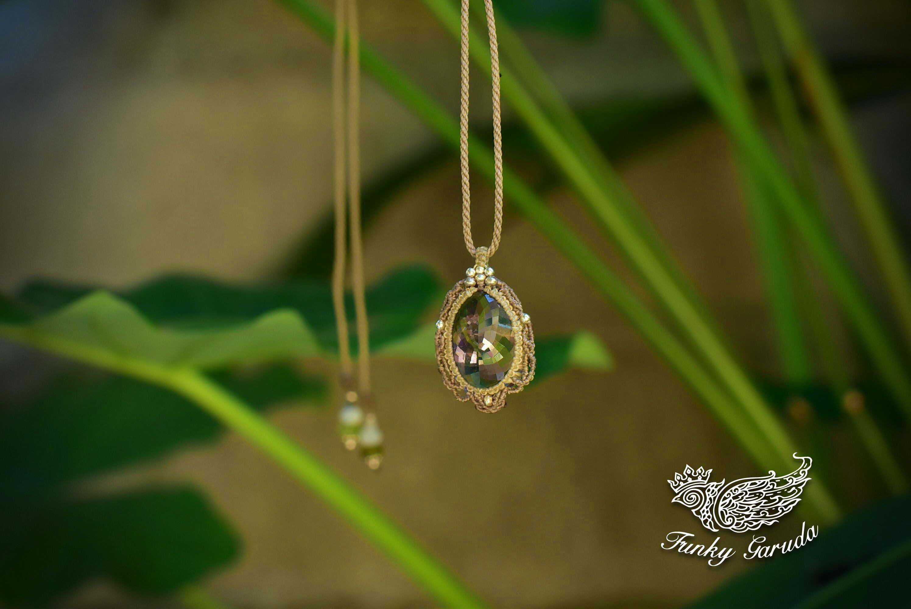 アメトリンを美しく魅せるために細かくファセットカッティングが施されたものを0.25mmの細い糸を使用して印象的でパワフルなイメージを連想してしまうようなペンダントにマクラメ編み装飾を施しました。ほんのりとシトリン部分のイエローカラーが交わるもの。