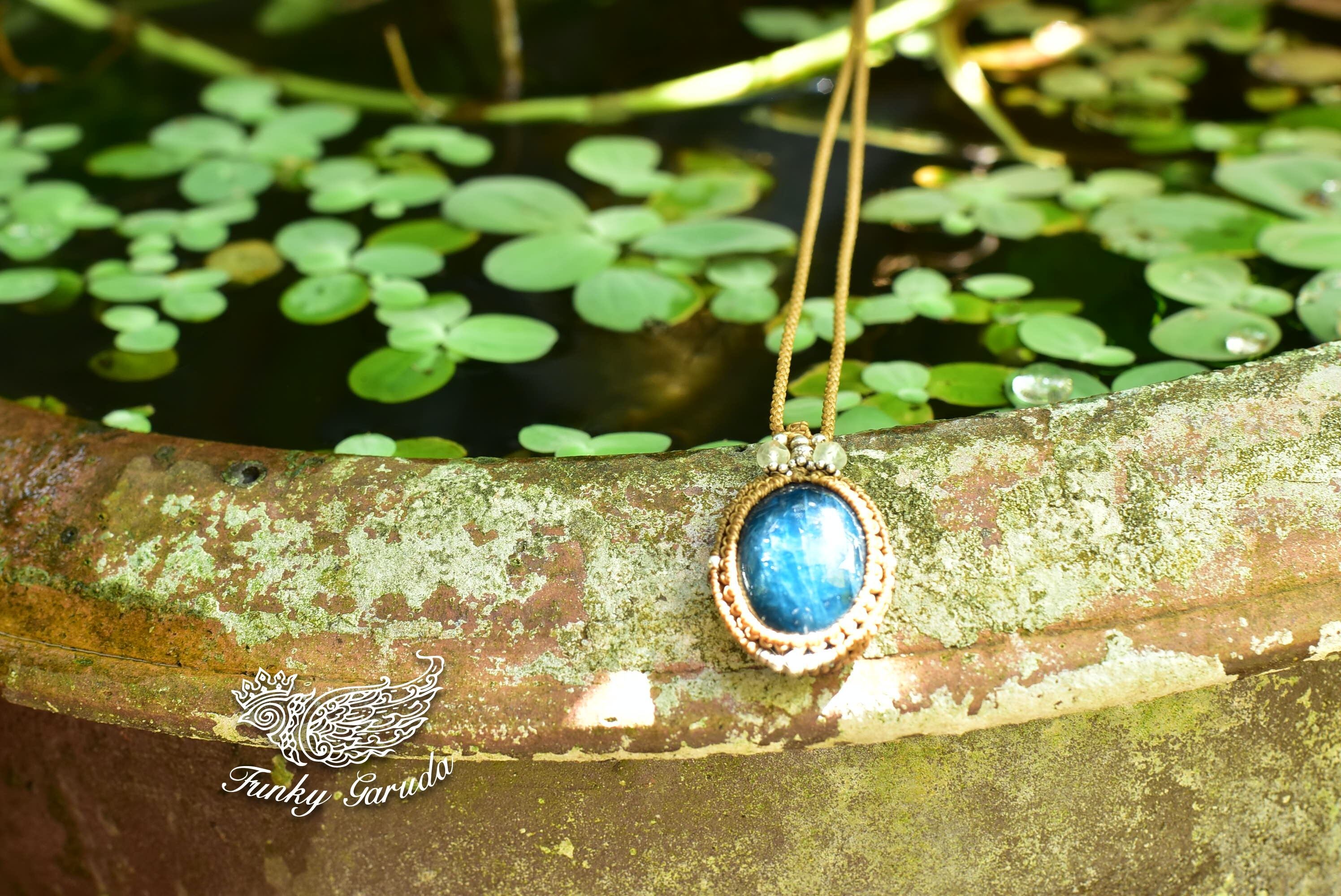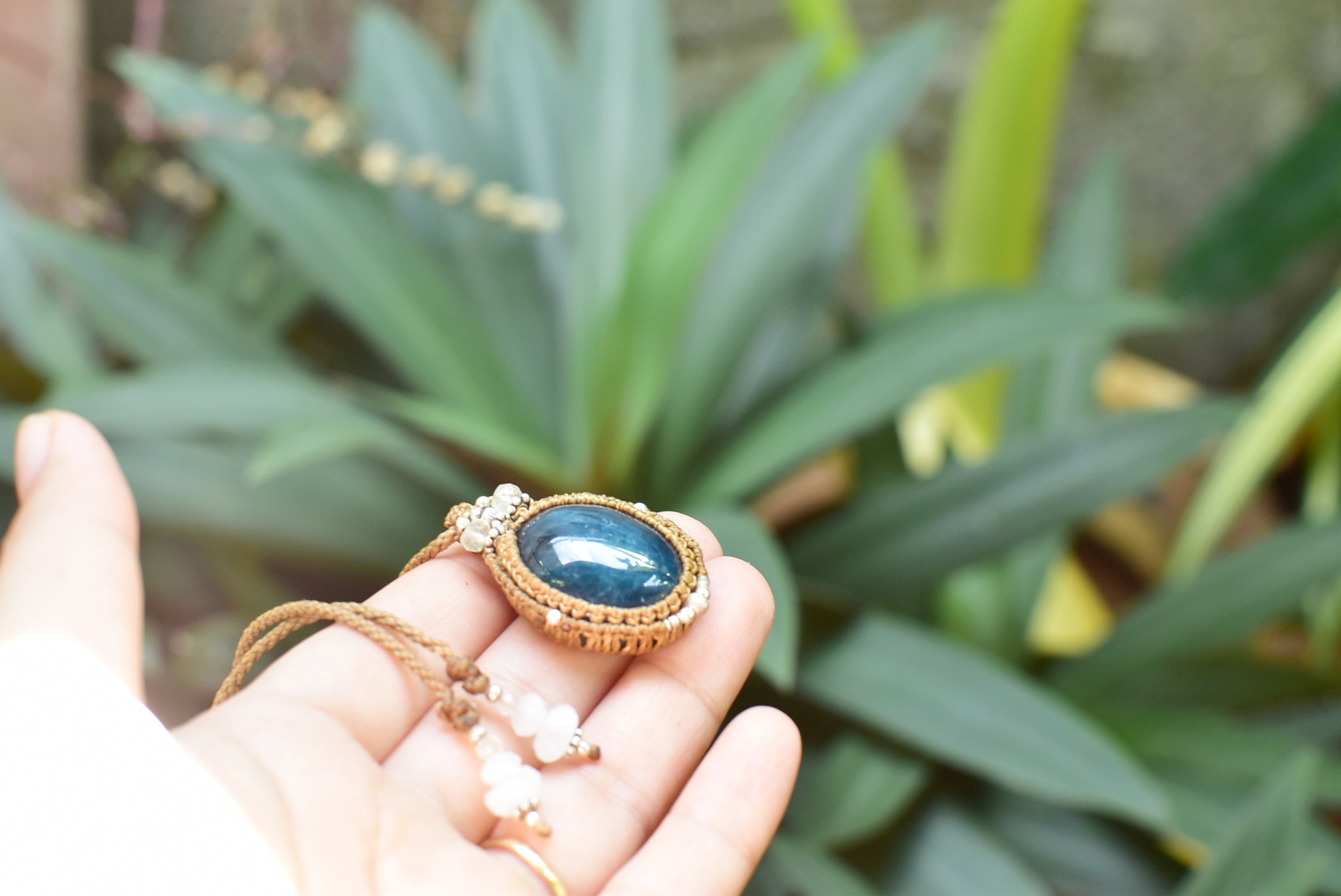 しっかりと見てとることのできるキャッツアイがこのブルーアパタイトの品質の証。キラキラと光るシラーと光に透かすとほんのりと浮かび上がる透明感が魅力的なルースをマクラメ編み装飾を施してシンプルにペンダントに仕上げました。