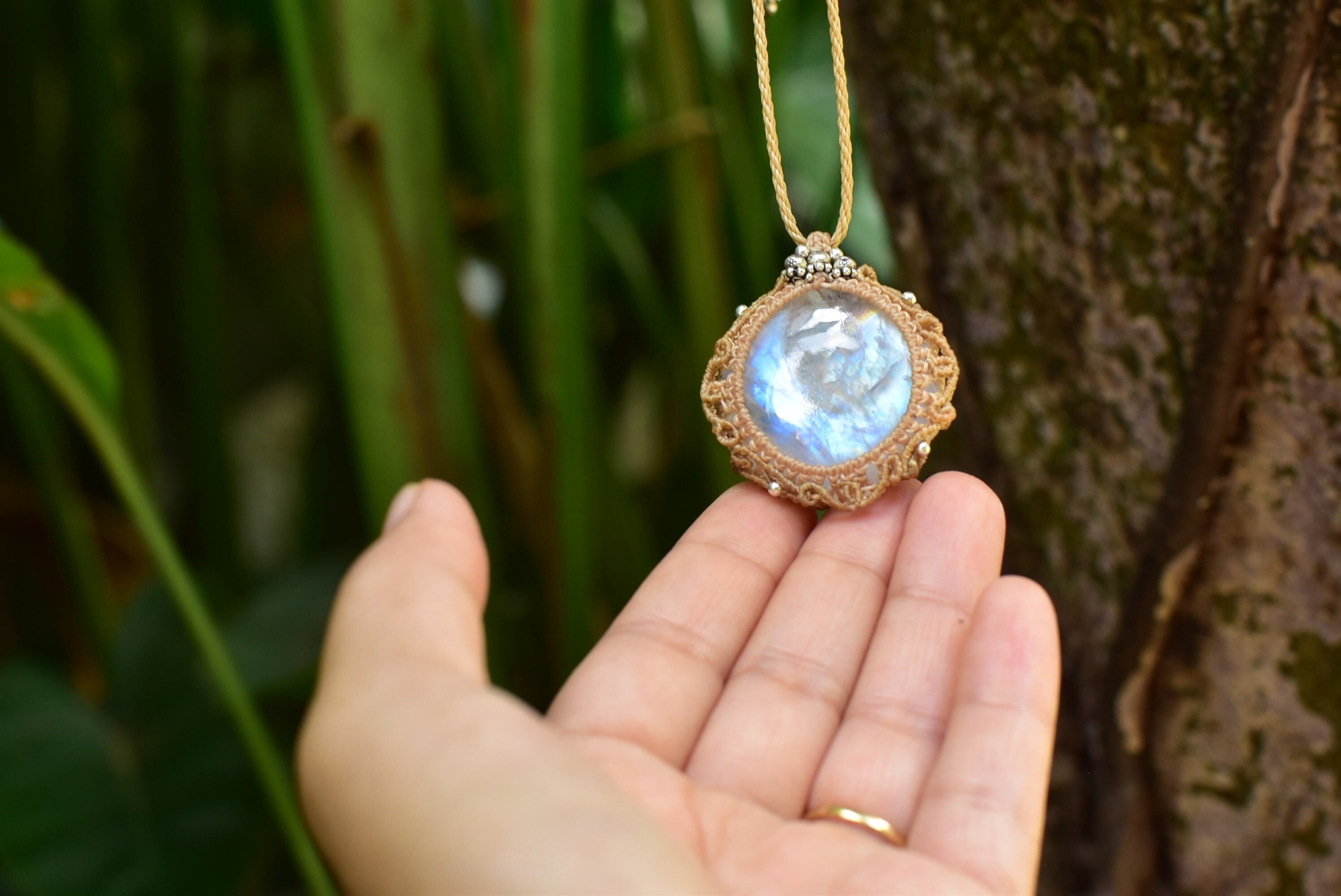 この石に合わせて曼荼羅を描くように丁寧にマクラメ編み装飾を施しました。
