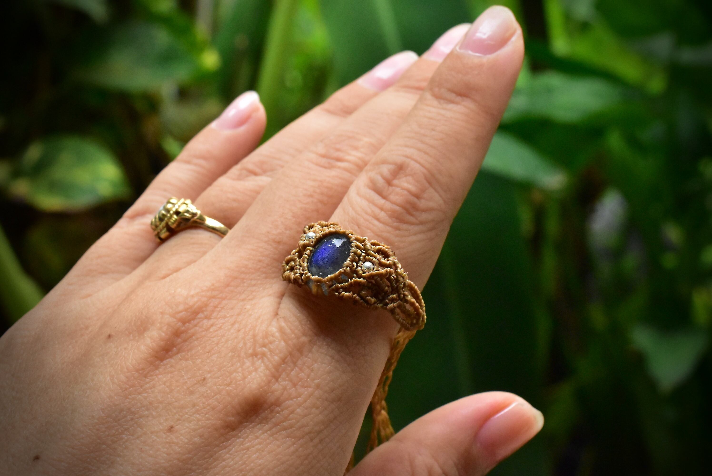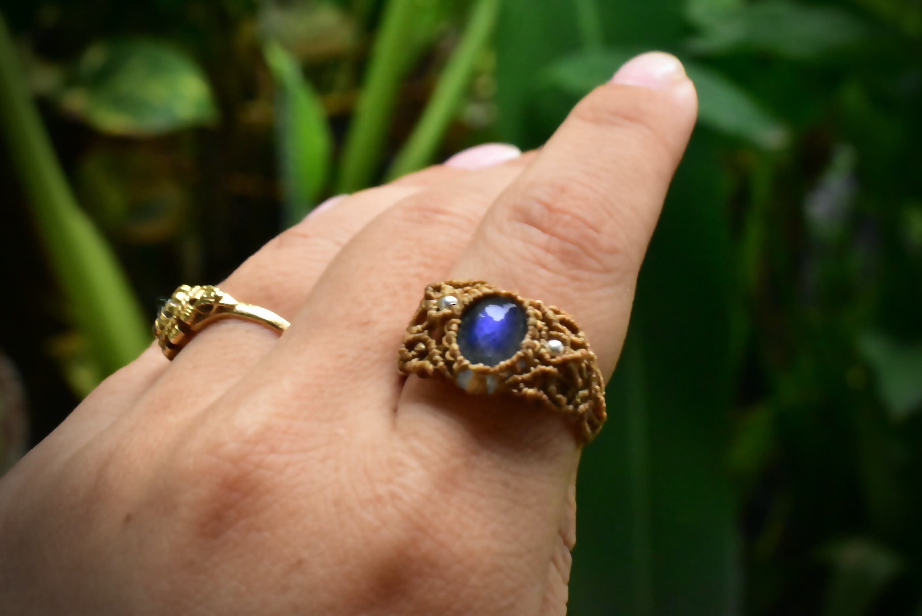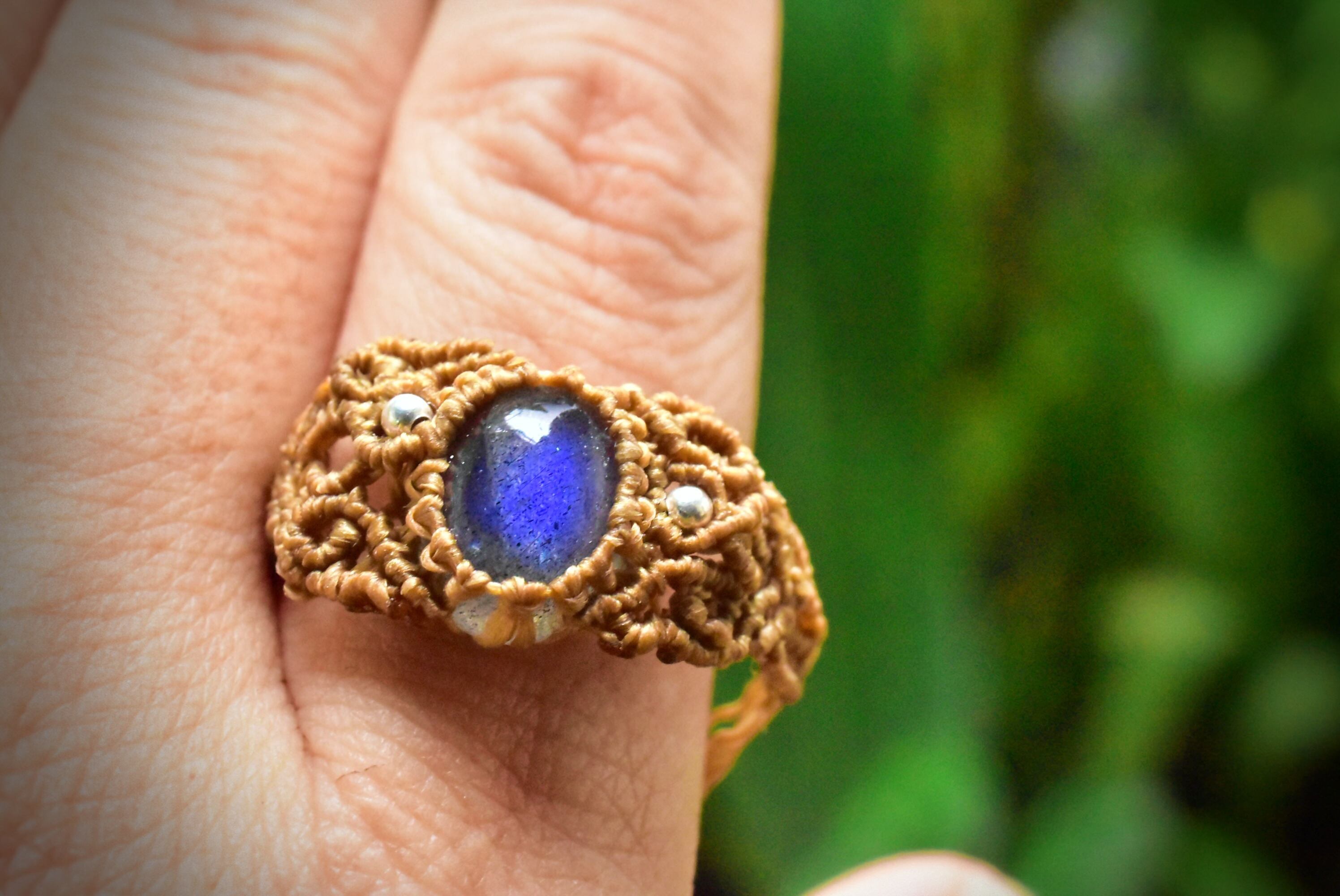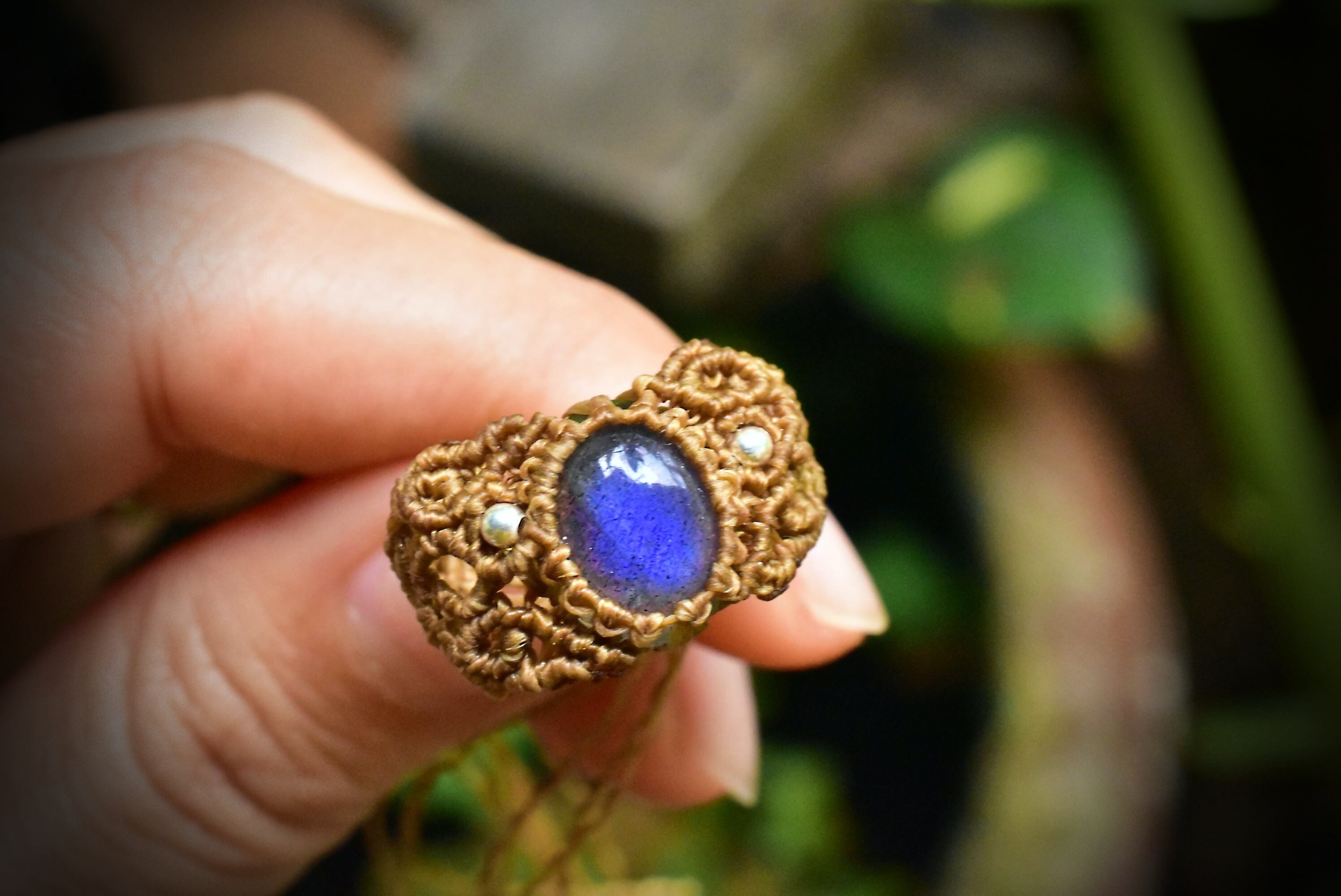 鮮やかな高品質ブルーラブラドライトを使用して編み込んだマクラメリングを制作しました。