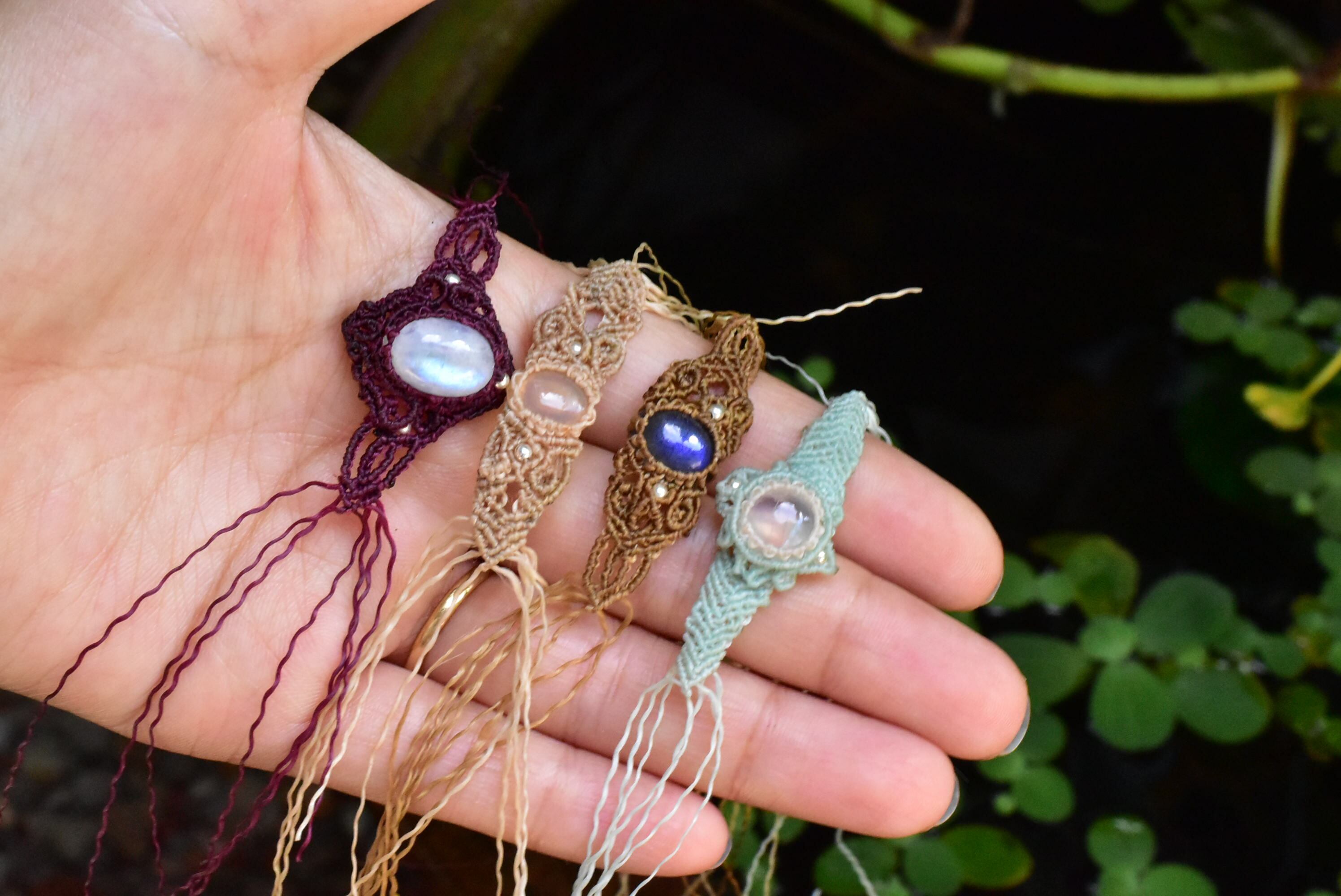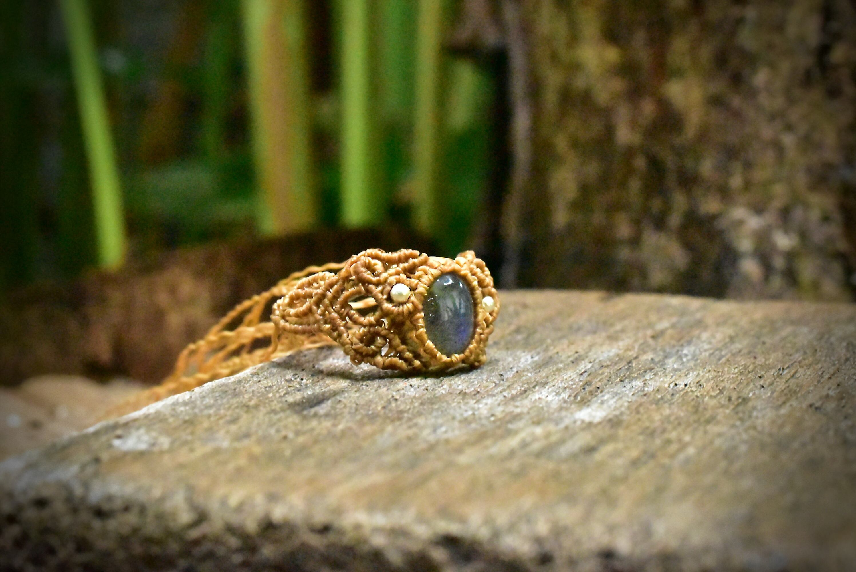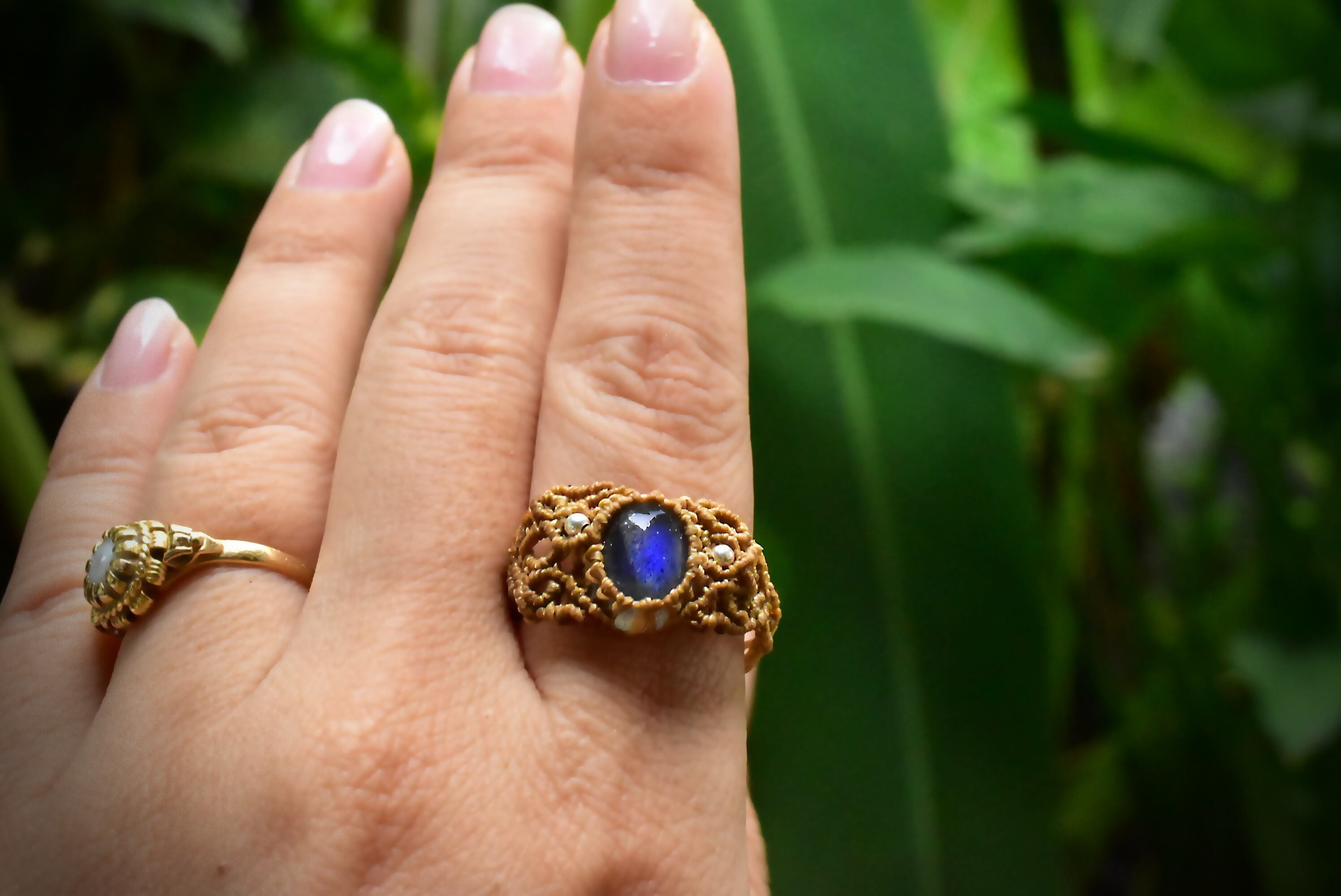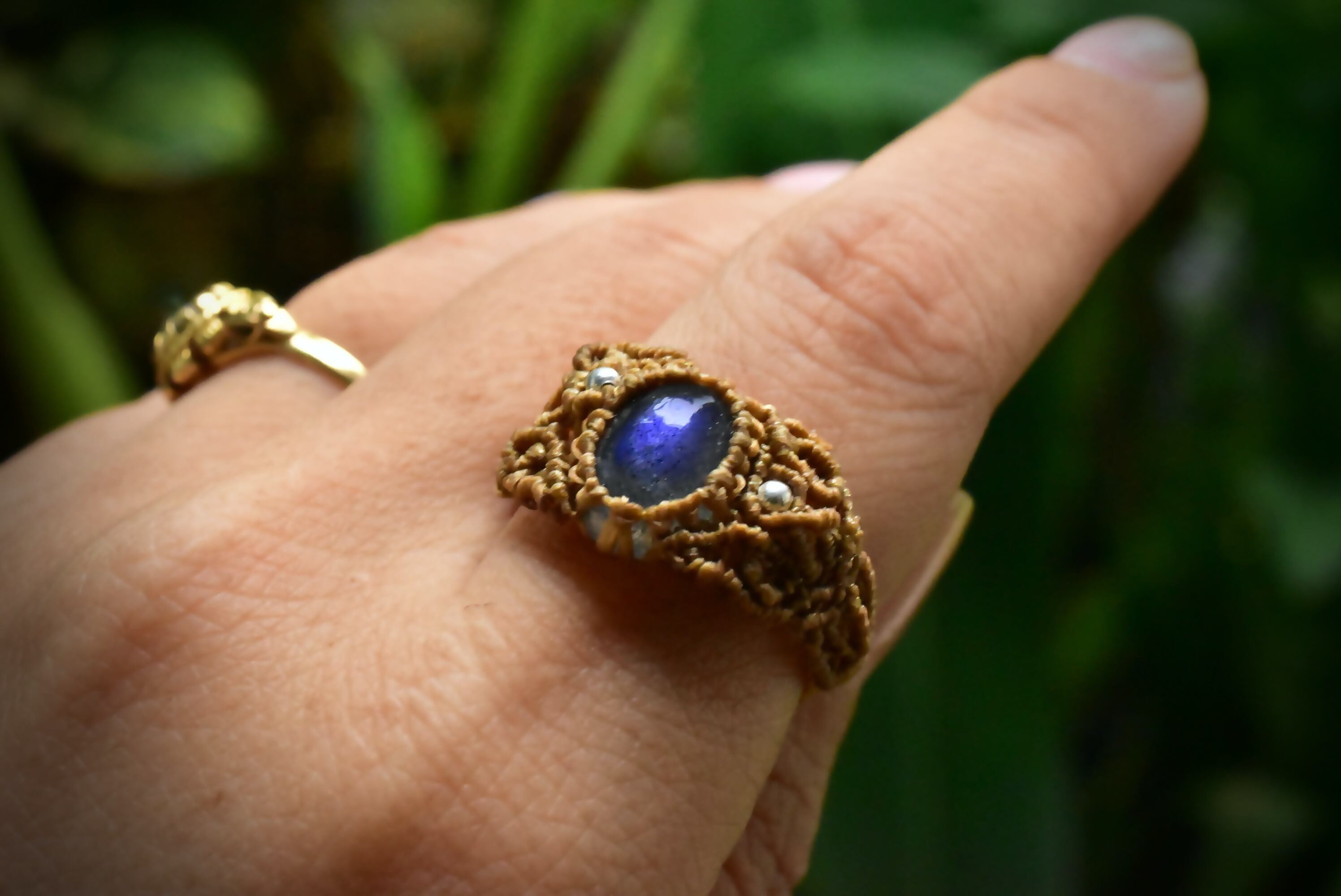 鮮やかな高品質ブルーラブラドライトを使用して編み込んだマクラメリングを制作しました。