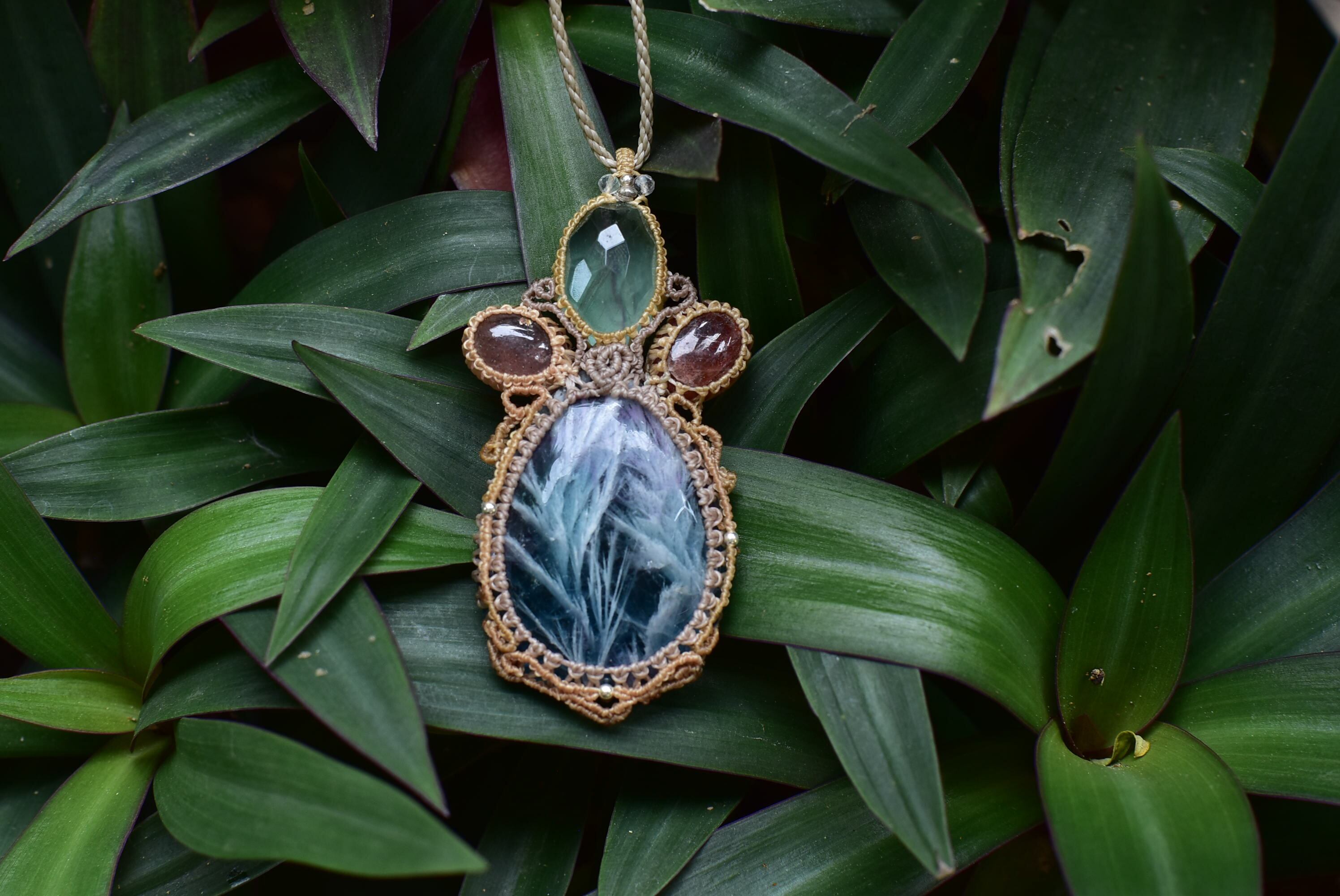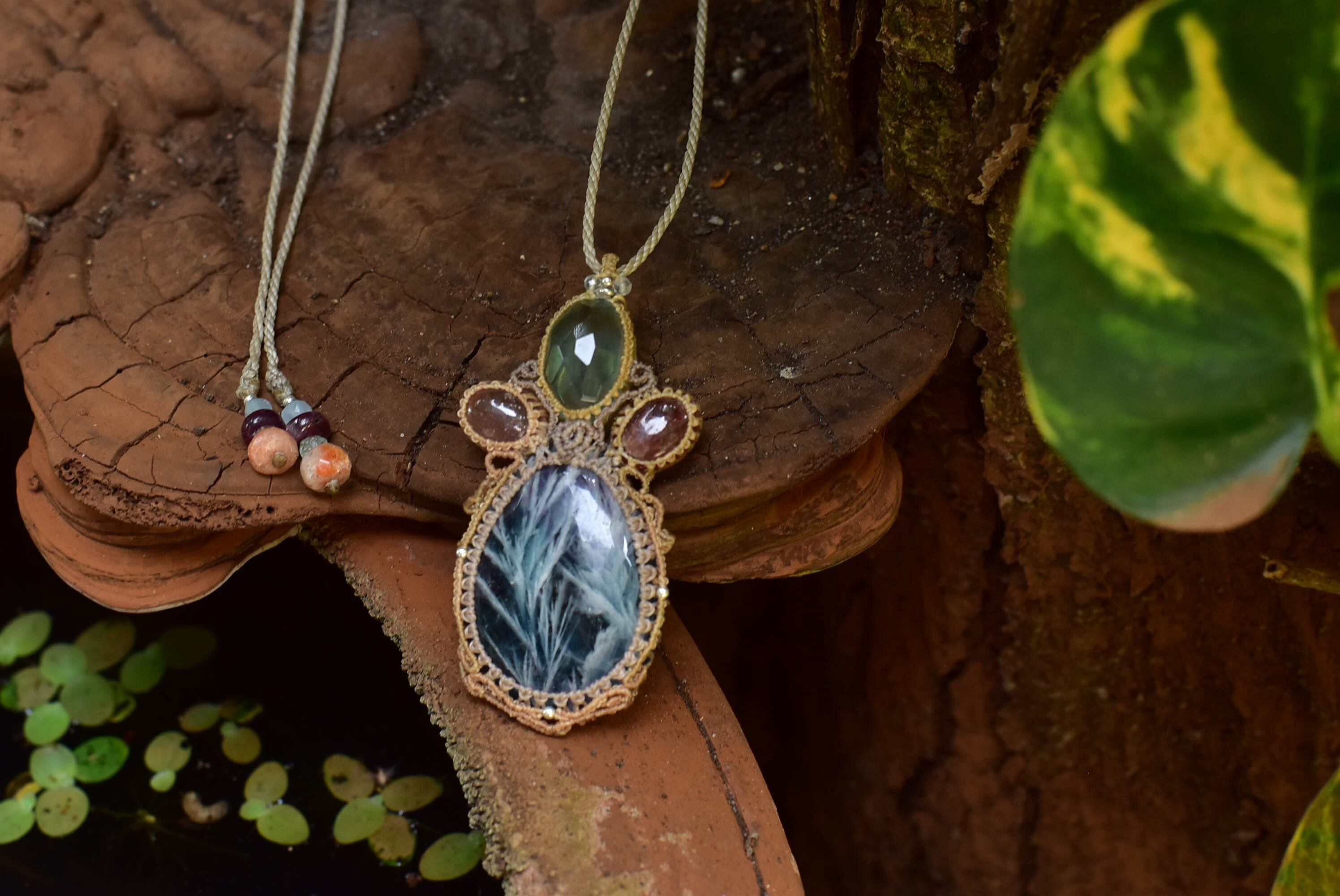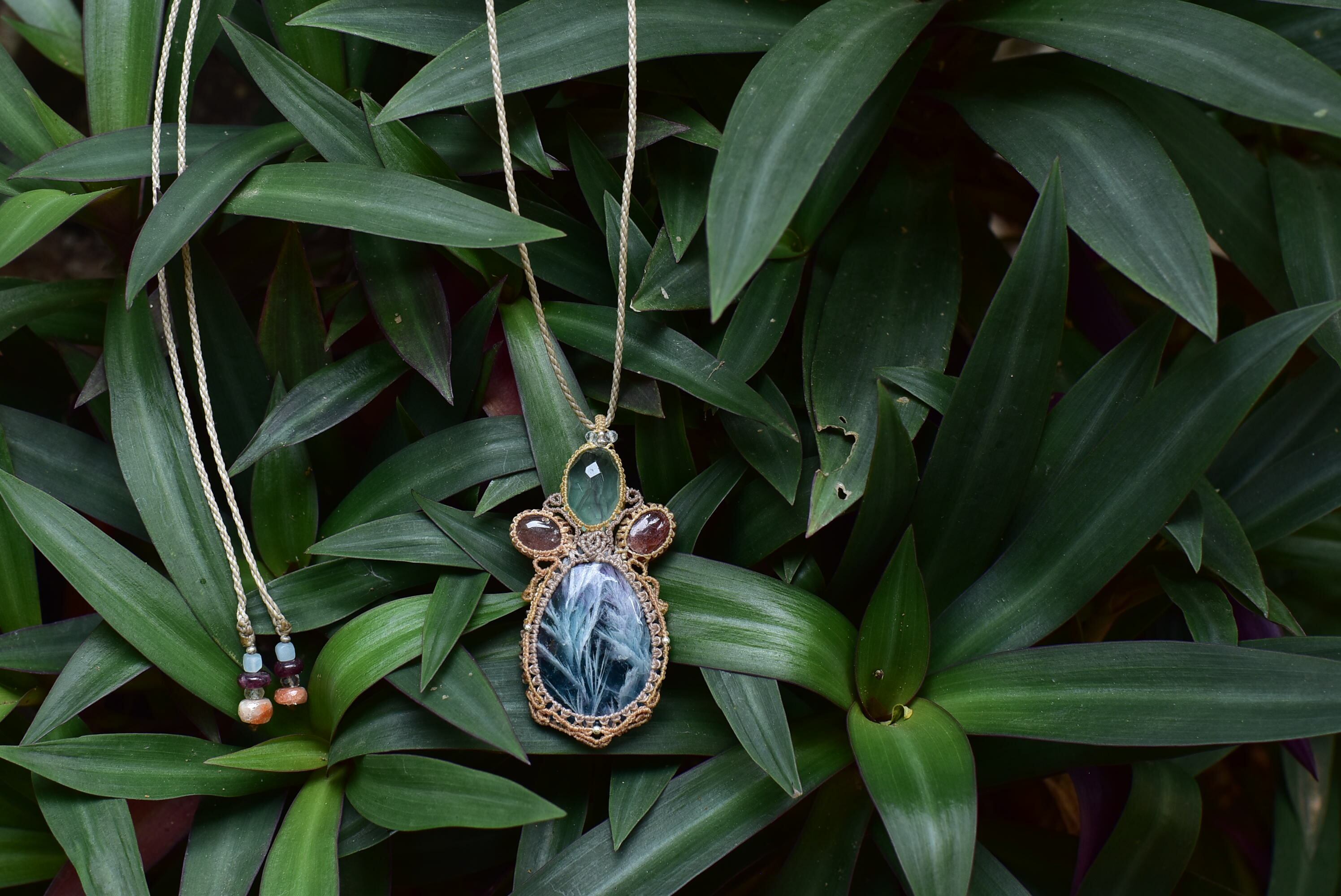 エンジェルフェザーフローライト ストロベリークォーツ サンストーン マクラメペンダントFlo007