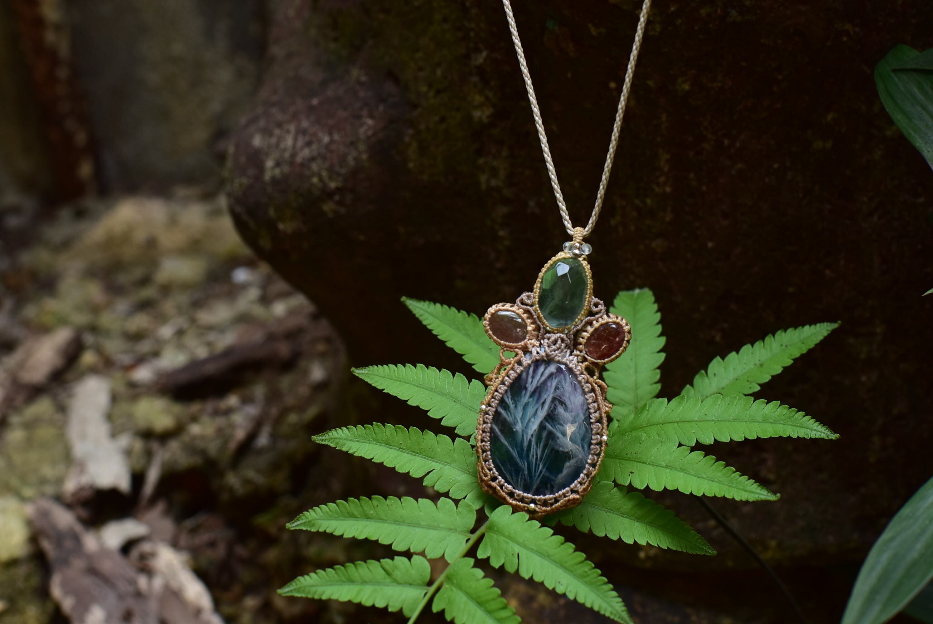 それらを支える天然石はこの色合いにあった石たちを使用しています。画像からも」みておtれますように自然と不思議に調和した”守り人”をイメージして仕上げました。