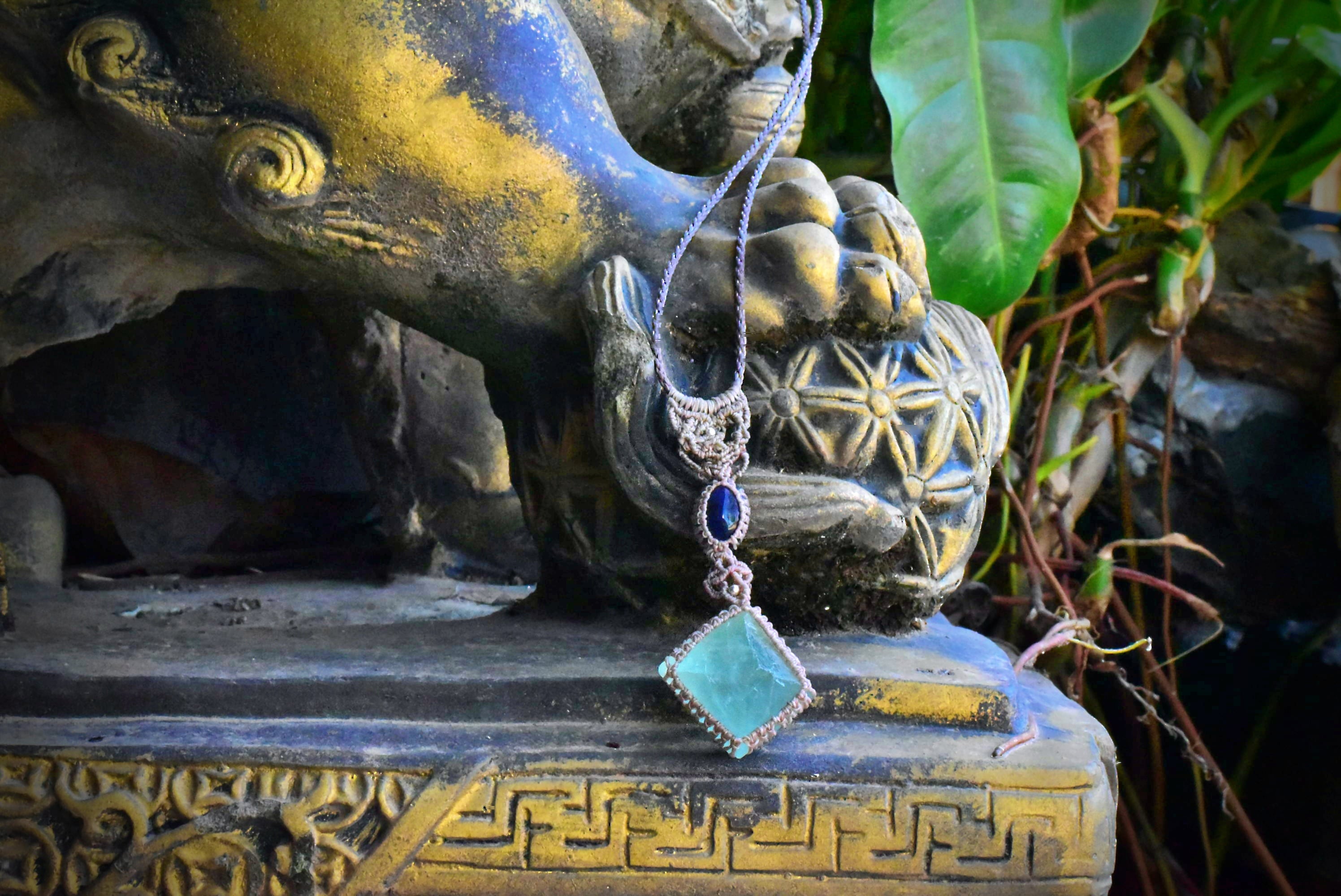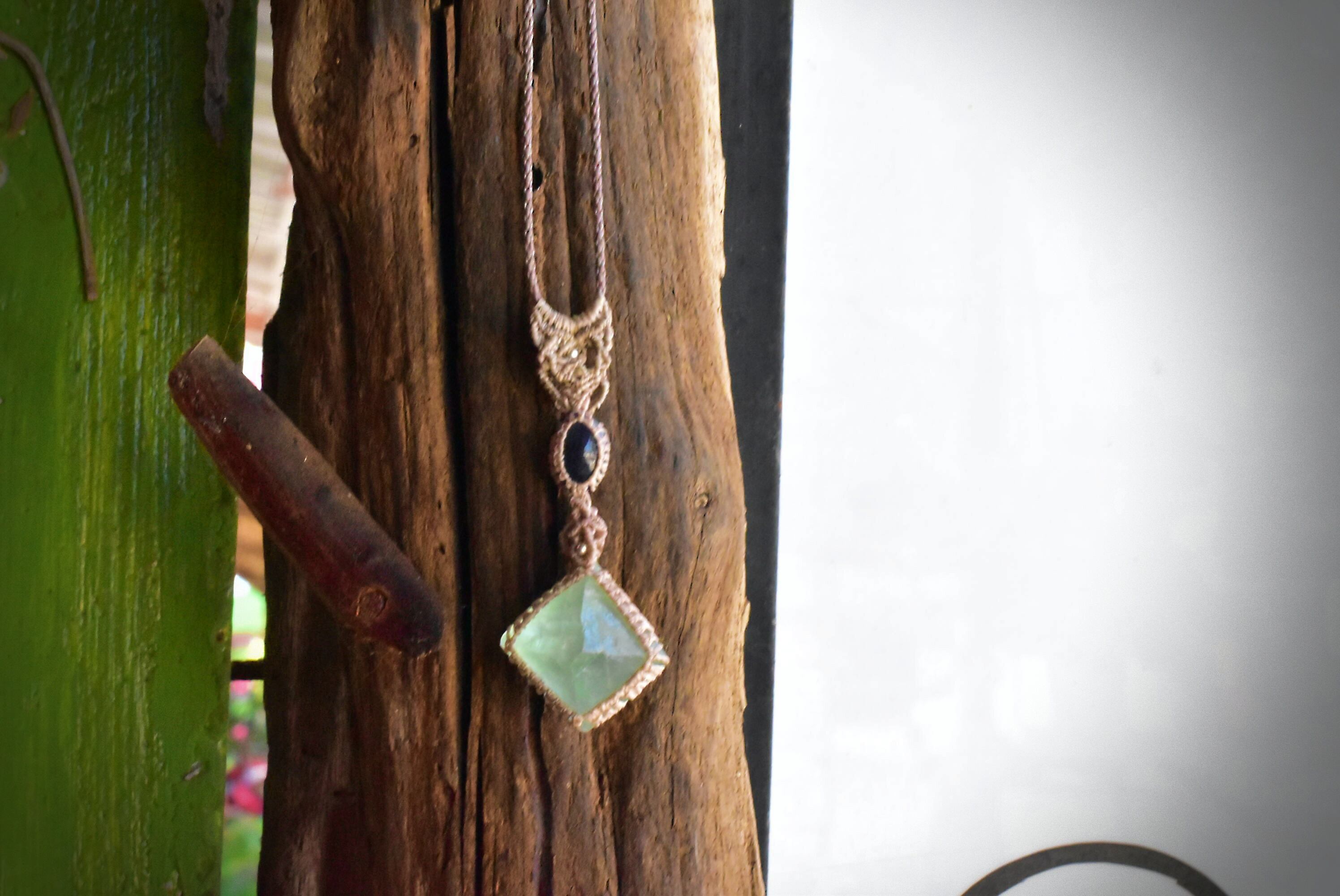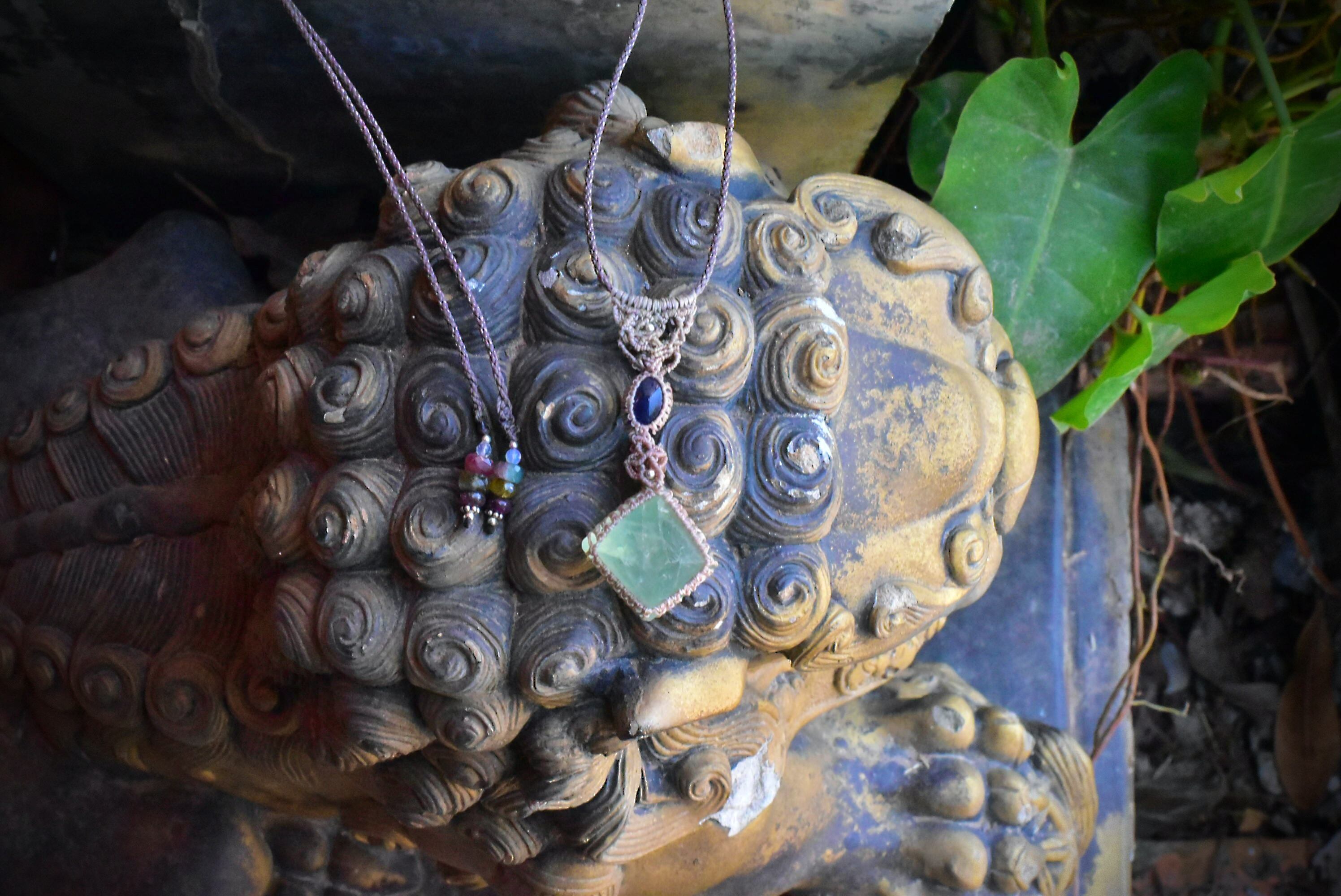 柔らかく薄い世界観を持つグリーンフローライト。エメラルドグリーンの中には自然にできたと思われる断層がうっすらと現れます。この石に光に透かすと現れる紺色が懐かしい色合いのアイオライトを組み合わせてネックレスに仕上げました。