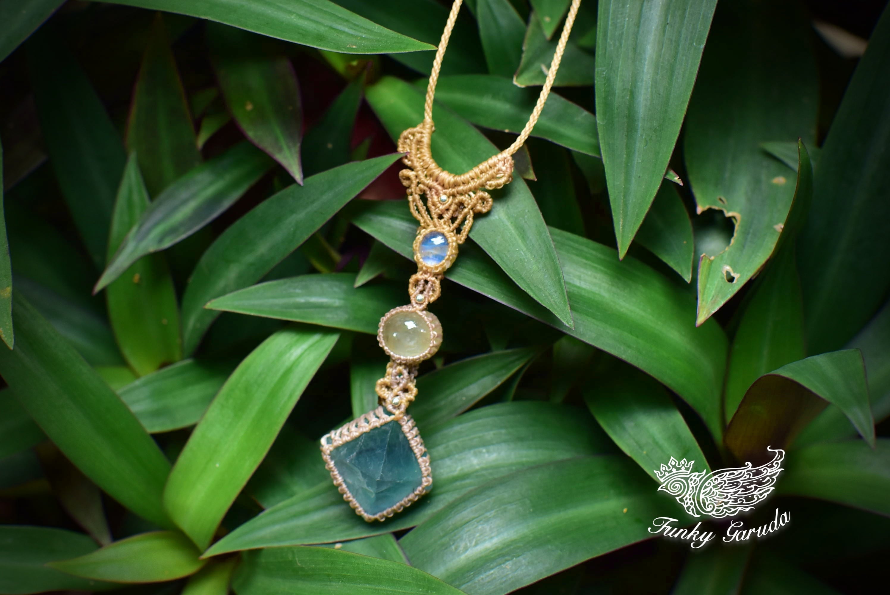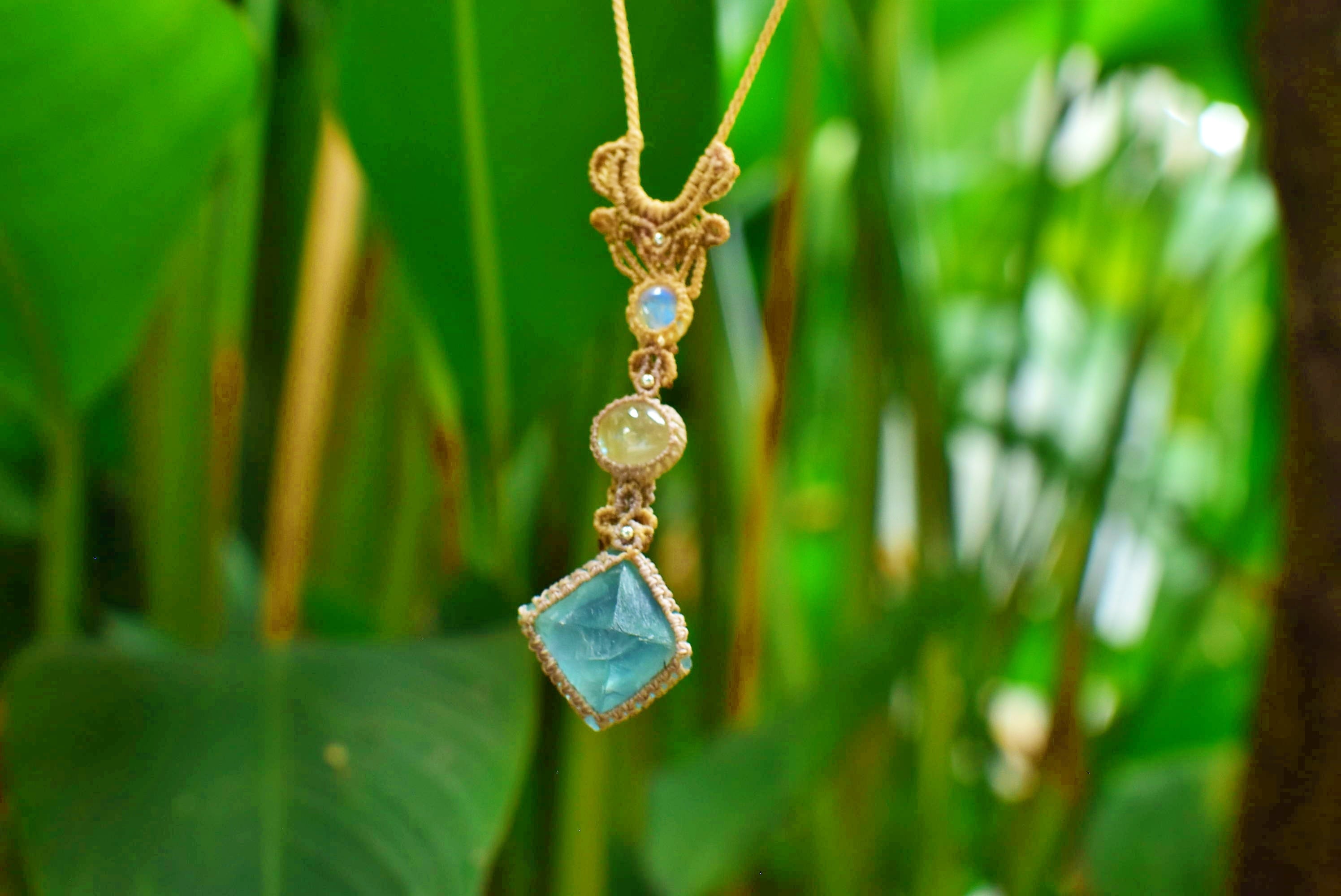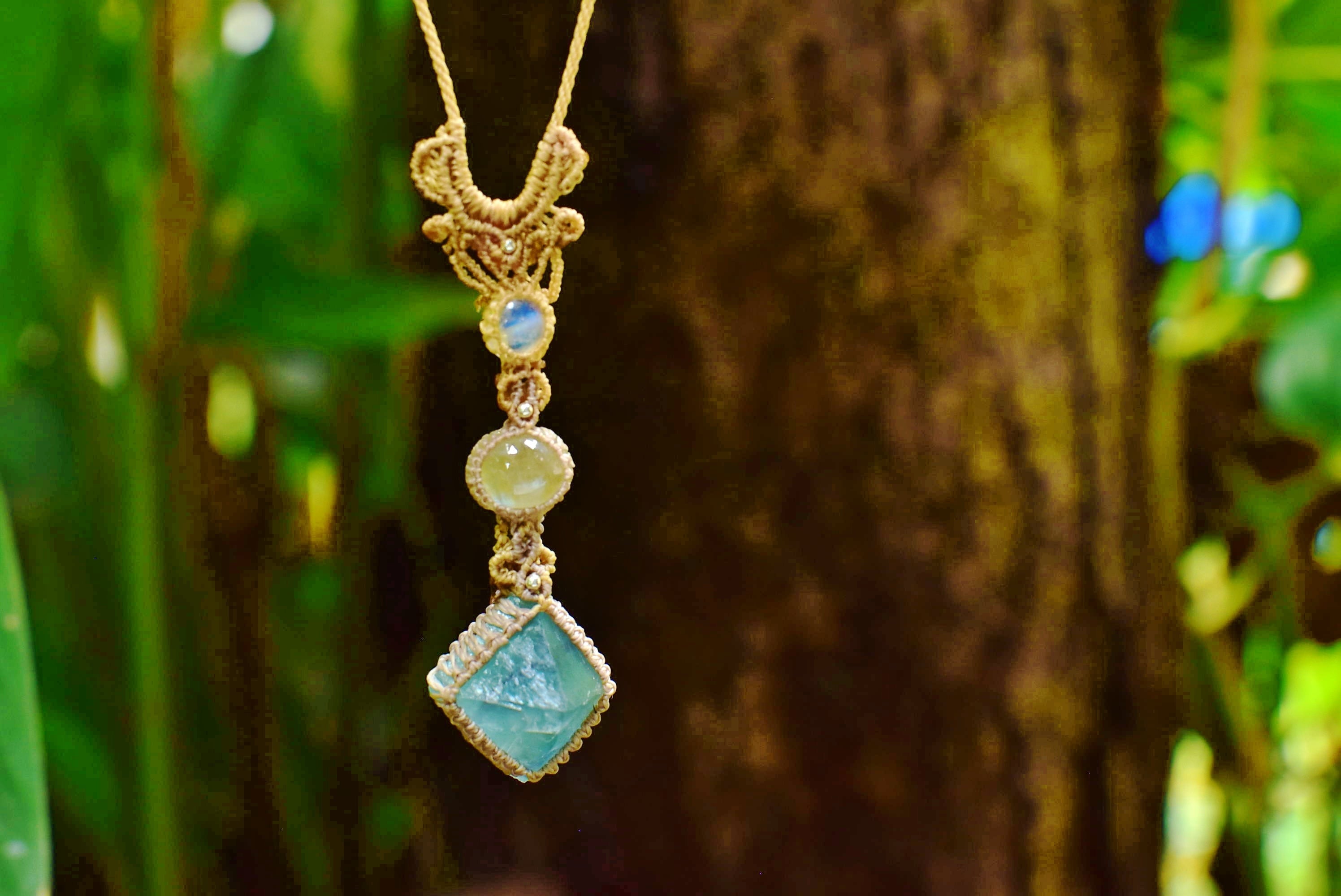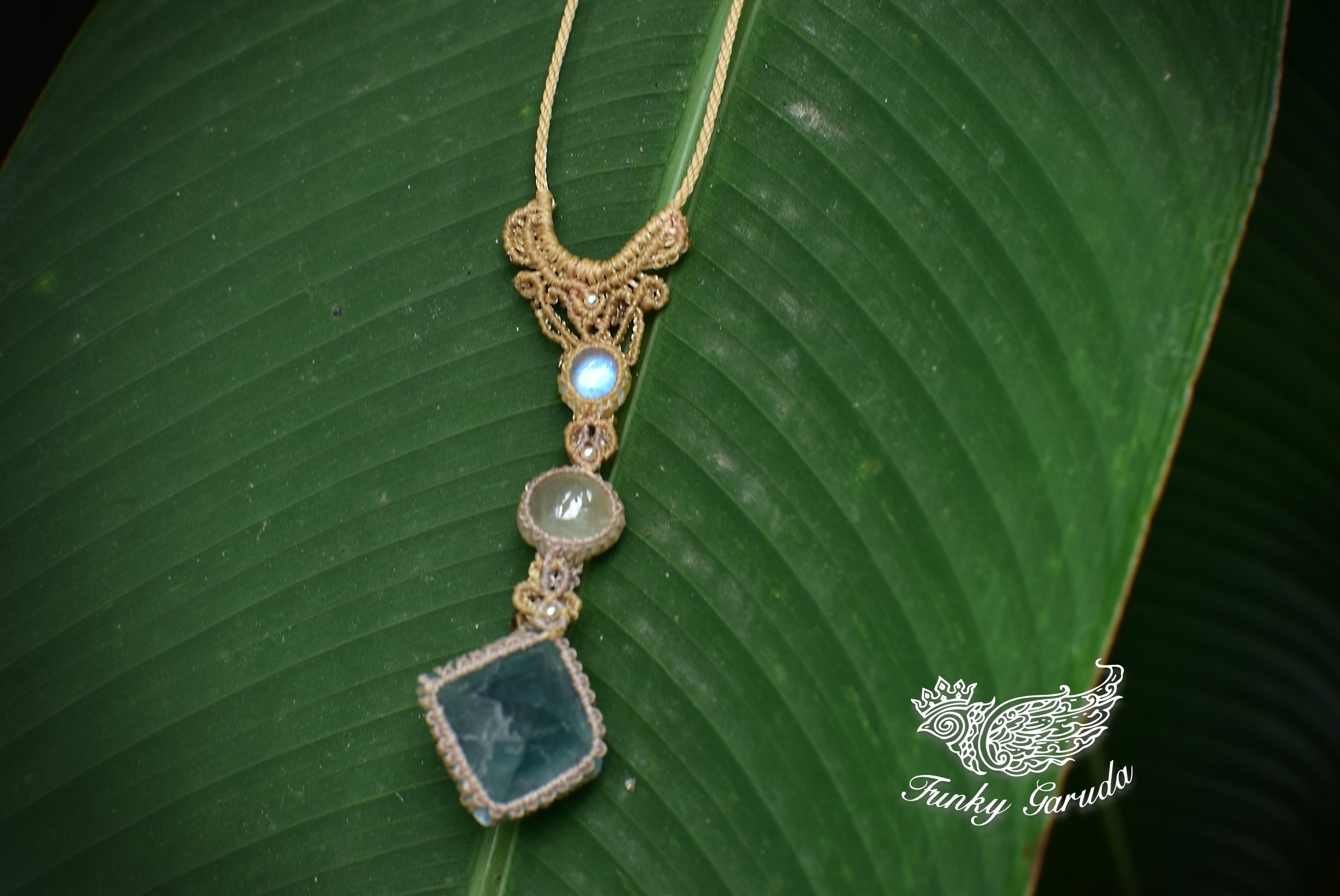 シラーの見える良質なイエローサファイア、レインボームーンストーン この3隻を結び合わせて仕上げたレース模様のマクラメペンダント。可愛らしさと女性らしさを念頭に意識してマクラメ編み装飾を施しました。