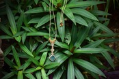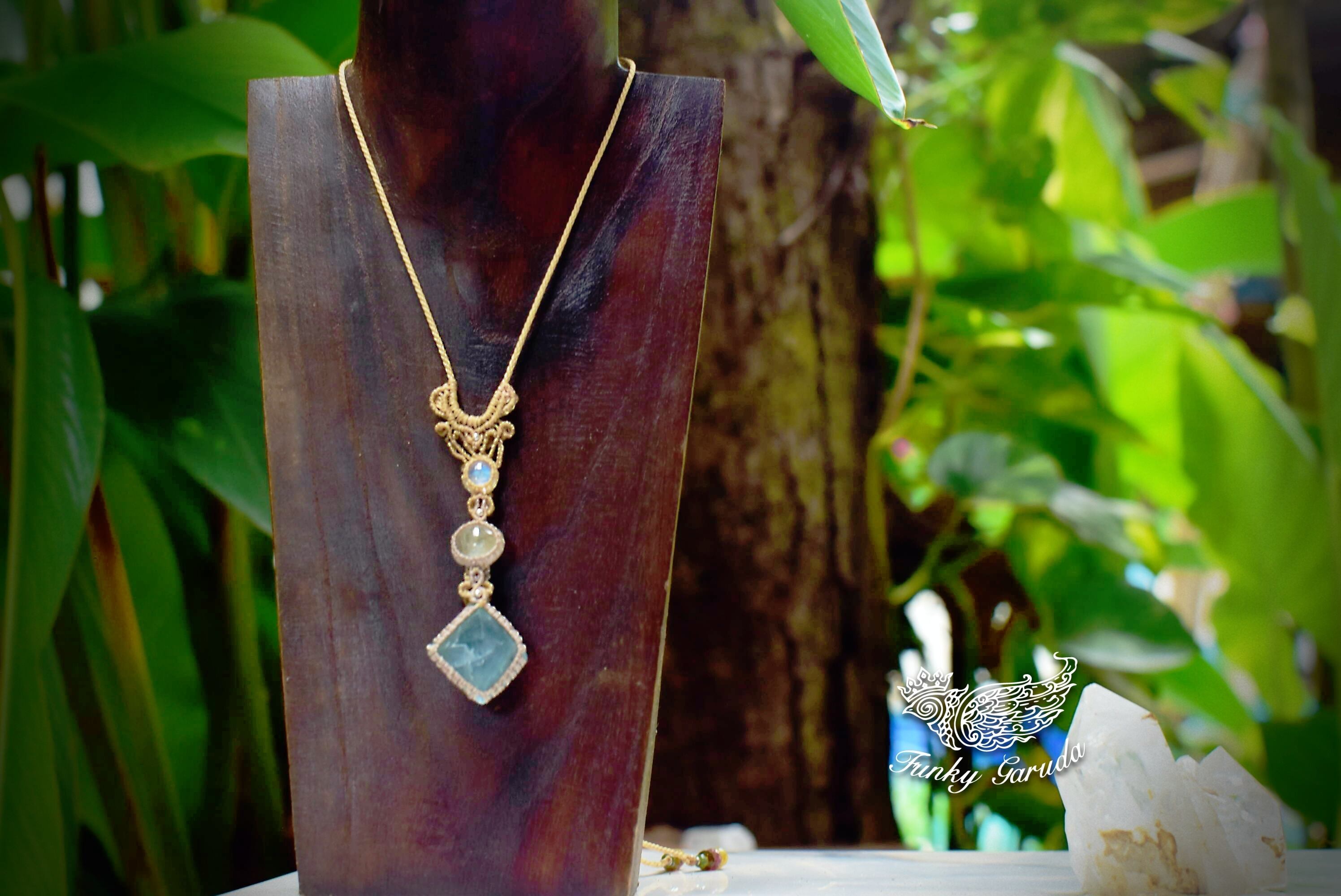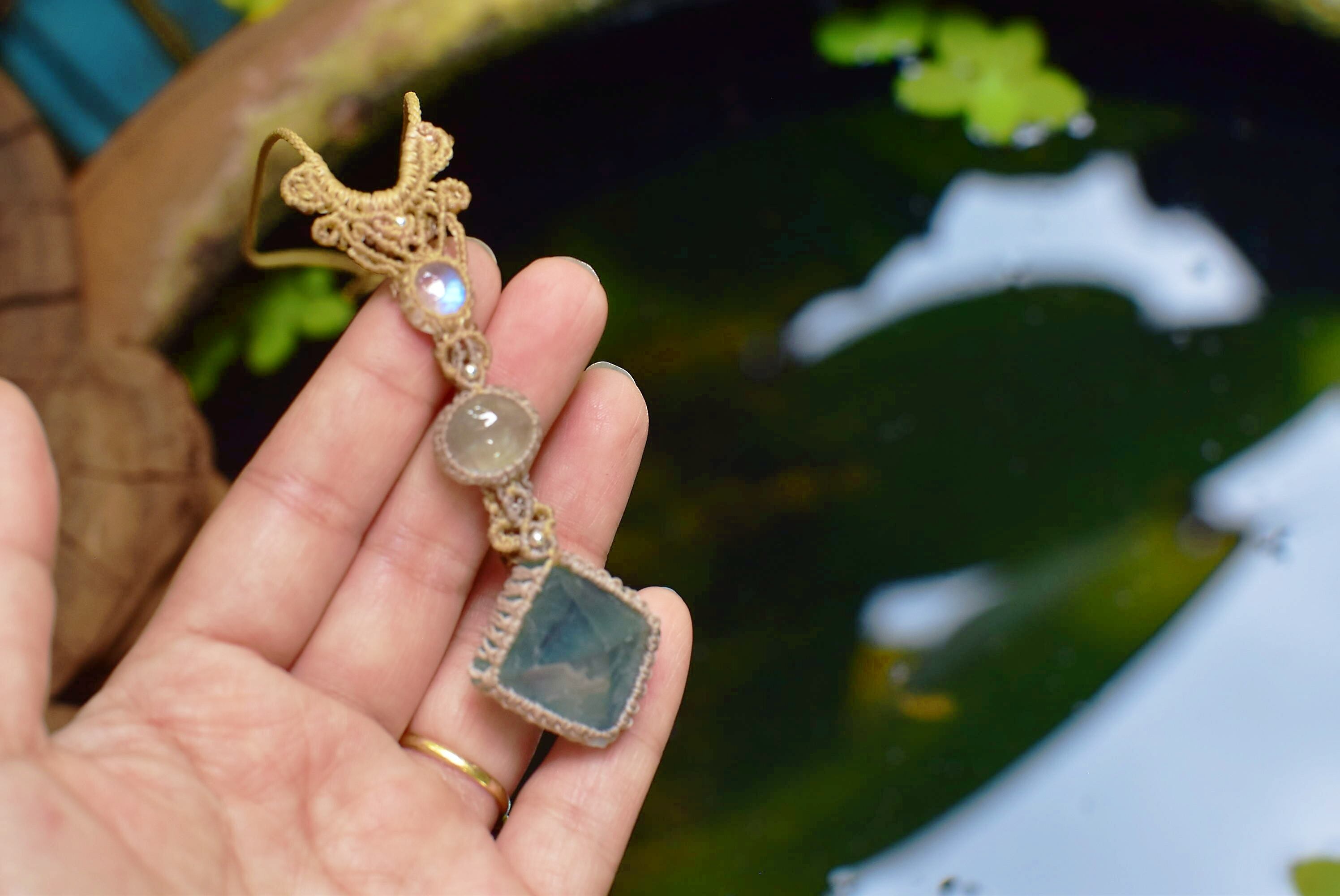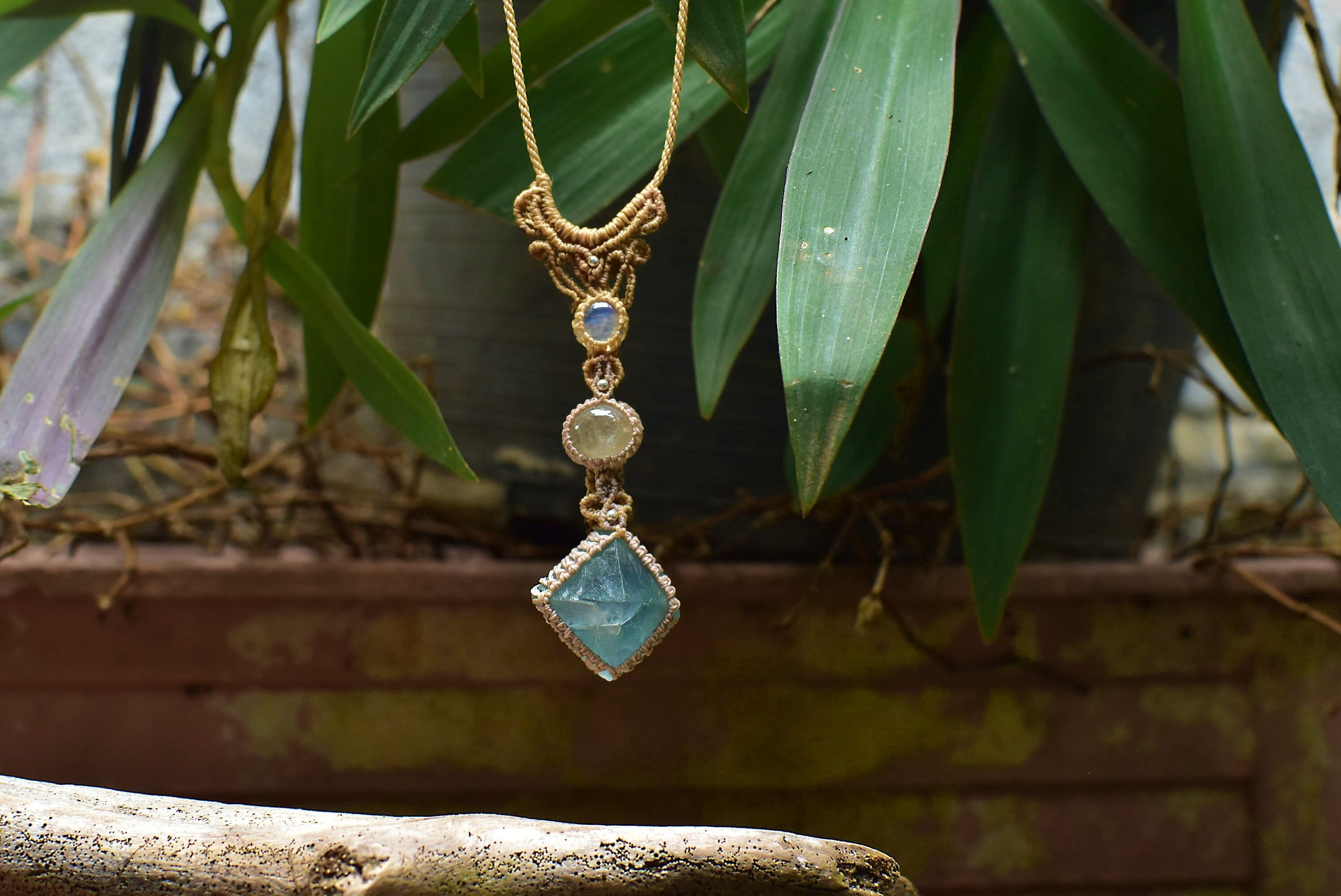 シラーの見える良質なイエローサファイア、レインボームーンストーン この3隻を結び合わせて仕上げたレース模様のマクラメペンダント。可愛らしさと女性らしさを念頭に意識してマクラメ編み装飾を施しました。