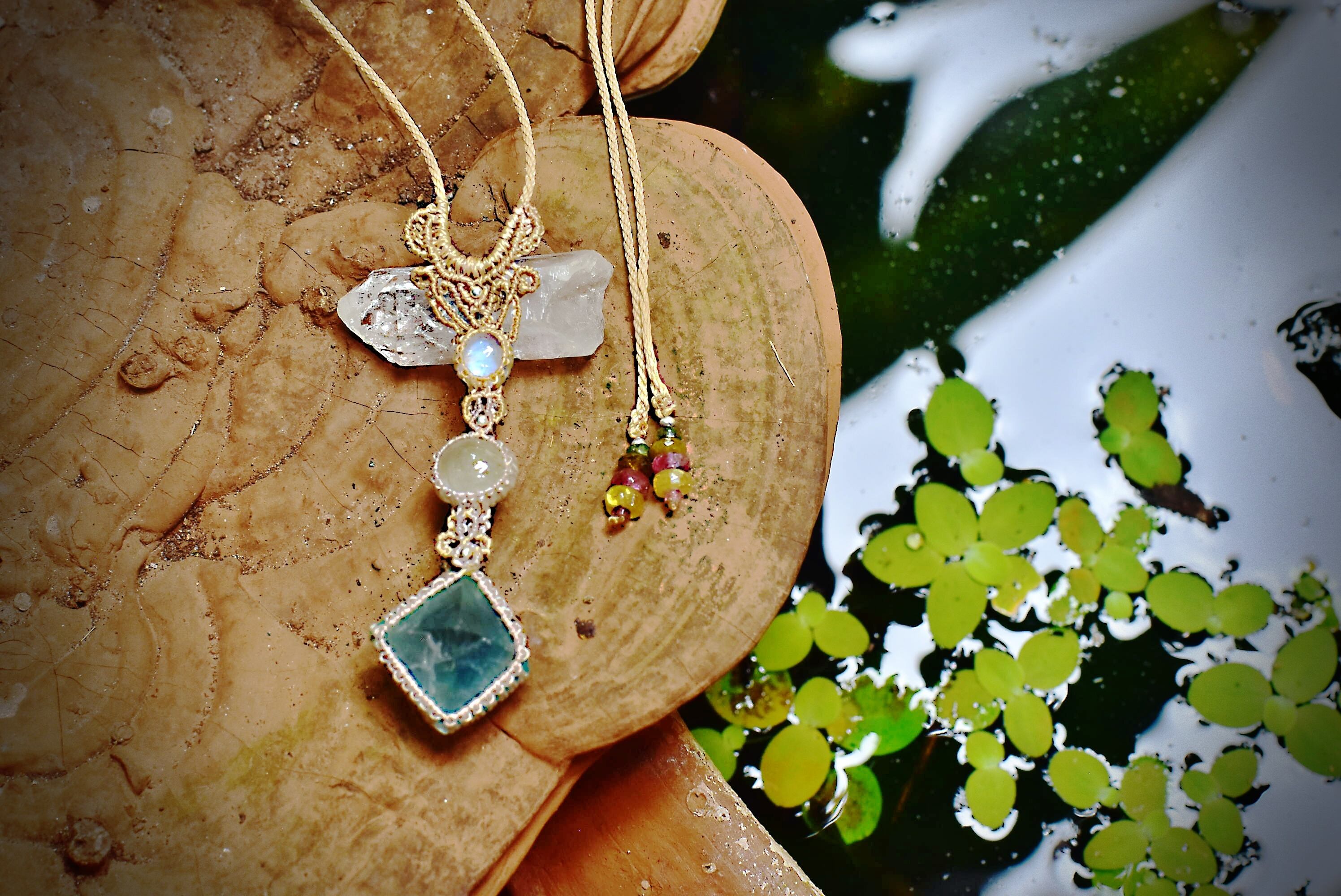 幻想やわらかなレースと泡模様★フローライト、イエローサファイア、 ムーンストーン マクラメネックレスflo008