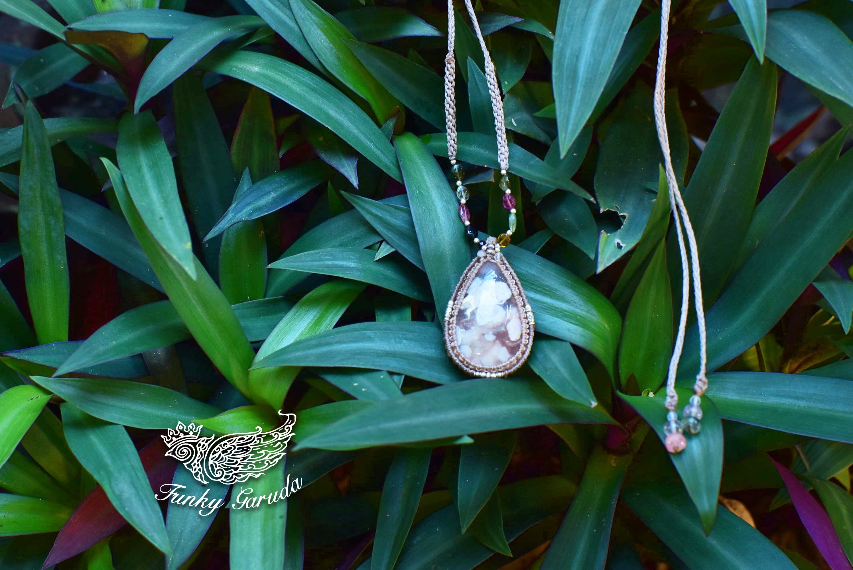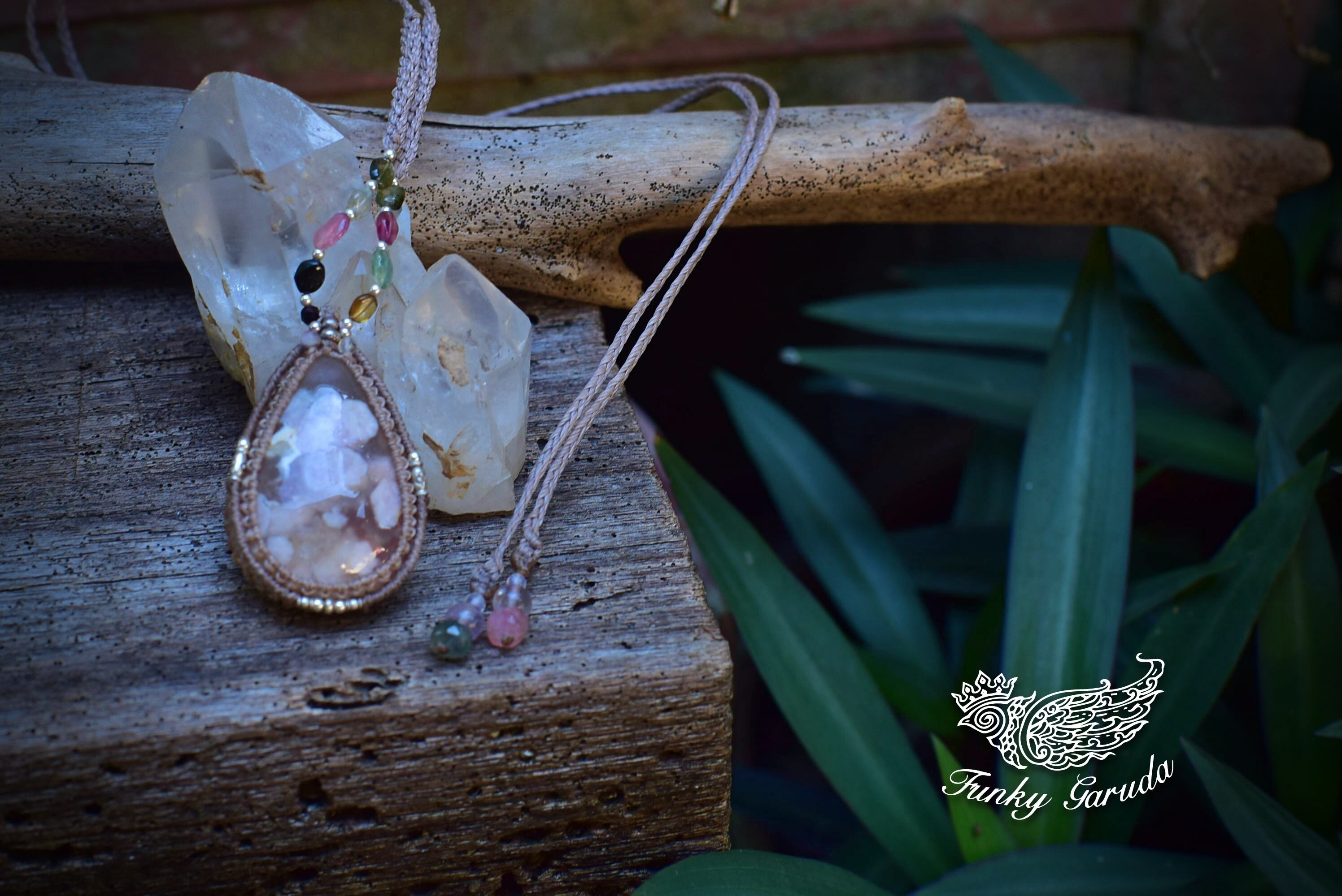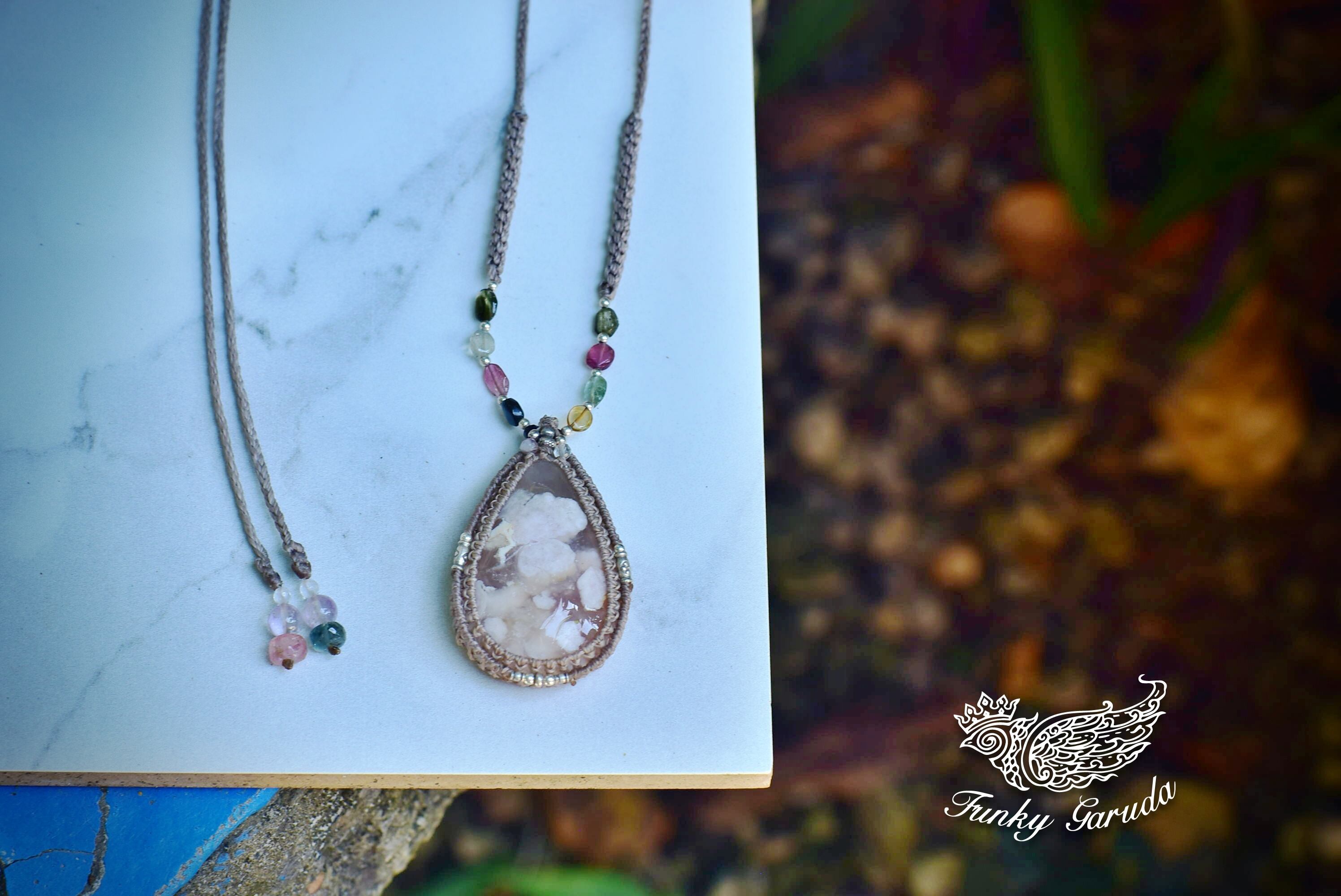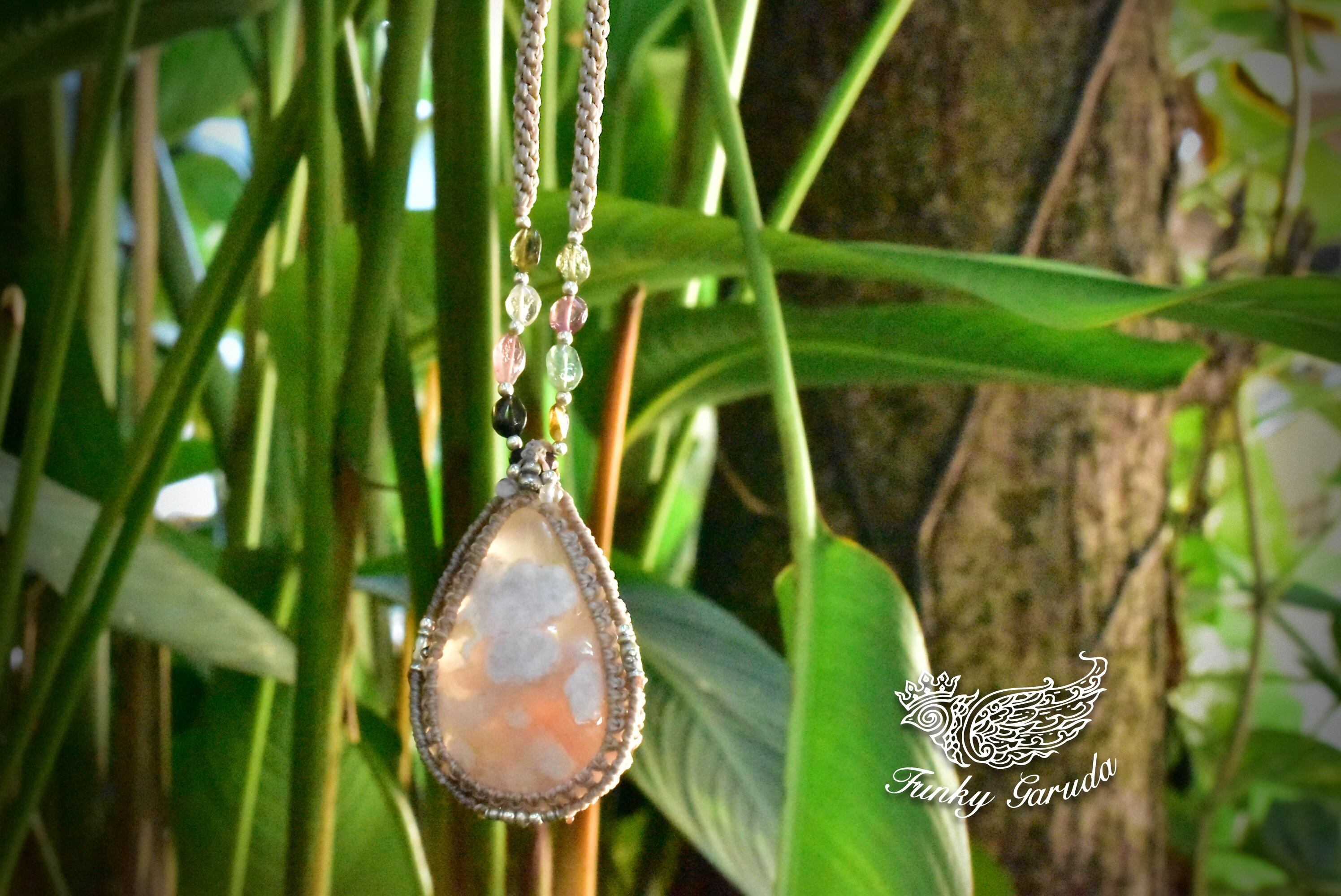 ピンクの内包物の世界★桜アゲート とトルマリンビーズ マクラメペンダントage005