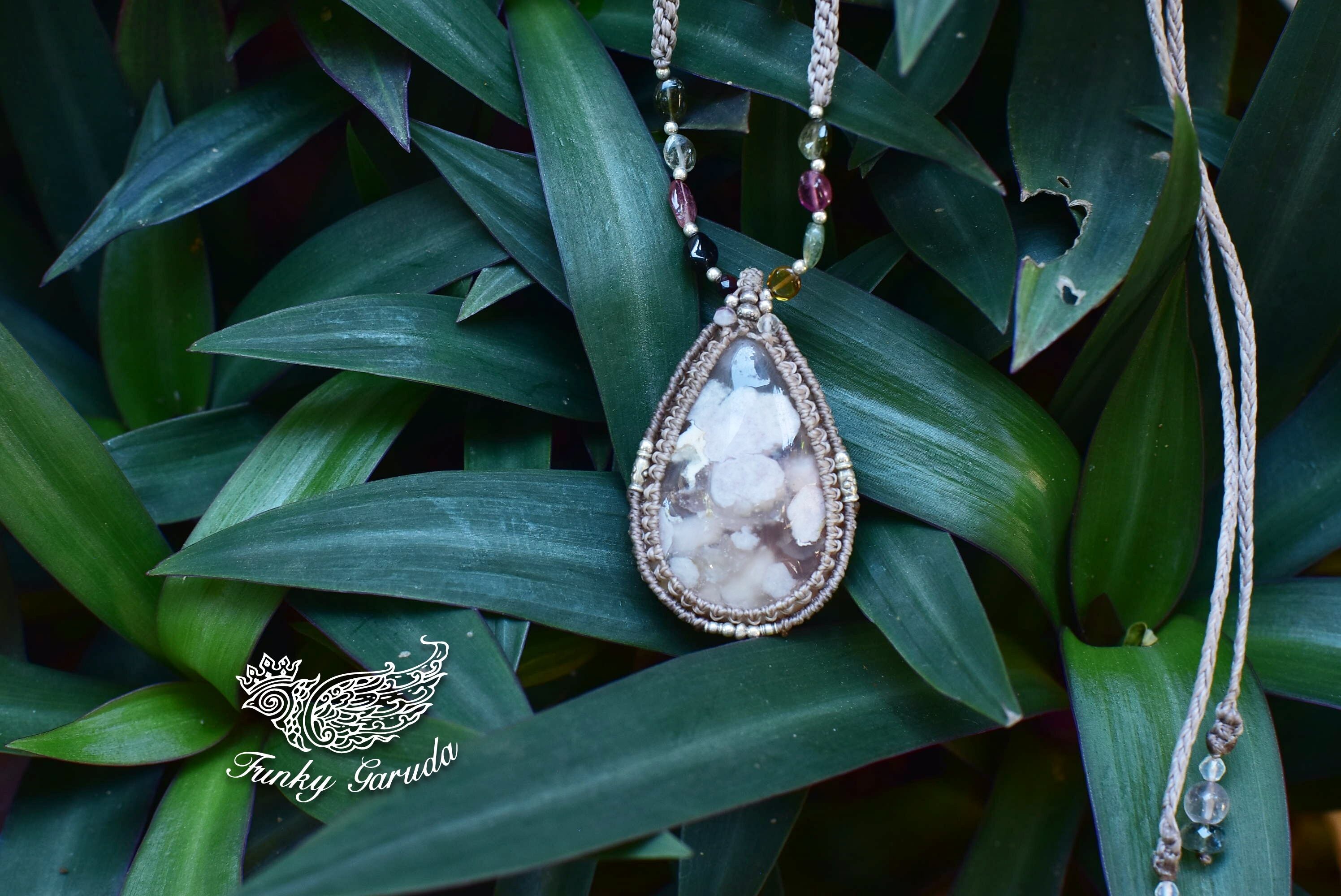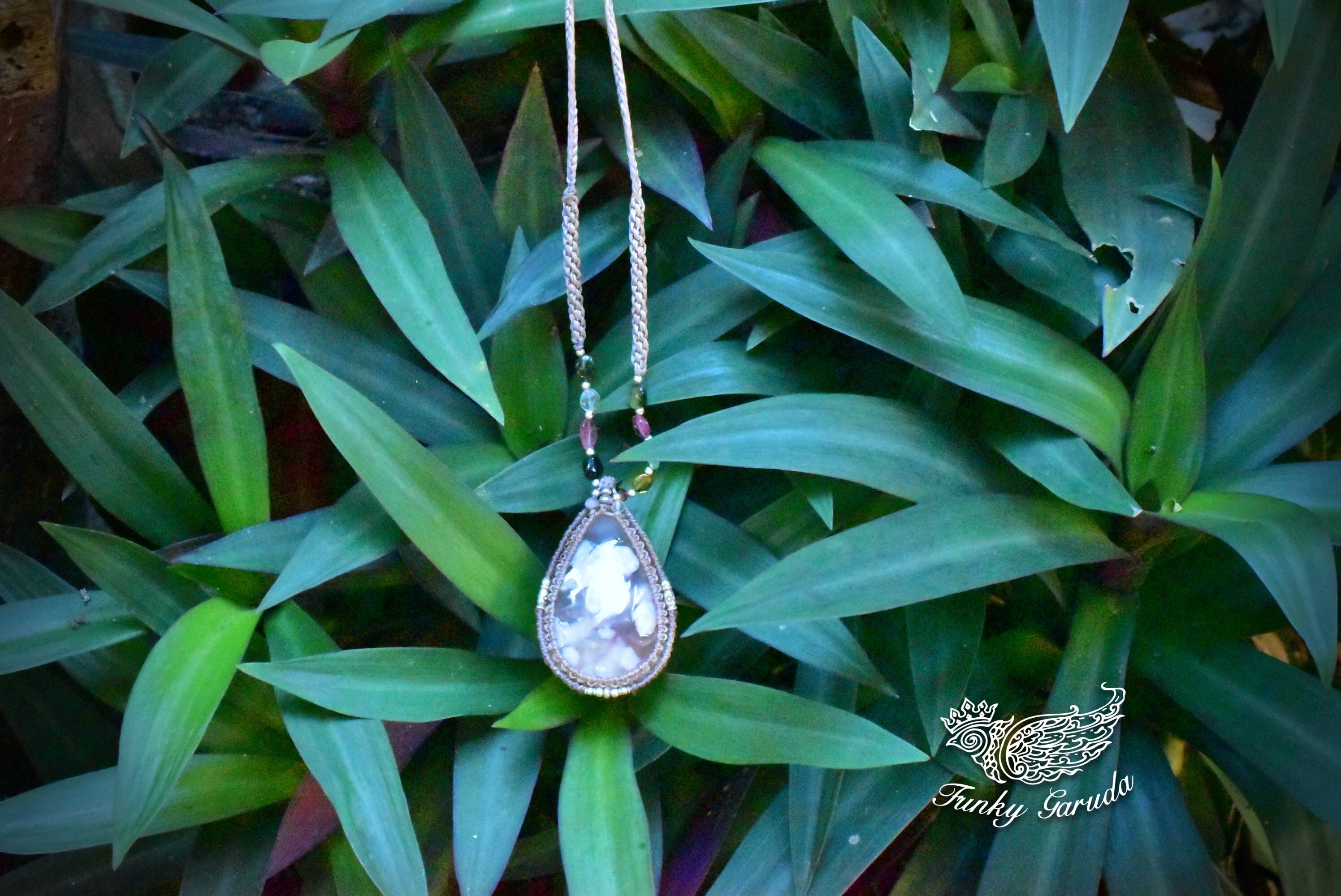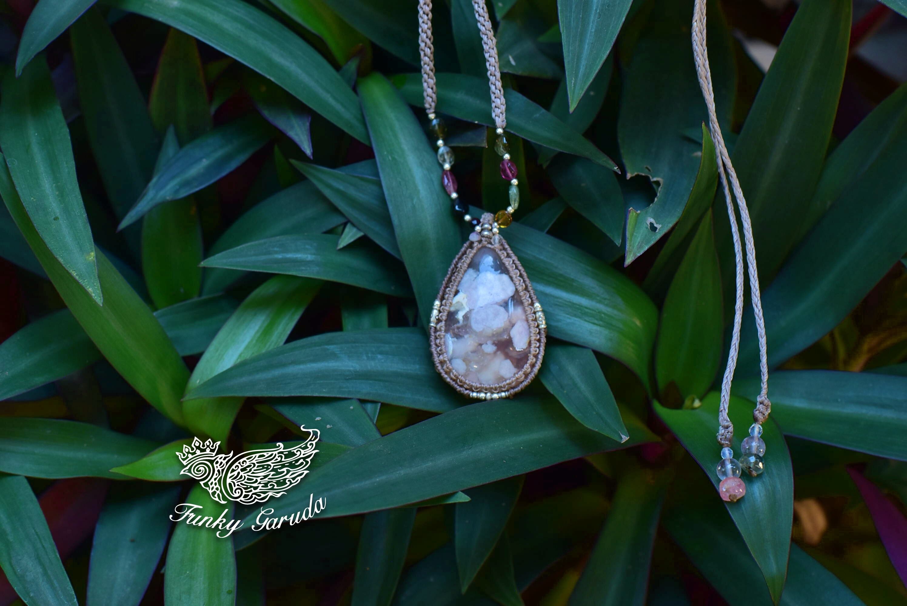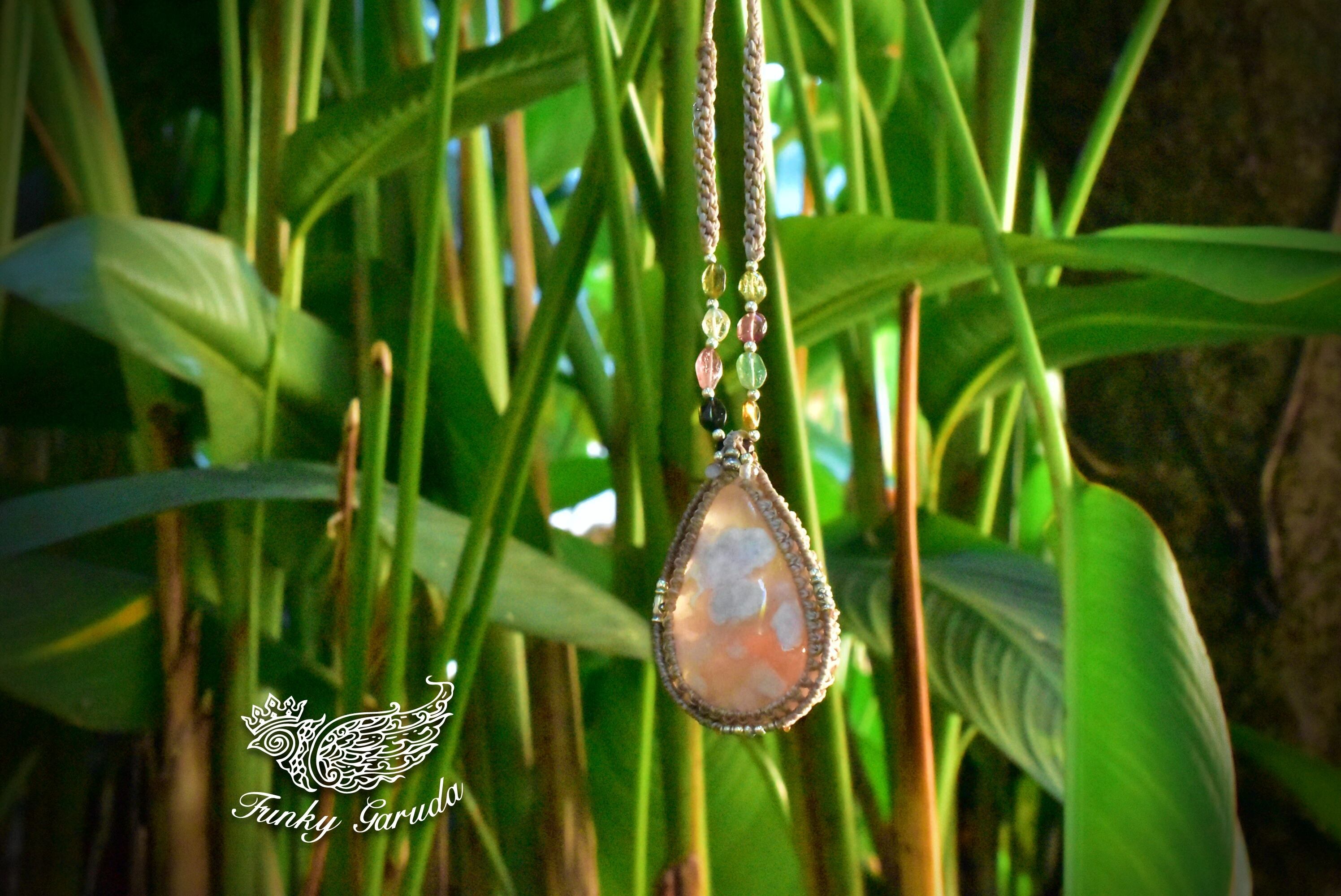 ピンクの内包物の世界★桜アゲート とトルマリンビーズ マクラメペンダントage005