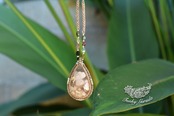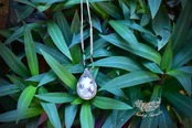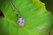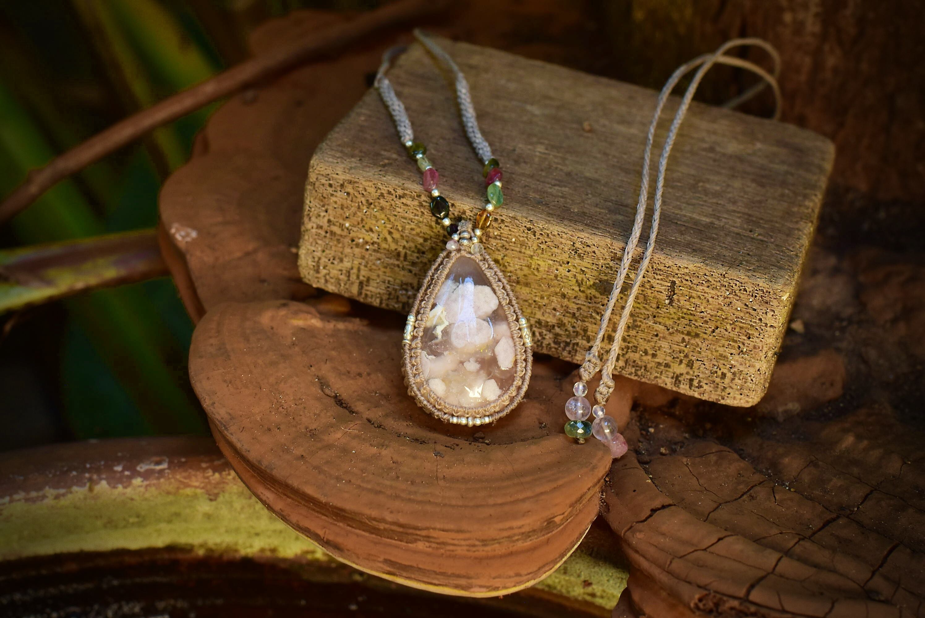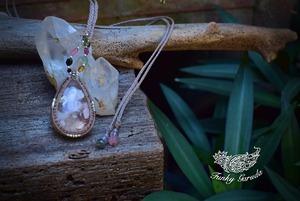薄いピンクの内包物が立体的に入り込んだチェリーブロッサムアゲート。大きなサイズですので中身のよく見えるもの。美しく研磨の施された水晶の中に見えるアートも魅了されるこの石の特徴です。そんなチェリーブロッサムをトルマリンビーズをあしらってネックレスペンダントに仕上げました。