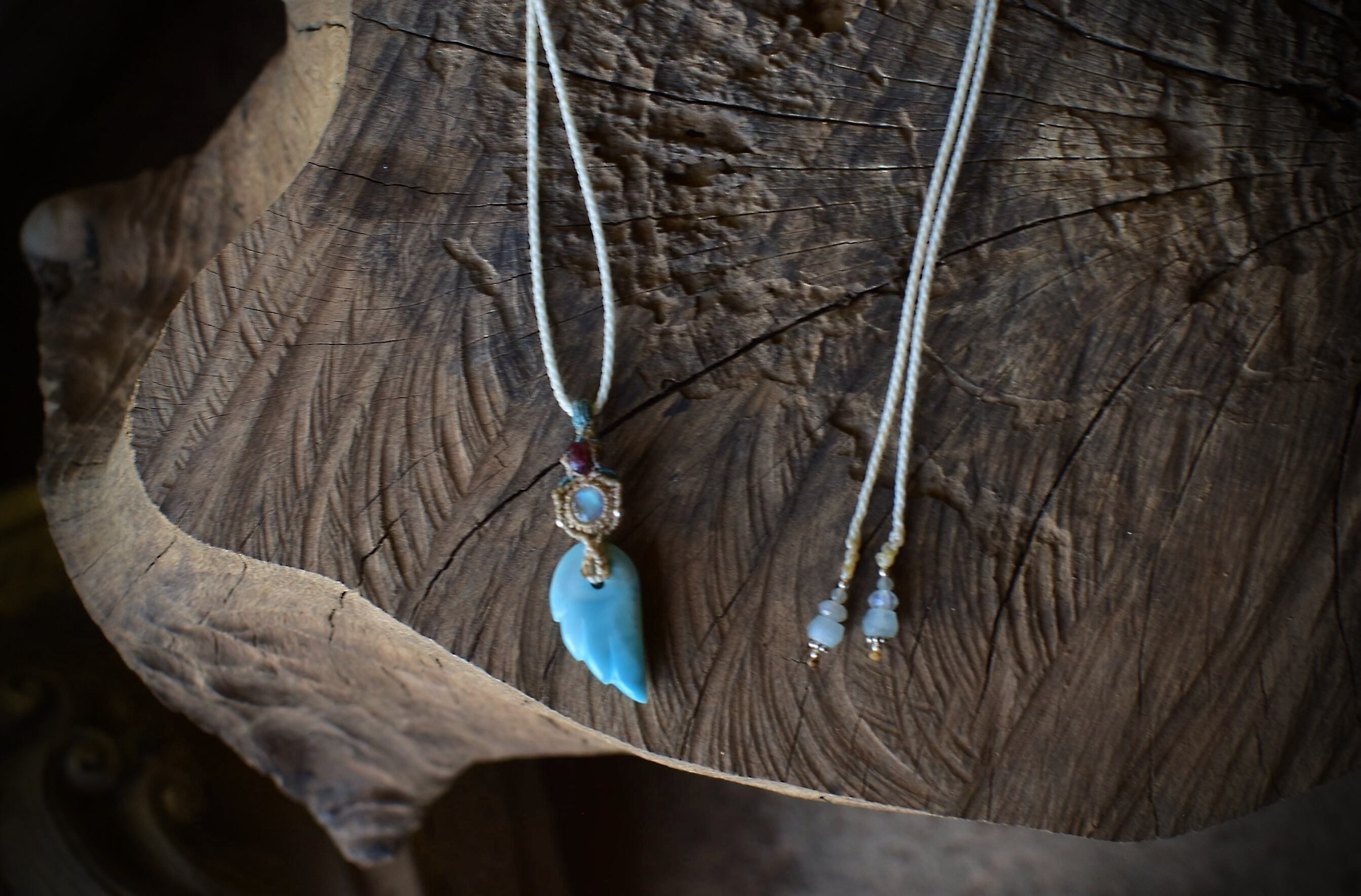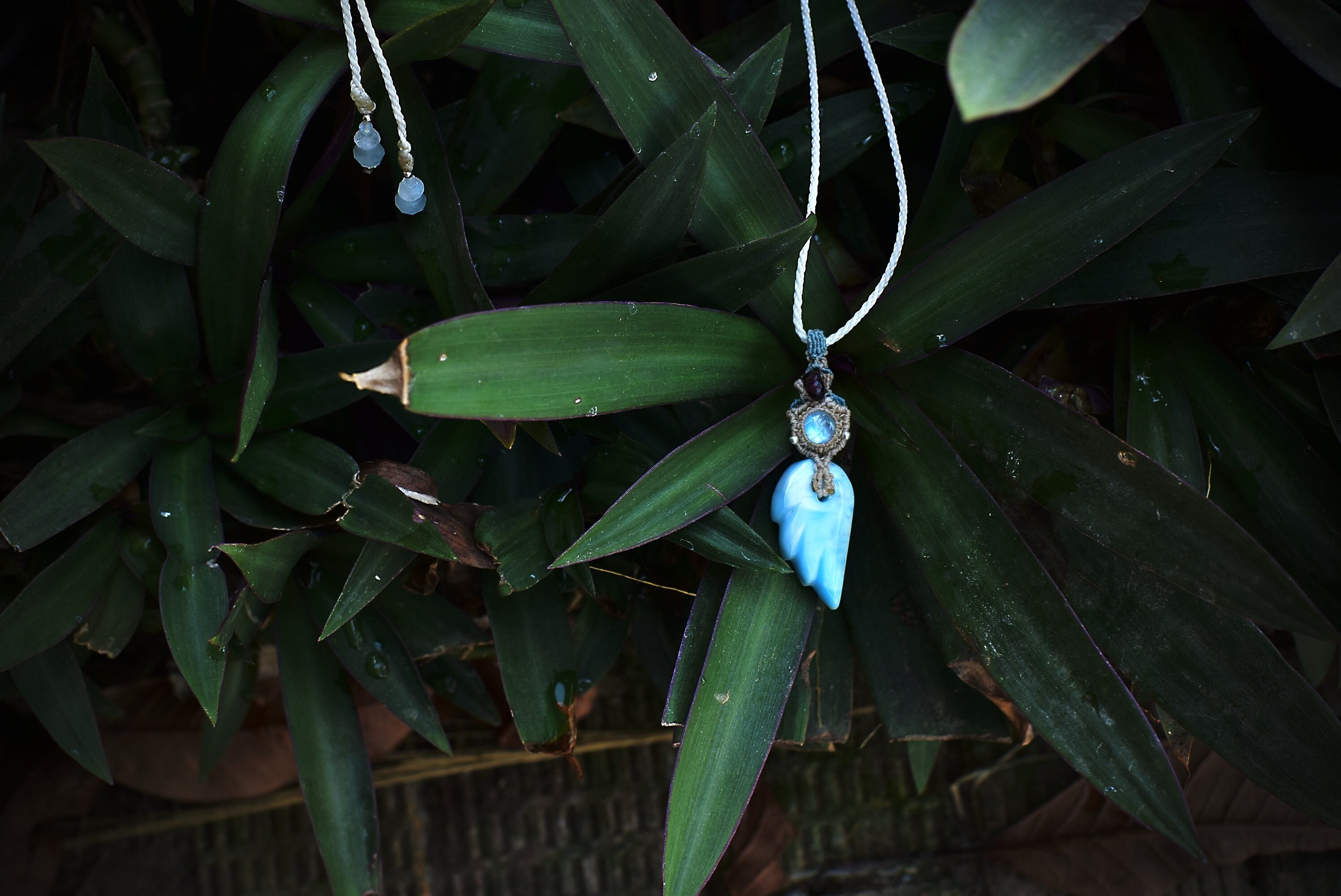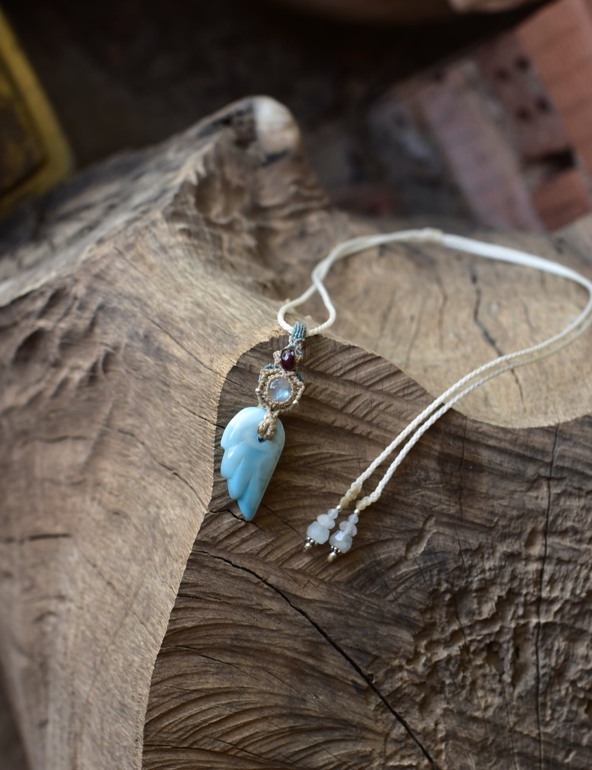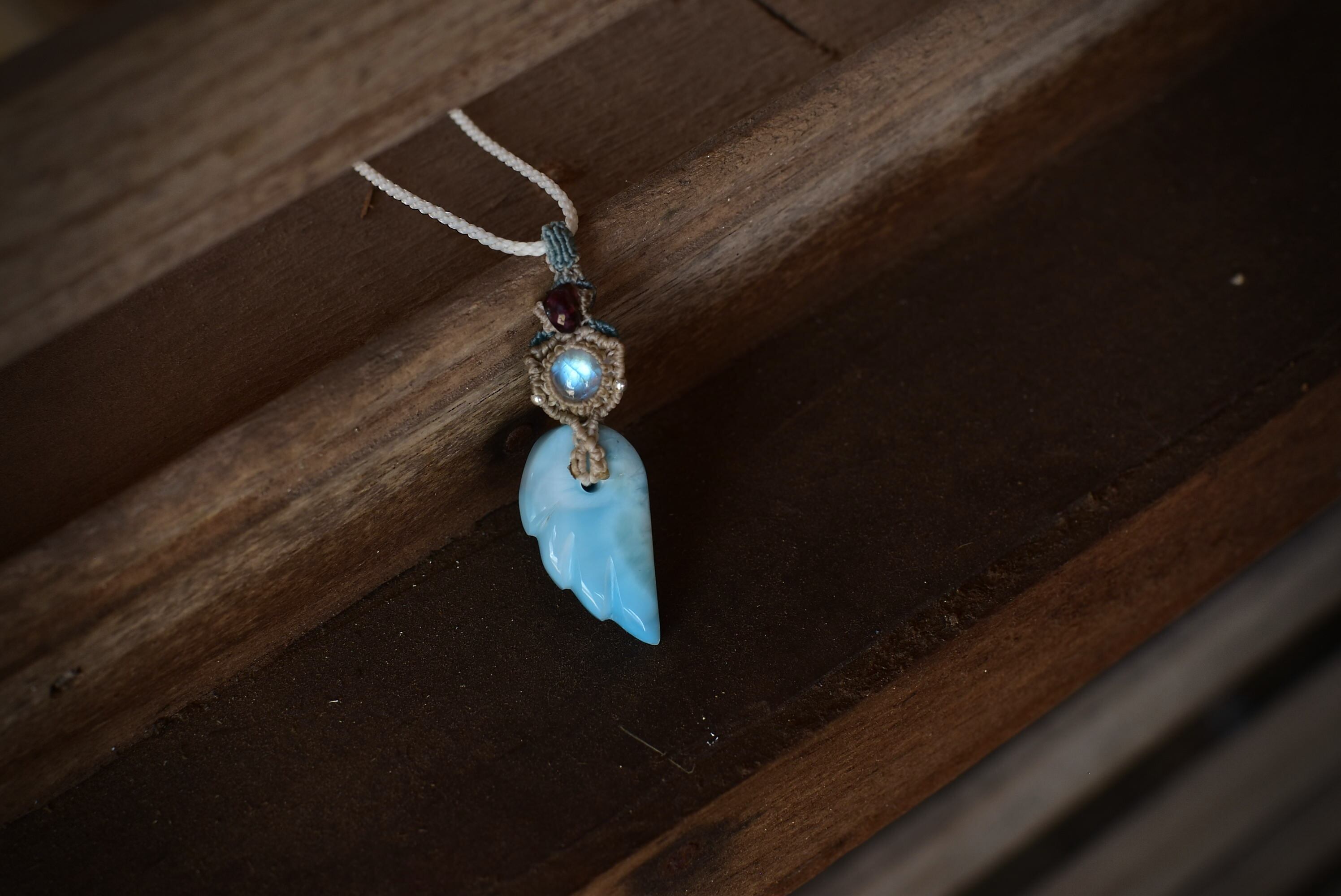 美しく羽根の形に彫刻研磨されたラリマー。この研磨の芸術に便乗させてもらって、マクラメ編み装飾をできるだけシンプルに施し、ブルーレインボーシラーが美しいムーンストーン、そしてトップ部分にウォーターメロントルマリンをあしらい、小さな異世界をイメージしてペンダントを仕上げました。