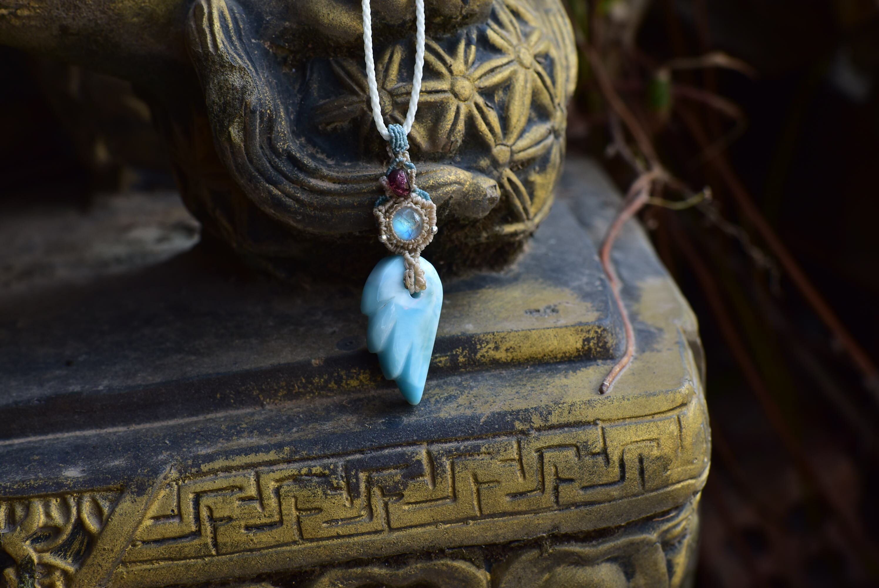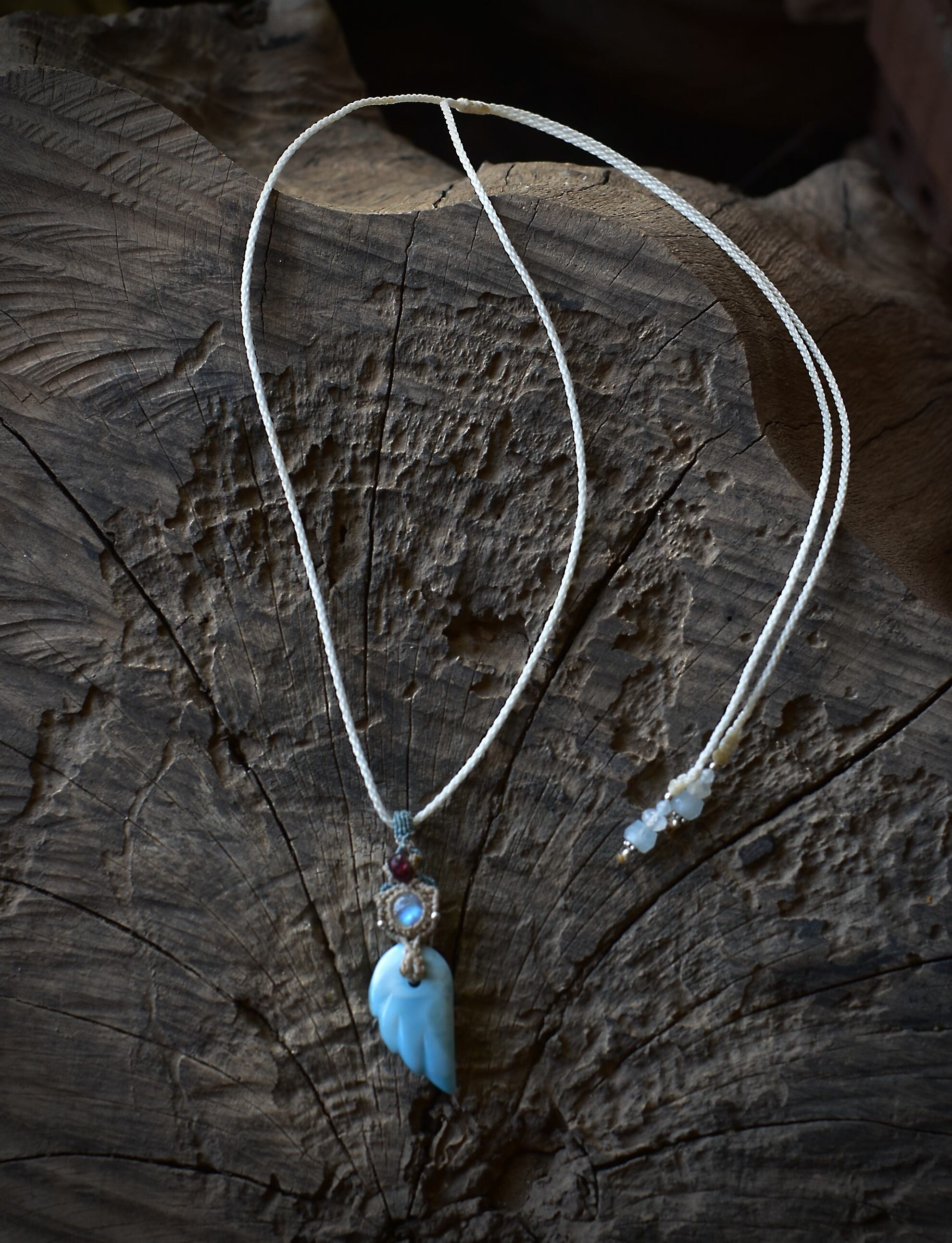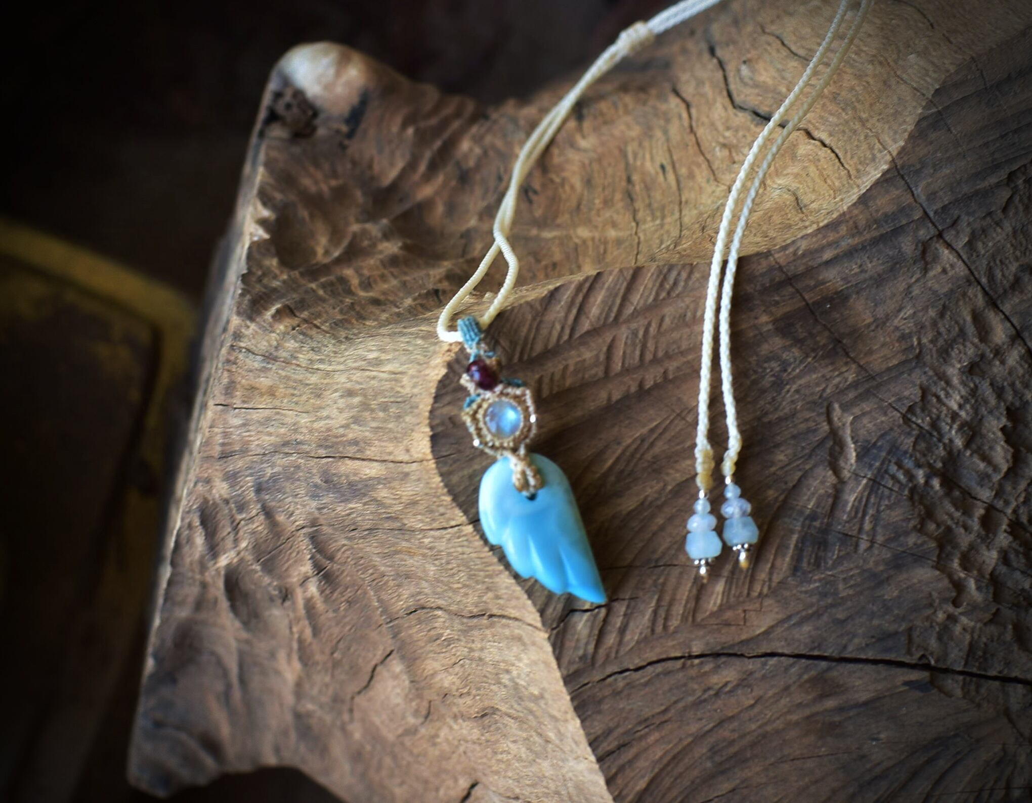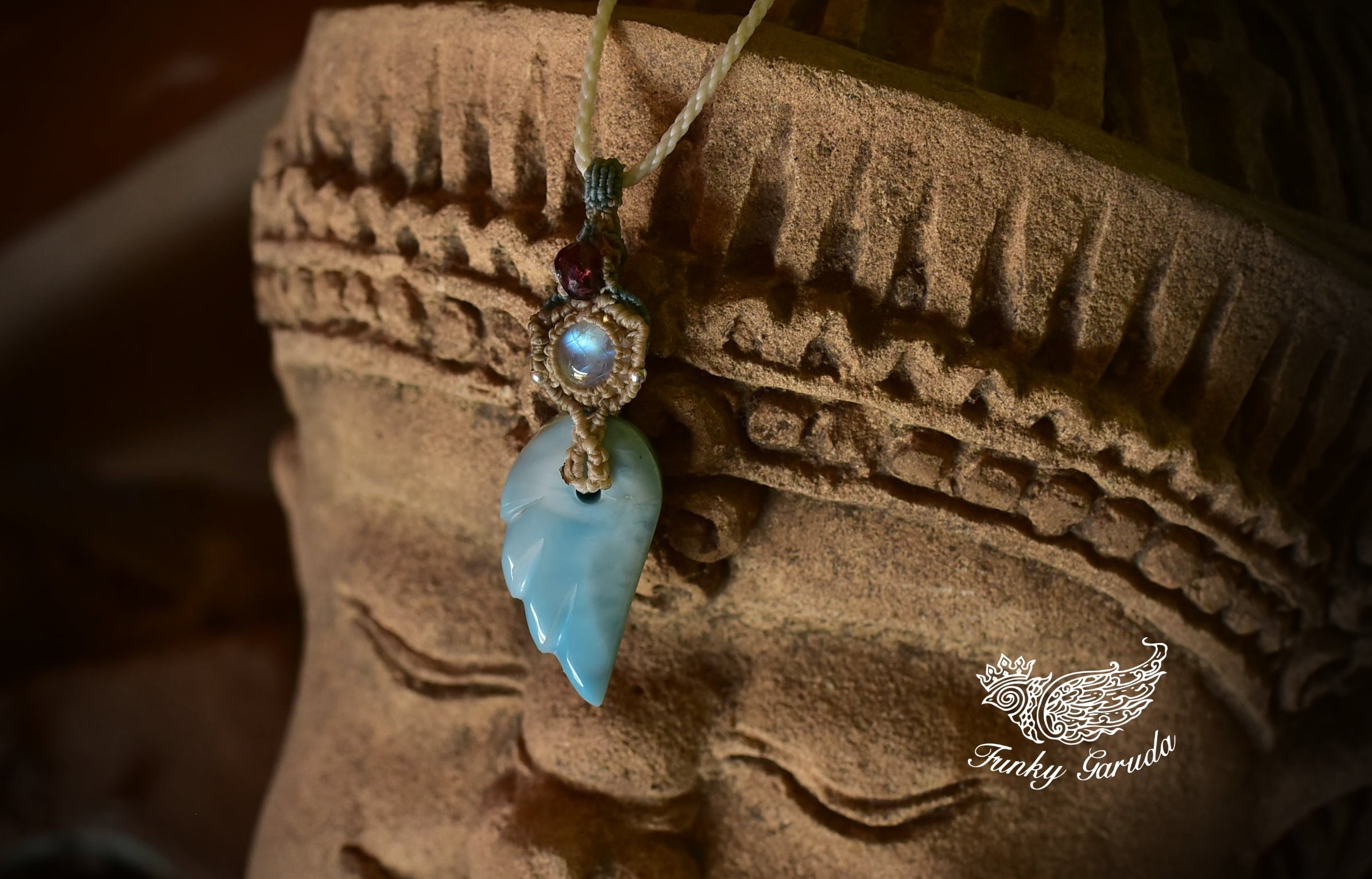 美しく羽根の形に彫刻研磨されたラリマー。この研磨の芸術に便乗させてもらって、マクラメ編み装飾をできるだけシンプルに施し、ブルーレインボーシラーが美しいムーンストーン、そしてトップ部分にウォーターメロントルマリンをあしらい、小さな異世界をイメージしてペンダントを仕上げました。