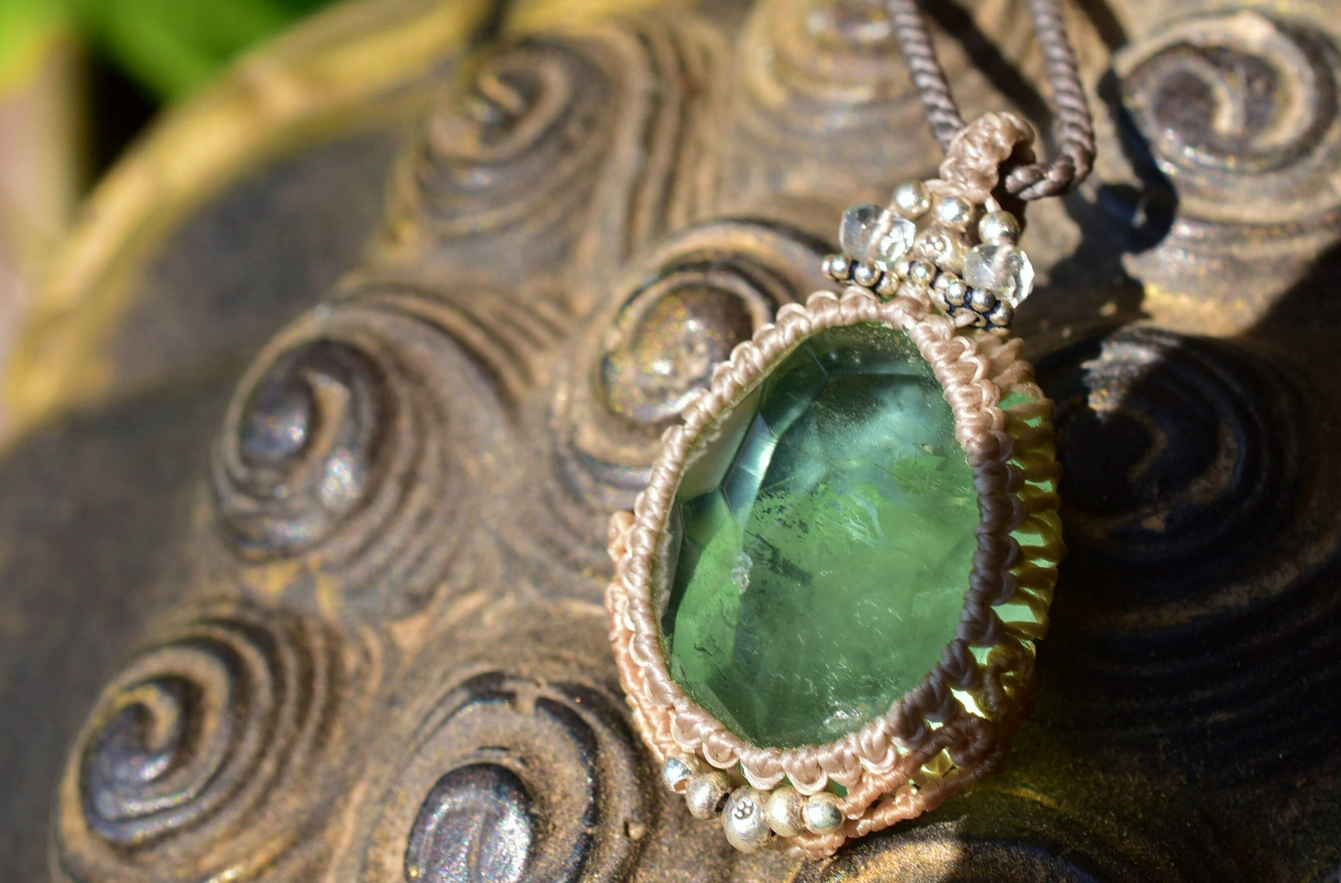 カットが施されたグリーンフローライトを一粒ペンダントに仕上げました。