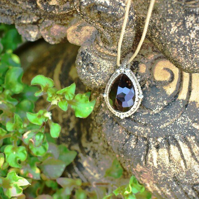 分厚くファセットカットが施されたスモーキークォーツ。ダークな水晶のと透明感、ファセットカットがキラキラと反射した高品質なものをピックアップしてシンプルなペンダントに仕上げました。