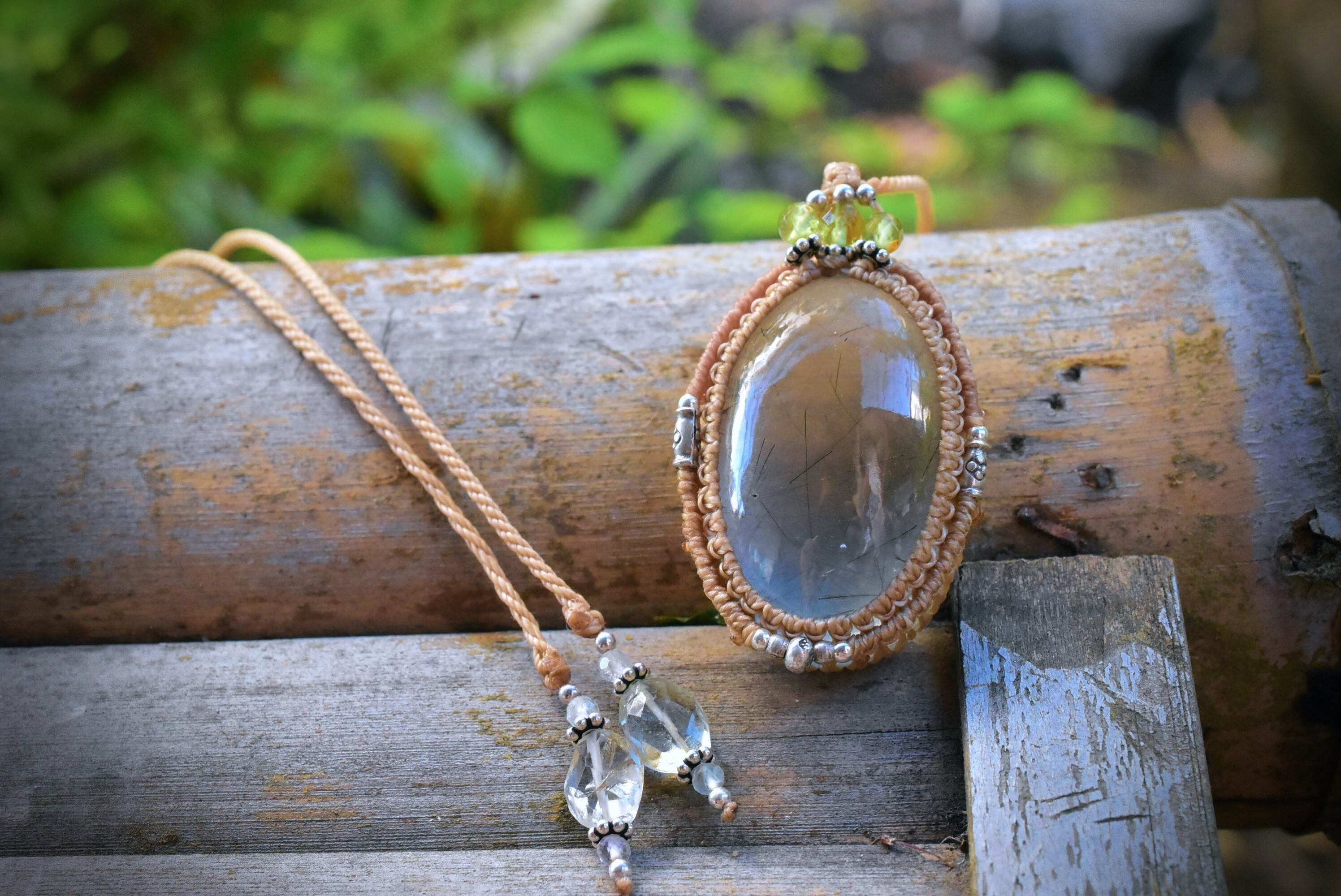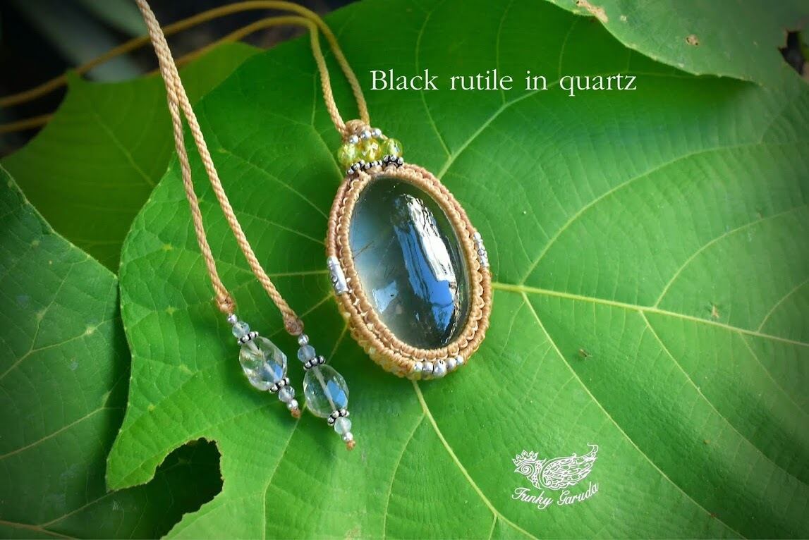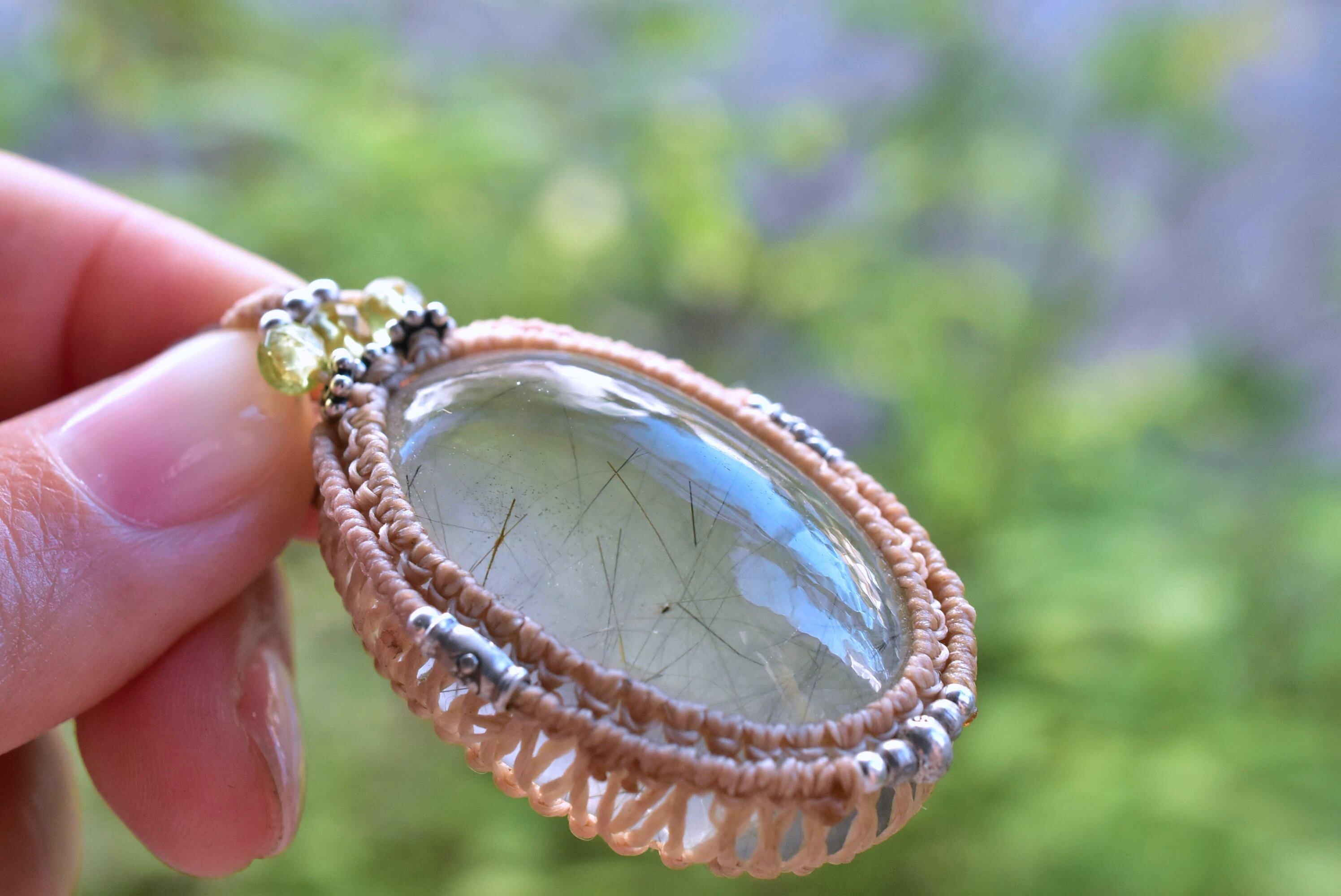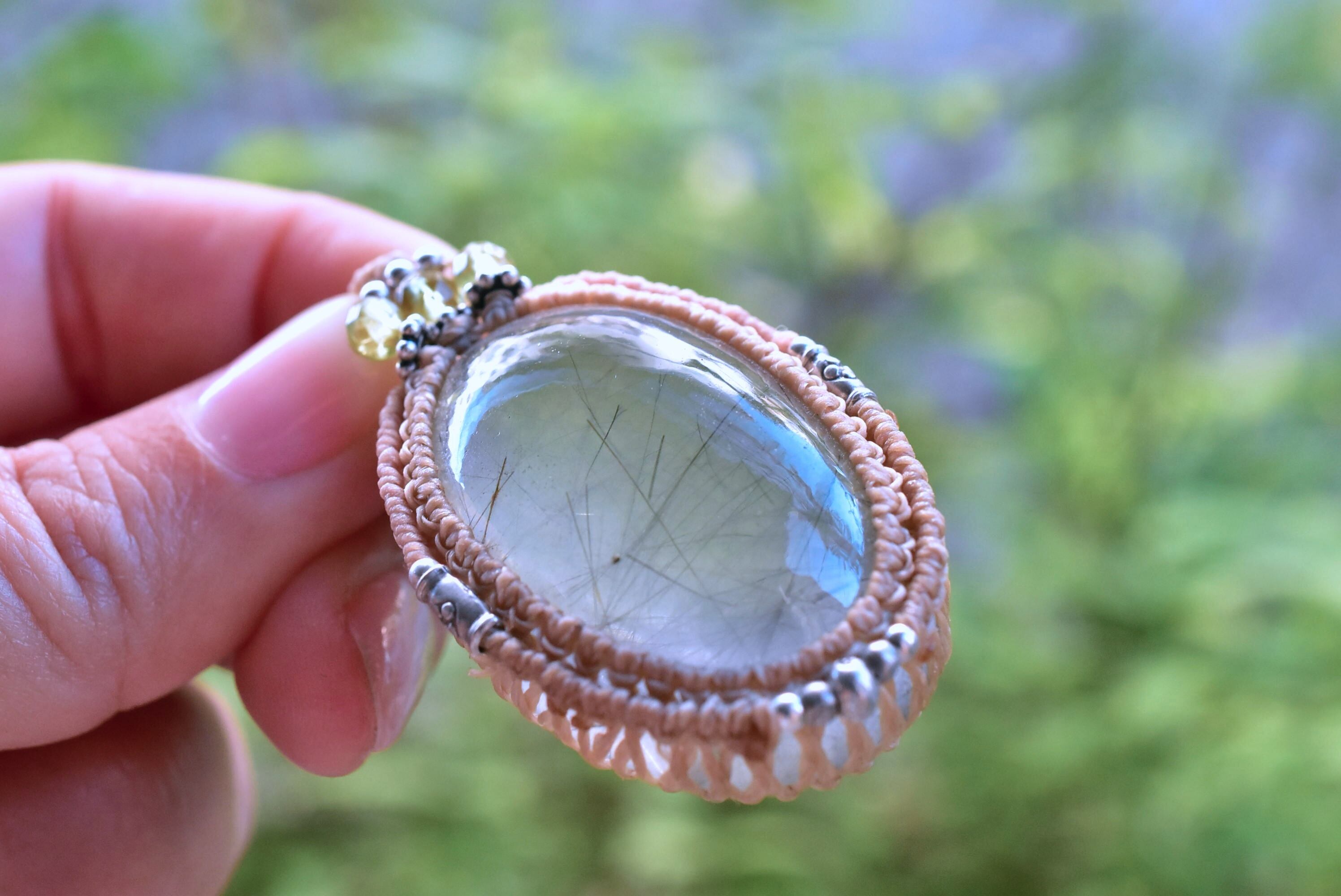 スモーキーな水晶の中に細くシャープな針のルチルがばら撒いてある..というような入り方をしているルチルが不思議に美しい水晶をシンプルにマクラメペンダントに仕上げました。