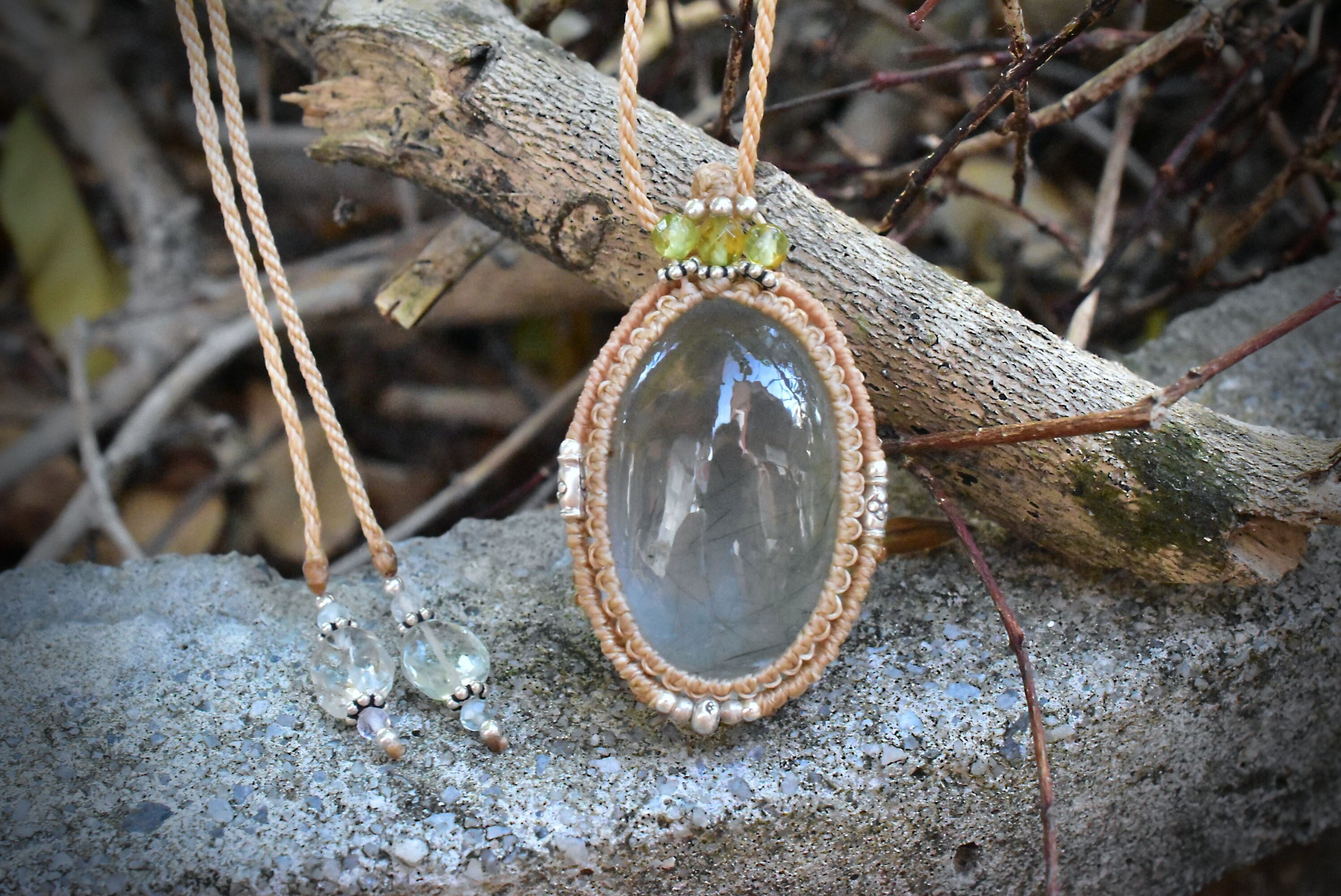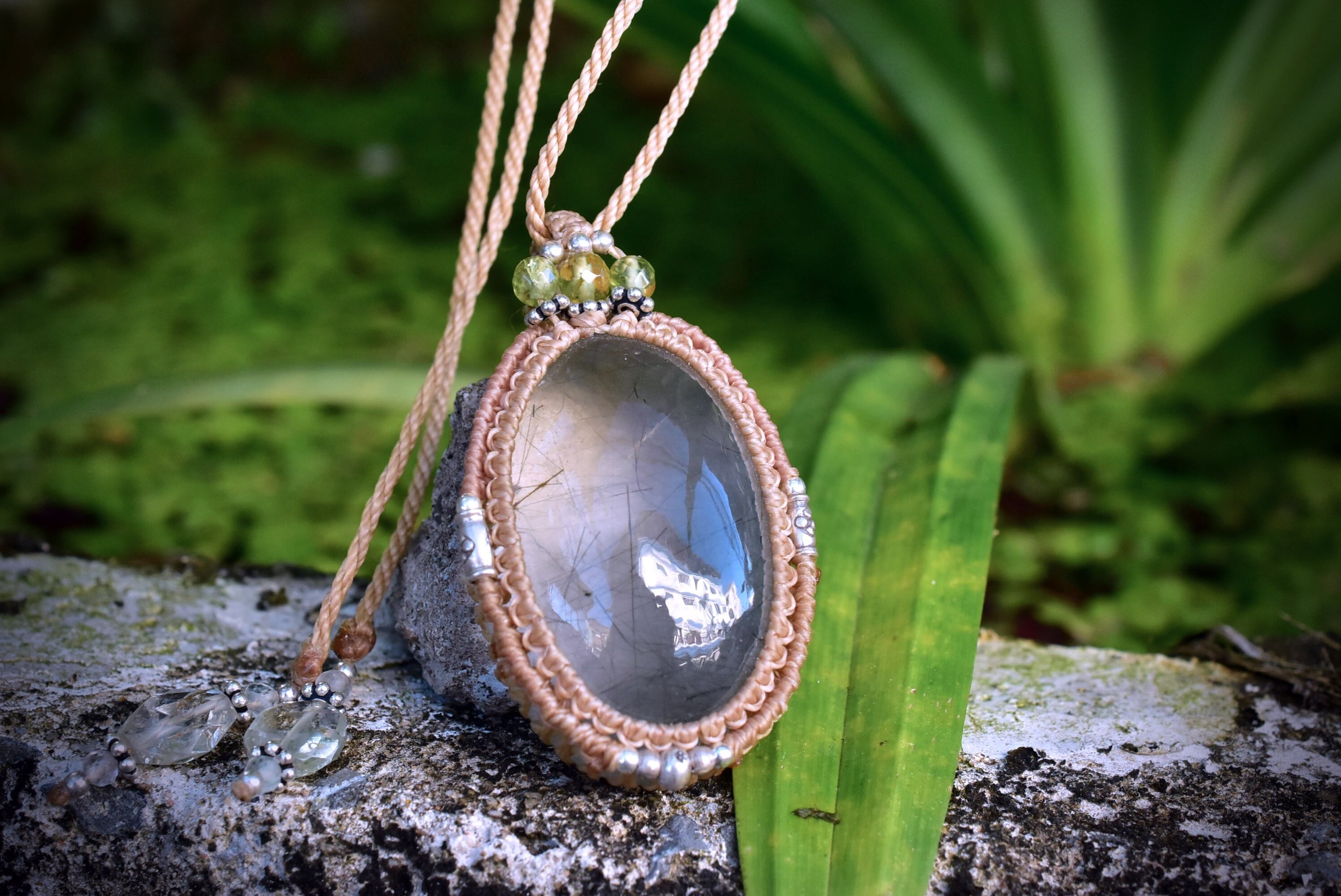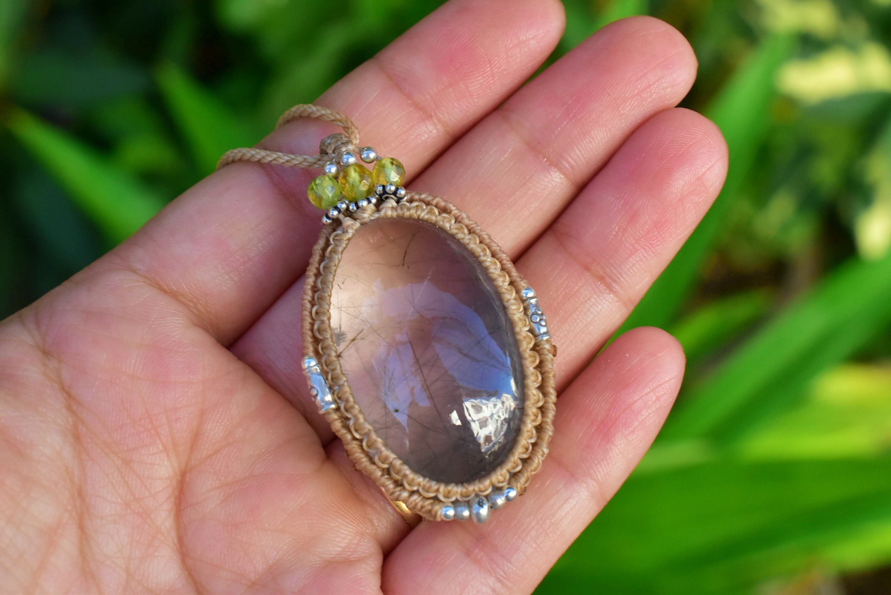 スモーキーな水晶の中に細くシャープな針のルチルがばら撒いてある..というような入り方をしているルチルが不思議に美しい水晶をシンプルにマクラメペンダントに仕上げました。