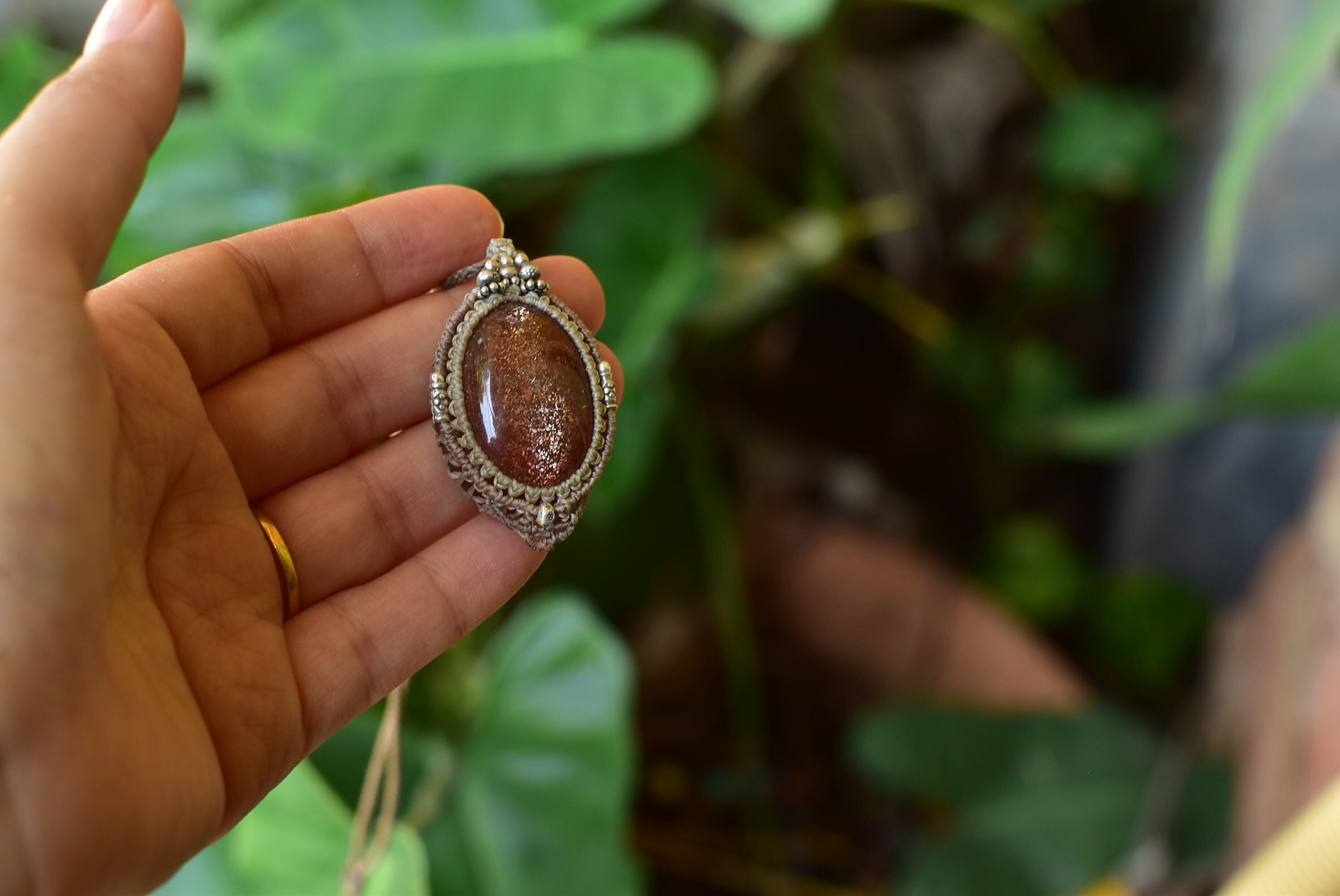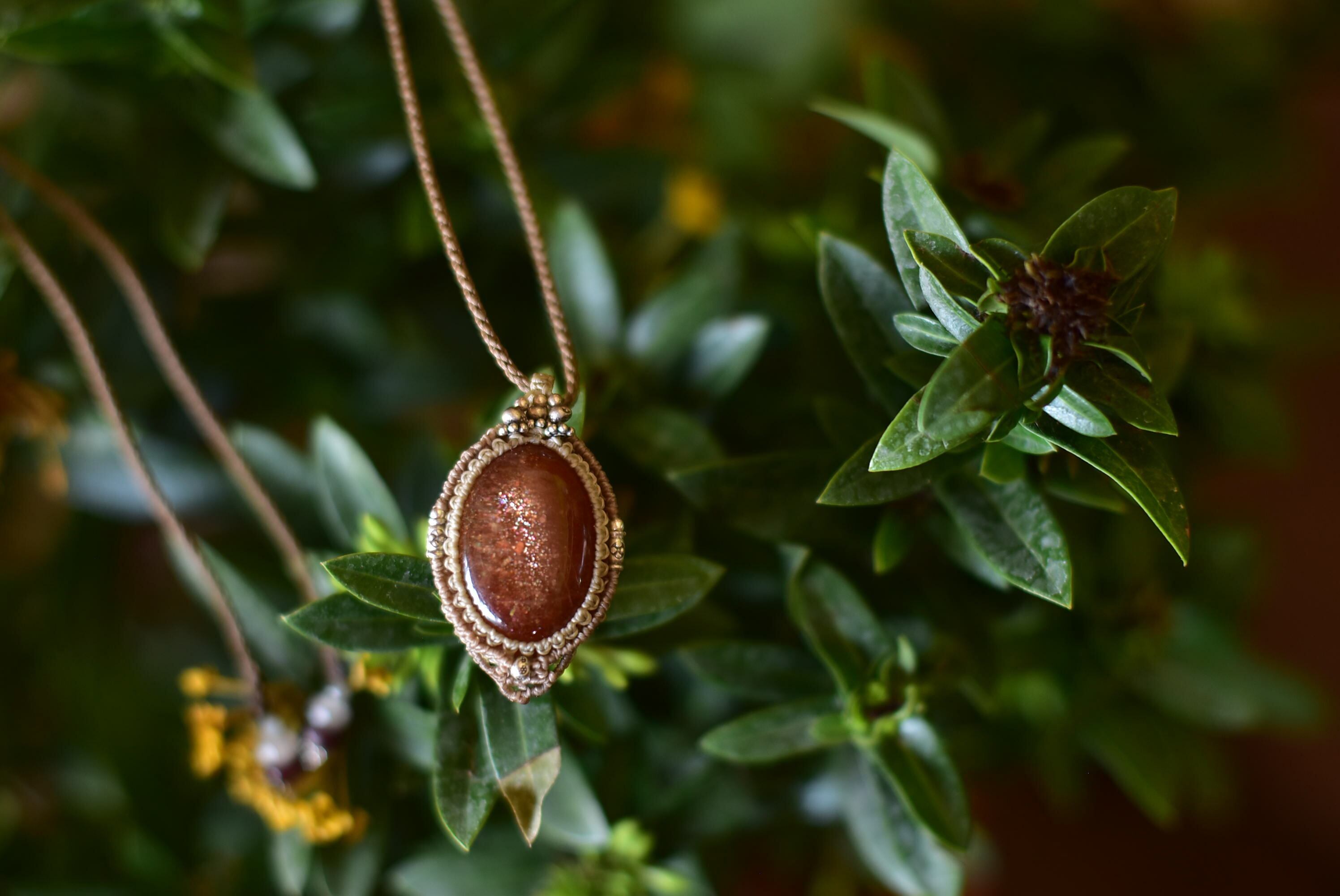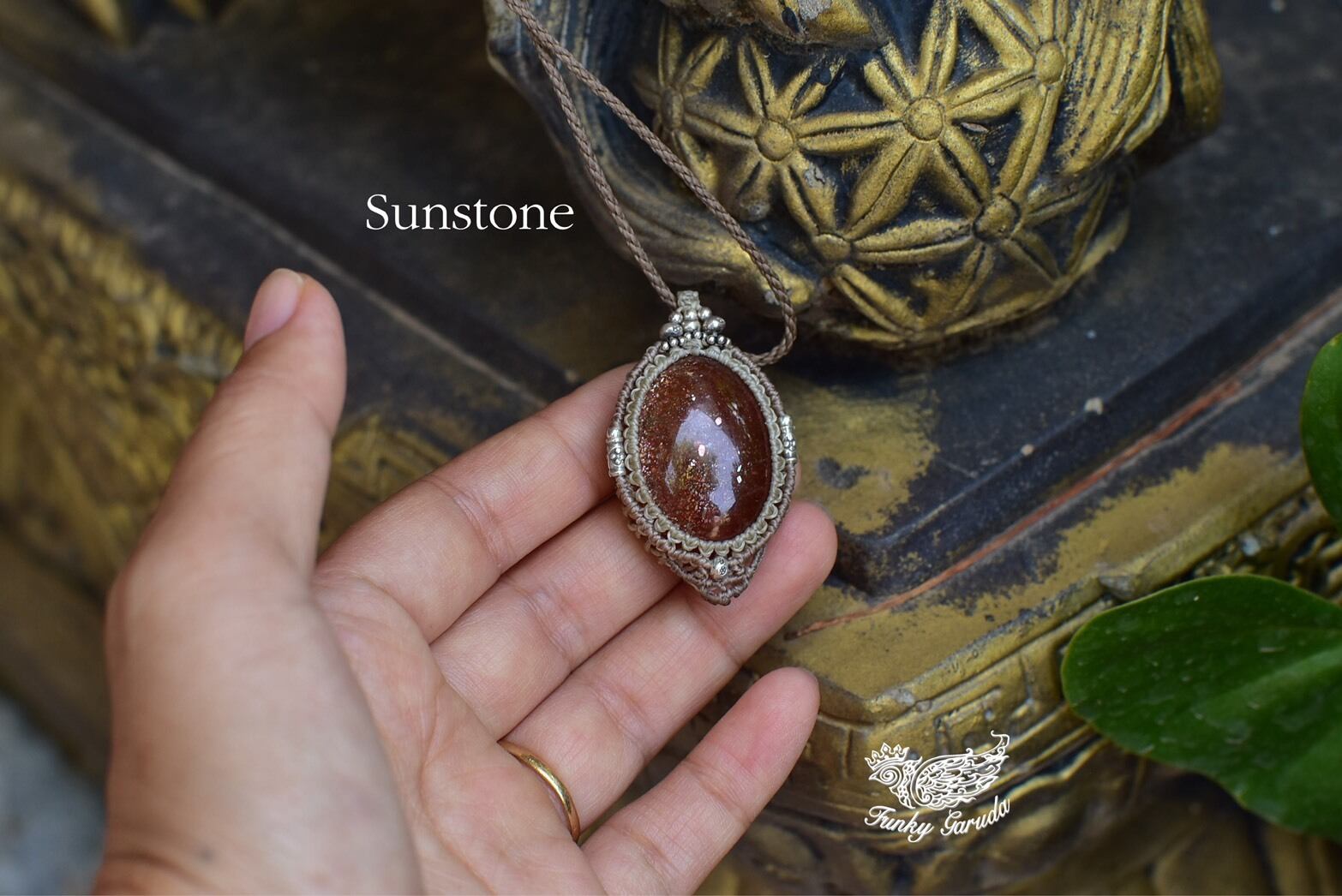 そんな色味を持ち合わせたサンストーン。ゴールドで激しいサンストーンカラーもみることができるものをシンプルにマクラメ編み装飾を施して仕上げました。