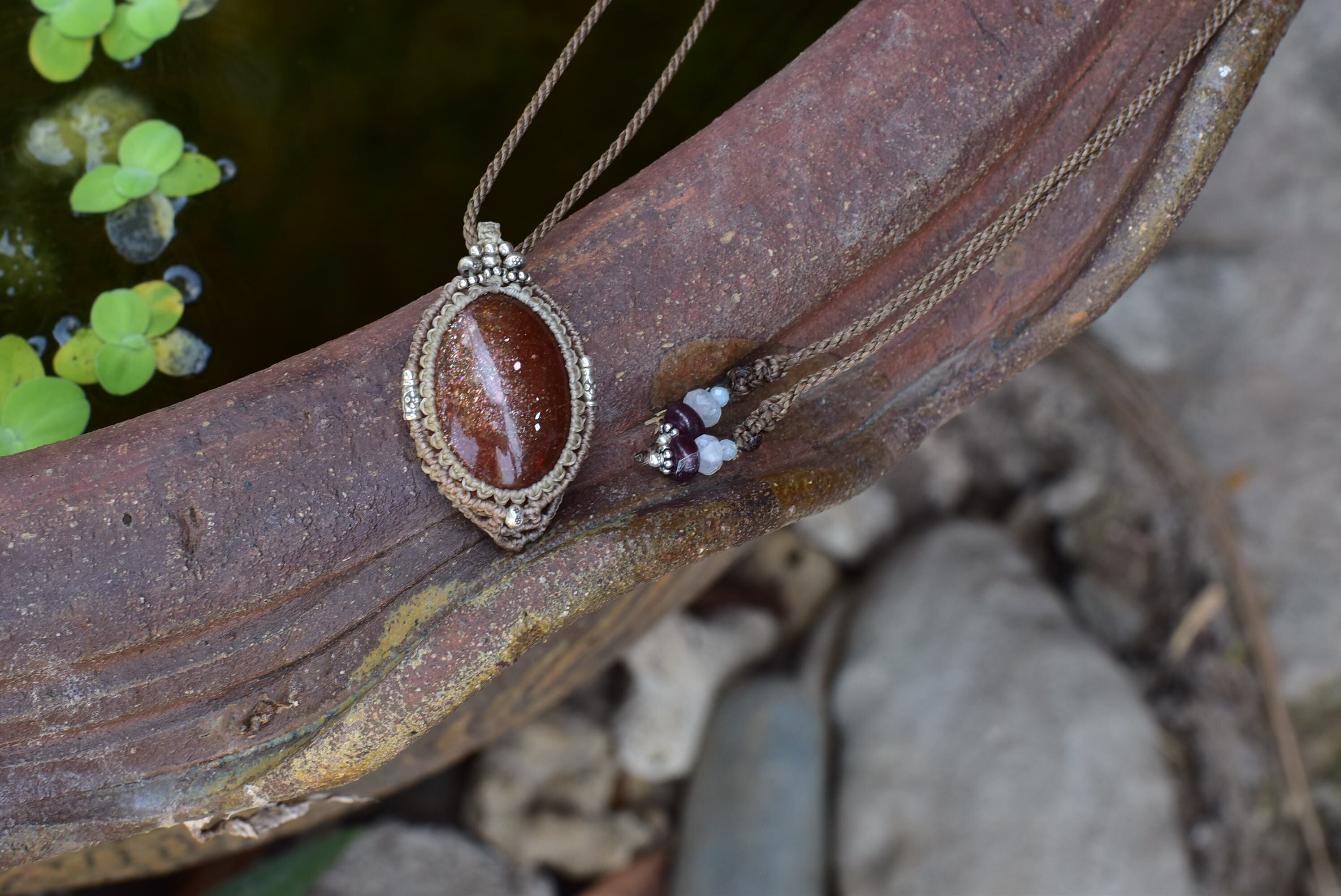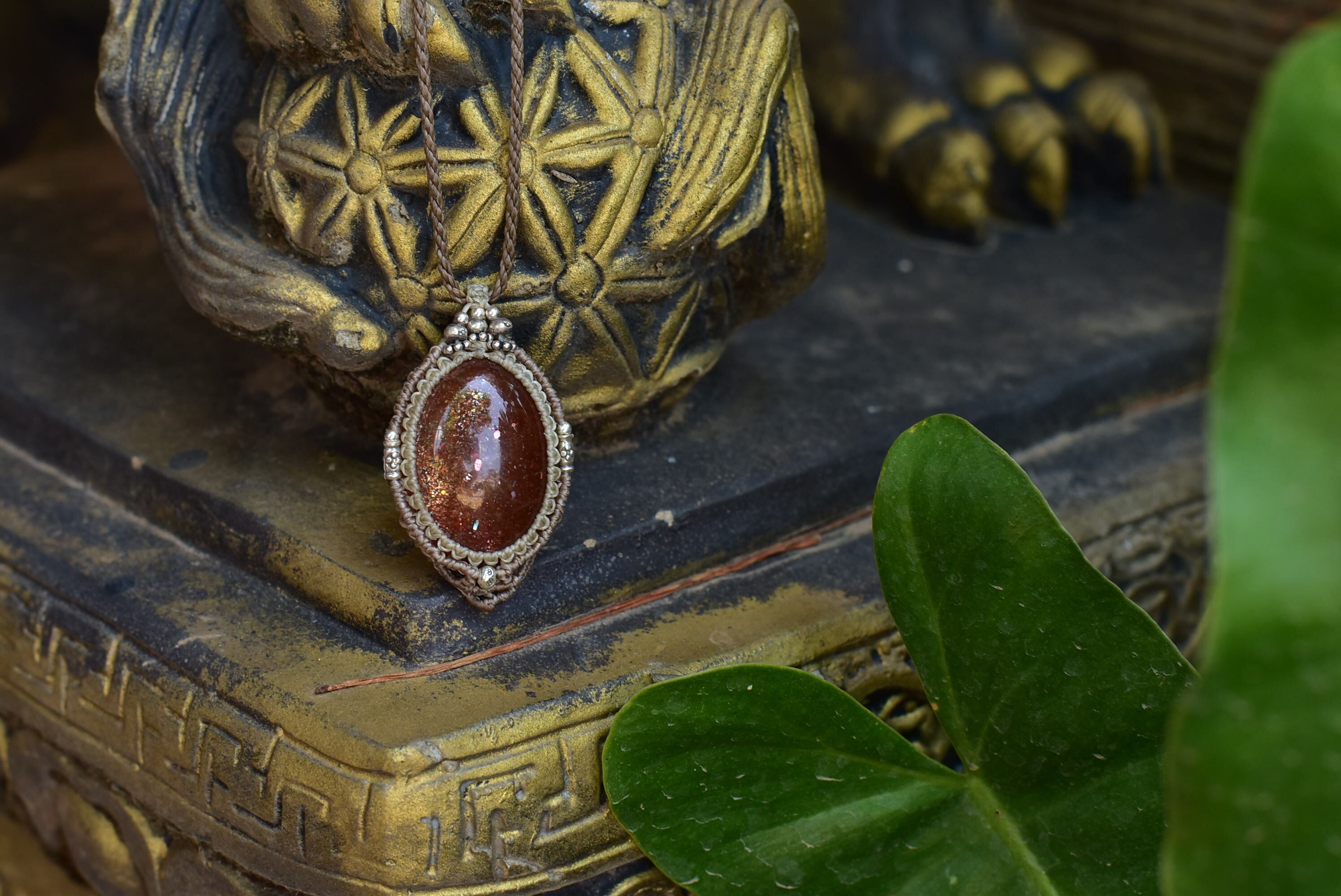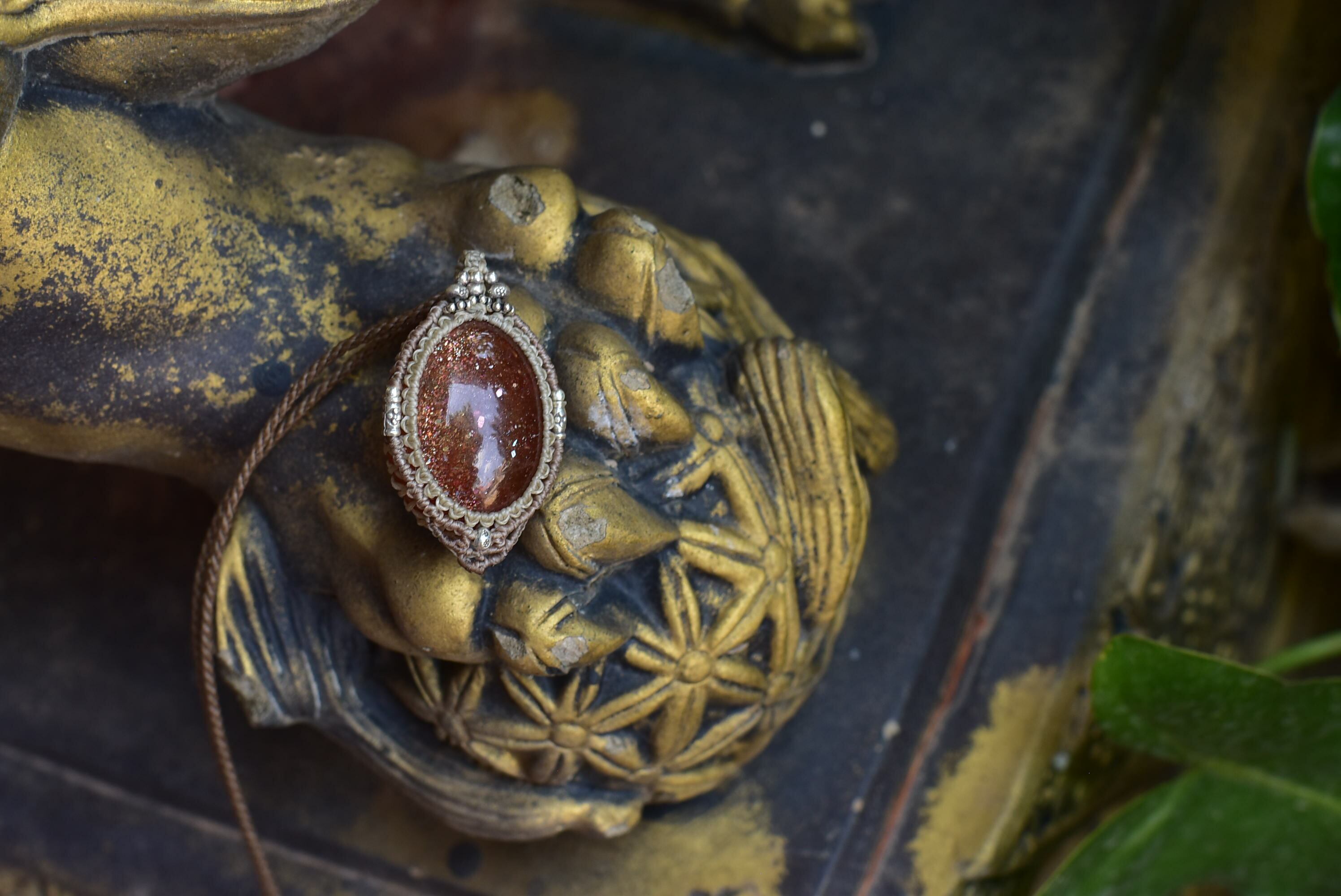 そんな色味を持ち合わせたサンストーン。ゴールドで激しいサンストーンカラーもみることができるものをシンプルにマクラメ編み装飾を施して仕上げました。