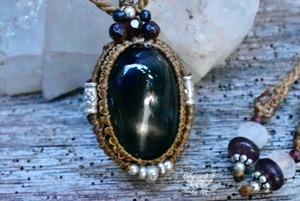 ◆このたびはゴールドブラウン色の蝋引き糸を使用しマクラメ編み装飾を施しました。