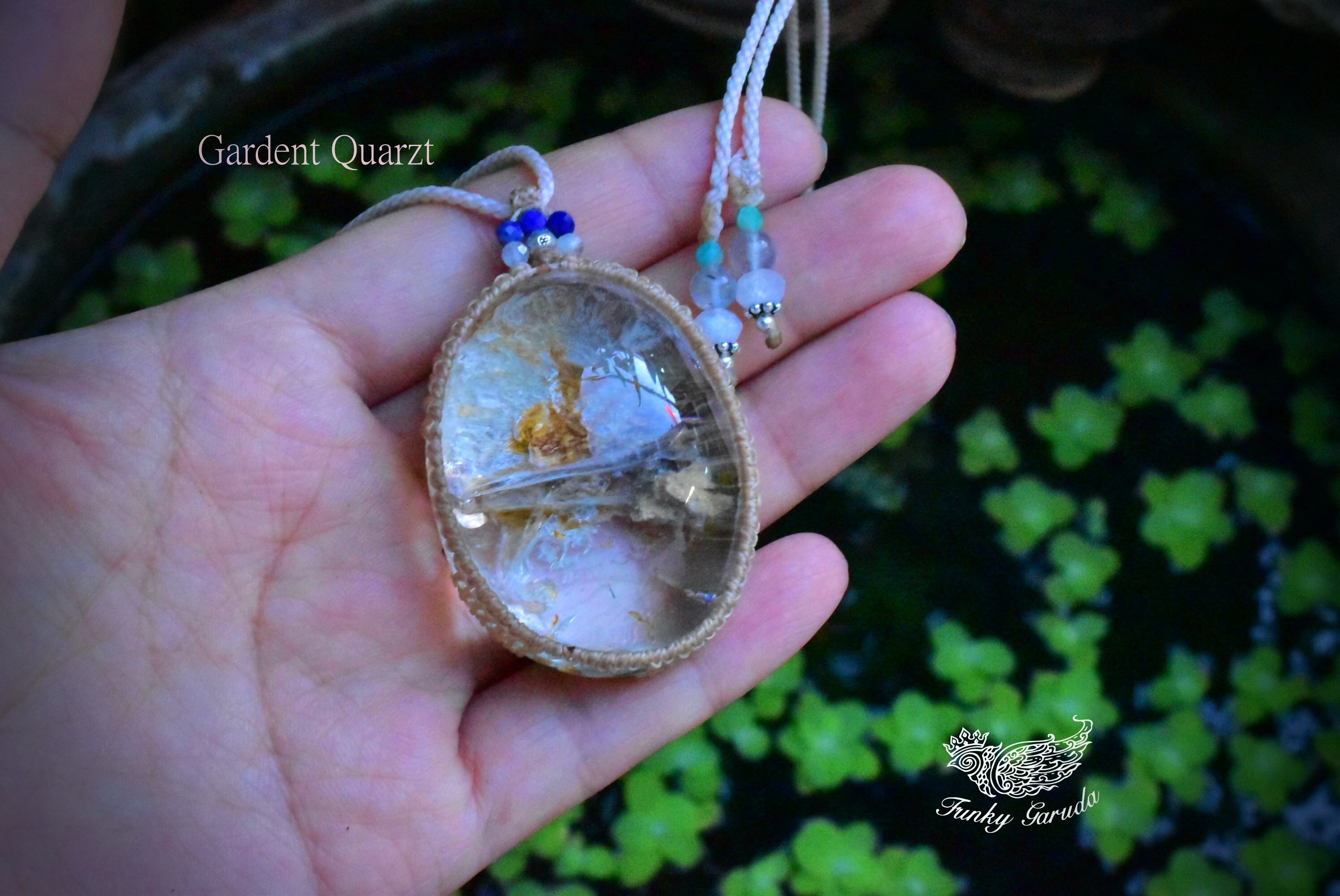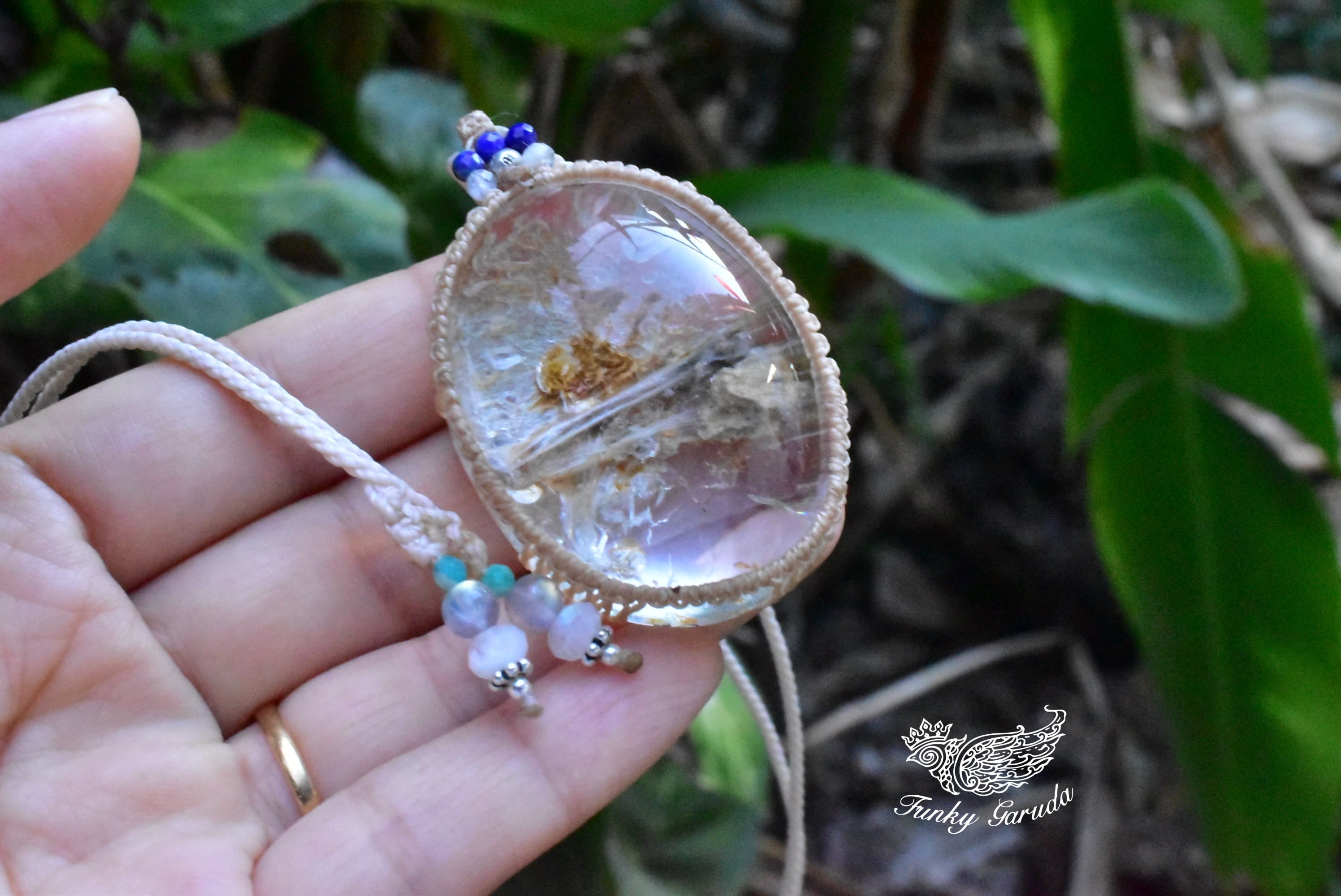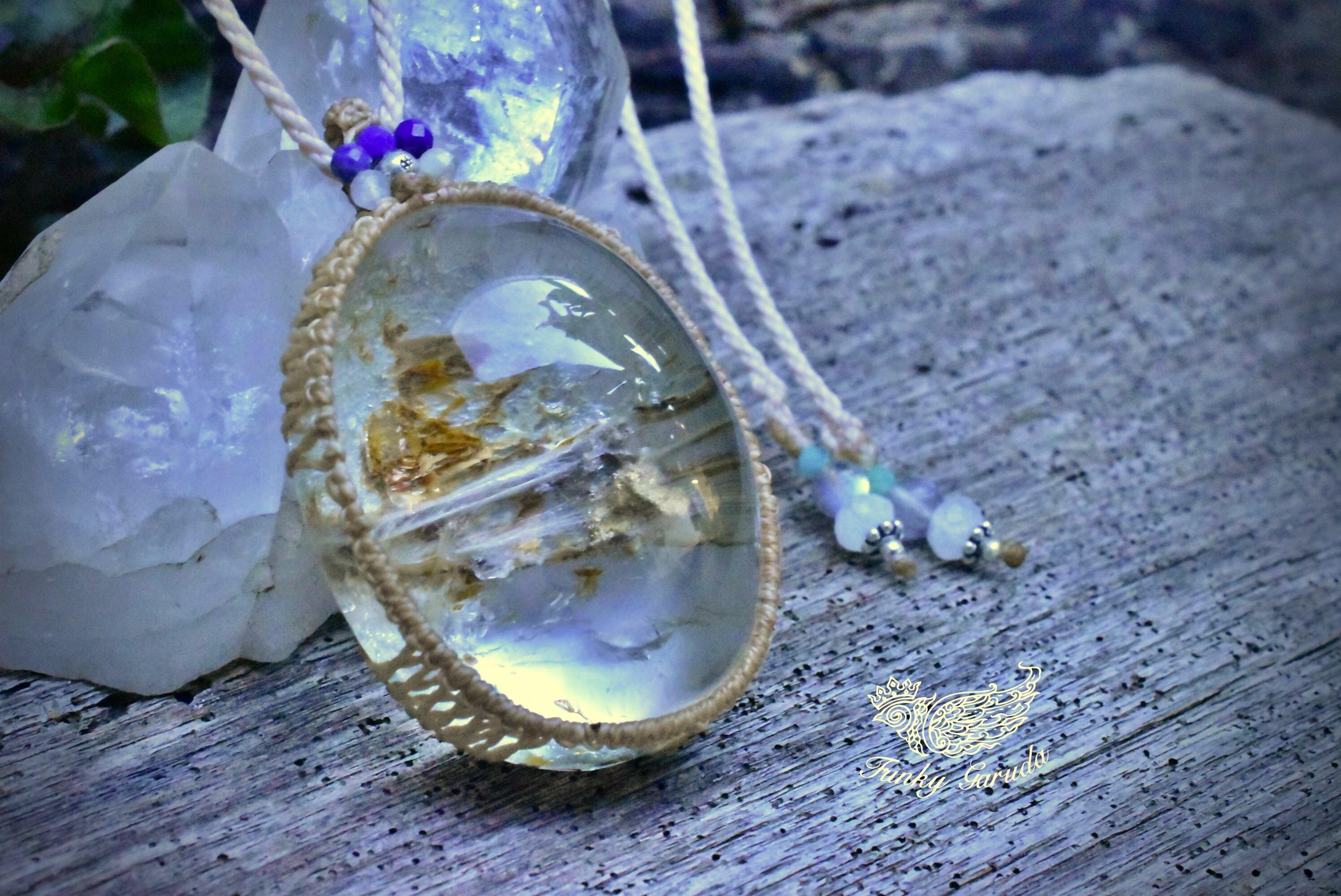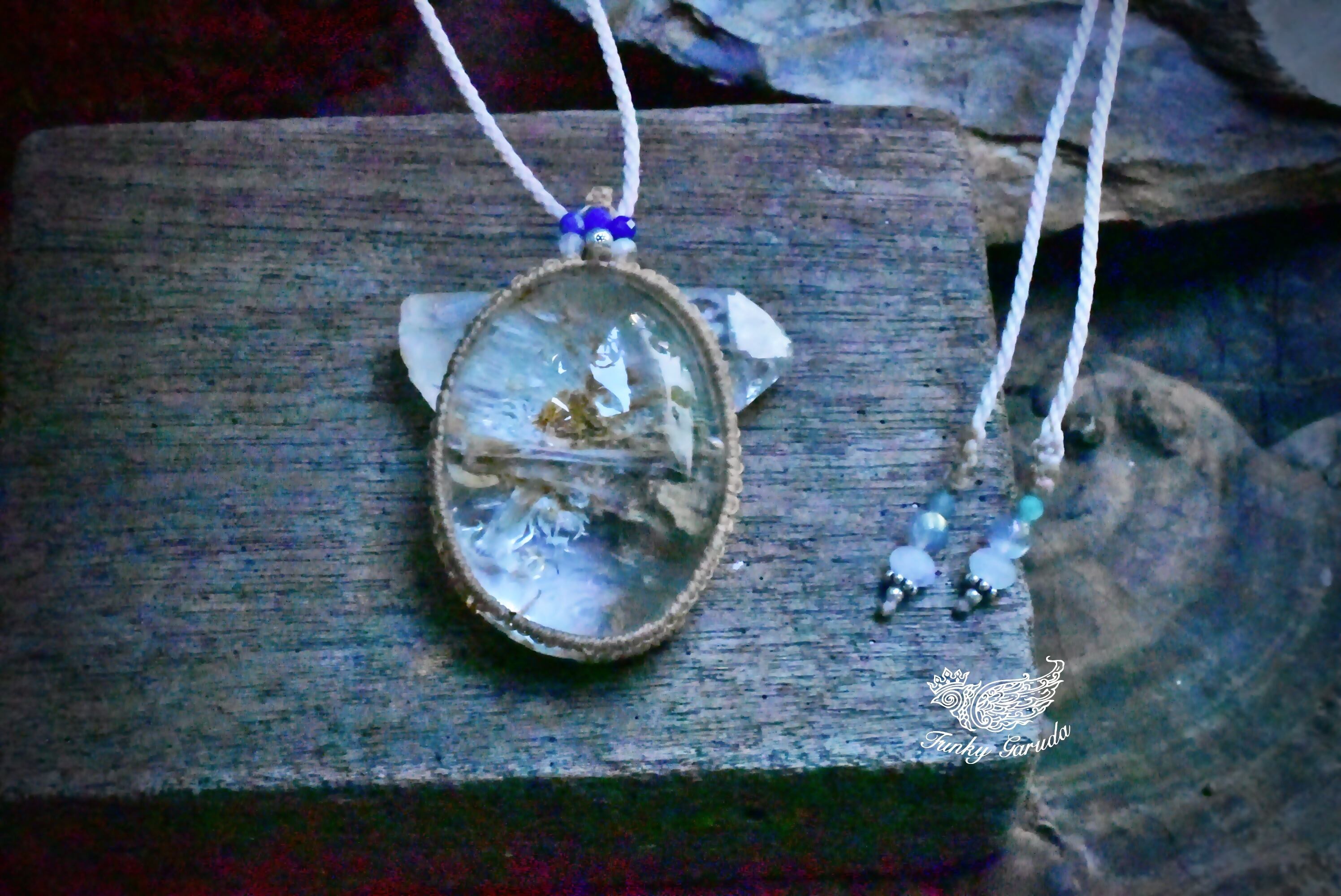 大きくて極度に透明感ある水晶の中にはクラッククォーツとも呼ばれる小さな水晶の育ち始めたシラー、そして中心に針のような内包物が入り込んでいる不思議で美しい大きなガーデンクォーツ。貫入水晶とも呼ばれる水晶をそのまま、水晶の世界が見えるようにマクラメ編み装飾を施してペンダントに仕上げました。立体的な世界と美しいシラーたちの内包物が面白いレアな水晶です。