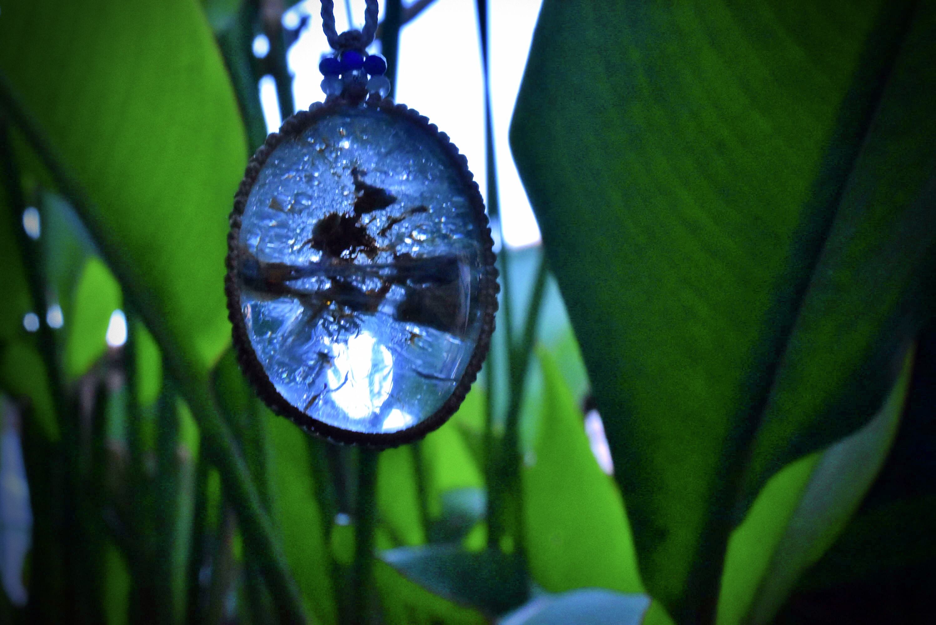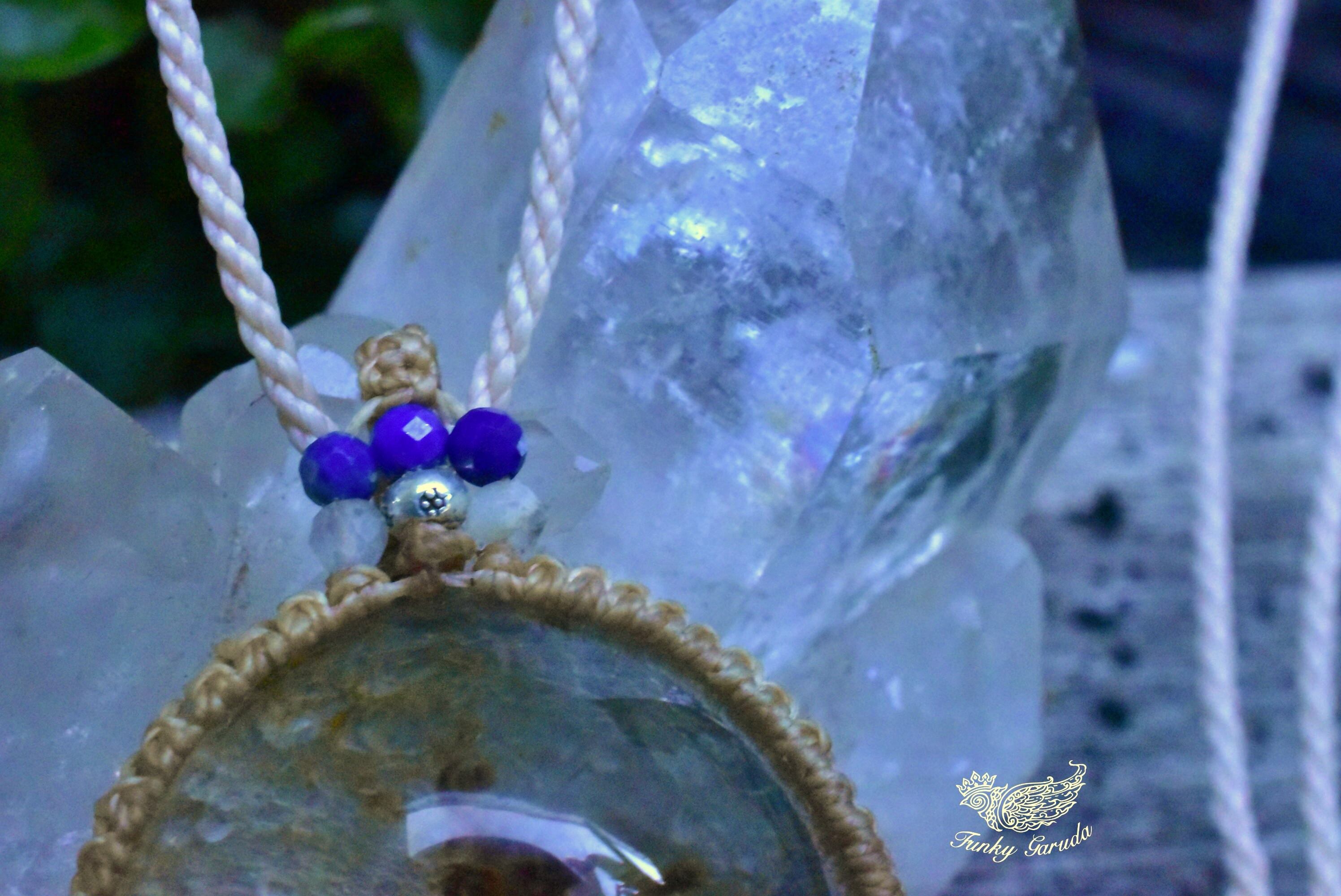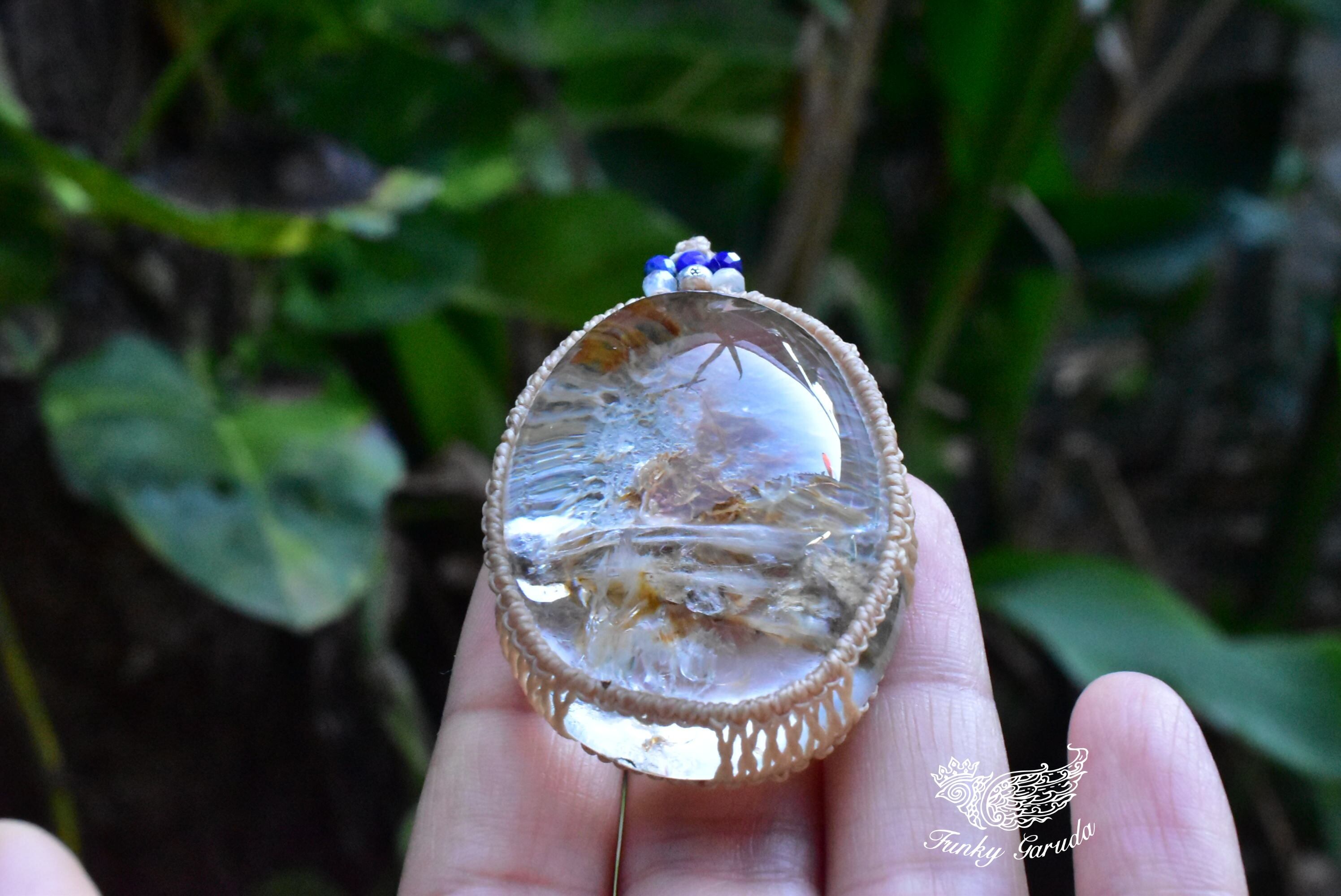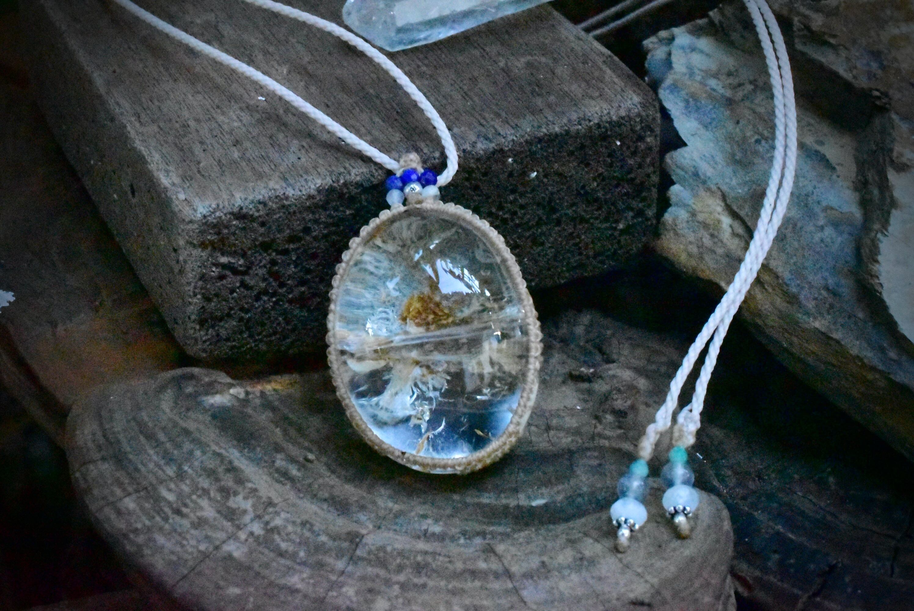 大きくて極度に透明感ある水晶の中にはクラッククォーツとも呼ばれる小さな水晶の育ち始めたシラー、そして中心に針のような内包物が入り込んでいる不思議で美しい大きなガーデンクォーツ。貫入水晶とも呼ばれる水晶をそのまま、水晶の世界が見えるようにマクラメ編み装飾を施してペンダントに仕上げました。立体的な世界と美しいシラーたちの内包物が面白いレアな水晶です。