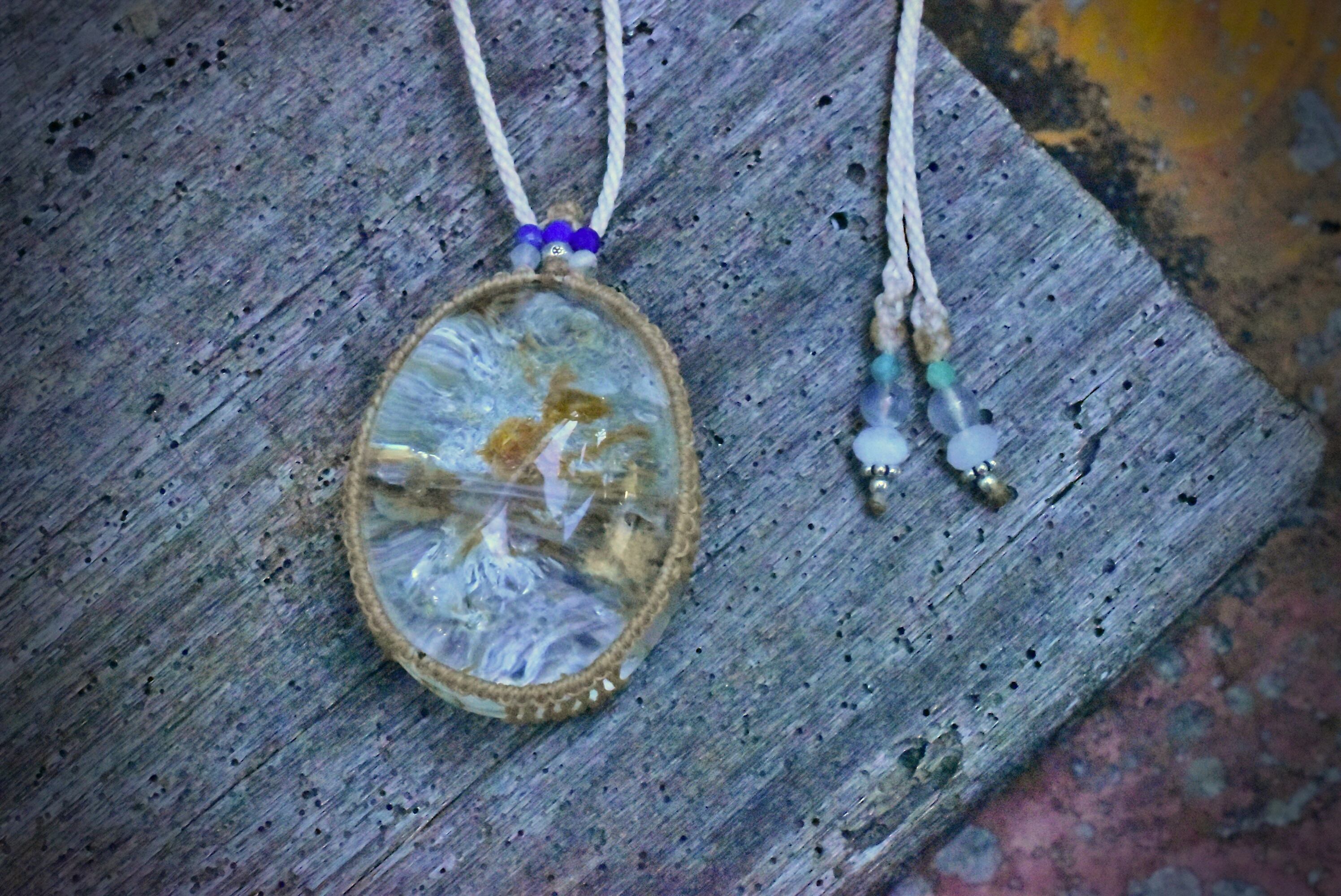◆このたびはキャラメル、ナチュラルホワイト色の蝋引き糸を使用しマクラメ編み装飾を施しました。