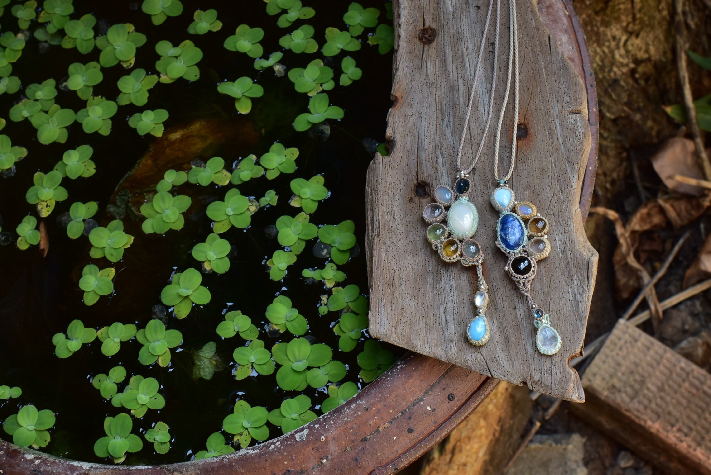 ◆このたびはヘンプ、ミルクココア、ミント色の蝋引き糸を使用しマクラメ編み装飾を施しました。