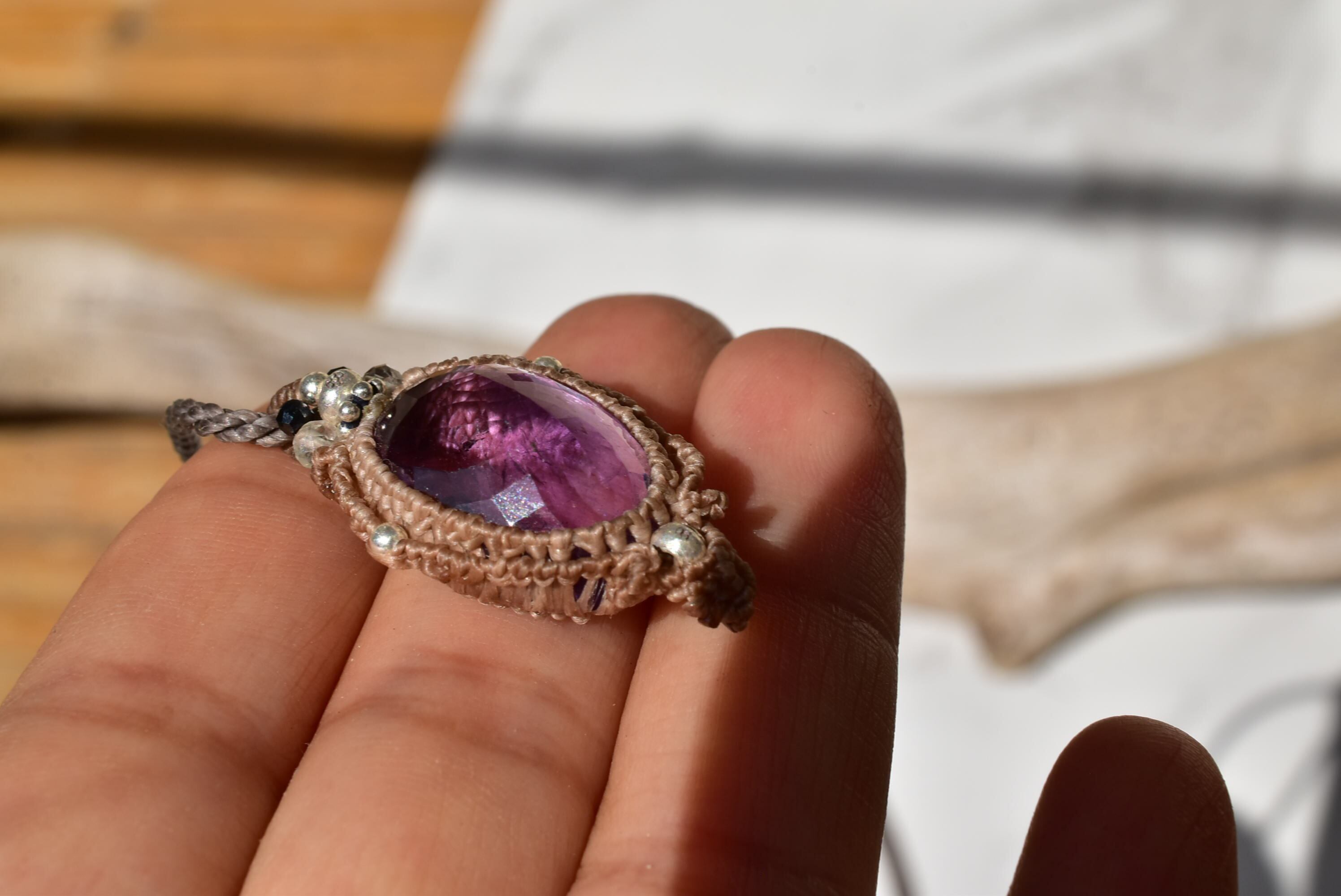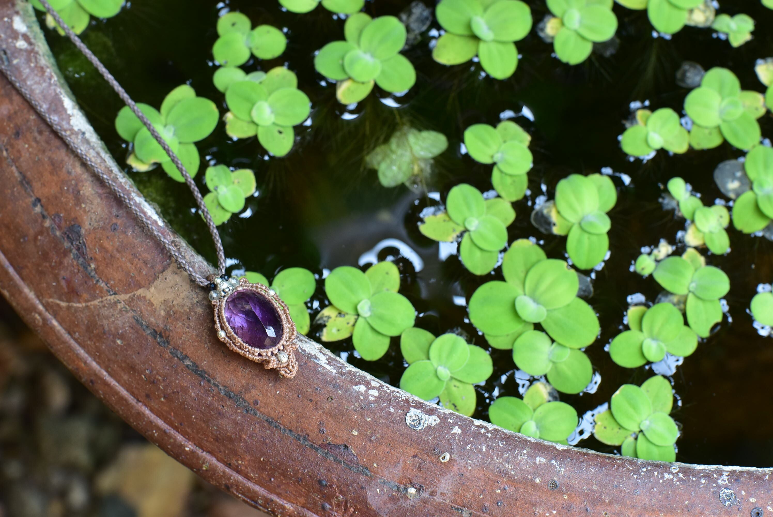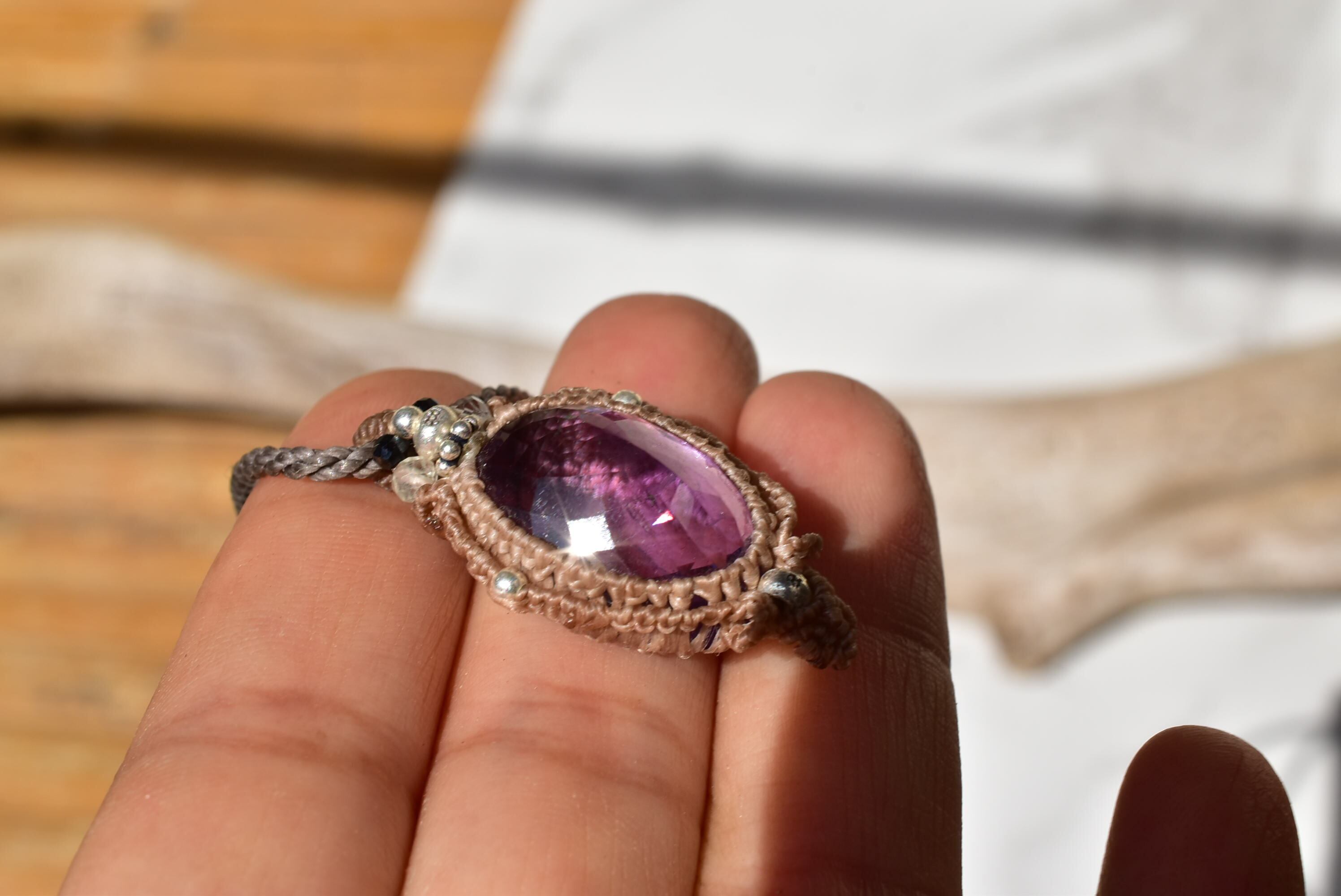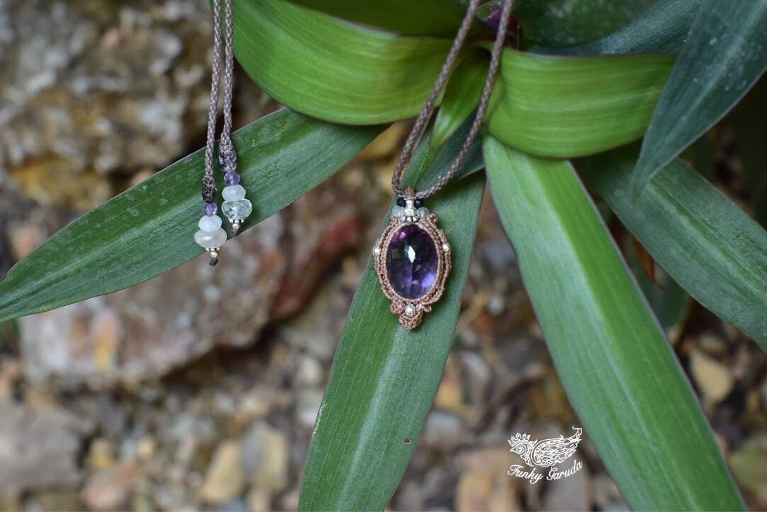 このたびはそんなファセットカットアメジストを石の世界を中心に考えながら、マクラメ編み装飾を施しました。